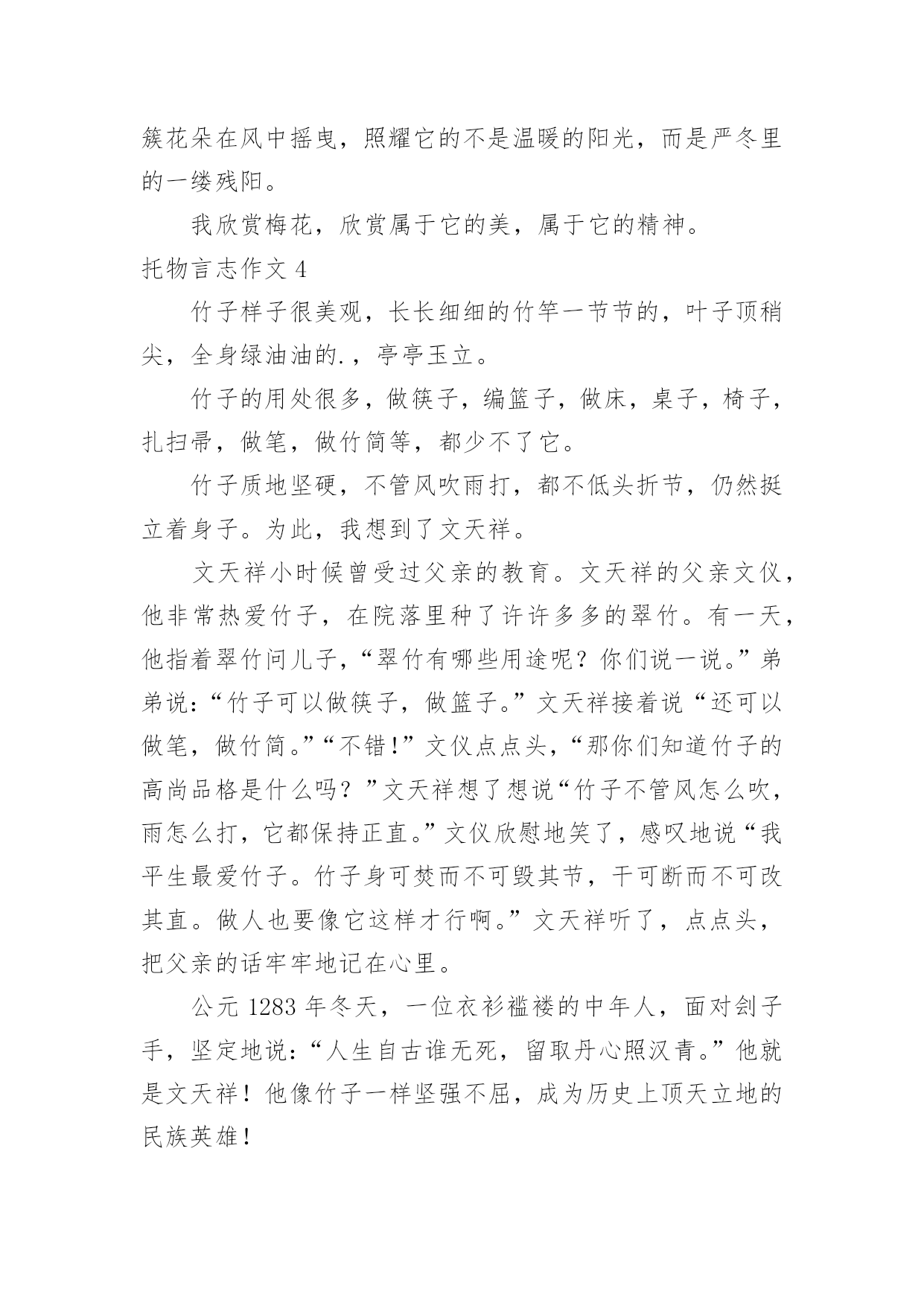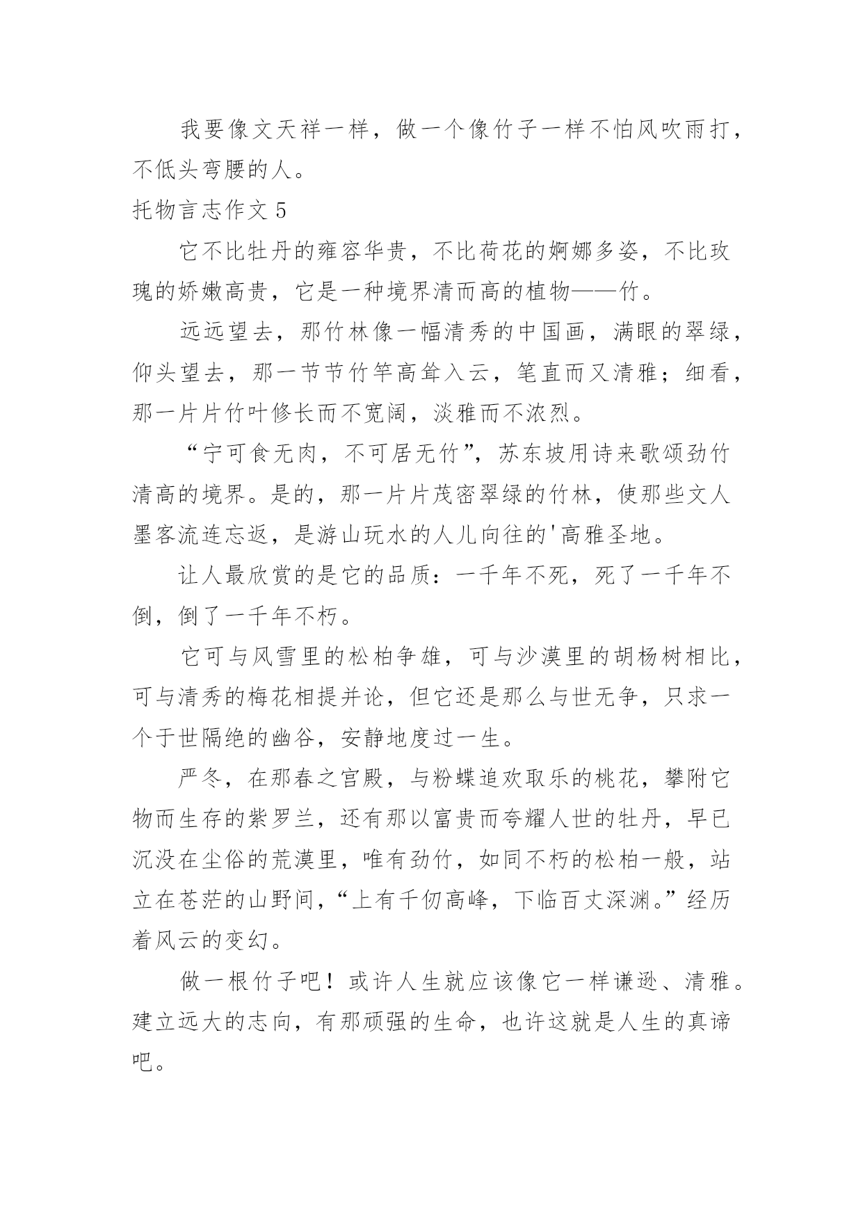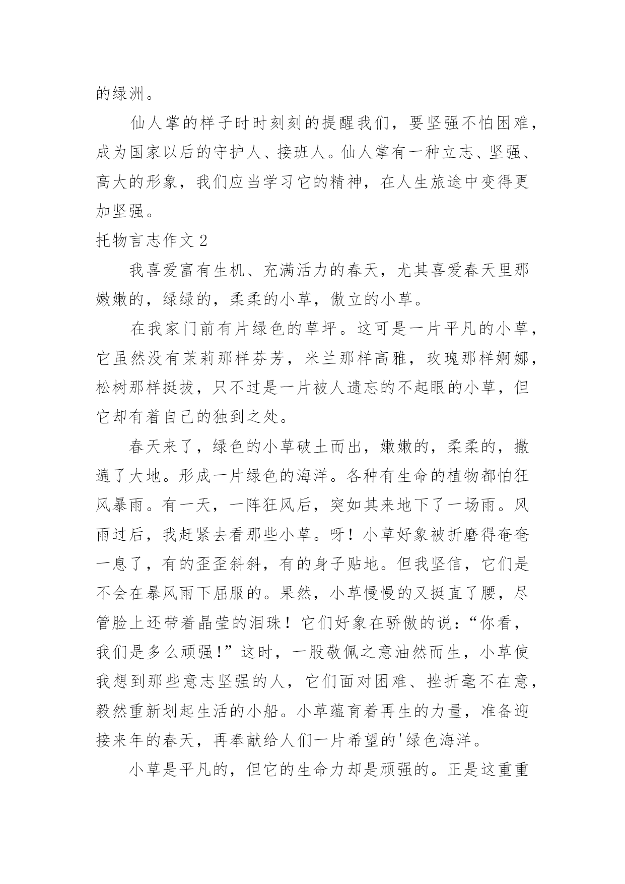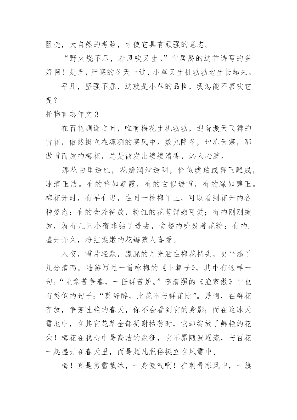 托物言志作文 托物言志作文在日复一日的学习、工作或生活中,大家都不可避免地要接触到作文吧,借助作文可以提高我们的语言组织能力。写起作文来就毫无头绪?下面是小编整理的托物言志作文,欢迎大家借鉴与参考,希望对大家有所帮助。托物言志作文1它色泽明亮,给沙漠带来勃勃生机。它浑身是刺,能抵御强力的风暴;它是沙漠中的源泉,又是沙漠中的将士。竹子有坚强,身板直的精神;柏树是有一种守边将土的品质,不管大风大浪,都在岗位上不放松,坚定不移;而仙人掌却更为特别。仙人掌是在沙漠中生长的,地方也比较干燥。很难有生物生存,可仙人掌却迎难而上,哪里干燥,它就可以在哪里生存。起出它们先缩成一个球,随着风跑来跑去。直到它们发现这个地方很不错,很适宜,它们就会定居下来。在这里生根发芽,渐渐的长得越来越茂盛。仙人掌的.形状很特别,全身长满了刺,让人见了都绕远它,不敢招惹它。但它吓人的外表下有着一种少女心,不然能开出这么美的小黄花?同时它也是沙漠唯一的泉水,拿刀子或坚硬的石块划打开它,咬它的果肉,是最为解渴的了。如果有人在沙漠中遇到干渴时,仙人掌就会救人一命,所以它们也被成为沙漠中的绿洲。仙人掌的样子时时刻刻的提醒我们,要坚强不怕困难,成为国家以后的守护人、接班人。仙人掌有一种立志、坚强、高大的形象,我们应当学习它的精神,在人生旅途中变得更加坚强。托物言志作文2我喜爱富有生机、充满活力的春天,尤其喜爱春天里那嫩嫩的,绿绿的,柔柔的小草,傲立的小草。在我家门前有片绿色的草坪。这可是一片平凡的小草,它虽然没有茉莉那样芬芳,米兰那样高雅,玫瑰那样婀娜,松树那样挺拔,只不过是一片被人遗忘的不起眼的小草,但它却有着自己的独到之处。春天来了,绿色的小草破土而出,嫩嫩的,柔柔的,撒遍了大地。形成一片绿色的海洋。各种有生命的植物都怕狂风暴雨。有一天,一阵狂风后,突如其来地下了一场雨。风雨过后,我赶紧去看那些小草。呀!小草好象被折磨得奄奄一息了,有的歪歪斜斜,有的身子贴地。但我坚信,它们是不会在暴风雨下屈服的。果然,小草慢慢的又挺直了腰,尽管脸上还带着晶莹的泪珠!它们好象在骄傲的说:“你看,我们是多么顽强!”这时,一股敬佩之意油然而生,小草使我想到那些意志坚强的人,它们面对困难、挫折毫不在意,毅然重新划起生活的小船。小草蕴育着再生的力量,准备迎接来年的春天,再奉献给人们一片希望的'绿色海洋。小草是平凡的,但它的生命力却是顽强的。正是这重重阻挠,大自然的考验,才使它具有顽强的意志。“野火烧不尽,春风吹又生。”白居易的这首诗写的多好啊!是呀,严寒的冬天一过,小草又生机勃勃地生长起来。平凡,坚强不屈,这就是小草的品格,我怎能不喜欢它呢?托物言志作文3在百花凋谢之时,唯有梅花生机勃勃,迎着漫天飞舞的雪花,傲然挺立在凛冽的寒风中。数九隆冬,地冻天寒,那傲雪而放的梅花,总是散发出缕缕清香,沁人心脾。那花白里透红,花瓣润滑透明,恰似琥珀或碧玉雕成,冰清玉洁。有的艳如朝霞,有的白似瑞雪,有的绿如碧玉。梅花开时,有早有迟,在同一枝梅丫上,可以看到花开的各种姿态:有的含羞待放,粉红的花苞鲜嫩可爱;有的刚刚绽放,就有几只小蜜蜂钻了进去,贪婪的吮吸着花粉;有的.盛开许久,粉红柔嫩的花瓣惹人喜爱。入夜,雪片轻飘,朦胧的月光洒在梅花梢头,更平添了几分清高。陆游写过一首咏梅的《卜算子》,其中有这样一句:“无意苦争春,一任群苦妒。”李清照的《渔家傲》中也有类似的句子:“莫辞醉,此花不与群花比”。是啊,在群花齐放,争芳吐艳的春天,你不会看到它的身影;而在这冰天雪地中,在其它花草全部凋谢枯萎时,它却绽放了鲜艳的花朵!梅花在我心中是高洁的象征,它不愿随波逐流,与百花一起盛开在春天里,而是超凡脱俗挺立在风雪中。梅!真是剪雪裁冰,一身傲气啊!在刺骨寒风中,一簇簇花朵在风中摇曳,照耀它的不是温暖的阳光,而是严冬里的一缕残阳。我欣赏梅花,欣赏属于它的美,属于它的精神。托物言志作文4竹子样子很美观,长长细细的竹竿一节节的,叶子顶稍尖,全身绿油油的.,亭亭玉立。竹子的用处很多,做筷子,编篮子,做床,桌子,椅子,扎扫帚,做笔,做竹简等,都少不了它。竹子质地坚硬,不管风吹雨打,都不低头折节,仍然挺立着身子。为此,我想到了文天祥。文天祥小时候曾受过父亲的教育。文天祥的父亲文仪,他非常热爱竹子,在院落里种了许许多多的翠竹。有一天,他指着翠竹问儿子,“翠竹有哪些用途呢?你们说一说。”弟弟说:“竹子可以做筷子,做篮子。”文天祥接着说“还可以做笔,做竹简。”“不错!”文仪点点头,“那你们知道竹子的高尚品格是什么吗?”文天祥想了想说“竹子不管风怎么吹,雨怎么打,它都保持正直。”文仪欣慰地笑了,感叹地说“我平生最爱竹子。竹子身可焚而不可毁其节,干可断而不可改其直。做人也要像它这样才行啊。”文天祥听了,点点头,把父亲的话牢牢地记在心里。公元1283