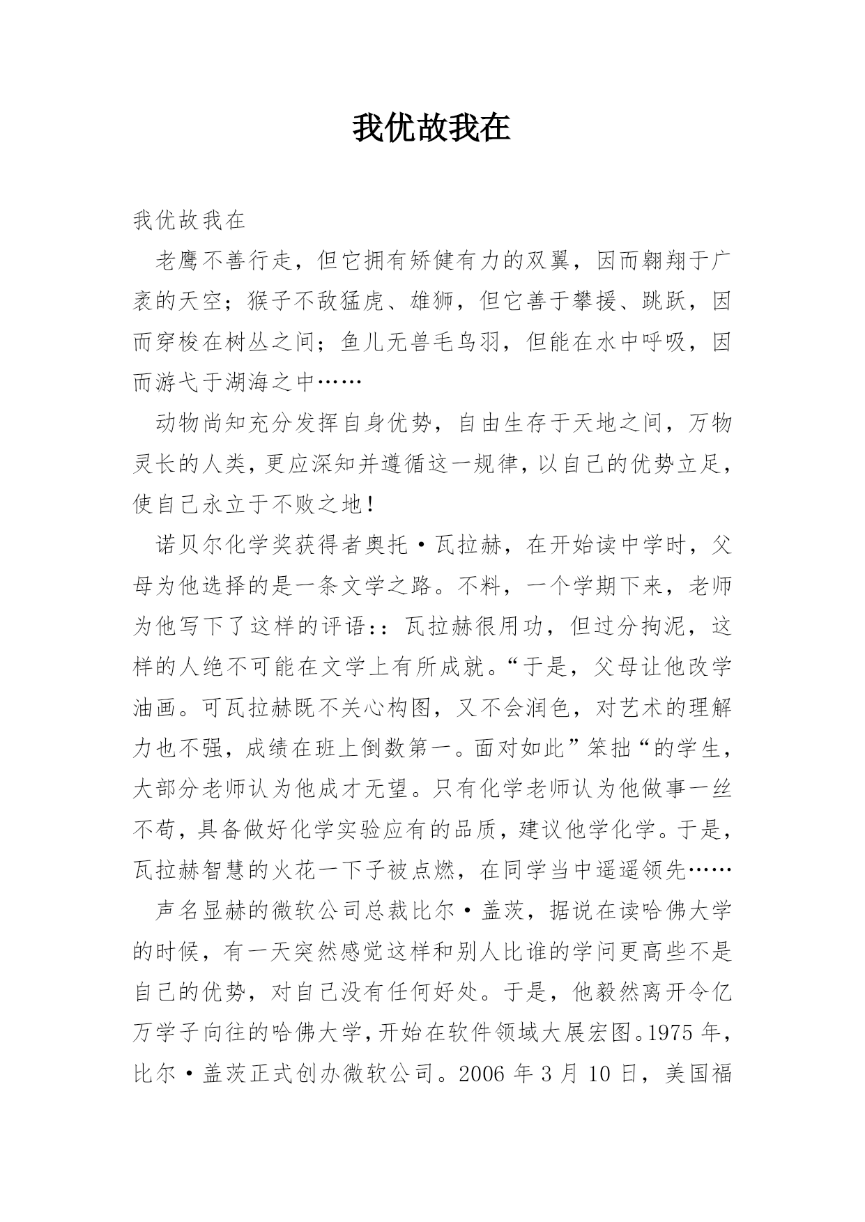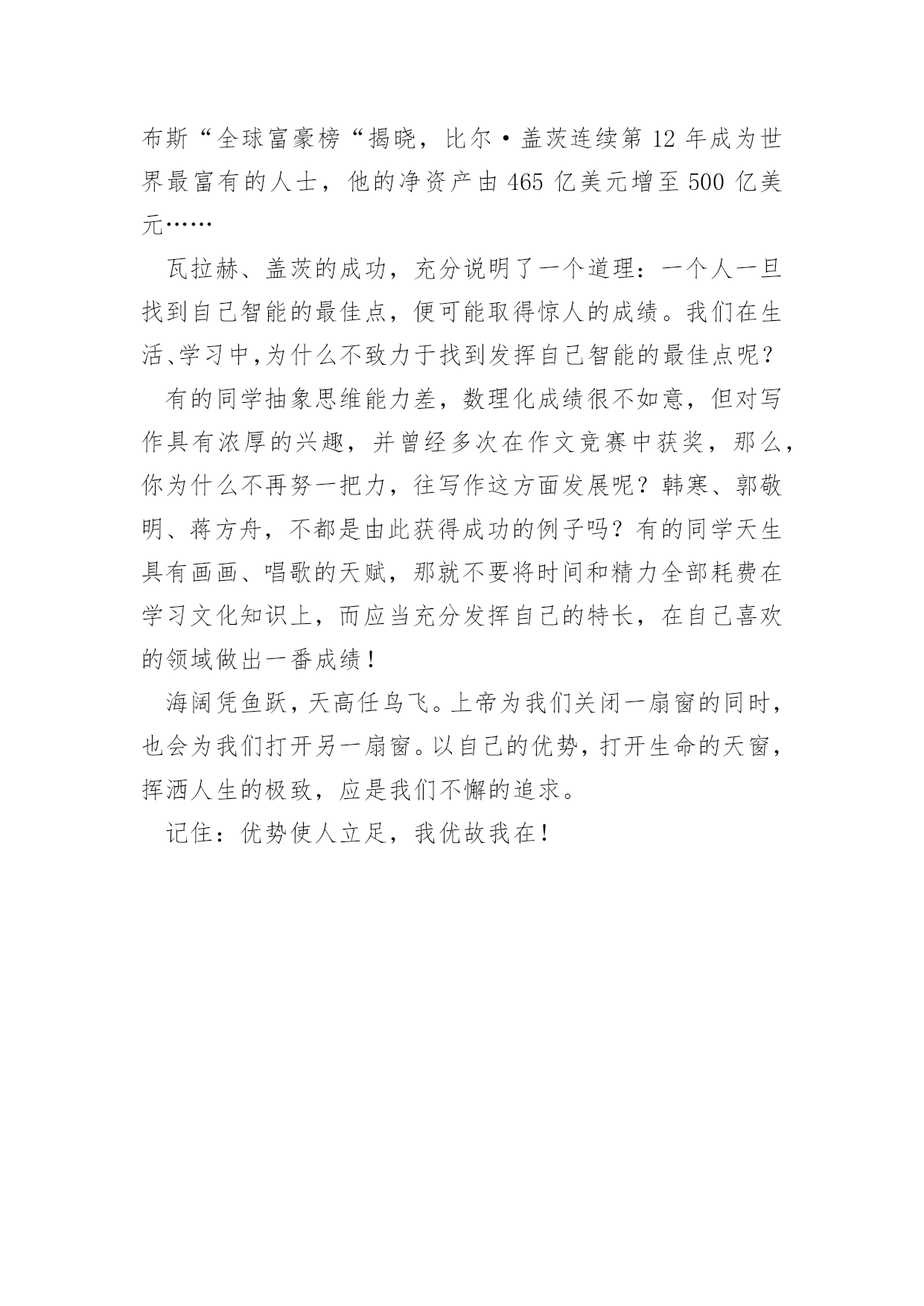 我优故我在 我优故我在老鹰不善行走,但它拥有矫健有力的双翼,因而翱翔于广袤的天空;猴子不敌猛虎、雄狮,但它善于攀援、跳跃,因而穿梭在树丛之间;鱼儿无兽毛鸟羽,但能在水中呼吸,因而游弋于湖海之中……动物尚知充分发挥自身优势,自由生存于天地之间,万物灵长的人类,更应深知并遵循这一规律,以自己的优势立足,使自己永立于不败之地!诺贝尔化学奖获得者奥托·瓦拉赫,在开始读中学时,父母为他选择的是一条文学之路。不料,一个学期下来,老师为他写下了这样的评语::瓦拉赫很用功,但过分拘泥,这样的人绝不可能在文学上有所成就。“于是,父母让他改学油画。可瓦拉赫既不关心构图,又不会润色,对艺术的理解力也不强,成绩在班上倒数第一。面对如此”笨拙“的学生,大部分老师认为他成才无望。只有化学老师认为他做事一丝不苟,具备做好化学实验应有的品质,建议他学化学。于是,瓦拉赫智慧的火花一下子被点燃,在同学当中遥遥领先……声名显赫的微软公司总裁比尔·盖茨,据说在读哈佛大学的时候,有一天突然感觉这样和别人比谁的学问更高些不是自己的优势,对自己没有任何好处。于是,他毅然离开令亿万学子向往的哈佛大学,开始在软件领域大展宏图。1975年,比尔·盖茨正式创办微软公司。2006年3月10日,美国福布斯“全球富豪榜“揭晓,比尔·盖茨连续第12年成为世界最富有的人士,他的净资产由465亿美元增至500亿美元……瓦拉赫、盖茨的成功,充分说明了一个道理:一个人一旦找到自己智能的最佳点,便可能取得惊人的成绩。我们在生活、学习中,为什么不致力于找到发挥自己智能的最佳点呢?有的同学抽象思维能力差,数理化成绩很不如意,但对写作具有浓厚的兴趣,并曾经多次在作文竞赛中获奖,那么,你为什么不再努一把力,往写作这方面发展呢?韩寒、郭敬明、蒋方舟,不都是由此获得成功的例子吗?有的同学天生具有画画、唱歌的天赋,那就不要将时间和精力全部耗费在学习文化知识上,而应当充分发挥自己的特长,在自己喜欢的领域做出一番成绩!海阔凭鱼跃,天高任鸟飞。上帝为我们关闭一扇窗的同时,也会为我们打开另一扇窗。以自己的优势,打开生命的天窗,挥洒人生的极致,应是我们不懈的追求。记住:优势使人立足,我优故我在!
