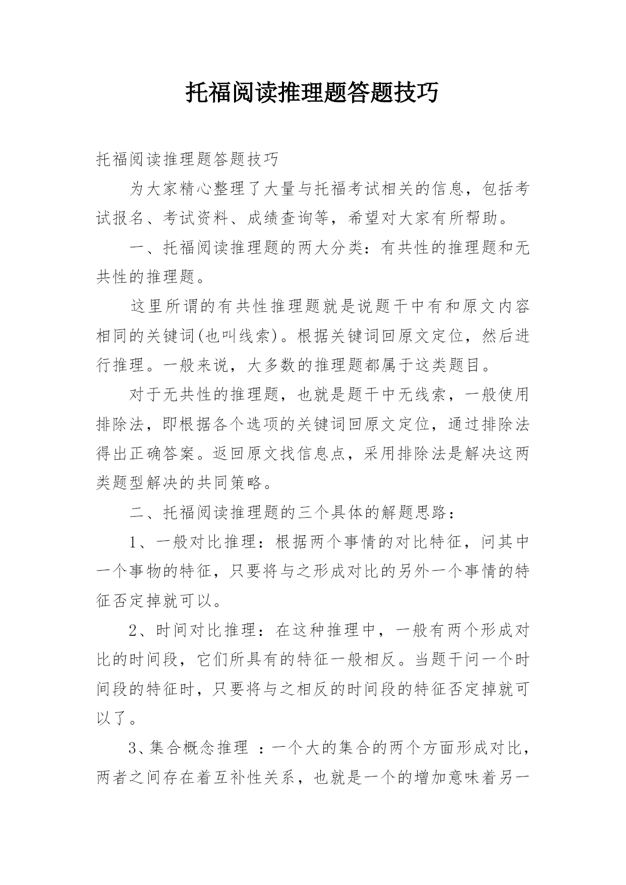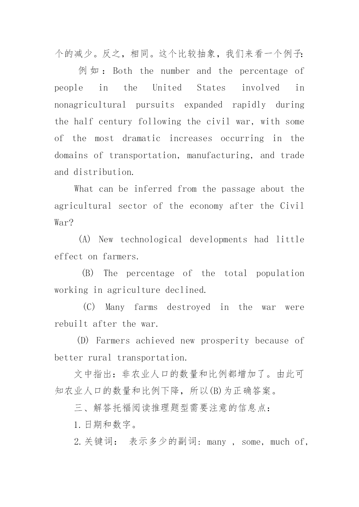 托福阅读推理题答题技巧 托福阅读推理题答题技巧为大家精心整理了大量与托福考试相关的信息,包括考试报名、考试资料、成绩查询等,希望对大家有所帮助。一、托福阅读推理题的两大分类:有共性的推理题和无共性的推理题。这里所谓的有共性推理题就是说题干中有和原文内容相同的关键词(也叫线索)。根据关键词回原文定位,然后进行推理。一般来说,大多数的推理题都属于这类题目。对于无共性的推理题,也就是题干中无线索,一般使用排除法,即根据各个选项的关键词回原文定位,通过排除法得出正确答案。返回原文找信息点,采用排除法是解决这两类题型解决的共同策略。二、托福阅读推理题的三个具体的解题思路:1、一般对比推理:根据两个事情的对比特征,问其中一个事物的特征,只要将与之形成对比的另外一个事情的特征否定掉就可以。2、时间对比推理:在这种推理中,一般有两个形成对比的时间段,它们所具有的特征一般相反。当题干问一个时间段的特征时,只要将与之相反的时间段的特征否定掉就可以了。3、集合概念推理:一个大的集合的两个方面形成对比,两者之间存在着互补性关系,也就是一个的增加意味着另一个的减少。反之,相同。这个比较抽象,我们来看一个例子:例如:BoththenumberandthepercentageofpeopleintheUnitedStatesinvolvedinnonagriculturalpursuitsexpandedrapidlyduringthehalfcenturyfollowingthecivilwar,withsomeofthemostdramaticincreasesoccurringinthedomainsoftransportation,manufacturing,andtradeanddistribution.WhatcanbeinferredfromthepassageabouttheagriculturalsectoroftheeconomyaftertheCivilWar?(A)Newtechnologicaldevelopmentshadlittleeffectonfarmers.(B)Thepercentageofthetotalpopulationworkinginagriculturedeclined.(C)Manyfarmsdestroyedinthewarwererebuiltafterthewar.(D)Farmersachievednewprosperitybecauseofbetterruraltransportation.文中指出:非农业人口的数量和比例都增加了。由此可知农业人口的数量和比例下降,所以(B)为正确答案。三、解答托福阅读推理题型需要注意的信息点:1.日期和数字。2.关键词:表示多少的副词:many,some,muchof,several,afew,most…;情态动词:may,can,could…;表示过去的:usedtobe,was,were,atonetime,previously;表示不是唯一的:notonly,notexclusively等。总之,文中的关键词,观点,逻辑和平时的基本常识都是解决托福阅读题型这类问题的关键。