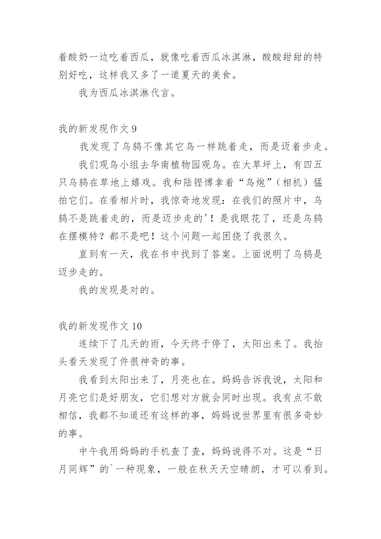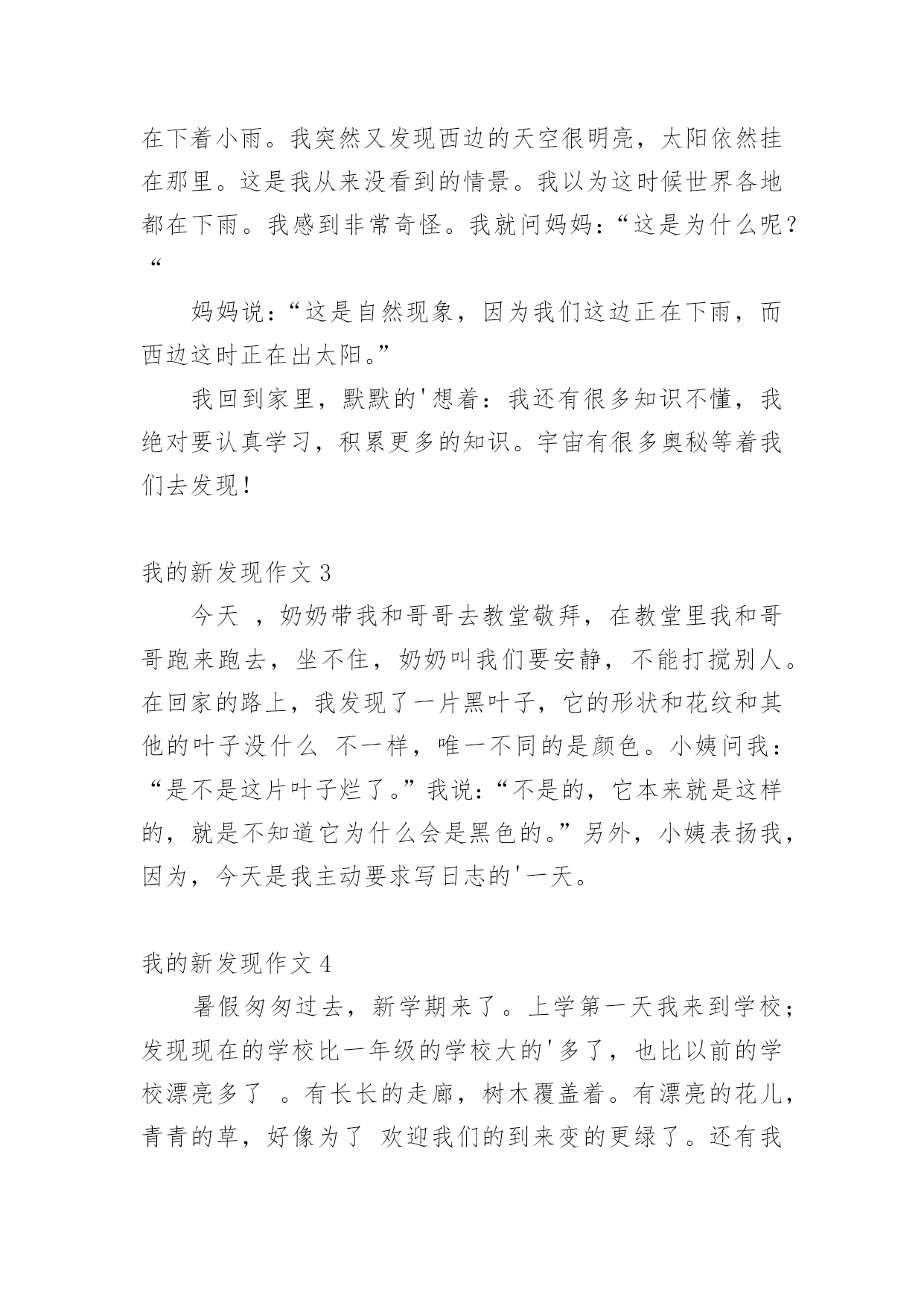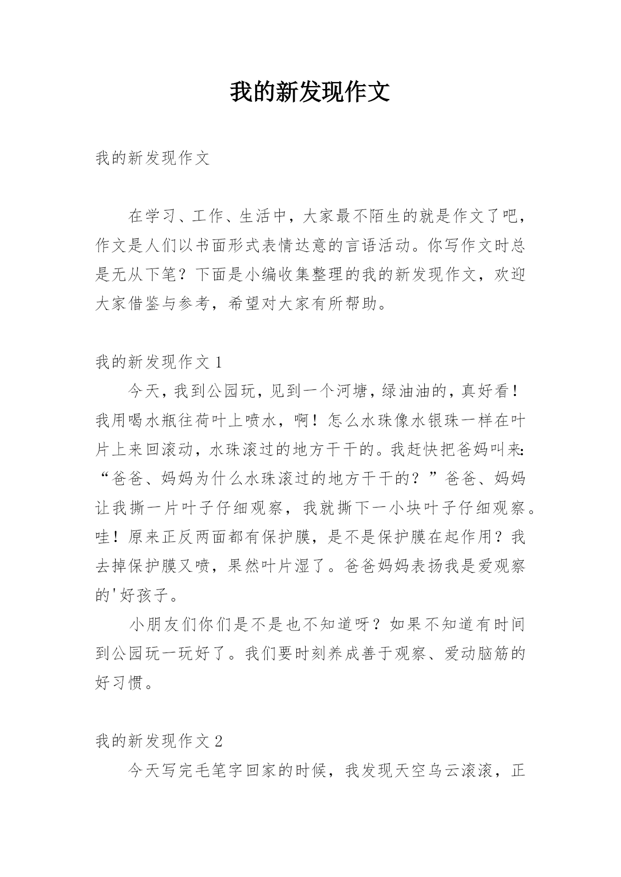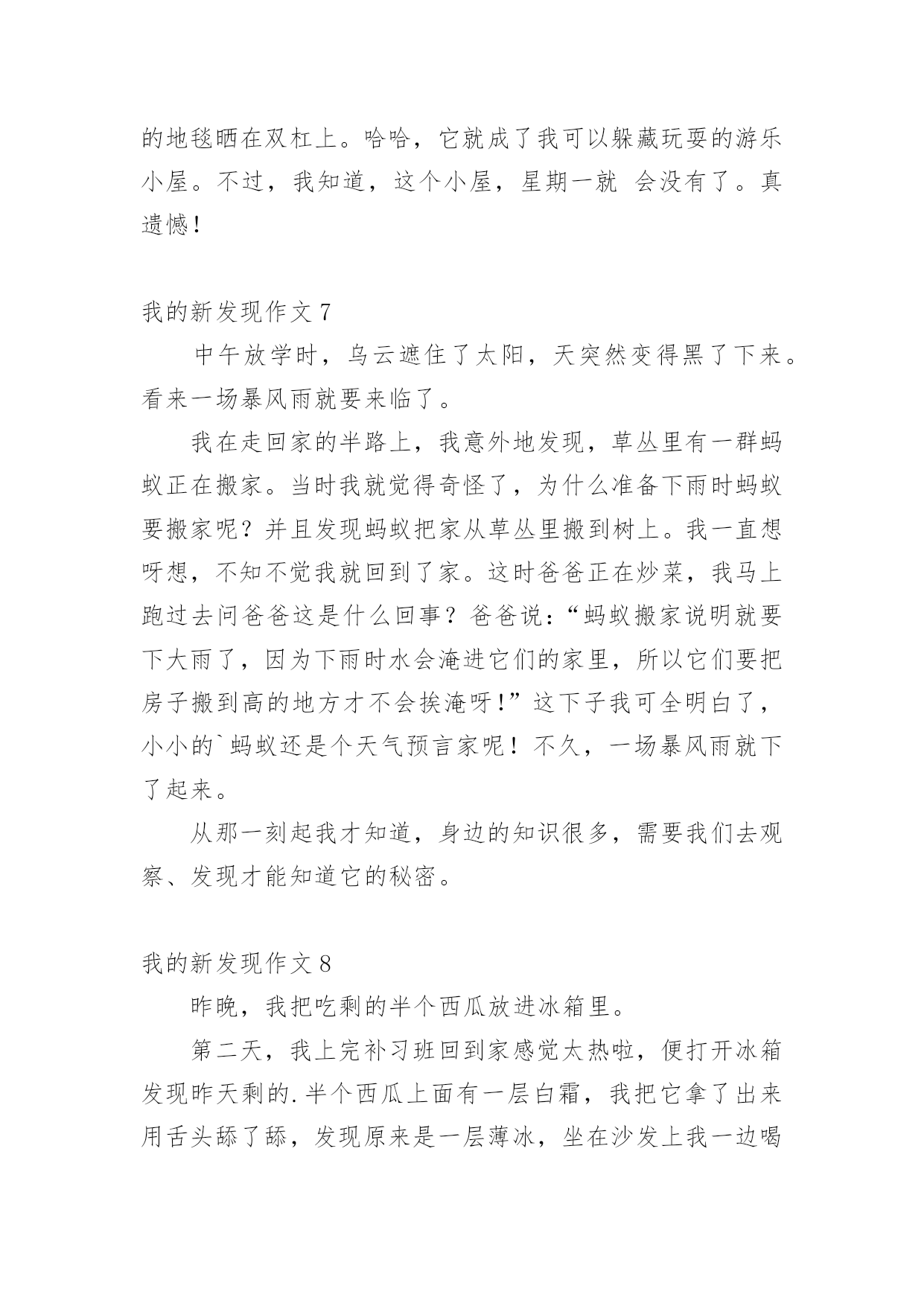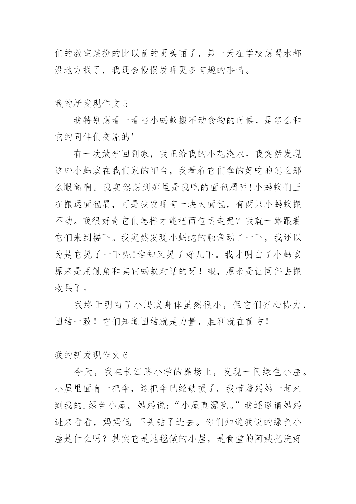 我的新发现作文 我的新发现作文在学习、工作、生活中,大家最不陌生的就是作文了吧,作文是人们以书面形式表情达意的言语活动。你写作文时总是无从下笔?下面是小编收集整理的我的新发现作文,欢迎大家借鉴与参考,希望对大家有所帮助。我的新发现作文1今天,我到公园玩,见到一个河塘,绿油油的,真好看!我用喝水瓶往荷叶上喷水,啊!怎么水珠像水银珠一样在叶片上来回滚动,水珠滚过的地方干干的。我赶快把爸妈叫来:“爸爸、妈妈为什么水珠滚过的地方干干的?”爸爸、妈妈让我撕一片叶子仔细观察,我就撕下一小块叶子仔细观察。哇!原来正反两面都有保护膜,是不是保护膜在起作用?我去掉保护膜又喷,果然叶片湿了。爸爸妈妈表扬我是爱观察的'好孩子。小朋友们你们是不是也不知道呀?如果不知道有时间到公园玩一玩好了。我们要时刻养成善于观察、爱动脑筋的好习惯。我的新发现作文2今天写完毛笔字回家的时候,我发现天空乌云滚滚,正在下着小雨。我突然又发现西边的天空很明亮,太阳依然挂在那里。这是我从来没看到的情景。我以为这时候世界各地都在下雨。我感到非常奇怪。我就问妈妈:“这是为什么呢?“妈妈说:“这是自然现象,因为我们这边正在下雨,而西边这时正在出太阳。”我回到家里,默默的'想着:我还有很多知识不懂,我绝对要认真学习,积累更多的知识。宇宙有很多奥秘等着我们去发现!我的新发现作文3今天,奶奶带我和哥哥去教堂敬拜,在教堂里我和哥哥跑来跑去,坐不住,奶奶叫我们要安静,不能打搅别人。在回家的路上,我发现了一片黑叶子,它的形状和花纹和其他的叶子没什么不一样,唯一不同的是颜色。小姨问我:“是不是这片叶子烂了。”我说:“不是的,它本来就是这样的,就是不知道它为什么会是黑色的。”另外,小姨表扬我,因为,今天是我主动要求写日志的'一天。我的新发现作文4暑假匆匆过去,新学期来了。上学第一天我来到学校;发现现在的学校比一年级的学校大的'多了,也比以前的学校漂亮多了。有长长的走廊,树木覆盖着。有漂亮的花儿,青青的草,好像为了欢迎我们的到来变的更绿了。还有我们的教室装扮的比以前的更美丽了,第一天在学校想喝水都没地方找了,我还会慢慢发现更多有趣的事情。我的新发现作文5我特别想看一看当小蚂蚁搬不动食物的时候,是怎么和它的同伴们交流的'有一次放学回到家,我正给我的小花浇水。我突然发现这些小蚂蚁在我们家的阳台,我看着它们拿的好吃的怎么那么眼熟啊。我实然想到那里是我吃的面包屑呢!小蚂蚁们正在搬运面包屑,可是我发现有一块大面包,有两只小蚂蚁搬不动。我很好奇它们怎样才能把面包运走呢?我就一路跟着它们来到楼下。我突然发现小蚂蛇的触角动了一下,我还以为是它晃了一下呢!谁知又晃了好几下。我才明白了小蚂蚁原来是用触角和其它蚂蚁对话的呀!哦,原来是让同伴去搬救兵了。我终于明白了小蚂蚁身体虽然很小,但它们齐心协力,团结一致!它们知道团结就是力量,胜利就在前方!我的新发现作文6今天,我在长江路小学的操场上,发现一间绿色小屋。小屋里面有一把伞,这把伞已经破损了。我带着妈妈一起来到我的.绿色小屋。妈妈说:“小屋真漂亮。”我还邀请妈妈进来看看,妈妈低下头钻了进去。你们知道我说的绿色小屋是什么吗?其实它是地毯做的小屋,是食堂的阿姨把洗好的地毯晒在双杠上。哈哈,它就成了我可以躲藏玩耍的游乐小屋。不过,我知道,这个小屋,星期一就会没有了。真遗憾!我的新发现作文7中午放学时,乌云遮住了太阳,天突然变得黑了下来。看来一场暴风雨就要来临了。我在走回家的半路上,我意外地发现,草丛里有一群蚂蚁正在搬家。当时我就觉得奇怪了,为什么准备下雨时蚂蚁要搬家呢?并且发现蚂蚁把家从草丛里搬到树上。我一直想呀想,不知不觉我就回到了家。这时爸爸正在炒菜,我马上跑过去问爸爸这是什么回事?爸爸说:“蚂蚁搬家说明就要下大雨了,因为下雨时水会淹进它们的家里,所以它们要把房子搬到高的地方才不会挨淹呀!”这下子我可全明白了,小小的`蚂蚁还是个天气预言家呢!不久,一场暴风雨就下了起来。从那一刻起我才知道,身边的知识很多,需要我们去观察、发现才能知道它的秘密。我的新发现作文8昨晚,我把吃剩的半个西瓜放进冰箱里。第二天,我上完补习班回到家感觉太热啦,便打开冰箱发现昨天剩的.半个西瓜上面有一层白霜,我把它拿了出来用舌头舔了舔,发现原来是一层薄冰,坐在沙发上我一边喝着酸奶一边吃着西瓜,就像吃着西瓜冰淇淋,酸酸甜甜的特别好吃,这样我又多了一道夏天的美食。我为西瓜冰淇淋代言。我的新发现作文9我发现了乌鸫不像其它鸟一样跳着走,而是迈着步走。我们观鸟小组去华南植物园观鸟。在大草坪上,有四五只乌鸫在草地上嬉戏。我和陆铿博拿着“鸟炮”(相机)猛拍它们。在看相片时,我惊奇地发现:在我们的照片中,乌鸫不是跳着走的,而是迈步走的'!是我眼花了,还是乌鸫在摆模特?都不是吧!这个问题一起困挠了我很久。直到有一天,我在