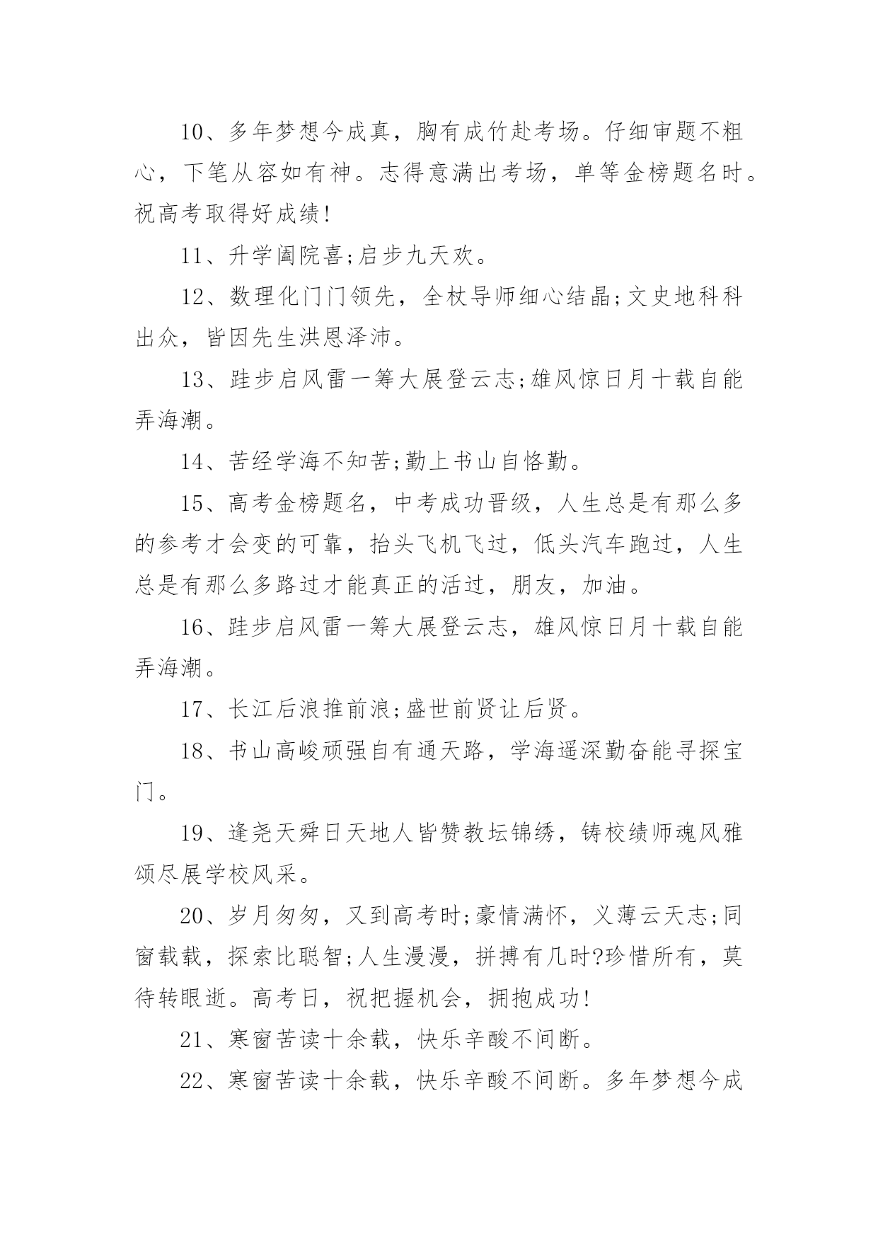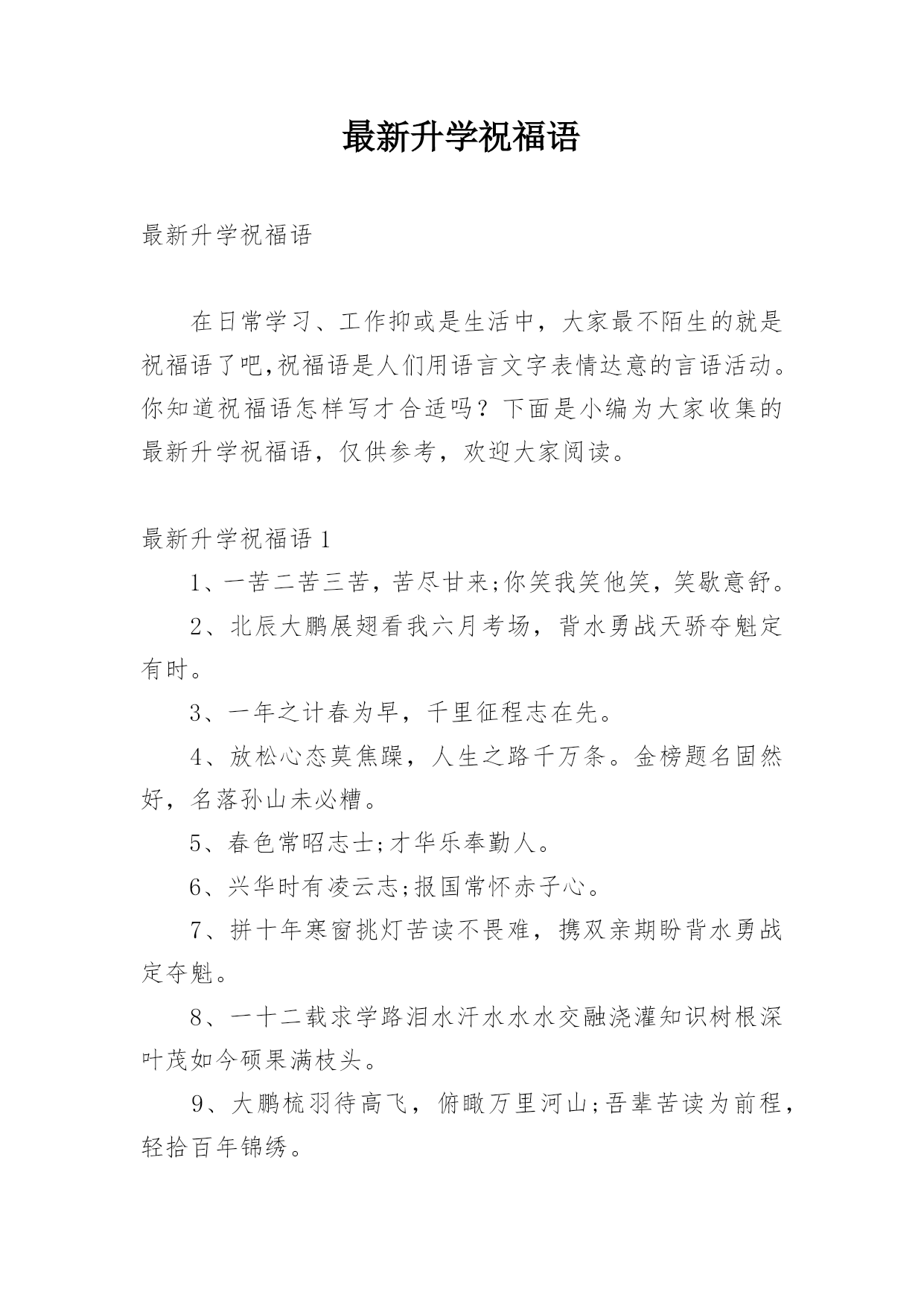 最新升学祝福语 最新升学祝福语在日常学习、工作抑或是生活中,大家最不陌生的就是祝福语了吧,祝福语是人们用语言文字表情达意的言语活动。你知道祝福语怎样写才合适吗?下面是小编为大家收集的最新升学祝福语,仅供参考,欢迎大家阅读。最新升学祝福语11、一苦二苦三苦,苦尽甘来;你笑我笑他笑,笑歇意舒。2、北辰大鹏展翅看我六月考场,背水勇战天骄夺魁定有时。3、一年之计春为早,千里征程志在先。4、放松心态莫焦躁,人生之路千万条。金榜题名固然好,名落孙山未必糟。5、春色常昭志士;才华乐奉勤人。6、兴华时有凌云志;报国常怀赤子心。7、拼十年寒窗挑灯苦读不畏难,携双亲期盼背水勇战定夺魁。8、一十二载求学路泪水汗水水水交融浇灌知识树根深叶茂如今硕果满枝头。9、大鹏梳羽待高飞,俯瞰万里河山;吾辈苦读为前程,轻拾百年锦绣。10、多年梦想今成真,胸有成竹赴考场。仔细审题不粗心,下笔从容如有神。志得意满出考场,单等金榜题名时。祝高考取得好成绩!11、升学阖院喜;启步九天欢。12、数理化门门领先,全杖导师细心结晶;文史地科科出众,皆因先生洪恩泽沛。13、跬步启风雷一筹大展登云志;雄风惊日月十载自能弄海潮。14、苦经学海不知苦;勤上书山自恪勤。15、高考金榜题名,中考成功晋级,人生总是有那么多的参考才会变的可靠,抬头飞机飞过,低头汽车跑过,人生总是有那么多路过才能真正的活过,朋友,加油。16、跬步启风雷一筹大展登云志,雄风惊日月十载自能弄海潮。17、长江后浪推前浪;盛世前贤让后贤。18、书山高峻顽强自有通天路,学海遥深勤奋能寻探宝门。19、逢尧天舜日天地人皆赞教坛锦绣,铸校绩师魂风雅颂尽展学校风采。20、岁月匆匆,又到高考时;豪情满怀,义薄云天志;同窗载载,探索比聪智;人生漫漫,拼搏有几时?珍惜所有,莫待转眼逝。高考日,祝把握机会,拥抱成功!21、寒窗苦读十余载,快乐辛酸不间断。22、寒窗苦读十余载,快乐辛酸不间断。多年梦想今成真,胸有成竹赴考场。仔细审题不粗心,下笔从容如有神。志得意满出考场,单等金榜题名时。祝高考取得好成绩!23、人生四喜有其一,魁元八方独熬头,横批:金榜提名。24、身向学海崇大业;师从泰山树贤才,横批:学无止境。25、严教严管倾一腔热血培育新秀,重德重才下一翻苦心浇灌桃李。26、数理化门门领先,全杖导师细心结晶;文史地科科出众,皆因先生洪恩泽沛。横批:莫负师恩27、青春是一眼忘忧泉水,高三便是这眼泉水咕噜咕噜冒泡的季节。而我却在咕噜的`泡泡里嗅到了浓厚的笔墨的味道。当然我并不是排斥这些,但我们肩上过大的压力确实带走了不少的乐趣。可惜的是,高考过后,连压力也会成为一种永远的回忆,成为我缅怀逝去的高三生活的有力证据。在时间面前我们是这般无力,唯一能留下的,就只剩那眼泉水和我们曾经无悔的誓言了,但愿日复一日,年复一年,当我重新翻开这一页时,人心依旧。最新升学祝福语2前程是那天上漂浮的云霞,人生是那海里翻涌的浪花,趁着现在这金子般的时代,发出耀眼夺目的光芒。不要忘记自己曾经走过的那些路,那些洒着汗珠闪耀着光彩的路,那些惊心动魄披荆斩棘的路,那些崎岖不平倍感艰辛的路,那些浸透泪水满是痛苦的路……自己走过的路,都是自己一生最宝贵的财富。只有记住曾经的这些路,才能更好的走好以后的路。在知识海洋的底层,与生活海洋的底层一样,是一片无比神奇的世界。愿你勇敢地潜到那儿去,去探求这神秘世界的无穷奥秘!让时间在知识的枝条上、智慧的绿叶上、成熟的`果实上留下它勤奋的印痕!世间最可宝贵的就是今天,最易丧失的也是今天;愿你在未来的一年中,无限珍惜这每一个今天。如果明天是一幢摩天大厦,今天就是决定那大厦寿命的基石。假如你曾有过虚度的时光,请不要以叹息作为补偿;明天的路途毕竟长于逝去的岁月。快迈步,前面相迎的是幸福的曙光!你想获得优异成果的话,请谨慎地珍惜和支配自己的时间。你爱惜你的生命,从不浪费时间,因为你知道:时间就是塑造生命的材料。“焚膏油以继晷,恒兀兀以穷年。”所有天才都是最强壮的牛,他们每天工作十八小时,孜孜不倦。把黄昏当成黎明,时间会源源而来;把成功当作起步,成绩就会不断涌现。人的一生也像四季:春播、夏长、秋收、冬尝。朋友,乘你青春风发,努力撒播幸福的种子吧!“积财千万,无过读书”。积累,积累,再积累,雪山终将孕出一条浩浩大江。正因为汇聚了千山万水,海才能掀起洪波巨澜;正因为积累起一点一滴,海水才永不枯竭。朋友,去汇集,去积累吧,愿你拥有知识的大海。知识是一匹无私的骏马,谁能驾驭它,它就属于谁。知识是升天的羽翼,是恐惧的解毒药,人的自主权深藏于知识之中。让我们争分夺秒,好学不倦,努力使自己成为一个学识渊博、眼光远大的人。学问是苦根上长出的甜果。“读书破万卷,下笔如有神。”诚能“破其卷而取其神”,则读书作文之道得矣。人生有梦想,总要执着去远方,生活有希望,总要乐