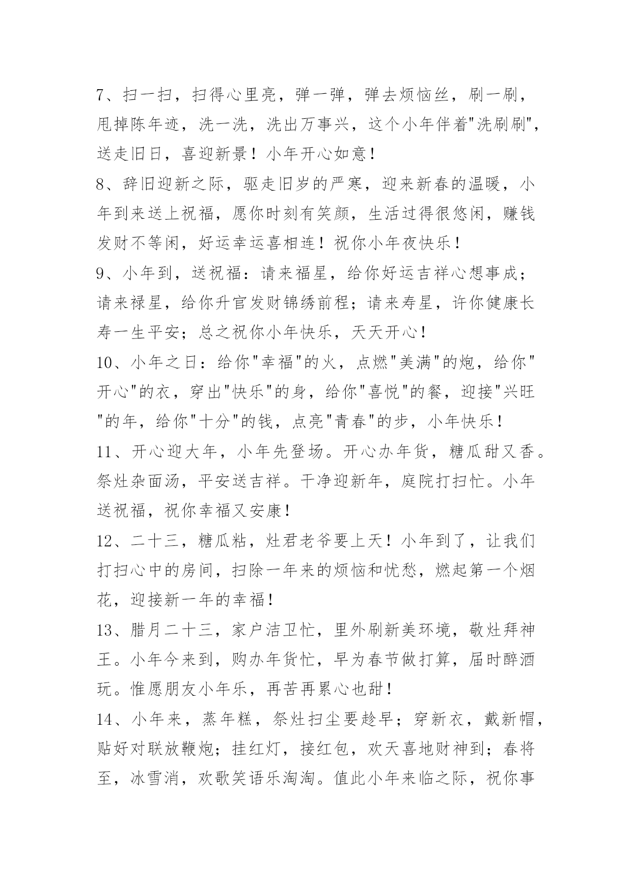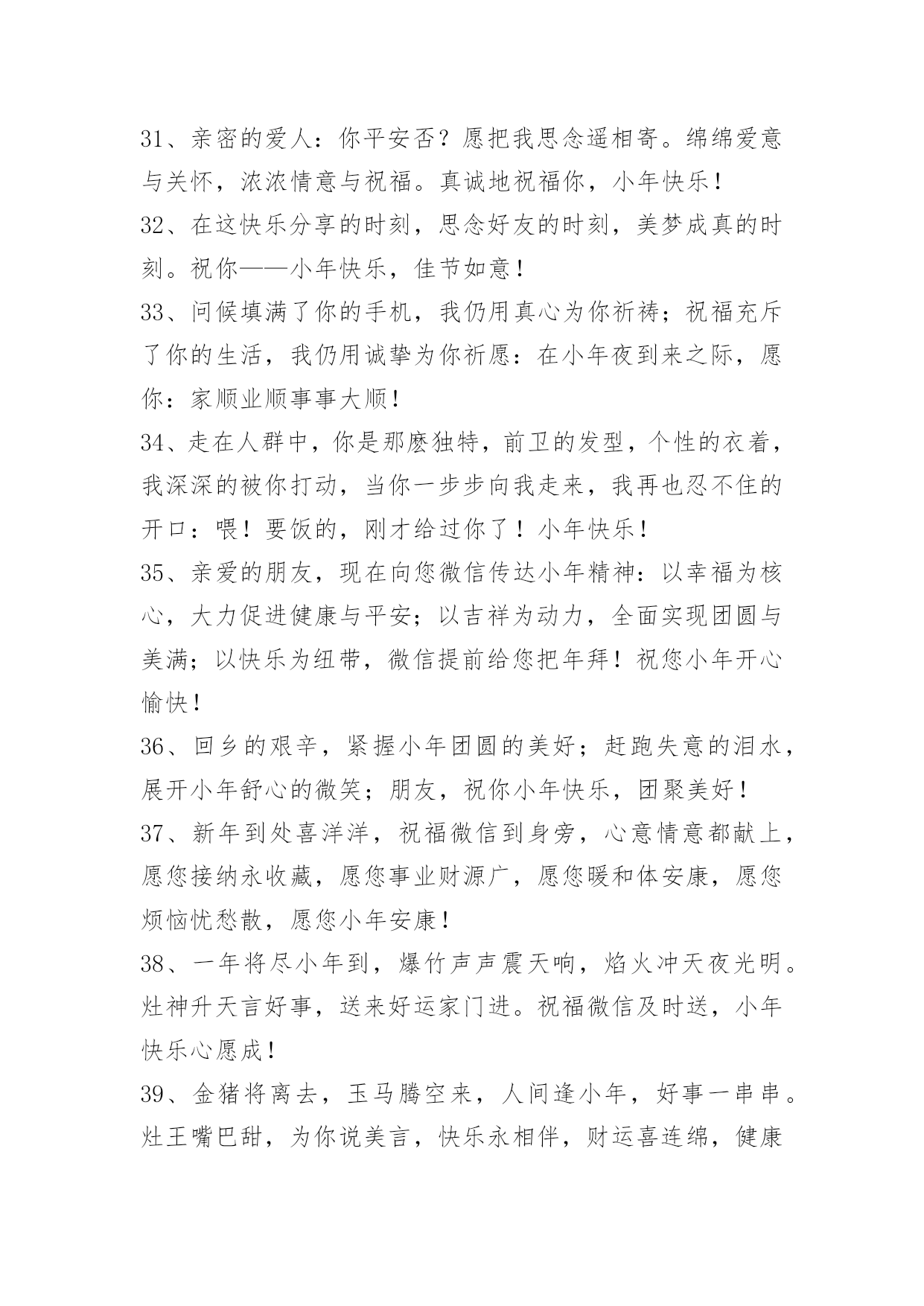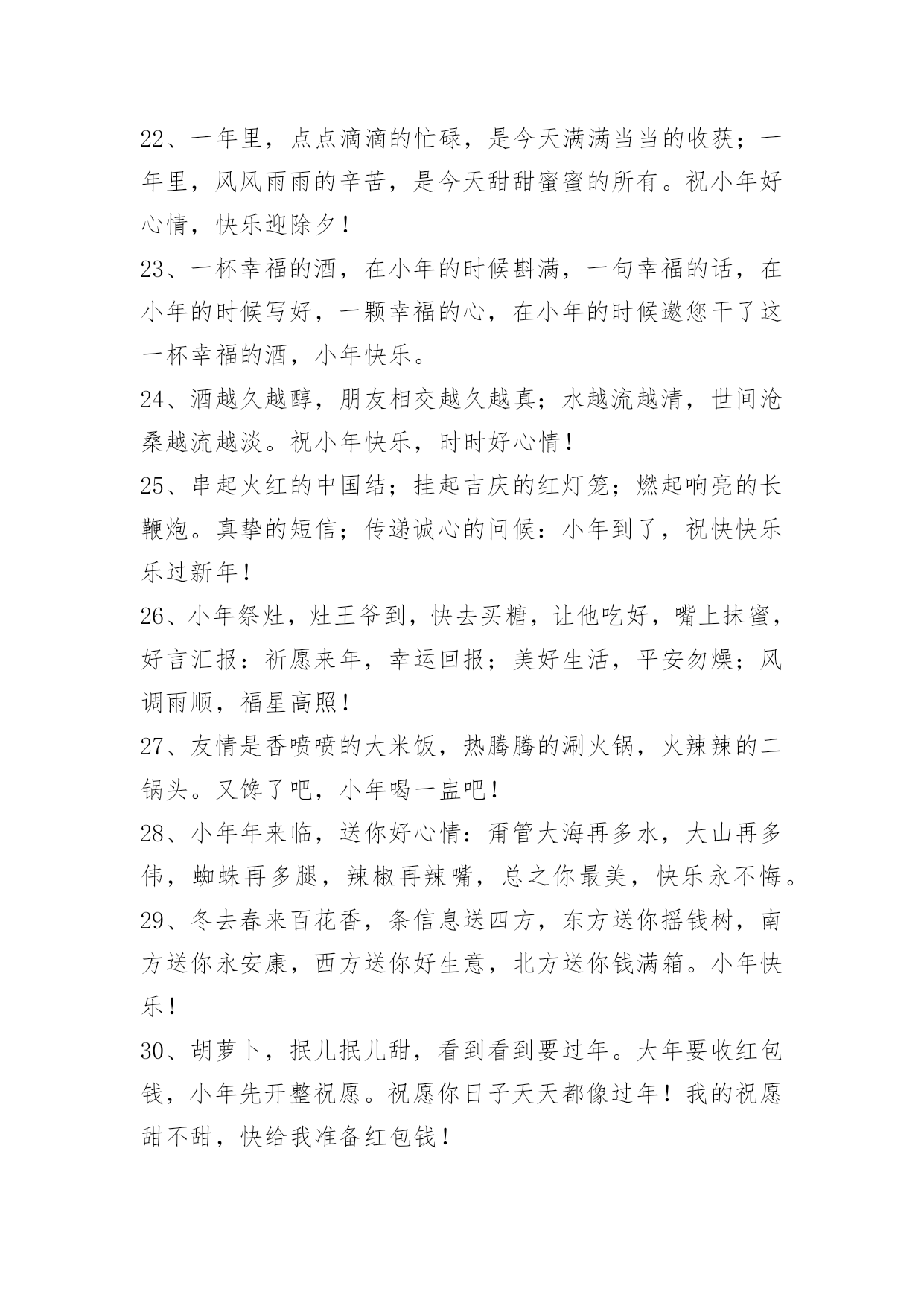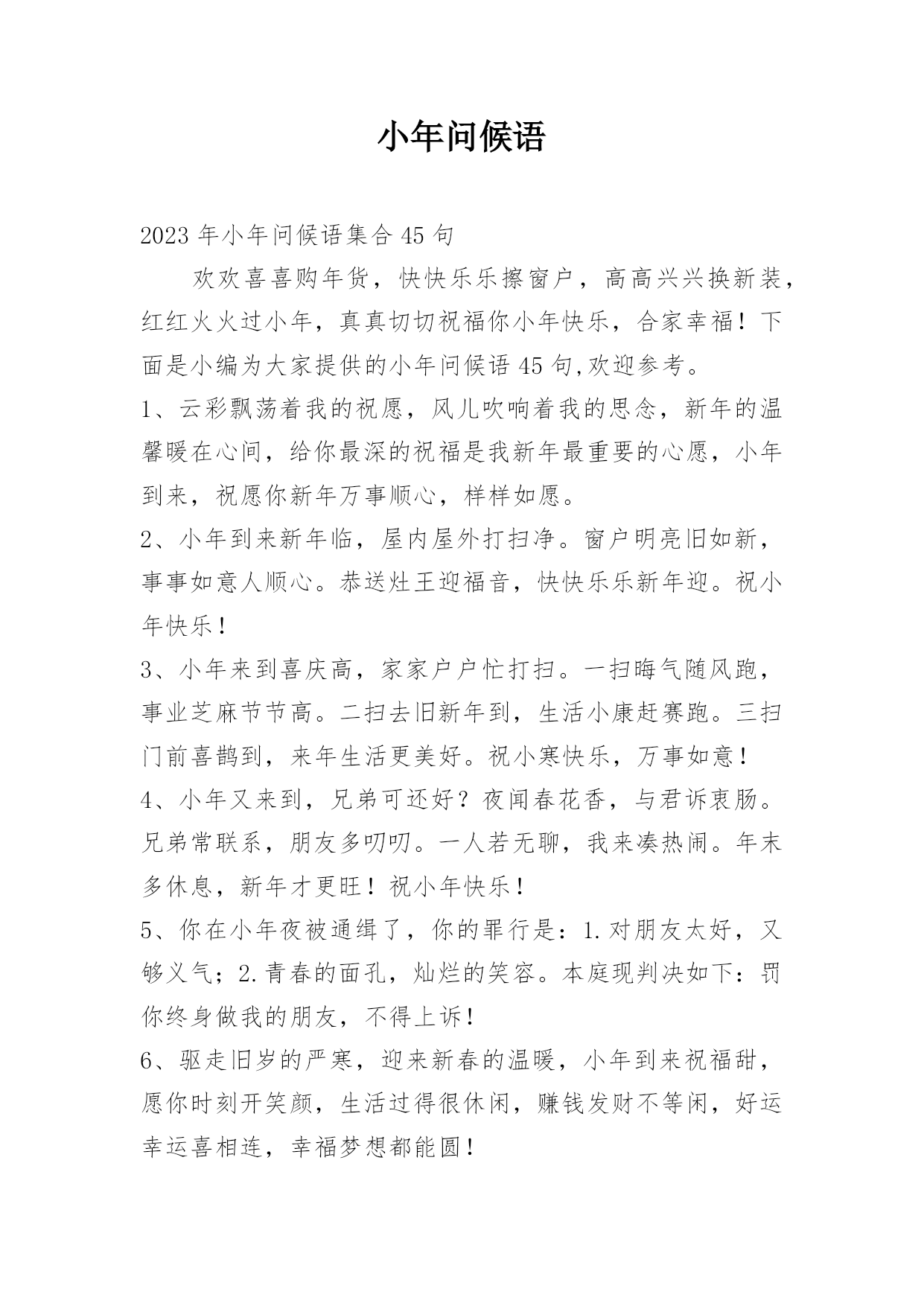 小年问候语 2023年小年问候语集合45句欢欢喜喜购年货,快快乐乐擦窗户,高高兴兴换新装,红红火火过小年,真真切切祝福你小年快乐,合家幸福!下面是小编为大家提供的小年问候语45句,欢迎参考。1、云彩飘荡着我的祝愿,风儿吹响着我的思念,新年的温馨暖在心间,给你最深的祝福是我新年最重要的心愿,小年到来,祝愿你新年万事顺心,样样如愿。2、小年到来新年临,屋内屋外打扫净。窗户明亮旧如新,事事如意人顺心。恭送灶王迎福音,快快乐乐新年迎。祝小年快乐!3、小年来到喜庆高,家家户户忙打扫。一扫晦气随风跑,事业芝麻节节高。二扫去旧新年到,生活小康赶赛跑。三扫门前喜鹊到,来年生活更美好。祝小寒快乐,万事如意!4、小年又来到,兄弟可还好?夜闻春花香,与君诉衷肠。兄弟常联系,朋友多叨叨。一人若无聊,我来凑热闹。年末多休息,新年才更旺!祝小年快乐!5、你在小年夜被通缉了,你的罪行是:1.对朋友太好,又够义气;2.青春的面孔,灿烂的笑容。本庭现判决如下:罚你终身做我的朋友,不得上诉!6、驱走旧岁的严寒,迎来新春的温暖,小年到来祝福甜,愿你时刻开笑颜,生活过得很休闲,赚钱发财不等闲,好运幸运喜相连,幸福梦想都能圆!7、扫一扫,扫得心里亮,弹一弹,弹去烦恼丝,刷一刷,甩掉陈年迹,洗一洗,洗出万事兴,这个小年伴着"洗刷刷",送走旧日,喜迎新景!小年开心如意!8、辞旧迎新之际,驱走旧岁的严寒,迎来新春的温暖,小年到来送上祝福,愿你时刻有笑颜,生活过得很悠闲,赚钱发财不等闲,好运幸运喜相连!祝你小年夜快乐!9、小年到,送祝福:请来福星,给你好运吉祥心想事成;请来禄星,给你升官发财锦绣前程;请来寿星,许你健康长寿一生平安;总之祝你小年快乐,天天开心!10、小年之日:给你"幸福"的火,点燃"美满"的炮,给你"开心"的衣,穿出"快乐"的身,给你"喜悦"的餐,迎接"兴旺"的年,给你"十分"的钱,点亮"青春"的步,小年快乐!11、开心迎大年,小年先登场。开心办年货,糖瓜甜又香。祭灶杂面汤,平安送吉祥。干净迎新年,庭院打扫忙。小年送祝福,祝你幸福又安康!12、二十三,糖瓜粘,灶君老爷要上天!小年到了,让我们打扫心中的房间,扫除一年来的烦恼和忧愁,燃起第一个烟花,迎接新一年的幸福!13、腊月二十三,家户洁卫忙,里外刷新美环境,敬灶拜神王。小年今来到,购办年货忙,早为春节做打算,届时醉酒玩。惟愿朋友小年乐,再苦再累心也甜!14、小年来,蒸年糕,祭灶扫尘要趁早;穿新衣,戴新帽,贴好对联放鞭炮;挂红灯,接红包,欢天喜地财神到;春将至,冰雪消,欢歌笑语乐淘淘。值此小年来临之际,祝你事业辉煌没烦恼,金银财宝入腰包!15、f到了,美好祝福堆成堆,祝愿你新的一年里,分分秒秒烦恼忧愁不在,时时刻刻身体心情不坏,岁岁年年工作生活不赖,永远那么闪闪惹人爱!16、红红灯笼挂起,快乐喜上眉梢;长长鞭炮响起,欢欢喜喜甜蜜;真情短信传起,温馨关怀送你:小年到了,祝你合家欢乐,快乐如意!17、这一季有我最深的思念。就让风捎去满心的祝福,缀满你甜蜜的梦境。祝你拥有一个灿烂的小年!18、送你一条围巾,围满今年温暖;送你一双手套,把握今年机遇;送你一张明信片,上面写满祝福;愿您今年大年未到,小年率先收满幸福和快乐。19、小年,停下忙碌的脚步,吃一颗灶糖回味这一年的美好,拿起扫帚把一年的不快清除,发个短信,把祝福送给你,祝小年快乐!20、小年到,全套幸福大促销。快递好运,你前脚走好运后脚就到;网购开心,你收到后眉开眼笑;预定平安,你一路顺风来去从容;悬赏财富值,从此你将日进斗金;另外还附赠健康保险一份,喜庆红包一个,吉祥如意小礼盒一对,就当给你拜早年喽!21、小年到眼前,幸福来盘点:腊月二十三,好运不下班;年末没加班,奖金翻一番;股票一直升,副业也赚钱;回家搭顺风,平安带回家。小年到了,祝你在新的一年平安顺利,阖家幸福!22、一年里,点点滴滴的忙碌,是今天满满当当的收获;一年里,风风雨雨的辛苦,是今天甜甜蜜蜜的所有。祝小年好心情,快乐迎除夕!23、一杯幸福的酒,在小年的时候斟满,一句幸福的话,在小年的时候写好,一颗幸福的心,在小年的时候邀您干了这一杯幸福的酒,小年快乐。24、酒越久越醇,朋友相交越久越真;水越流越清,世间沧桑越流越淡。祝小年快乐,时时好心情!25、串起火红的中国结;挂起吉庆的红灯笼;燃起响亮的长鞭炮。真挚的短信;传递诚心的问候:小年到了,祝快快乐乐过新年!26、小年祭灶,灶王爷到,快去买糖,让他吃好,嘴上抹蜜,好言汇报:祈愿来年,幸运回报;美好生活,平安勿燥;风调雨顺,福星高照!27、友情是香喷喷的大米饭,热腾腾的涮火锅,火辣辣的二锅头。又馋了吧,小年喝一盅吧!28、小年年来临,送你好心情:甭管大海再多水,大山再多伟,蜘蛛再多腿,辣椒再辣嘴,总之你最美,快乐永不悔。29、冬去春来百花香,条信息送四