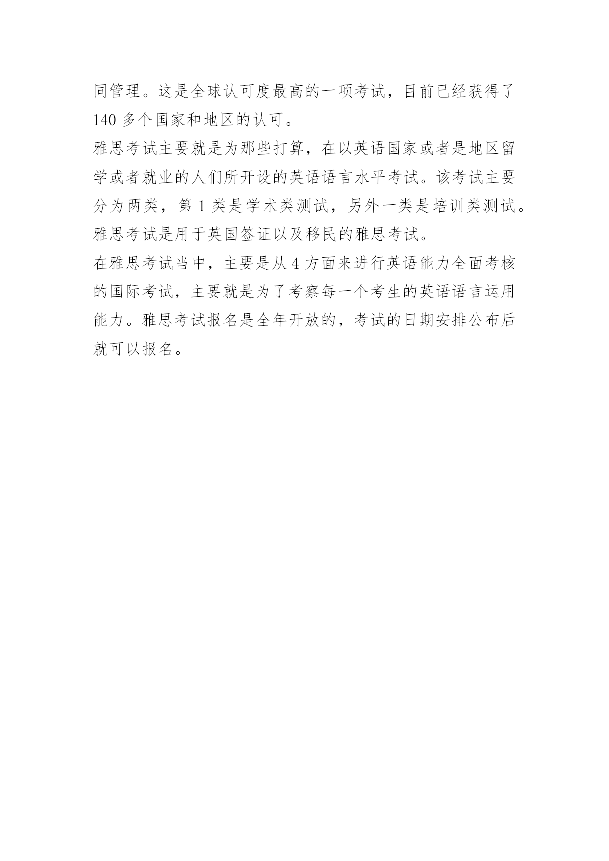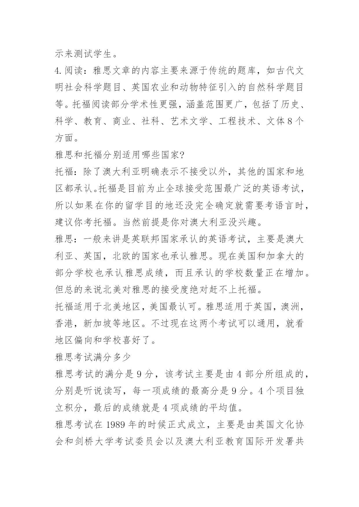 托福雅思考试内容对比分析 从纯粹的英语水平来说,托福比雅思更难一些,但究竟哪个难考,还需要考虑留学地点,以及考生对哪种考试的考试形式和内容更熟悉,比如雅思考试是笔试,托福是网考。下面是小编给大家带来的托福雅思考试内容对比(分析),以供大家参考!托福雅思考试内容对比分析1.听力:雅思听力部分会有很多经典的场景。详细的考核会更接近国外生活的要求,考试题目也会趋于多样化。托福网考的听力部分更具学术性,演讲时间也更长。托福考试的听力部分的答题时间会比雅思长。并且有一些题目是可以重复的,而且考试类型还是以选择题为主,这样更符合中国学生的考试模式。2.作文:雅思有一大一小两篇作文,小作文话题中的各种图表交替出现,雅思大作文涵盖了从政府到科学和技术的各种话题。托福网考包括综合写作和独立写作。要求考生先读一篇文章,然后再听录音并写一篇150到225字的短文。托福独立写作部分是写考生熟悉的生活、学习的内容。3.口语:雅思口语采用“人人对话”的模式,雅思话题是比较日常的,没有标准答案。托福口语采用“人机对话”的方式,主题包括校园生活和学术讲座,托福模拟正式的课堂演示来测试学生。4.阅读:雅思文章的内容主要来源于传统的题库,如古代文明社会科学题目、英国农业和动物特征引入的自然科学题目等。托福阅读部分学术性更强,涵盖范围更广,包括了历史、科学、教育、商业、社科、艺术文学、工程技术、文体8个方面。雅思和托福分别适用哪些国家?托福:除了澳大利亚明确表示不接受以外,其他的国家和地区都承认。托福是目前为止全球接受范围最广泛的英语考试,所以如果在你的留学目的地还没完全确定就需要考语言时,建议你考托福。当然前提是你对澳大利亚没兴趣。雅思:一般来讲是英联邦国家承认的英语考试,主要是澳大利亚、英国,北欧的国家也承认雅思。现在美国和加拿大的部分学校也承认雅思成绩,而且承认的学校数量正在增加。但总的来说北美对雅思的接受度绝对赶不上托福。托福适用于北美地区,美国最认可。雅思适用于英国,澳洲,香港,新加坡等地区。不过现在这两个考试可以通用,就看地区偏向和学校喜好了。雅思考试满分多少雅思考试的满分是9分,该考试主要是由4部分所组成的,分别是听说读写,每一项成绩的最高分是9分。4个项目独立积分,最后的成绩就是4项成绩的平均值。雅思考试在1989年的时候正式成立,主要是由英国文化协会和剑桥大学考试委员会以及澳大利亚教育国际开发署共同管理。这是全球认可度最高的一项考试,目前已经获得了140多个国家和地区的认可。雅思考试主要就是为那些打算,在以英语国家或者是地区留学或者就业的人们所开设的英语语言水平考试。该考试主要分为两类,第1类是学术类测试,另外一类是培训类测试。雅思考试是用于英国签证以及移民的雅思考试。在雅思考试当中,主要是从4方面来进行英语能力全面考核的国际考试,主要就是为了考察每一个考生的英语语言运用能力。雅思考试报名是全年开放的,考试的日期安排公布后就可以报名。