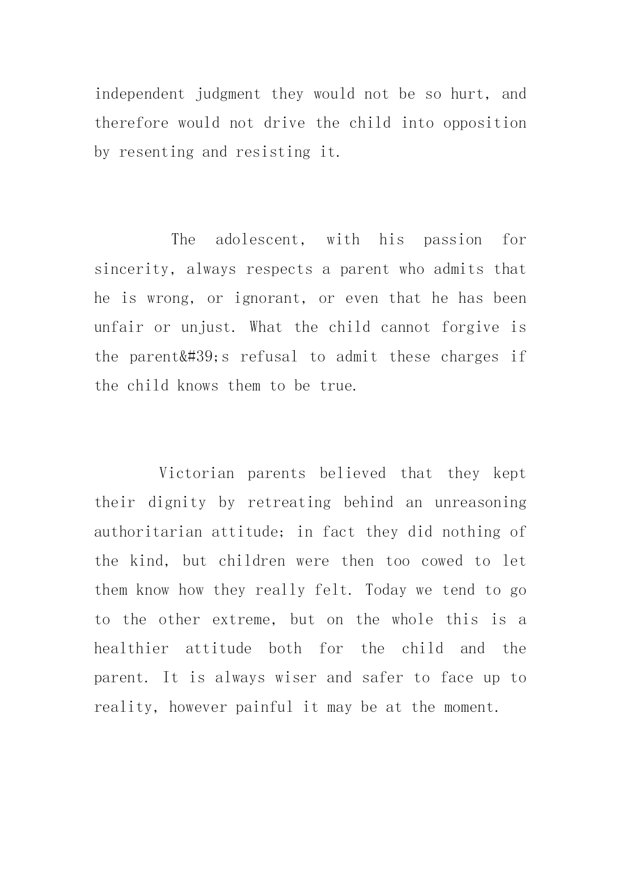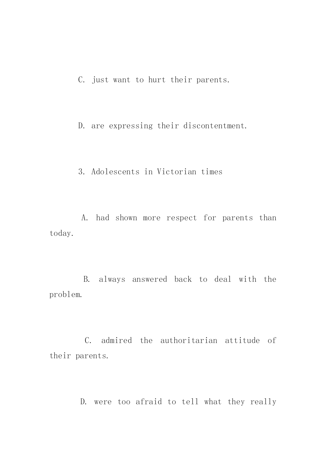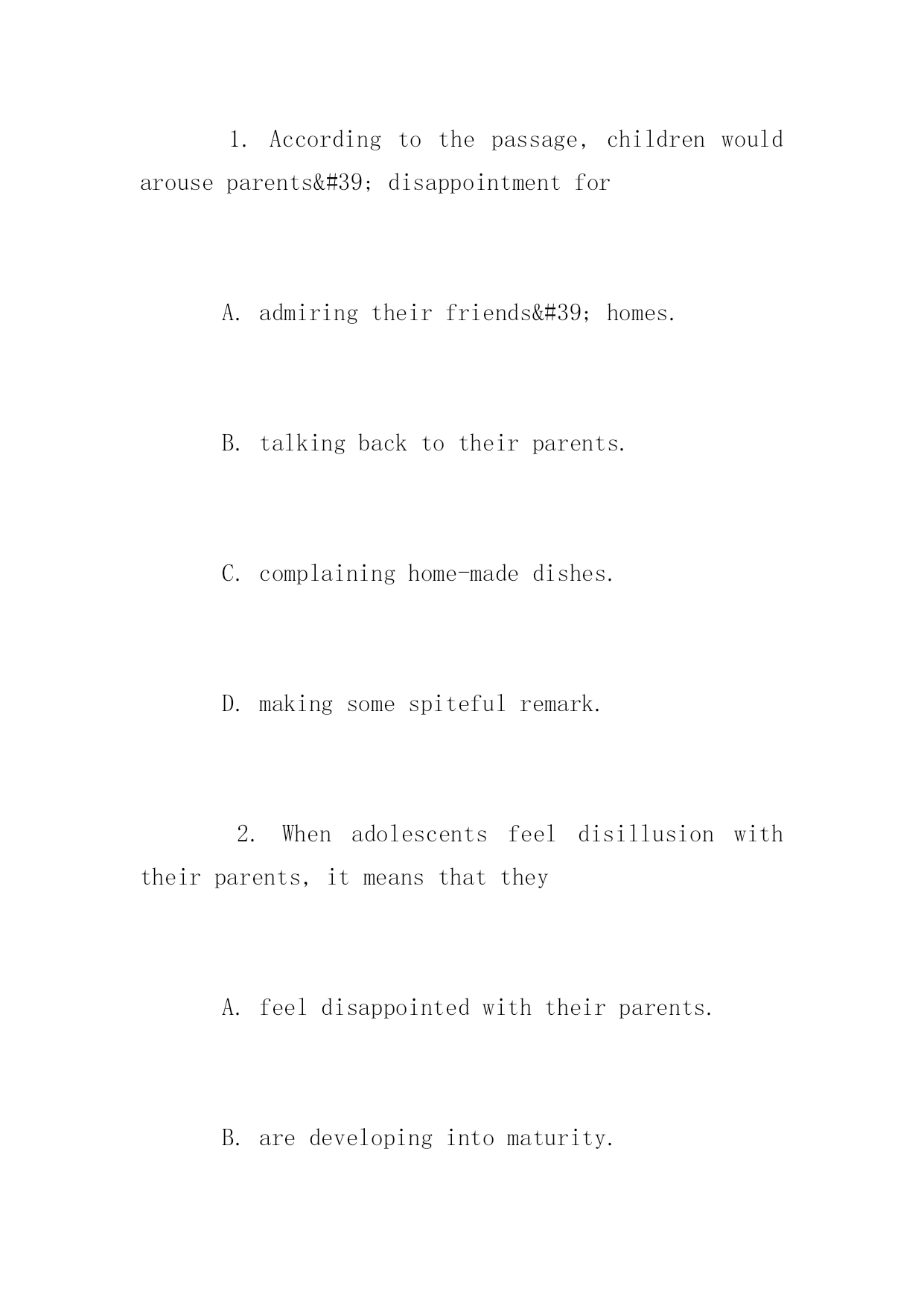 英语专四阅读练习及答案 2018英语专四阅读练习及答案汇总 小编为大家整理了2018英语专四阅读练习及答案5篇汇总,供各位考生参考。 成长与家庭危机 Parentsareoftenupsetwhentheirchildrenpraisethehomesoftheirfriendsandregarditasaslur(诋毁)ontheirowncooking,orcleaning,orfurniture,andoftenarefoolishenoughtolettheadolescentsseethattheyareannoyed.Theymayevenaccusethemofdisloyalty,ormakesomespitefulremarkaboutthefriends'parents.Suchalossofdignityanddescentintochildishbehavioronthepartoftheadultsdeeplyshockstheadolescents,andmakesthemresolvethatinfuturetheywillnottalktotheirparentsabouttheplaceorpeopletheyvisit.Beforeverylongtheparentswillbecomplainingthatthechildissosecretiveandnevertellsthemanything,buttheyseldomrealizethattheyhavebroughtthisonthemselves. Disillusionmentwiththeparents,howevergoodandadequatetheymaybebothasparentsandasinpiduals,istosomedegreeinevitable.Mostchildrenhavesuchahighidealoftheirparents,unlesstheparentsthemselveshavebeenunsatisfactory,thatitcan,hardlyhopetostanduptoarealisticevaluation.Parentswouldbegreatlysurprisedanddeeplytouchediftheyrealizedhowmuchbelieftheirchildrenusuallyhaveintheircharacterandinfallibility,andhowmuchthisfaithmeanstoachild.Ifparentswerepreparedforthisadolescentreaction,andrealizedthatitwasasignthatthechildwasgrowingupanddevelopingvaluablepowersofobservationandindependentjudgmenttheywouldnotbesohurt,andthereforewouldnotdrivethechildintooppositionbyresentingandresistingit. Theadolescent,withhispassionforsincerity,alwaysrespectsaparentwhoadmitsthatheiswrong,orignorant,oreventhathehasbeenunfairorunjust.Whatthechildcannotforgiveistheparent'srefusaltoadmitthesechargesifthechildknowsthemtobetrue. Victorianparentsbelievedthattheykepttheirdignitybyretreatingbehindanunreasoningauthoritarianattitude;infacttheydidnothingofthekind,butchildrenwerethentoocowedtoletthemknowhowtheyreallyfelt.Todaywetendtogototheotherextreme,butonthewholethisisahealthierattitudebothforthechildandtheparent.Itisalwayswiserandsafertofaceuptoreality,howeverpainfulitmaybeatthemoment. 1.Accordingtothepassage,childrenwoulda