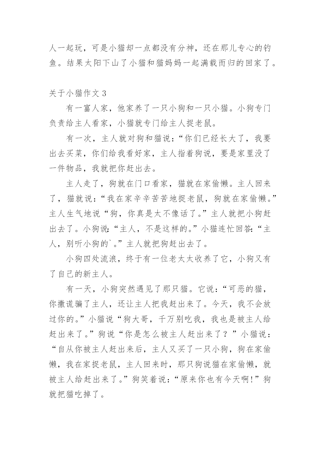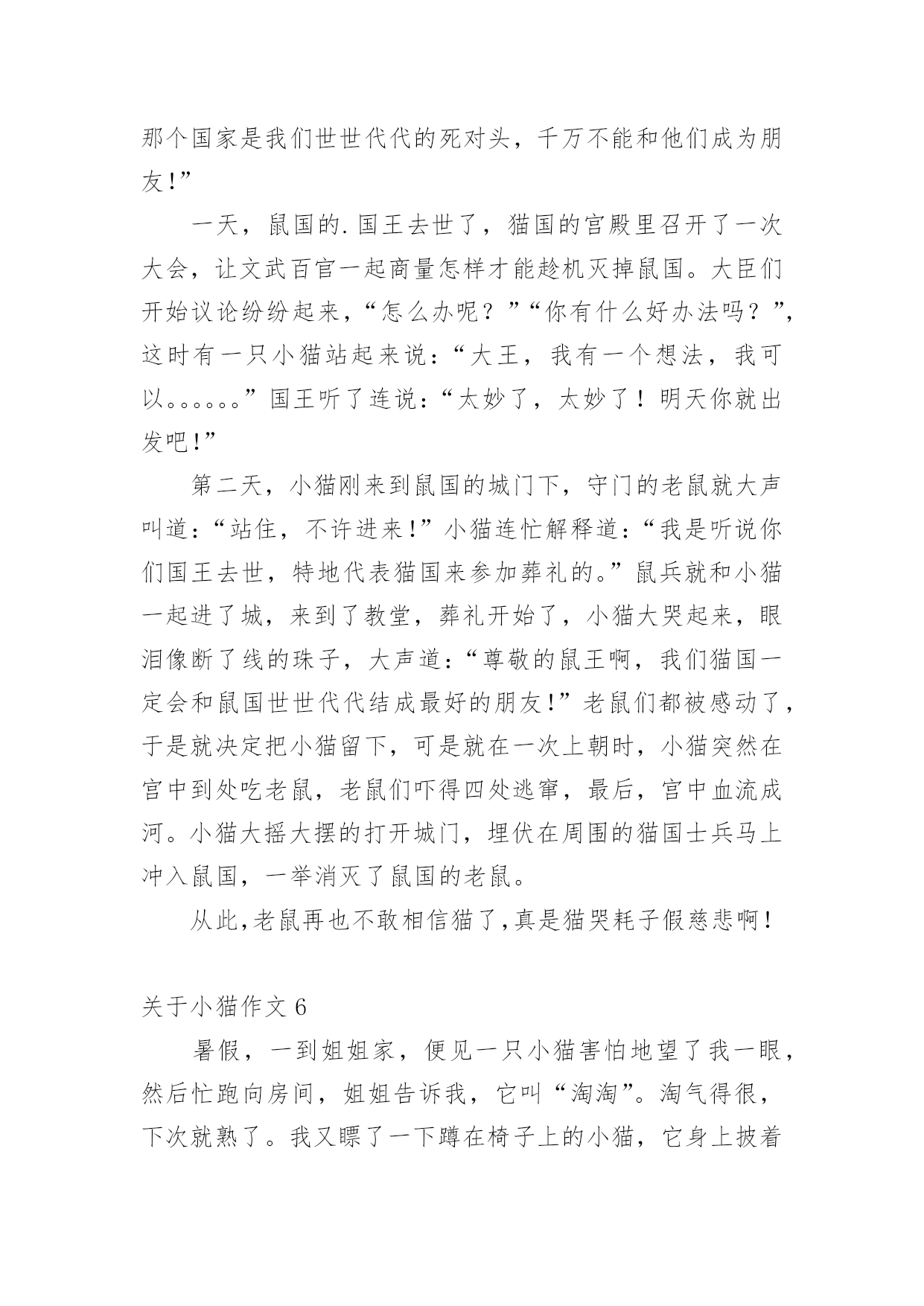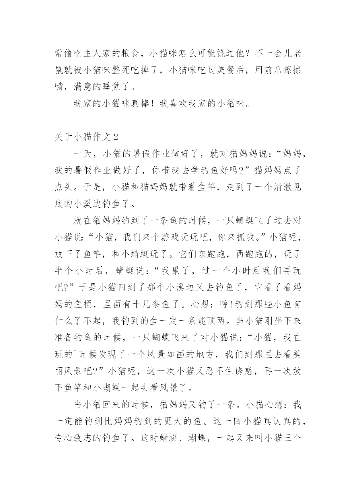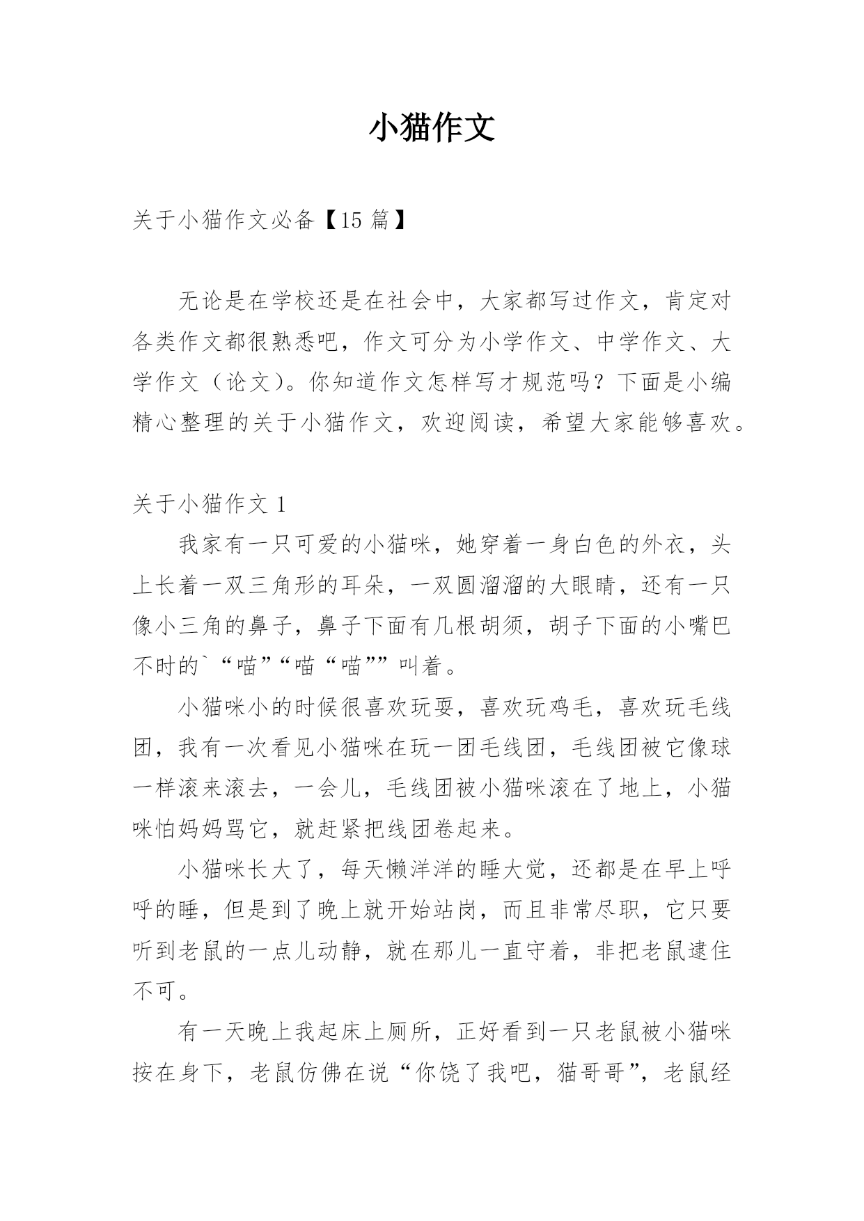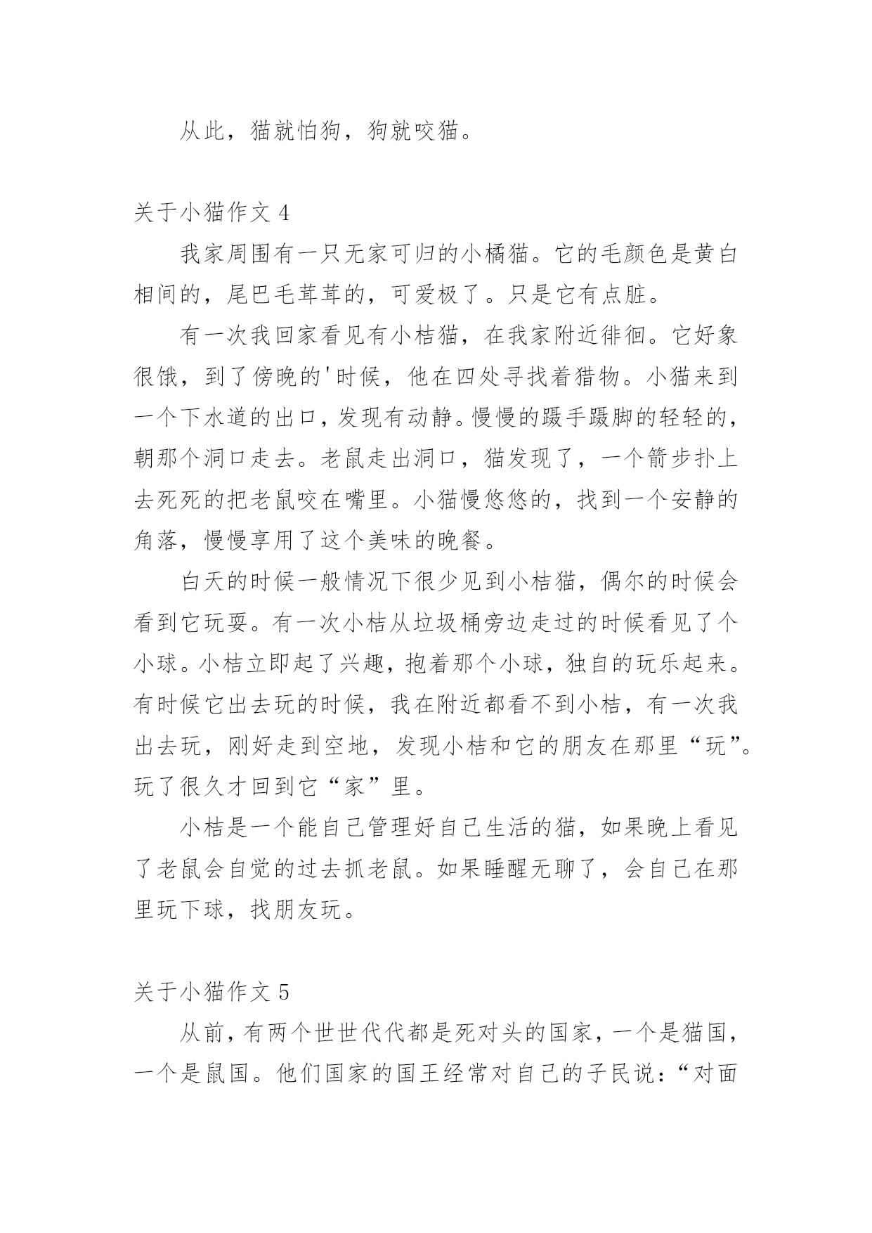 小猫作文 关于小猫作文必备【15篇】无论是在学校还是在社会中,大家都写过作文,肯定对各类作文都很熟悉吧,作文可分为小学作文、中学作文、大学作文(论文)。你知道作文怎样写才规范吗?下面是小编精心整理的关于小猫作文,欢迎阅读,希望大家能够喜欢。关于小猫作文1我家有一只可爱的小猫咪,她穿着一身白色的外衣,头上长着一双三角形的耳朵,一双圆溜溜的大眼睛,还有一只像小三角的鼻子,鼻子下面有几根胡须,胡子下面的小嘴巴不时的`“喵”“喵“喵””叫着。小猫咪小的时候很喜欢玩耍,喜欢玩鸡毛,喜欢玩毛线团,我有一次看见小猫咪在玩一团毛线团,毛线团被它像球一样滚来滚去,一会儿,毛线团被小猫咪滚在了地上,小猫咪怕妈妈骂它,就赶紧把线团卷起来。小猫咪长大了,每天懒洋洋的睡大觉,还都是在早上呼呼的睡,但是到了晚上就开始站岗,而且非常尽职,它只要听到老鼠的一点儿动静,就在那儿一直守着,非把老鼠逮住不可。有一天晚上我起床上厕所,正好看到一只老鼠被小猫咪按在身下,老鼠仿佛在说“你饶了我吧,猫哥哥”,老鼠经常偷吃主人家的粮食,小猫咪怎么可能饶过他?不一会儿老鼠就被小猫咪整死吃掉了,小猫咪吃过美餐后,用前爪擦擦嘴,满意的睡觉了。我家的小猫咪真棒!我喜欢我家的小猫咪。关于小猫作文2一天,小猫的暑假作业做好了,就对猫妈妈说:“妈妈,我的暑假作业做好了,你带我去学钓鱼好吗?”猫妈妈点了点头。于是,小猫和猫妈妈就带着鱼竿,走到了一个清澈见底的小溪边钓鱼了。就在猫妈妈钓到了一条鱼的时候,一只蜻蜓飞了过去对小猫说:“小猫,我们来个游戏玩玩吧,你来抓我。”小猫呢,放下了鱼竿,和小蜻蜓玩了。它们东跑跑,西跑跑的,玩了半个小时后,蜻蜓说:“我累了,过一个小时后我们再玩吧?”于是小猫回到了那个小溪边又去钓鱼了,它看了看妈妈的鱼桶,里面有十几条鱼了。心想:哼!钓到那些小鱼有什么了不起,我钓到的鱼一定一条能顶两。当小猫刚坐下来准备钓鱼的时候,一只蝴蝶飞来了对小猫说:“小猫,我在玩的`时候发现了一个风景如画的地方,我们到那里去看美丽风景吧?”小猫呢,这一次小猫又忍不住诱惑,再一次放下鱼竿和小蝴蝶一起去看风景了。当小猫回来的时候,猫妈妈又钓了一条。小猫心想:我一定能钓到比妈妈钓到的更大的鱼。这一回小猫真认真的,专心致志的钓鱼了。这时蜻蜓、蝴蝶,一起又来叫小猫三个人一起玩,可是小猫却一点都没有分神,还在那儿专心的钓鱼。结果太阳下山了小猫和猫妈妈一起满载而归的回家了。关于小猫作文3有一富人家,他家养了一只小狗和一只小猫。小狗专门负责给主人看家,小猫就专门给主人捉老鼠。有一次,主人就对狗和猫说:“你们已经长大了,我要出去买菜,你们给我看好家,主人指着狗说,要是家里没了一件物品,我就把你赶出去。主人走了,狗就在门口看家,猫就在家偷懒。主人回来了,猫就说:“我在家辛辛苦苦地捉老鼠,狗就在家偷懒。”主人生气地说“狗,你真是太不像话了。”主人就把小狗赶出去了。小狗说:“主人,不是这样的。”小猫连忙回答:“主人,别听小狗的`。”主人就把狗赶出去了。小狗四处流浪,终于有一位老太太收养了它,小狗又有了自己的新主人。有一天,小狗突然遇见了那只猫。它说:“可恶的猫,你撒谎骗了主人,还让主人把我赶出来了。今天,我不会放过你的。”小猫说“狗大哥,千万别吃我,我也是被主人给赶出来了。”狗说“你是怎么被主人赶出来了?”小猫说:“自从你被主人赶出来后,主人又买了一只小狗,狗在家偷懒,我在家捉老鼠,主人回来时,那只狗说猫在家偷懒,就被主人给赶出来了。”狗笑着说:“原来你也有今天啊!”狗就把猫吃掉了。从此,猫就怕狗,狗就咬猫。关于小猫作文4我家周围有一只无家可归的小橘猫。它的毛颜色是黄白相间的,尾巴毛茸茸的,可爱极了。只是它有点脏。有一次我回家看见有小桔猫,在我家附近徘徊。它好象很饿,到了傍晚的'时候,他在四处寻找着猎物。小猫来到一个下水道的出口,发现有动静。慢慢的蹑手蹑脚的轻轻的,朝那个洞口走去。老鼠走出洞口,猫发现了,一个箭步扑上去死死的把老鼠咬在嘴里。小猫慢悠悠的,找到一个安静的角落,慢慢享用了这个美味的晚餐。白天的时候一般情况下很少见到小桔猫,偶尔的时候会看到它玩耍。有一次小桔从垃圾桶旁边走过的时候看见了个小球。小桔立即起了兴趣,抱着那个小球,独自的玩乐起来。有时候它出去玩的时候,我在附近都看不到小桔,有一次我出去玩,刚好走到空地,发现小桔和它的朋友在那里“玩”。玩了很久才回到它“家”里。小桔是一个能自己管理好自己生活的猫,如果晚上看见了老鼠会自觉的过去抓老鼠。如果睡醒无聊了,会自己在那里玩下球,找朋友玩。关于小猫作文5从前,有两个世世代代都是死对头的国家,一个是猫国,一个是鼠国。他们国家的国王经常对自己的子民说:“对面那个国家是我们世世代代的死对头,千万不能和他们成为朋友!”一天,鼠国的.国王去世了,猫国的宫殿里召开了