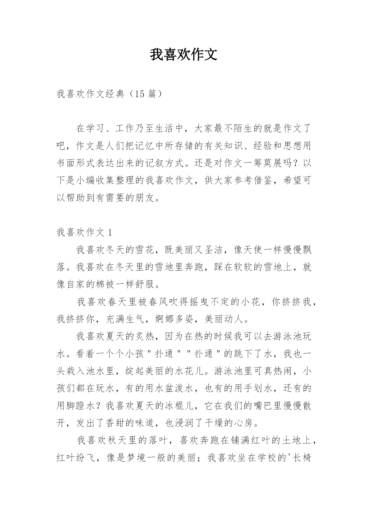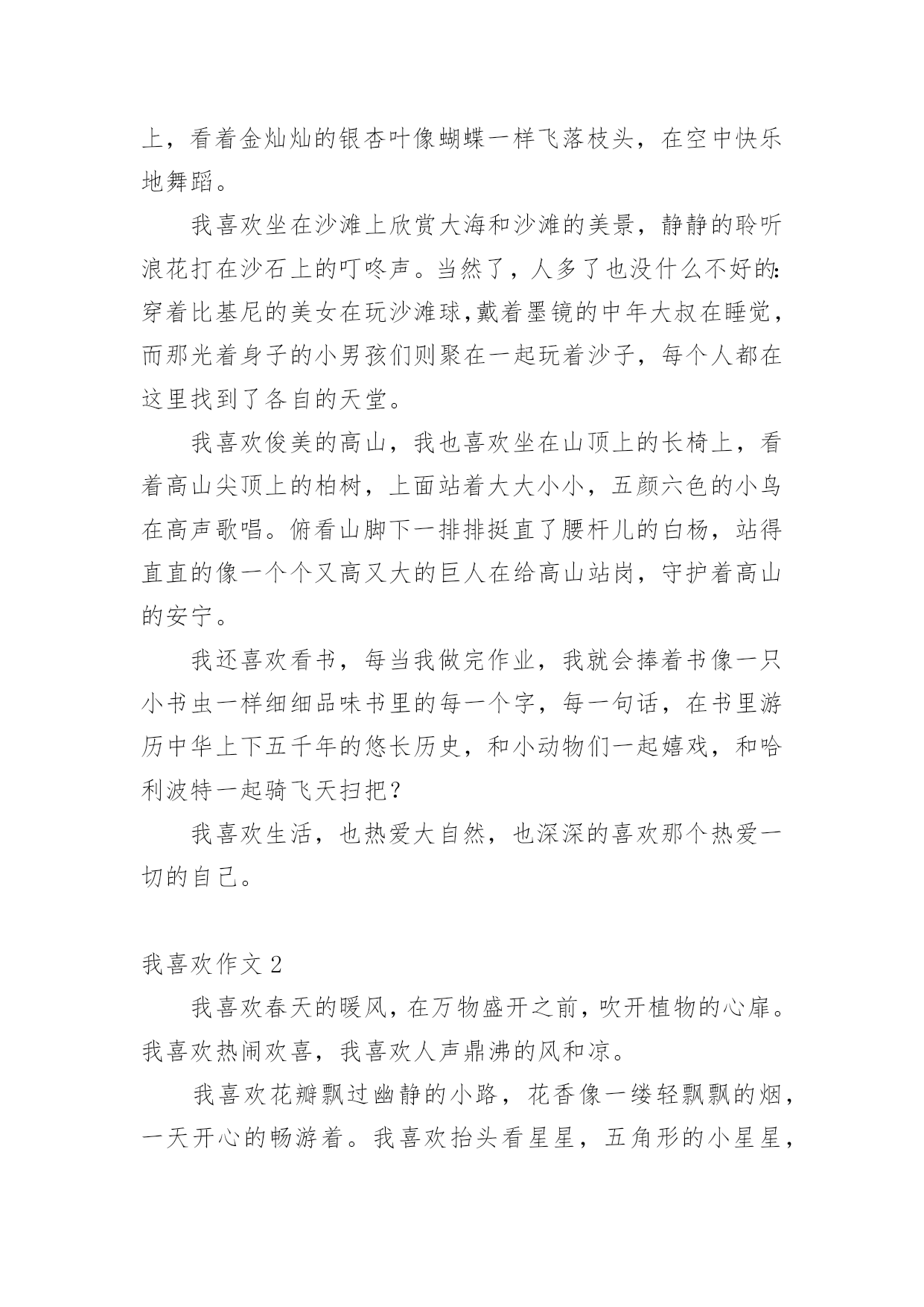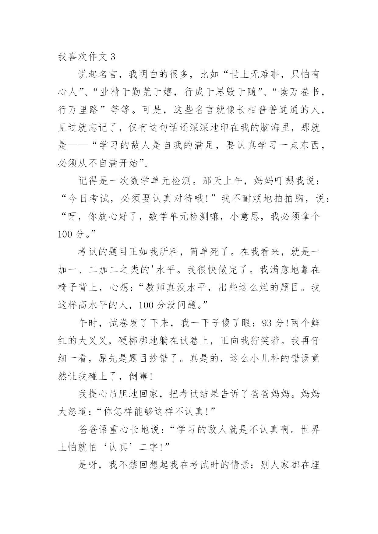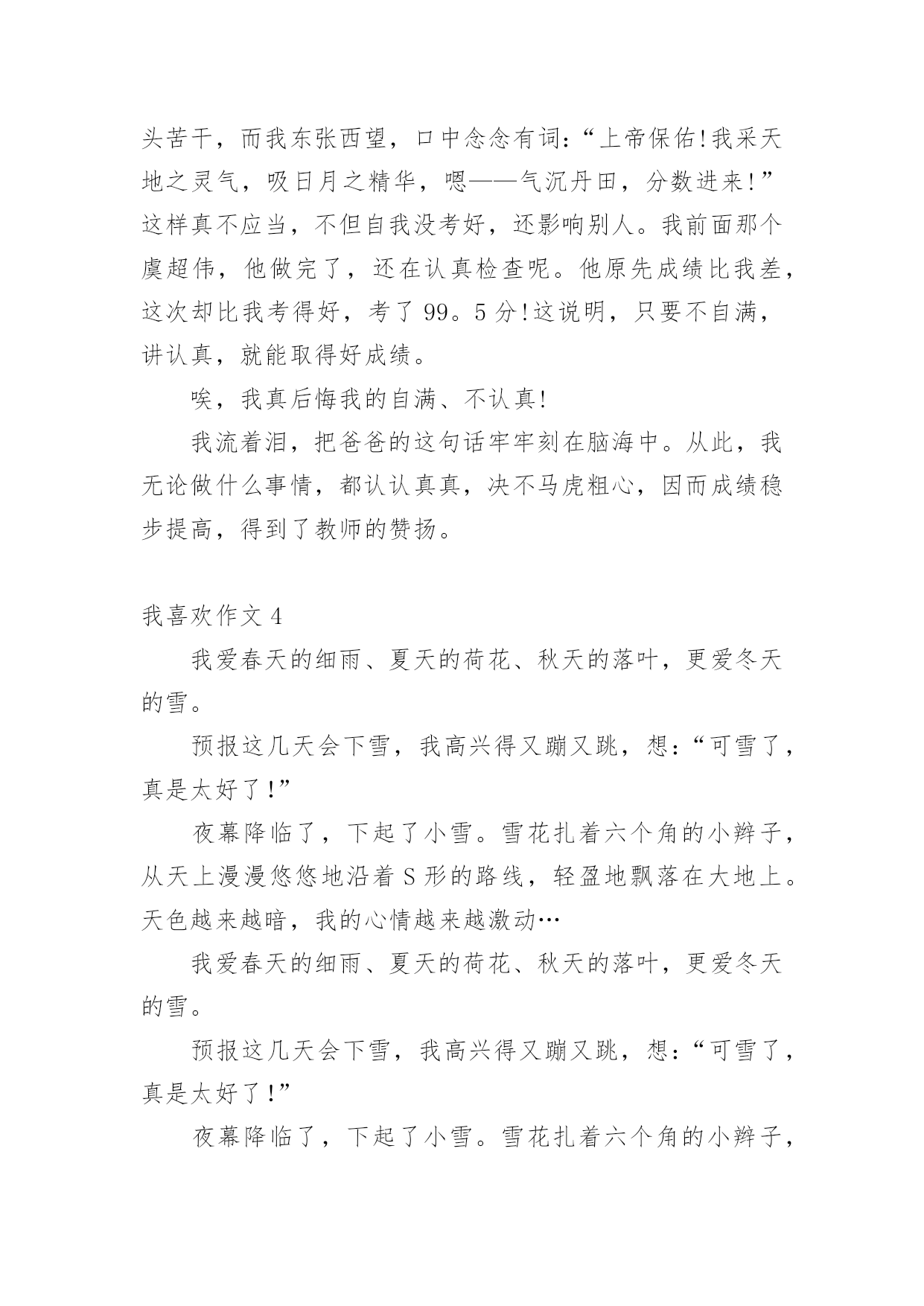 我喜欢作文 我喜欢作文经典(15篇)在学习、工作乃至生活中,大家最不陌生的就是作文了吧,作文是人们把记忆中所存储的有关知识、经验和思想用书面形式表达出来的记叙方式。还是对作文一筹莫展吗?以下是小编收集整理的我喜欢作文,供大家参考借鉴,希望可以帮助到有需要的朋友。我喜欢作文1我喜欢冬天的雪花,既美丽又圣洁,像天使一样慢慢飘落。我喜欢在冬天里的雪地里奔跑,踩在软软的雪地上,就像自家的棉被一样舒服。我喜欢春天里被春风吹得摇曳不定的小花,你挤挤我,我挤挤你,充满生气,婀娜多姿,美丽动人。我喜欢夏天的炙热,因为在热的时候我可以去游泳池玩水。看着一个个小孩"扑通""扑通"的跳下了水,我也一头栽入池水里,绽起美丽的水花儿。游泳池里可真热闹,小孩们都在玩水,有的用水盆泼水,也有的用手划水,还有的用脚蹬水?我喜欢夏天的冰棍儿,它在我们的嘴巴里慢慢散开,发出了香甜的味道,也浸润了干燥的心房。我喜欢秋天里的落叶,喜欢奔跑在铺满红叶的土地上,红叶纷飞,像是梦境一般的美丽;我喜欢坐在学校的'长椅上,看着金灿灿的银杏叶像蝴蝶一样飞落枝头,在空中快乐地舞蹈。我喜欢坐在沙滩上欣赏大海和沙滩的美景,静静的聆听浪花打在沙石上的叮咚声。当然了,人多了也没什么不好的:穿着比基尼的美女在玩沙滩球,戴着墨镜的中年大叔在睡觉,而那光着身子的小男孩们则聚在一起玩着沙子,每个人都在这里找到了各自的天堂。我喜欢俊美的高山,我也喜欢坐在山顶上的长椅上,看着高山尖顶上的柏树,上面站着大大小小,五颜六色的小鸟在高声歌唱。俯看山脚下一排排挺直了腰杆儿的白杨,站得直直的像一个个又高又大的巨人在给高山站岗,守护着高山的安宁。我还喜欢看书,每当我做完作业,我就会捧着书像一只小书虫一样细细品味书里的每一个字,每一句话,在书里游历中华上下五千年的悠长历史,和小动物们一起嬉戏,和哈利波特一起骑飞天扫把?我喜欢生活,也热爱大自然,也深深的喜欢那个热爱一切的自己。我喜欢作文2我喜欢春天的暖风,在万物盛开之前,吹开植物的心扉。我喜欢热闹欢喜,我喜欢人声鼎沸的风和凉。我喜欢花瓣飘过幽静的小路,花香像一缕轻飘飘的烟,一天开心的畅游着。我喜欢抬头看星星,五角形的小星星,明亮的金色透着一丝欢乐的笑声。我喜欢秋天的收获,我喜欢被太阳照着的小山坡。小稻田里浪此起彼伏,希望的`苗儿微笑着。渐渐地,洁白的云儿被染黑,月亮随着海浪的推进而升起。我喜欢春天的雨。在山腰上,在树叶上,白得那样火热,美丽而欢乐。我更喜欢海,喜欢海里截然不同的世界。我总能看见鱼儿欢快的游,游过珊瑚和海藻。我看见灰色的鲨鱼,上下伏动的身子在海水中横行。我看见水下山洞,完全没有光亮,远远的看着平静的海面。最令我刻骨铭心的是我看见了那一片红亮红亮的海水,是那缓缓升起的太阳照射下的在我眼中现出奇幻的水色。在梦中,在生活中,我也非常喜欢海。我喜欢读书,我喜欢读杨红樱老师的书,那几句动人的语言,使我心头出现了那感动人的火光。最令我感动的是那个严冬,我从书店买来她的书。那几句动人的语句让这的严冬萌发了温暖的火苗。我也喜欢写作文,特别是在早上。在宁静的早晨,我所有的思路和我的想象力,会都印满我的作文本,看着我的作文本,当作家的梦顷时涌上心头。美好的思路,奇妙的想象力是代表幻想,唯有写下来才能永远保存。我喜欢同学,喜欢在遇难题时一起寻找答案,特别是在阳光明媚的时候。当我们解出答案时,阳光会照在我们身上。我喜欢和平并且想永远活在和平又美好的世界。我喜欢作文3说起名言,我明白的很多,比如“世上无难事,只怕有心人”、“业精于勤荒于嬉,行成于思毁于随”、“读万卷书,行万里路”等等。可是,这些名言就像长相普普通通的人,见过就忘记了,仅有这句话还深深地印在我的脑海里,那就是——“学习的敌人是自我的满足,要认真学习一点东西,必须从不自满开始”。记得是一次数学单元检测。那天上午,妈妈叮嘱我说:“今日考试,必须要认真对待哦!”我不耐烦地拍拍胸,说:“呀,你放心好了,数学单元检测嘛,小意思,我必须拿个100分。”考试的题目正如我所料,简单死了。在我看来,就是一加一、二加二之类的'水平。我很快做完了。我满意地靠在椅子背上,心想:“教师真没水平,出些这么烂的题目。我这样高水平的人,100分没问题。”午时,试卷发了下来,我一下子傻了眼:93分!两个鲜红的大叉叉,硬梆梆地躺在试卷上,正向我狞笑着。我再仔细一看,原先是题目抄错了。真是的,这么小儿科的错误竟然让我碰上了,倒霉!我提心吊胆地回家,把考试结果告诉了爸爸妈妈。妈妈大怒道:“你怎样能够这样不认真!”爸爸语重心长地说:“学习的敌人就是不认真啊。世界上怕就怕‘认真’二字!”是呀,我不禁回想起我在考试时的情景:别人家都在埋头苦干,而我东张西望,口中念念有词:“上帝保佑!我采天地之灵气,吸日月之精华,嗯——气沉丹田,分数进来!”这样真不应当,