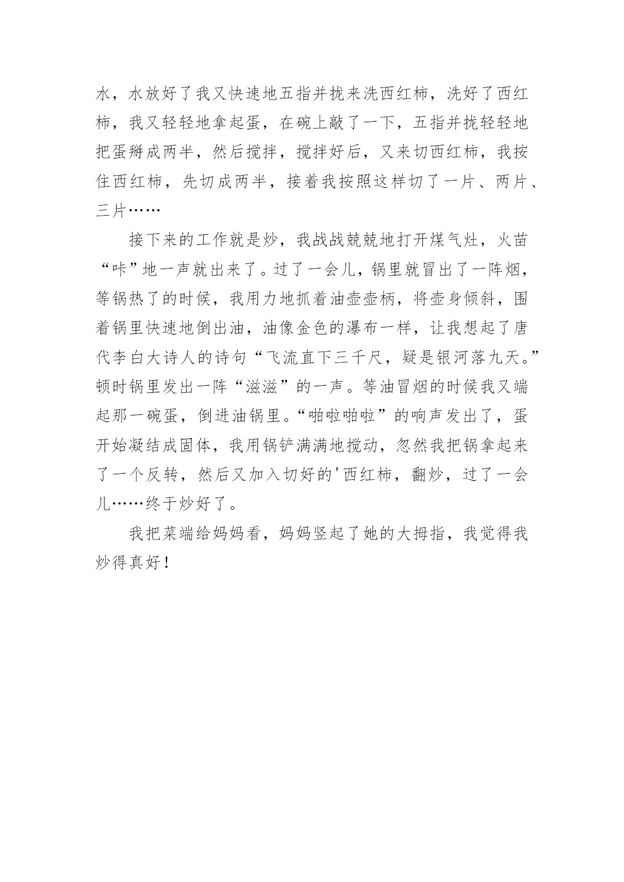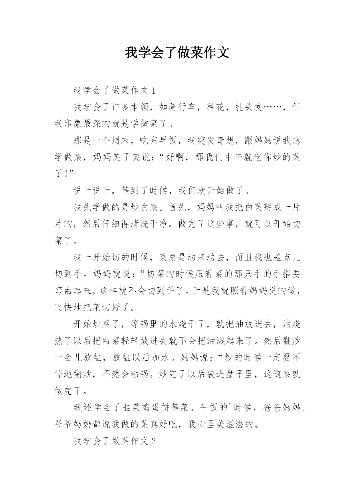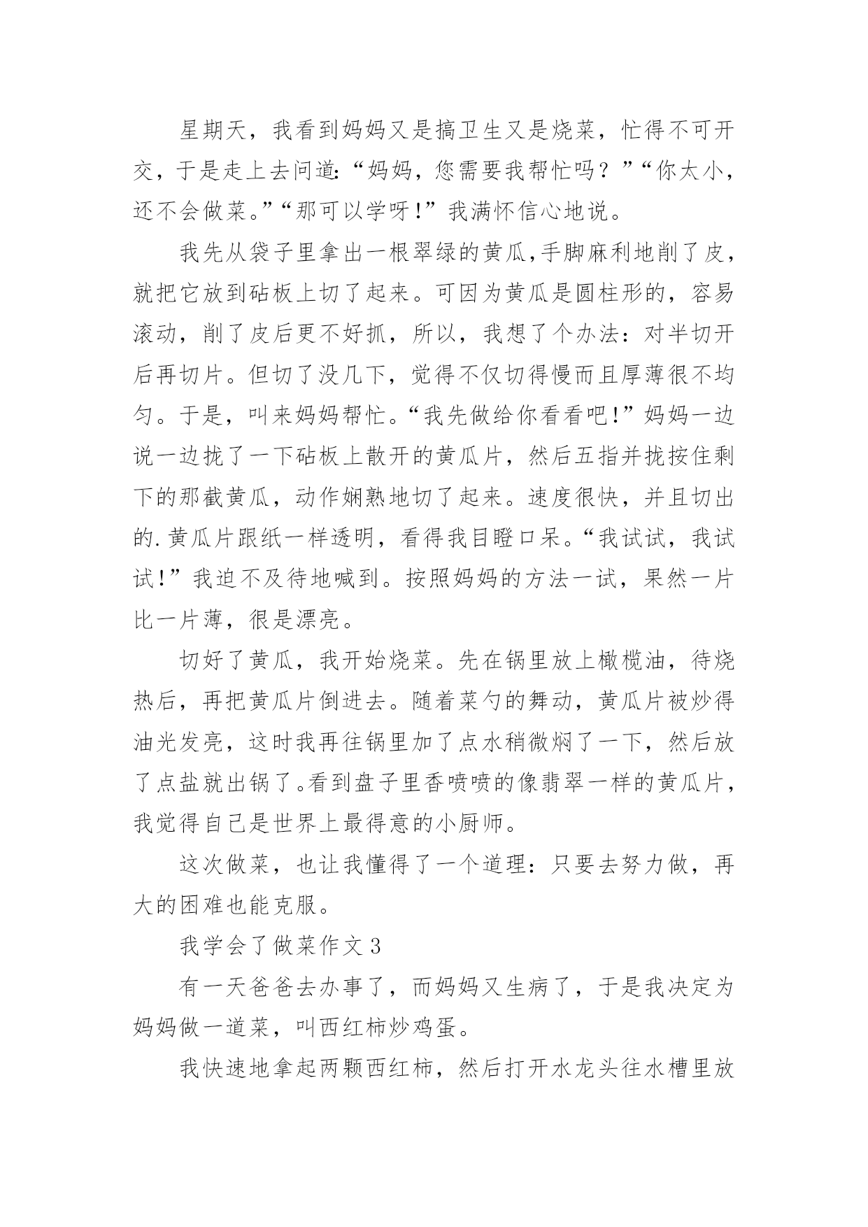 我学会了做菜作文 我学会了做菜作文1我学会了许多本领,如骑行车,种花,扎头发……,但我印象最深的就是学做菜了。那是一个周末,吃完早饭,我突发奇想,跟妈妈说我想学做菜,妈妈笑了笑说:“好啊,那我们中午就吃你炒的菜了!”说干说干,等到了时候,我们就开始做了。我先学做的是炒白菜。首先,妈妈叫我把白菜掰成一片片的,然后仔细得清洗干净。做完了这些事,就可以开始切菜了。我一开始切的时候,菜总是动来动去,而且我也差点儿切到手。妈妈就说:“切菜的时侯压着菜的那只手的手指要弯曲起来,这样就不会切到手了。于是我就照着妈妈说的做,飞快地把菜切好了。开始炒菜了,等锅里的水烧干了,就把油放进去,油烧热了以后把白菜轻轻放进去就不会把油溅起来了。然后翻炒一会儿放盐,放盐以后加水。妈妈说:“炒的时候一定要不停地翻炒,不然会粘锅。炒完了以后装进盘子里,这道菜就做完了。我还学会了韭菜鸡蛋饼等菜。午饭的`时候,爸爸妈妈、爷爷奶奶都说我做的菜真好吃,我心里美滋滋的。我学会了做菜作文2星期天,我看到妈妈又是搞卫生又是烧菜,忙得不可开交,于是走上去问道:“妈妈,您需要我帮忙吗?”“你太小,还不会做菜。”“那可以学呀!”我满怀信心地说。我先从袋子里拿出一根翠绿的黄瓜,手脚麻利地削了皮,就把它放到砧板上切了起来。可因为黄瓜是圆柱形的,容易滚动,削了皮后更不好抓,所以,我想了个办法:对半切开后再切片。但切了没几下,觉得不仅切得慢而且厚薄很不均匀。于是,叫来妈妈帮忙。“我先做给你看看吧!”妈妈一边说一边拢了一下砧板上散开的黄瓜片,然后五指并拢按住剩下的那截黄瓜,动作娴熟地切了起来。速度很快,并且切出的.黄瓜片跟纸一样透明,看得我目瞪口呆。“我试试,我试试!”我迫不及待地喊到。按照妈妈的方法一试,果然一片比一片薄,很是漂亮。切好了黄瓜,我开始烧菜。先在锅里放上橄榄油,待烧热后,再把黄瓜片倒进去。随着菜勺的舞动,黄瓜片被炒得油光发亮,这时我再往锅里加了点水稍微焖了一下,然后放了点盐就出锅了。看到盘子里香喷喷的像翡翠一样的黄瓜片,我觉得自己是世界上最得意的小厨师。这次做菜,也让我懂得了一个道理:只要去努力做,再大的困难也能克服。我学会了做菜作文3有一天爸爸去办事了,而妈妈又生病了,于是我决定为妈妈做一道菜,叫西红柿炒鸡蛋。我快速地拿起两颗西红柿,然后打开水龙头往水槽里放水,水放好了我又快速地五指并拢来洗西红柿,洗好了西红柿,我又轻轻地拿起蛋,在碗上敲了一下,五指并拢轻轻地把蛋掰成两半,然后搅拌,搅拌好后,又来切西红柿,我按住西红柿,先切成两半,接着我按照这样切了一片、两片、三片……接下来的工作就是炒,我战战兢兢地打开煤气灶,火苗“咔”地一声就出来了。过了一会儿,锅里就冒出了一阵烟,等锅热了的时候,我用力地抓着油壶壶柄,将壶身倾斜,围着锅里快速地倒出油,油像金色的瀑布一样,让我想起了唐代李白大诗人的诗句“飞流直下三千尺,疑是银河落九天。”顿时锅里发出一阵“滋滋”的一声。等油冒烟的时候我又端起那一碗蛋,倒进油锅里。“啪啦啪啦”的响声发出了,蛋开始凝结成固体,我用锅铲满满地搅动,忽然我把锅拿起来了一个反转,然后又加入切好的'西红柿,翻炒,过了一会儿……终于炒好了。我把菜端给妈妈看,妈妈竖起了她的大拇指,我觉得我炒得真好!