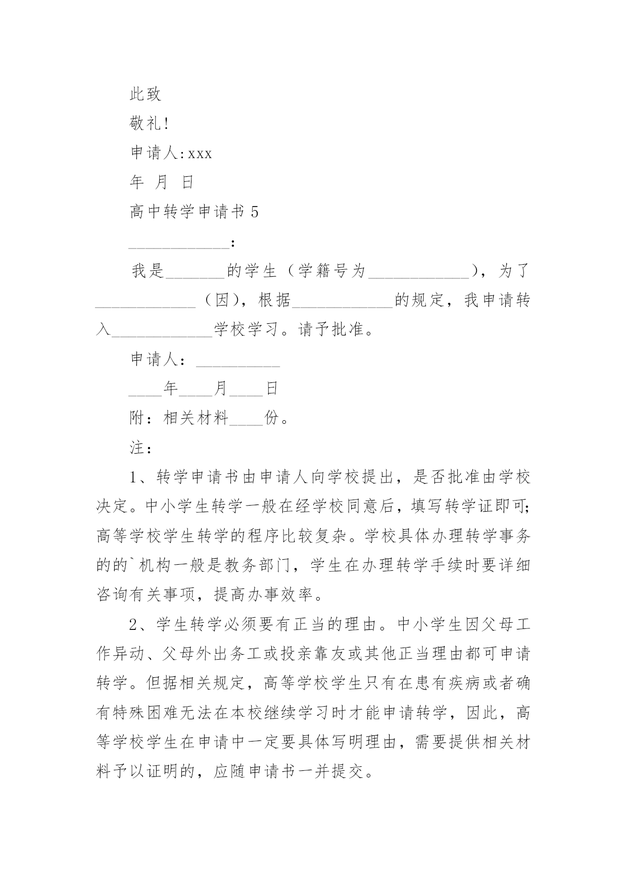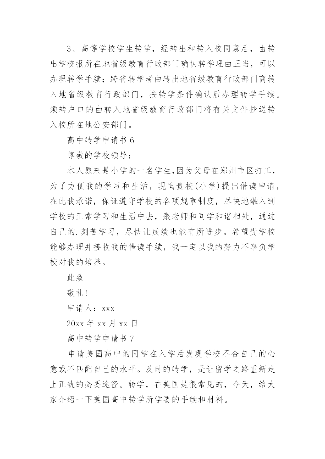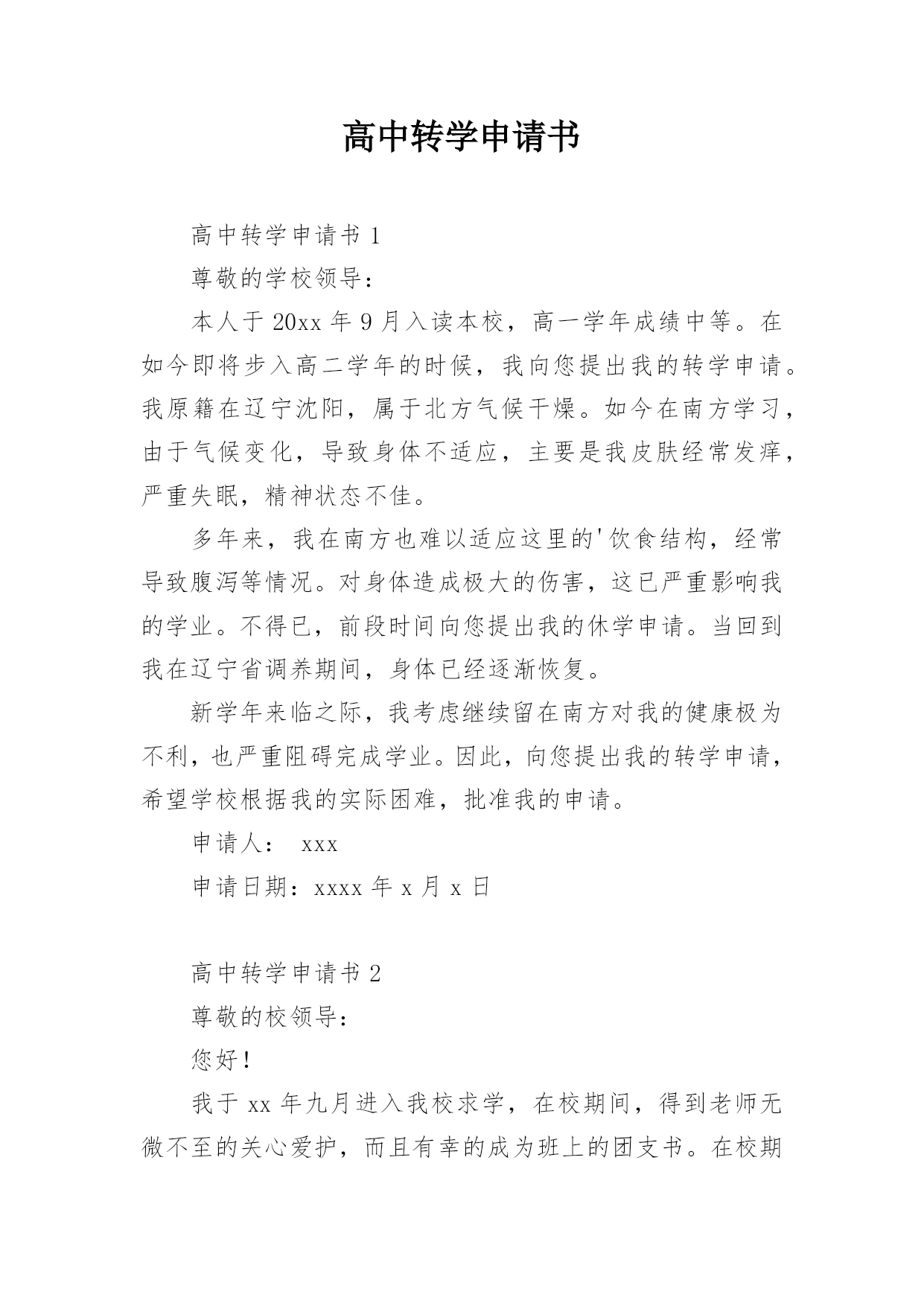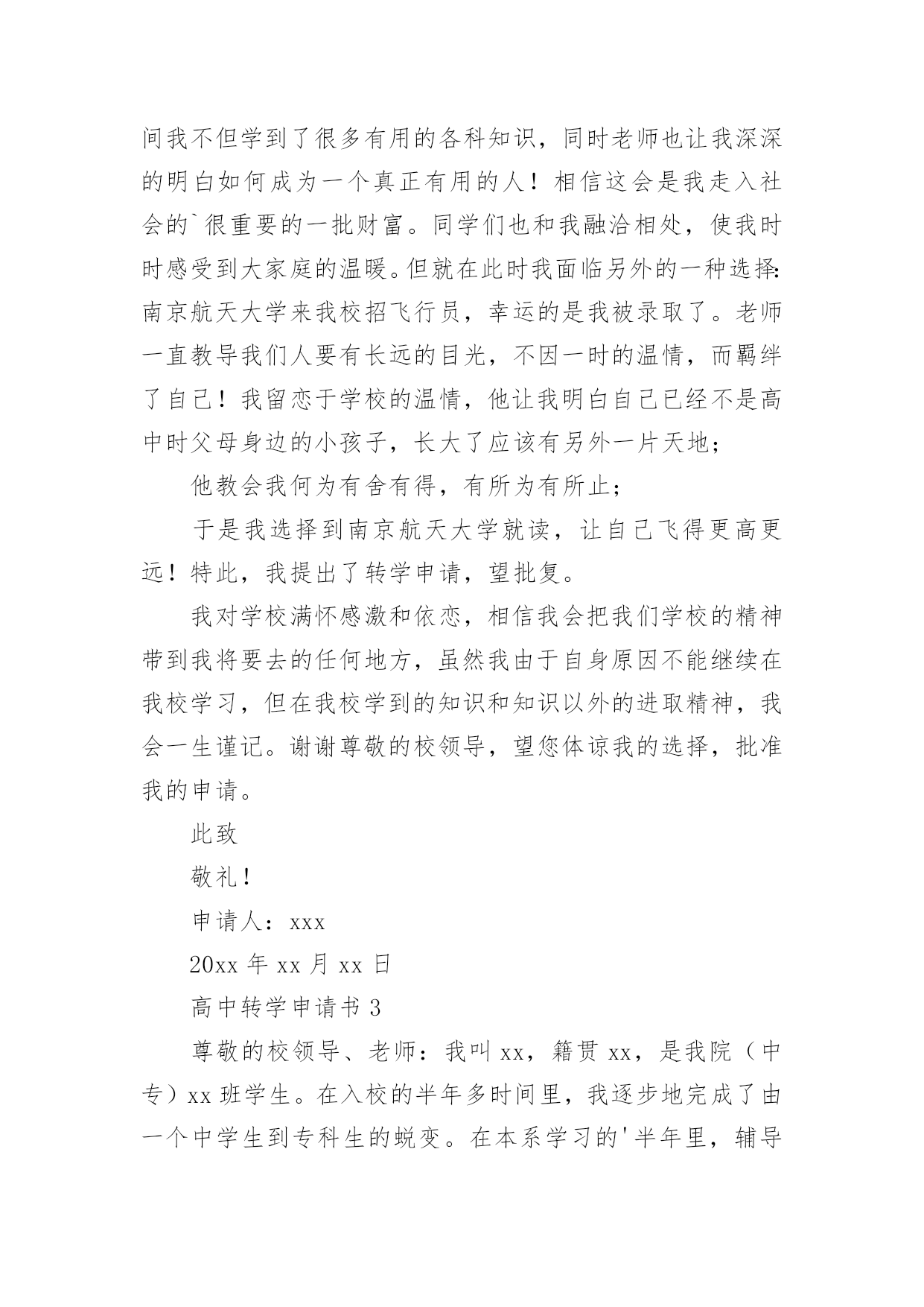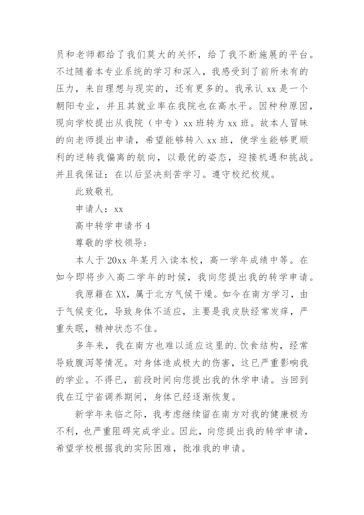 高中转学申请书 高中转学申请书1尊敬的学校领导:本人于20xx年9月入读本校,高一学年成绩中等。在如今即将步入高二学年的时候,我向您提出我的转学申请。我原籍在辽宁沈阳,属于北方气候干燥。如今在南方学习,由于气候变化,导致身体不适应,主要是我皮肤经常发痒,严重失眠,精神状态不佳。多年来,我在南方也难以适应这里的'饮食结构,经常导致腹泻等情况。对身体造成极大的伤害,这已严重影响我的学业。不得已,前段时间向您提出我的休学申请。当回到我在辽宁省调养期间,身体已经逐渐恢复。新学年来临之际,我考虑继续留在南方对我的健康极为不利,也严重阻碍完成学业。因此,向您提出我的转学申请,希望学校根据我的实际困难,批准我的申请。申请人:xxx申请日期:xxxx年x月x日高中转学申请书2尊敬的校领导:您好!我于xx年九月进入我校求学,在校期间,得到老师无微不至的关心爱护,而且有幸的成为班上的团支书。在校期间我不但学到了很多有用的各科知识,同时老师也让我深深的明白如何成为一个真正有用的人!相信这会是我走入社会的`很重要的一批财富。同学们也和我融洽相处,使我时时感受到大家庭的温暖。但就在此时我面临另外的一种选择:南京航天大学来我校招飞行员,幸运的是我被录取了。老师一直教导我们人要有长远的目光,不因一时的温情,而羁绊了自己!我留恋于学校的温情,他让我明白自己已经不是高中时父母身边的小孩子,长大了应该有另外一片天地;他教会我何为有舍有得,有所为有所止;于是我选择到南京航天大学就读,让自己飞得更高更远!特此,我提出了转学申请,望批复。我对学校满怀感激和依恋,相信我会把我们学校的精神带到我将要去的任何地方,虽然我由于自身原因不能继续在我校学习,但在我校学到的知识和知识以外的进取精神,我会一生谨记。谢谢尊敬的校领导,望您体谅我的选择,批准我的申请。此致敬礼!申请人:xxx20xx年xx月xx日高中转学申请书3尊敬的校领导、老师:我叫xx,籍贯xx,是我院(中专)xx班学生。在入校的半年多时间里,我逐步地完成了由一个中学生到专科生的蜕变。在本系学习的'半年里,辅导员和老师都给了我们莫大的关怀,给了我不断施展的平台。不过随着本专业系统的学习和深入,我感受到了前所未有的压力,来自理想与现实的,还有更多的。我承认xx是一个朝阳专业,并且其就业率在我院也在高水平。因种种原因,现向学校提出从我院(中专)xx班转为xx班。故本人冒昧的向老师提出申请,希望能够转入xx班,使学生能够更顺利的逆转我偏离的航向,以最优的姿态,迎接机遇和挑战。并且我保证:在以后坚决刻苦学习。遵守校纪校规。此致敬礼申请人:xx高中转学申请书4尊敬的学校领导:本人于20xx年某月入读本校,高一学年成绩中等。在如今即将步入高二学年的时候,我向您提出我的转学申请。我原籍在XX,属于北方气候干燥。如今在南方学习,由于气候变化,导致身体不适应,主要是我皮肤经常发痒,严重失眠,精神状态不佳。多年来,我在南方也难以适应这里的.饮食结构,经常导致腹泻等情况。对身体造成极大的伤害,这已严重影响我的学业。不得已,前段时间向您提出我的休学申请。当回到我在辽宁省调养期间,身体已经逐渐恢复。新学年来临之际,我考虑继续留在南方对我的健康极为不利,也严重阻碍完成学业。因此,向您提出我的转学申请,希望学校根据我的实际困难,批准我的申请。此致敬礼!申请人:xxx年月日高中转学申请书5____________:我是_______的学生(学籍号为____________),为了____________(因),根据____________的规定,我申请转入____________学校学习。请予批准。申请人:______________年____月____日附:相关材料____份。注:1、转学申请书由申请人向学校提出,是否批准由学校决定。中小学生转学一般在经学校同意后,填写转学证即可;高等学校学生转学的程序比较复杂。学校具体办理转学事务的的`机构一般是教务部门,学生在办理转学手续时要详细咨询有关事项,提高办事效率。2、学生转学必须要有正当的理由。中小学生因父母工作异动、父母外出务工或投亲靠友或其他正当理由都可申请转学。但据相关规定,高等学校学生只有在患有疾病或者确有特殊困难无法在本校继续学习时才能申请转学,因此,高等学校学生在申请中一定要具体写明理由,需要提供相关材料予以证明的,应随申请书一并提交。3、高等学校学生转学,经转出和转入校同意后,由转出学校报所在地省级教育行政部门确认转学理由正当,可以办理转学手续;跨省转学者由转出地省级教育行政部门商转入地省级教育行政部门,按转学条件确认后办理转学手续。须转户口的由转入地省级教育行政部门将有关文件抄送转入校所在地公安部门。高中转学申请书6尊敬的学校领导:本人原来是小学的一名学生,因为父母在郑州市区打工,