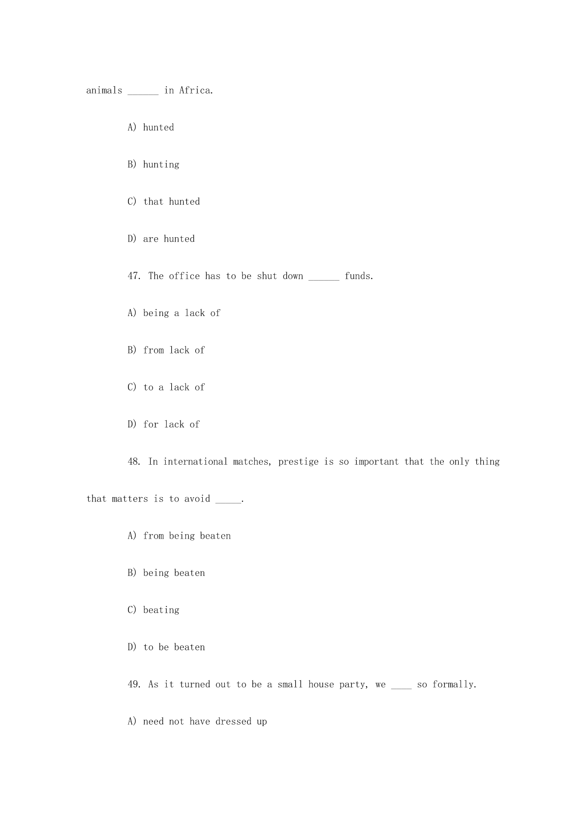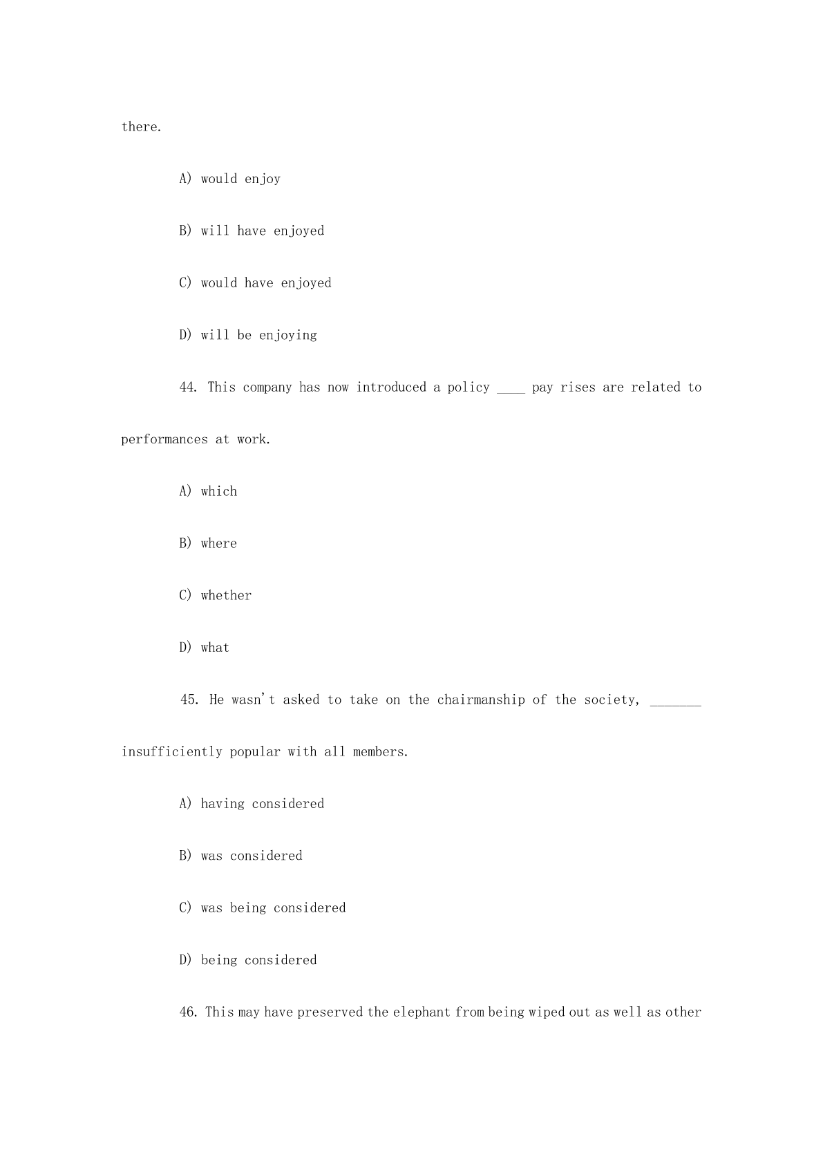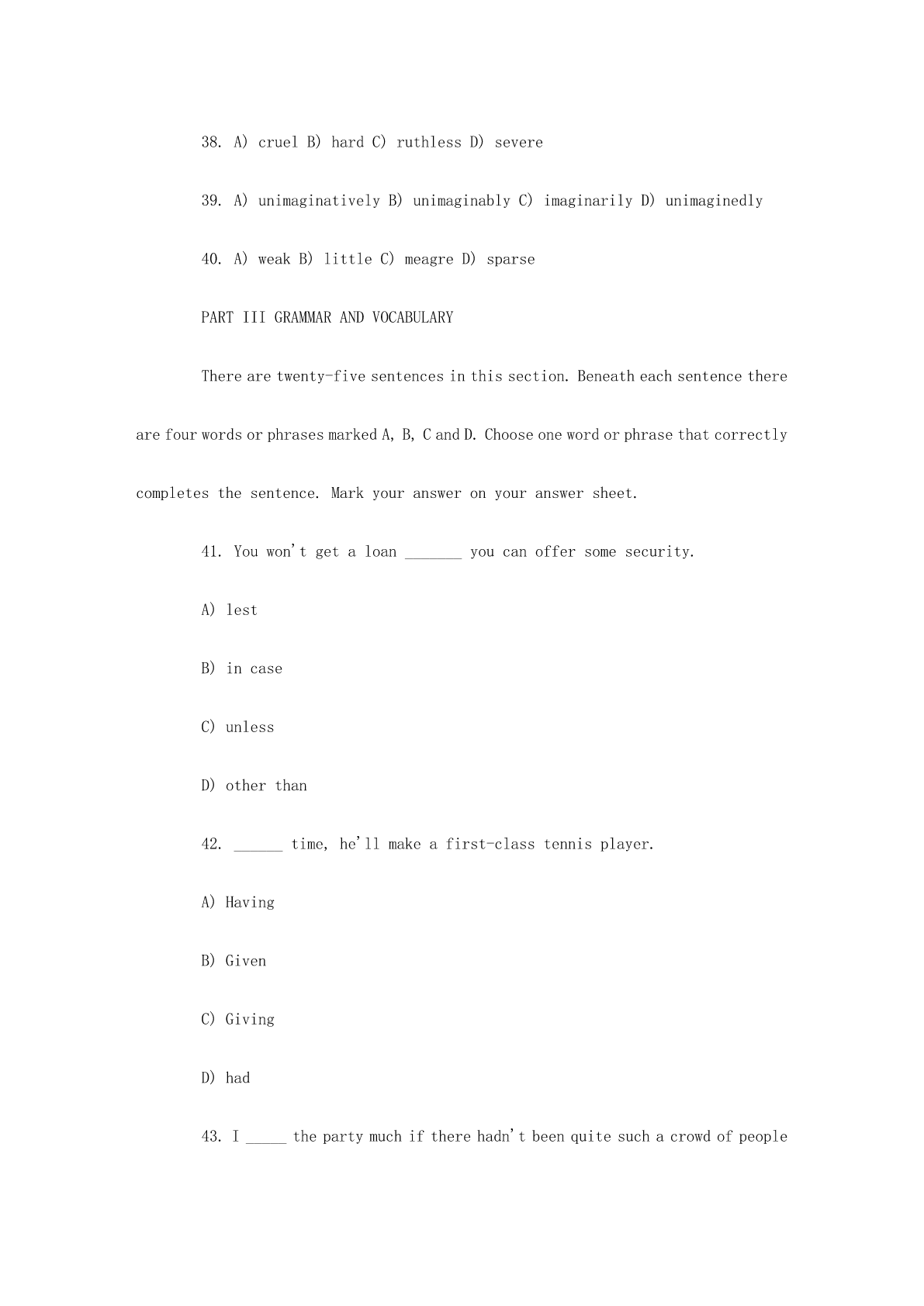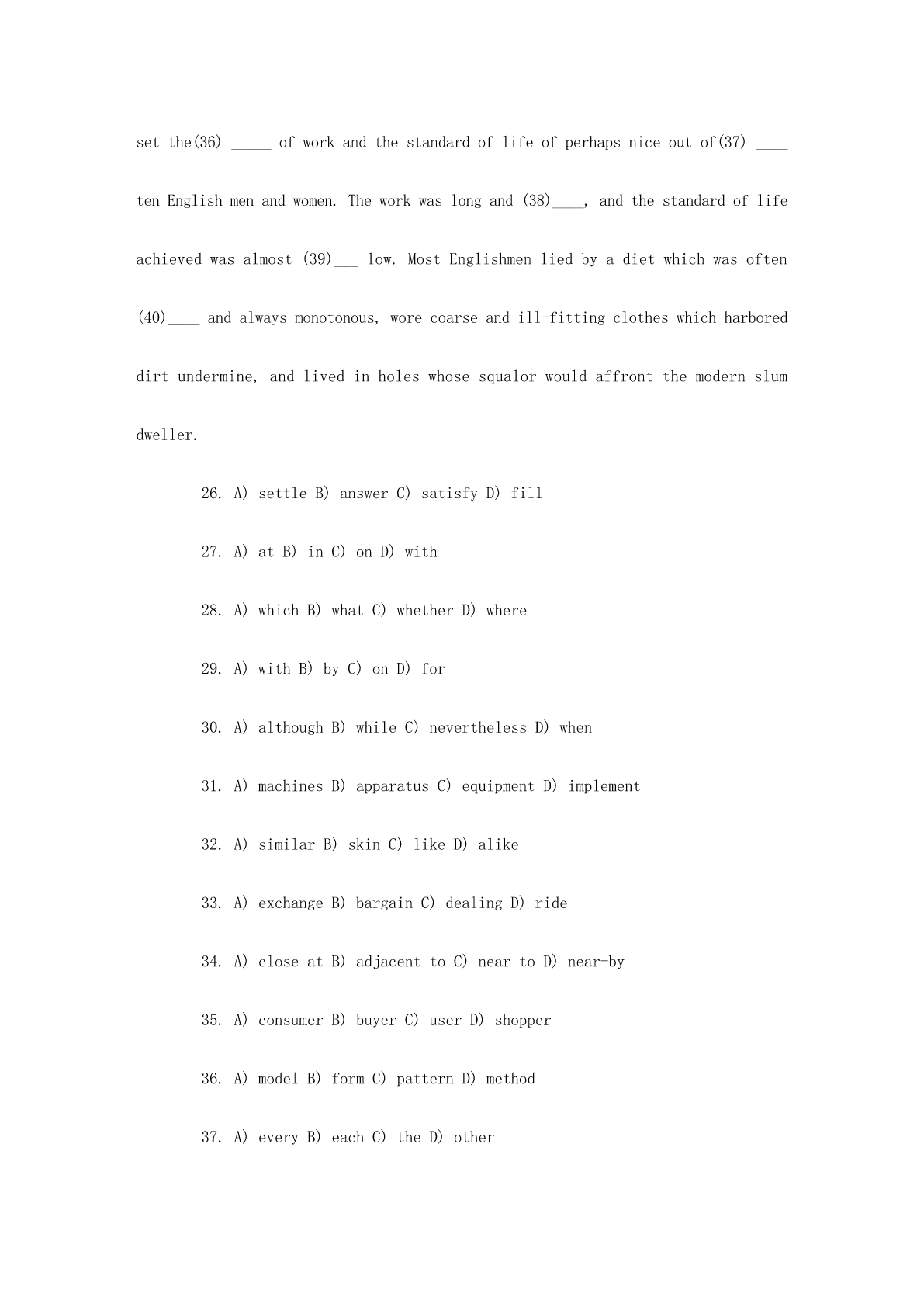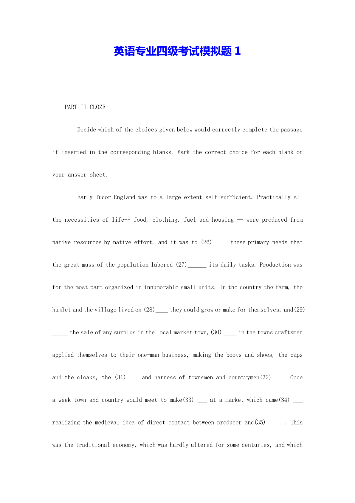 英语专业四级考试模拟题1 PARTIICLOZE Decidewhichofthechoicesgivenbelowwouldcorrectlycompletethepassage ifinsertedinthecorrespondingblanks.Markthecorrectchoiceforeachblankon youranswersheet. EarlyTudorEnglandwastoalargeextentself-sufficient.Practicallyall thenecessitiesoflife--food,clothing,fuelandhousing--wereproducedfrom nativeresourcesbynativeeffort,anditwasto(26)_____theseprimaryneedsthat thegreatmassofthepopulationlabored(27)______itsdailytasks.Productionwas forthemostpartorganizedininnumerablesmallunits.Inthecountrythefarm,the hamletandthevillagelivedon(28)____theycouldgrowormakeforthemselves,and(29) _____thesaleofanysurplusinthelocalmarkettown,(30)____inthetownscraftsmen appliedthemselvestotheirone-manbusiness,makingthebootsandshoes,thecaps andthecloaks,the(31)____andharnessoftownsmenandcountrymen(32)____.Once aweektownandcountrywouldmeettomake(33)___atamarketwhichcame(34)___ realizingthemedievalideaofdirectcontactbetweenproducerand(35)_____.This wasthetraditionaleconomy,whichwashardlyalteredforsomecenturies,andwhich setthe(36)_____ofworkandthestandardoflifeofperhapsniceoutof(37)____ tenEnglishmenandwomen.Theworkwaslongand(38)____,andthestandardoflife achievedwasalmost(39)___low.MostEnglishmenliedbyadietwhichwasoften (40)____andalwaysmonotonous,worecoarseandill-fittingclotheswhichharbored dirtundermine,andlivedinholeswhosesqualorwouldaffrontthemodernslum dweller. 26.A)settleB)answerC)satisfyD)fill 27.A)atB)inC)onD)with 28.A)whichB)whatC)whetherD)where 29.A)withB)byC)onD)for 30.A)althoughB)whileC)neverthelessD)when 31.A)machinesB)apparatusC)equipmentD)implement 32.A)similarB)skinC)likeD)alike 33.A)exchangeB)bargainC)dealingD)ride 34.A)closeatB)adjacenttoC)neartoD)near-by 35.A)consumerB)buyerC)userD)shopper 36.A)modelB)formC)patternD)method 37.A)everyB)eachC)theD)other 38.A)cruelB)hardC)ruthlessD)severe 39.A)unimaginativelyB)unimaginablyC)imaginarilyD)unimaginedly 40.A)weakB)littleC)meagreD)sparse PARTIIIGRAMMARANDVOCABULARY Therear