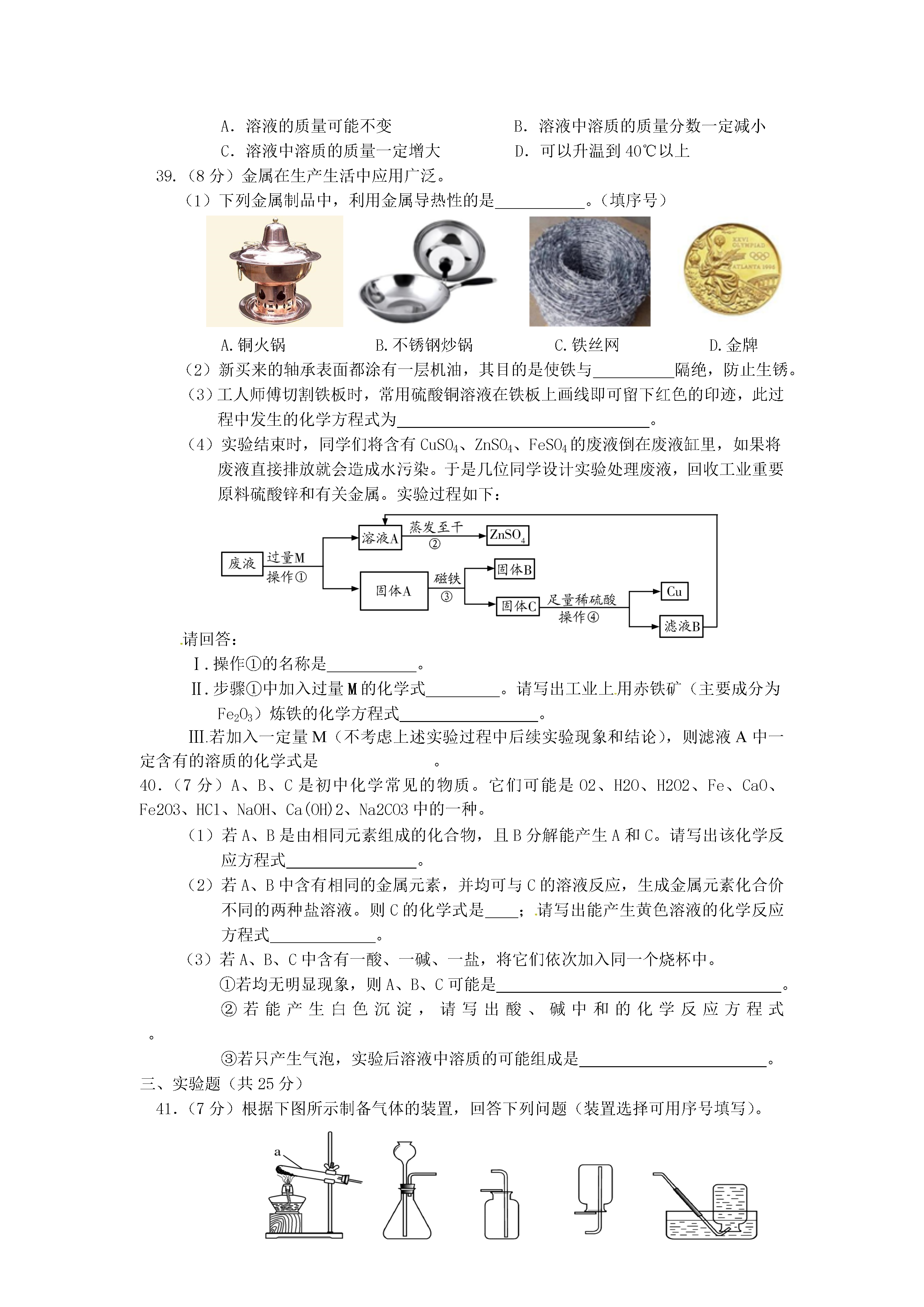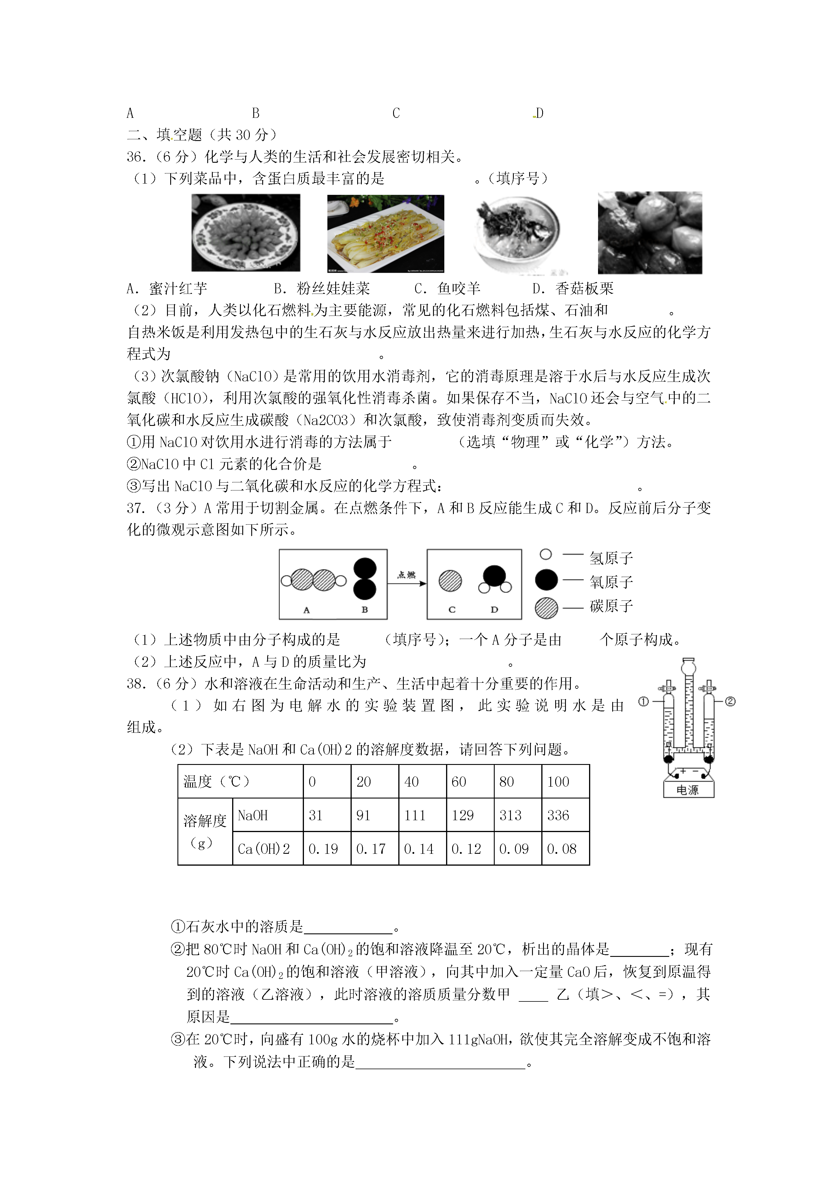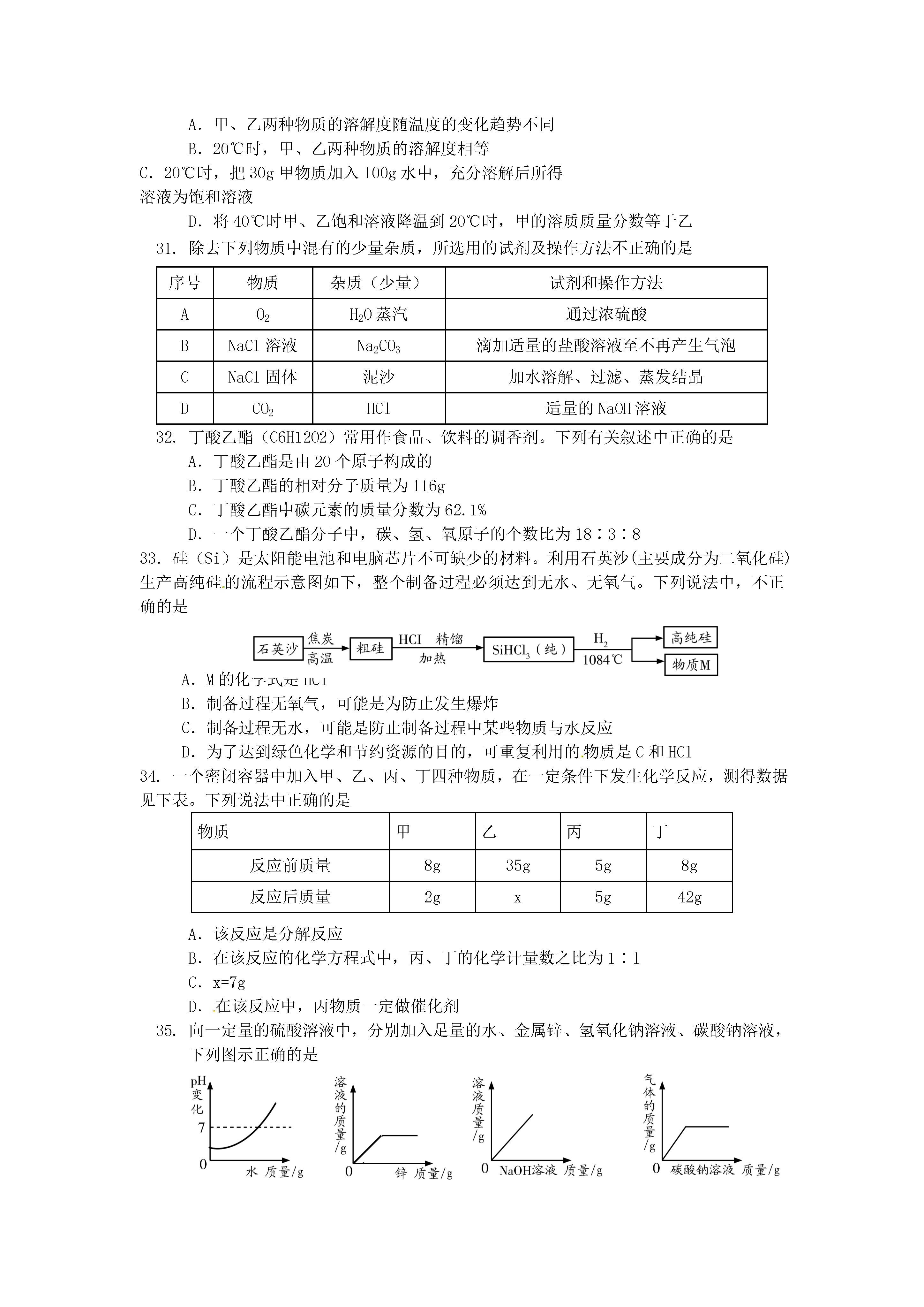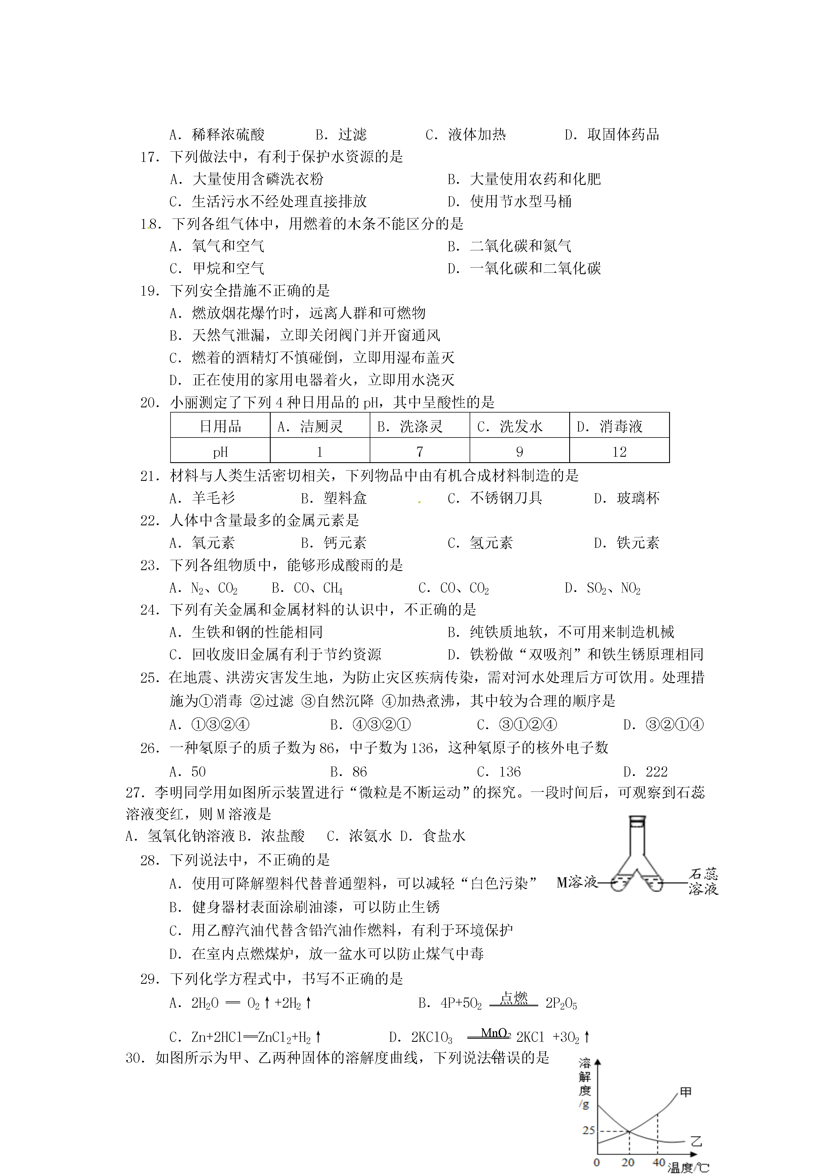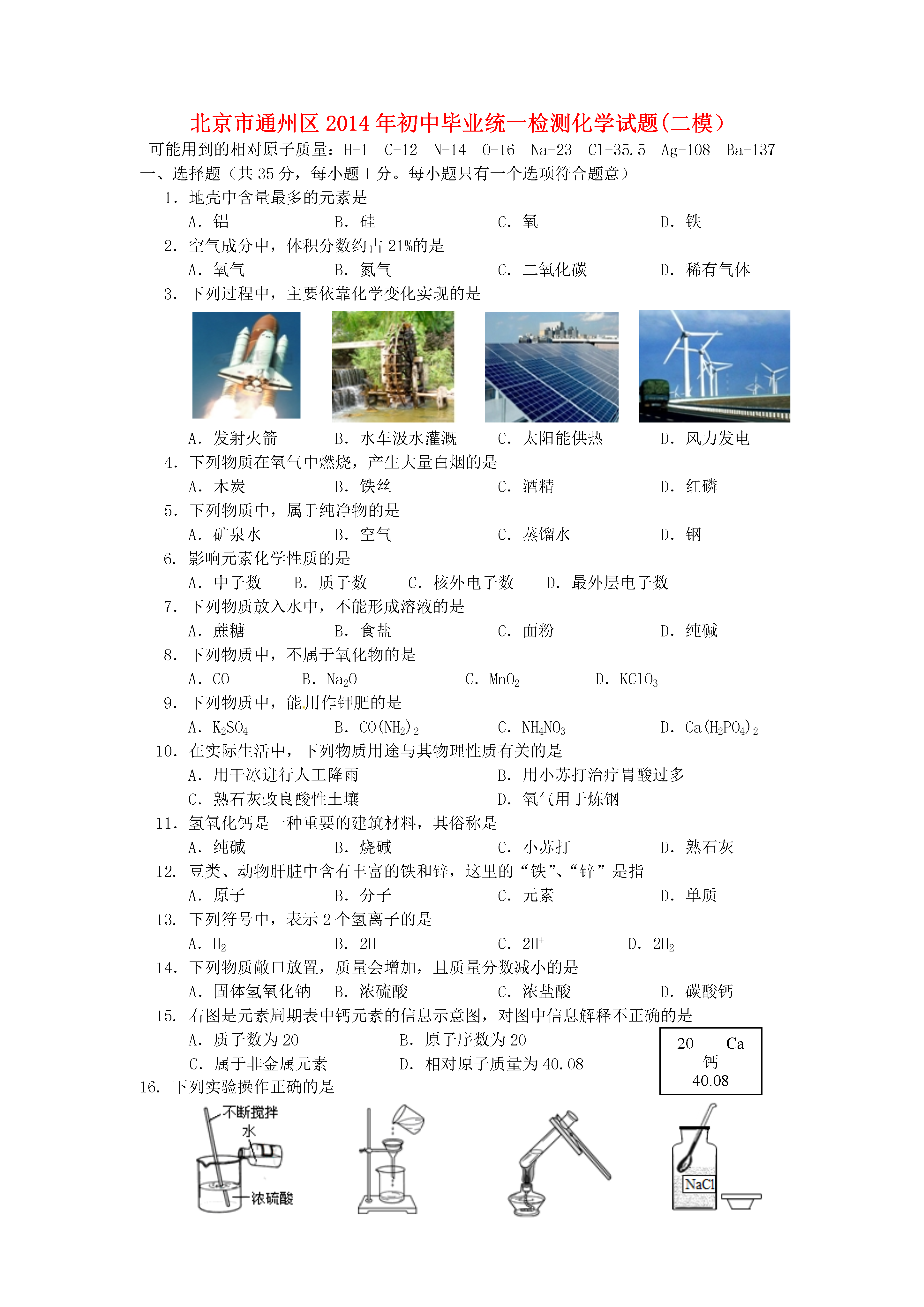 北京市通州区2014年初中毕业统一检测化学试题(二模)可能用到的相对原子质量:H-1C-12N-14O-16Na-23Cl-35.5Ag-108Ba-137一、选择题(共35分,每小题1分。每小题只有一个选项符合题意)1.地壳中含量最多的元素是A.铝B.硅C.氧D.铁2.空气成分中,体积分数约占21%的是A.氧气B.氮气C.二氧化碳D.稀有气体3.下列过程中,主要依靠化学变化实现的是A.发射火箭B.水车汲水灌溉C.太阳能供热D.风力发电4.下列物质在氧气中燃烧,产生大量白烟的是A.木炭B.铁丝C.酒精D.红磷5.下列物质中,属于纯净物的是A.矿泉水B.空气C.蒸馏水D.钢6.影响元素化学性质的是A.中子数B.质子数C.核外电子数D.最外层电子数7.下列物质放入水中,不能形成溶液的是A.蔗糖B.食盐C.面粉D.纯碱8.下列物质中,不属于氧化物的是A.COB.Na2OC.MnO2D.KClO39.下列物质中,能用作钾肥的是A.K2SO4B.CO(NH2)2C.NH4NO3D.Ca(H2PO4)210.在实际生活中,下列物质用途与其物理性质有关的是A.用干冰进行人工降雨B.用小苏打治疗胃酸过多C.熟石灰改良酸性土壤D.氧气用于炼钢11.氢氧化钙是一种重要的建筑材料,其俗称是A.纯碱B.烧碱C.小苏打D.熟石灰12.豆类、动物肝脏中含有丰富的铁和锌,这里的“铁”、“锌”是指A.原子B.分子C.元素D.单质13.下列符号中,表示2个氢离子的是A.H2B.2HC.2H+D.2H214.下列物质敞口放置,质量会增加,且质量分数减小的是A.固体氢氧化钠B.浓硫酸C.浓盐酸D.碳酸钙15.右图是元素周期表中钙元素的信息示意图,对图中信息解释不正确的是20Ca钙40.08A.质子数为20B.原子序数为20C.属于非金属元素D.相对原子质量为40.0816.下列实验操作正确的是A.稀释浓硫酸B.过滤C.液体加热D.取固体药品17.下列做法中,有利于保护水资源的是A.大量使用含磷洗衣粉B.大量使用农药和化肥C.生活污水不经处理直接排放D.使用节水型马桶18.下列各组气体中,用燃着的木条不能区分的是A.氧气和空气B.二氧化碳和氮气C.甲烷和空气D.一氧化碳和二氧化碳19.下列安全措施不正确的是A.燃放烟花爆竹时,远离人群和可燃物B.天然气泄漏,立即关闭阀门并开窗通风C.燃着的酒精灯不慎碰倒,立即用湿布盖灭D.正在使用的家用电器着火,立即用水浇灭20.小丽测定了下列4种日用品的pH,其中呈酸性的是日用品A.洁厕灵B.洗涤灵C.洗发水D.消毒液pH1791221.材料与人类生活密切相关,下列物品中由有机合成材料制造的是A.羊毛衫B.塑料盒C.不锈钢刀具D.玻璃杯22.人体中含量最多的金属元素是A.氧元素B.钙元素C.氢元素D.铁元素23.下列各组物质中,能够形成酸雨的是A.N2、CO2B.CO、CH4C.CO、CO2D.SO2、NO224.下列有关金属和金属材料的认识中,不正确的是A.生铁和钢的性能相同B.纯铁质地软,不可用来制造机械C.回收废旧金属有利于节约资源D.铁粉做“双吸剂”和铁生锈原理相同25.在地震、洪涝灾害发生地,为防止灾区疾病传染,需对河水处理后方可饮用。处理措施为①消毒②过滤③自然沉降④加热煮沸,其中较为合理的顺序是A.①③②④B.④③②①C.③①②④D.③②①④26.一种氡原子的质子数为86,中子数为136,这种氡原子的核外电子数A.50B.86C.136D.22227.李明同学用如图所示装置进行“微粒是不断运动”的探究。一段时间后,可观察到石蕊溶液变红,则M溶液是A.氢氧化钠溶液B.浓盐酸C.浓氨水D.食盐水28.下列说法中,不正确的是A.使用可降解塑料代替普通塑料,可以减轻“白色污染”B.健身器材表面涂刷油漆,可以防止生锈C.用乙醇汽油代替含铅汽油作燃料,有利于环境保护D.在室内点燃煤炉,放一盆水可以防止煤气中毒29.下列化学方程式中,书写不正确的是A.2H2O═O2↑+2H2↑B.4P+5O2点燃2P2O5MnO2△C.Zn+2HCl═ZnCl2+H2↑D.2KClO32KCl+3O2↑30.如图所示为甲、乙两种固体的溶解度曲线,下列说法错误的是A.甲、乙两种物质的溶解度随温度的变化趋势不同B.20℃时,甲、乙两种物质的溶解度相等C.20℃时,把30g甲物质加入100g水中,充分溶解后所得溶液为饱和溶液D.将40℃时甲、乙饱和溶液降温到20℃时,甲的溶质质量分数等于乙31.除去下列物质中混有的少量杂质,所选用的试剂及操作方法不正确的是