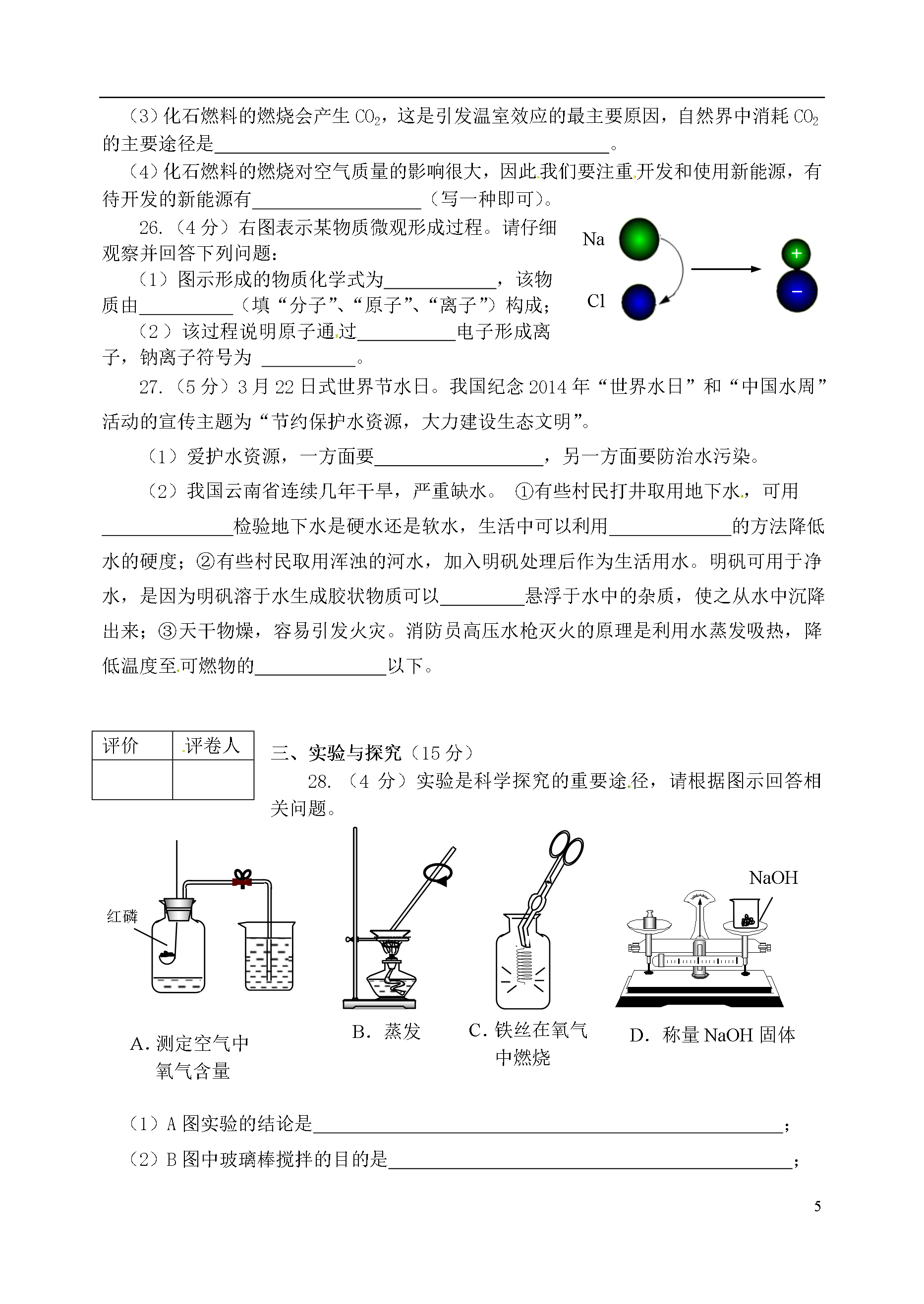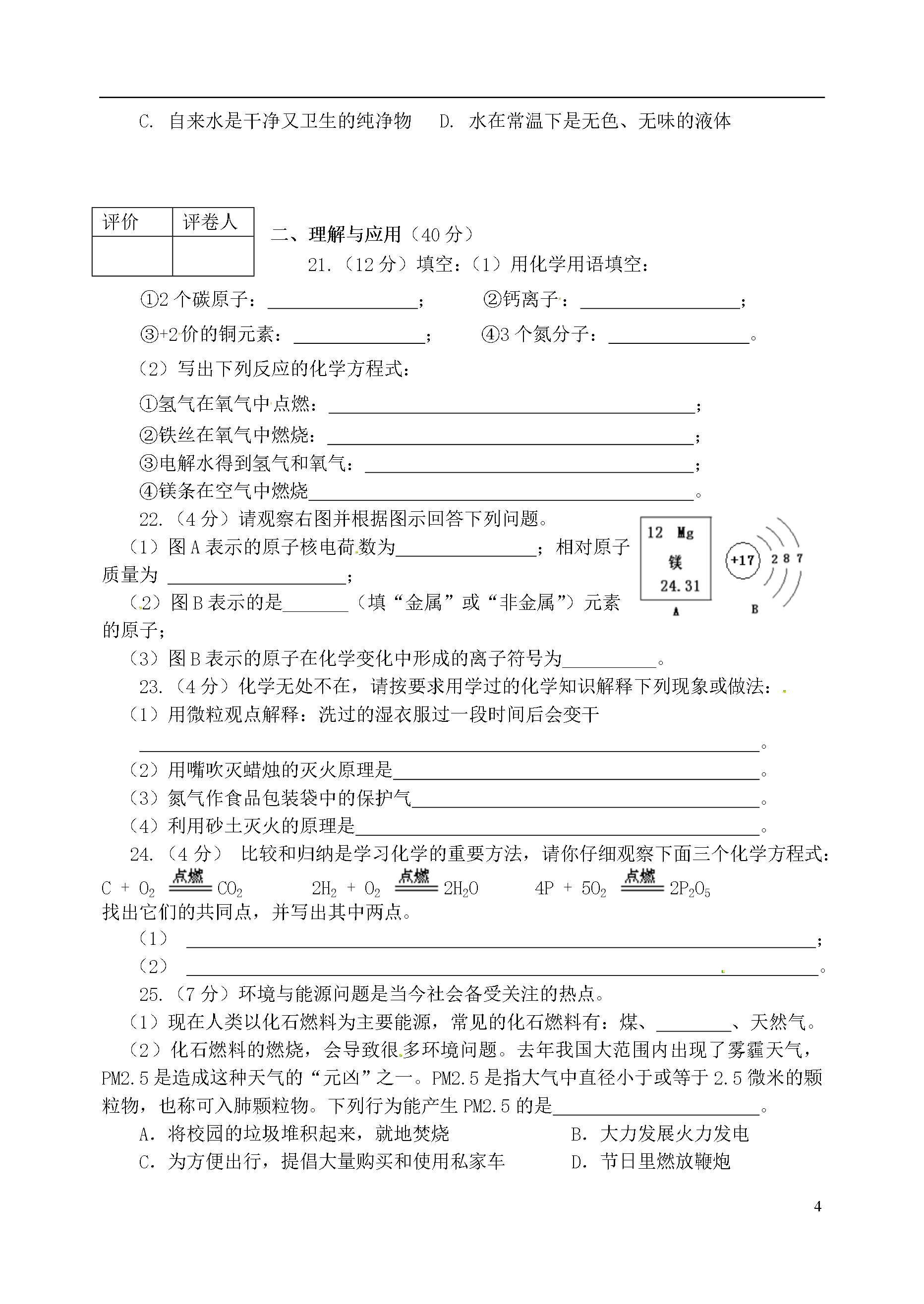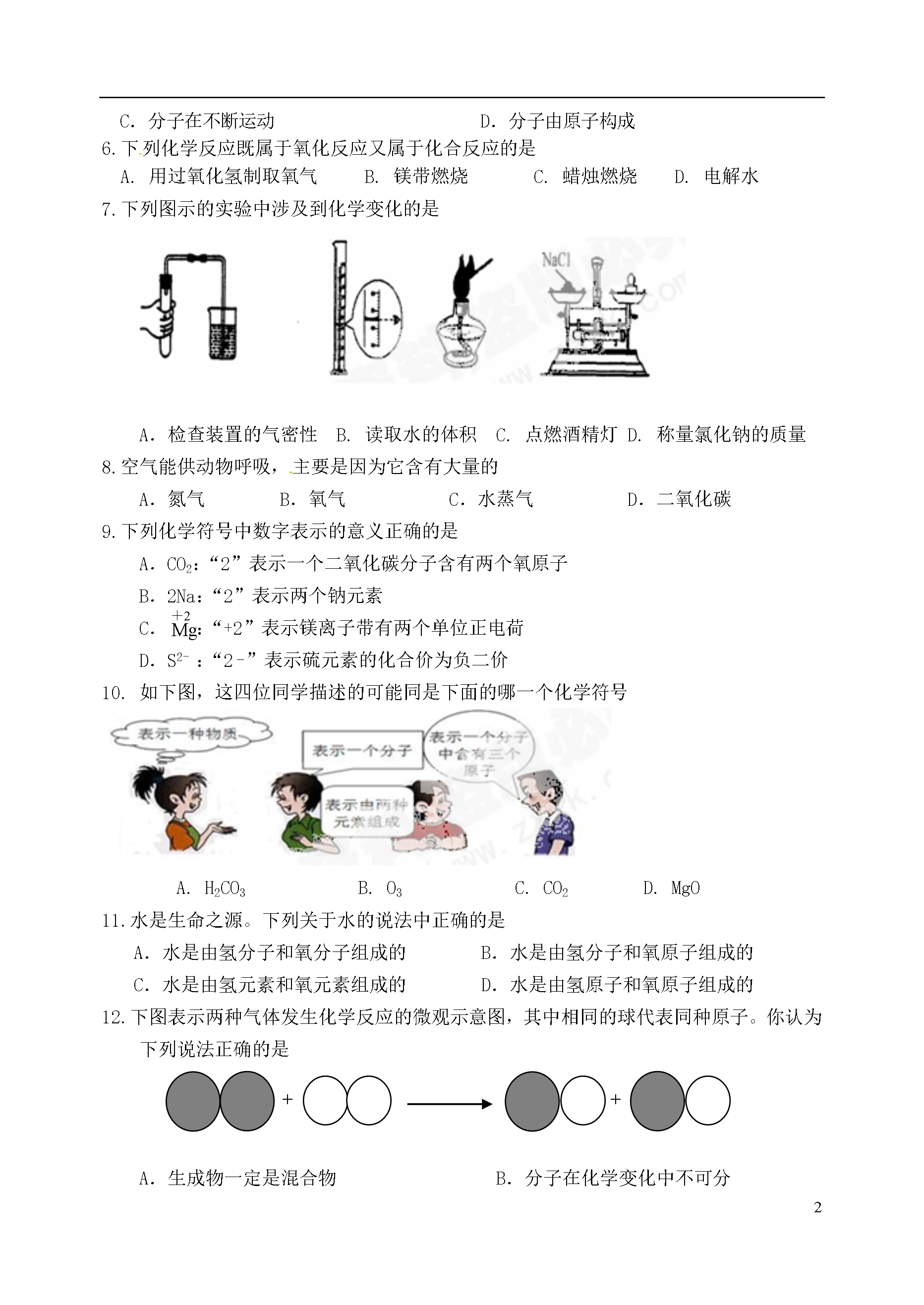 8山东省淄博市淄博区金山中学2013-2014学年八年级(五四学制)下学期期中质量检测化学试题可能用到的相对原子质量:C:12H:1O:16S:32N:14Na:23Ca:40Cl:35.5评价评卷人一、选择题(本题包括20个小题,每小题2分,共40分。每题只有一个选项符合题意。请将各小题的正确答案填到下方的答题框中)题号12345678910答案题号11121314151617181920答案1.身边处处有科学,科学与我们的生产、生活密切相关。请根据你的生活经验和所学的科学知识判断,下列做法合理的是A.油锅着火,立即用水扑灭B.在冰箱里放入活性炭,除去冰箱里的异味C.室内烤火取暖放一盆水,防止CO中毒D.在食品袋里充入氧气,延长食品的保质期2.下列属于化学变化的是A.蔗糖溶解B.滴水成冰C.花香四溢D.铁器生锈3.下列属于纯净物的是A.液态氧B.加碘盐C.酸牛奶D.不锈钢4.下列微粒结构示意图中,表示阳离子的是5.争创全国卫生城市,明文规定市民不得在公共室内场合吸烟。不吸烟的人能闻到烟味的原因是A.分子很小B.分子之间有间隙C.分子在不断运动D.分子由原子构成6.下列化学反应既属于氧化反应又属于化合反应的是A.用过氧化氢制取氧气B.镁带燃烧C.蜡烛燃烧D.电解水7.下列图示的实验中涉及到化学变化的是A.检查装置的气密性B.读取水的体积C.点燃酒精灯D.称量氯化钠的质量8.空气能供动物呼吸,主要是因为它含有大量的A.氮气B.氧气C.水蒸气D.二氧化碳9.下列化学符号中数字表示的意义正确的是A.CO2:“2”表示一个二氧化碳分子含有两个氧原子Mg+2B.2Na:“2”表示两个钠元素C.:“+2”表示镁离子带有两个单位正电荷D.S2-:“2–”表示硫元素的化合价为负二价10.如下图,这四位同学描述的可能同是下面的哪一个化学符号A.H2CO3B.O3C.CO2D.MgO11.水是生命之源。下列关于水的说法中正确的是A.水是由氢分子和氧分子组成的B.水是由氢分子和氧原子组成的C.水是由氢元素和氧元素组成的D.水是由氢原子和氧原子组成的12.下图表示两种气体发生化学反应的微观示意图,其中相同的球代表同种原子。你认为下列说法正确的是++A.生成物一定是混合物B.分子在化学变化中不可分C.该反应属于化合反应D.化学反应前后元素的种类发生了变化13.下列反应属于化合反应的是A.2HgO△2Hg+O2↑B.H2+CuO△Cu+H2OC.C2H5OH+3O2点燃2CO2+3H2OD.C+O2点燃CO214.下列关于氧气用途的叙述不正确的是A.医疗急救B.潜水C.灯泡中充氧气以延长使用寿命D.动植物呼吸15.某纯净物X在空气中与氧气反应,反应的化学方程式为:X+3O22CO2+2H2O推测X的化学式A.CH4B.C2H4C.C3H6D.C2H616.下列化学方程式书写正确的是A.S+O2点燃SO2B.CuSO4+NaOHCu(OH)2+Na2SO4C.C+O2点燃COD.NaOH+CO2NaCO3+H2O17.2013年6月11日,“神州十号”成功发射。运载“神州十号”飞船的火箭使用偏二甲肼(C2H8N2)作燃料,下列说法正确的是A.偏二甲肼由碳、氢、氮三种元素组成B.偏二甲肼的相对分子质量为58C.偏二甲肼中碳、氢、氮元素质量比2:8:2D.偏二甲肼中碳元素的质量分数为50%18.某运动型饮料的成分含量如右图所示,其中的钾、钙、钠指的是A.单质B.原子C.元素D.分子19.在一密闭容器中,有甲、乙、丙、丁四种物质,一定条件下充分反应,测得反应前后各物质的质量如下表:物质甲乙丙丁反应前的质量/g30552070反应后的质量/g0100X5根据质量守恒定律判断,X的值为A.50B.70C.40D.1520.下列说法正确的是A.空气是无色透明的纯净物B.空气取之不尽,用之不竭,成分永远不变C.自来水是干净又卫生的纯净物D.水在常温下是无色、无味的液体评价评卷人二、理解与应用(40分)21.(12分)填空:(1)用化学用语填空:①2个碳原子:;②钙离子:;③+2价的铜元素:;④3个氮分子:。(2)写出下列反应的化学方程式:①氢气在氧气中点燃:;②铁丝在氧气中燃烧:;③电解水得到氢气和氧气:;④镁条在空气中燃烧。22.(4分)请观察右图并根据图示回答下列问题。(1)图A表示的原子核电荷数为;相对原子质量为;(2)图B表示的是_______(填“金属”或“非金属”)元素的原子;(3)图B表示的原子在化学变化中形成的离子符号为__________。23.(4分)化学无处不在,请按要求用学过的化学知识解释下列现象或做法:(1)用微粒观点解释:洗过的湿衣服过一段时间后会变干。(2)用嘴吹灭蜡烛的灭火原理是。(3)氮气作食品包装袋中的保护气。(4)利用砂土灭火的原理