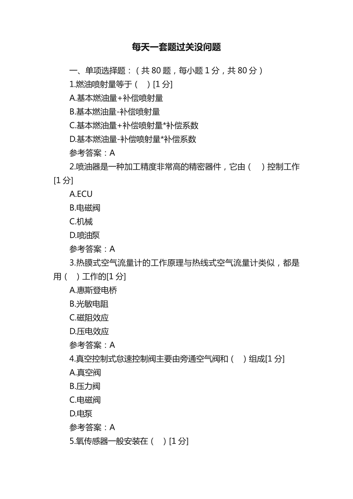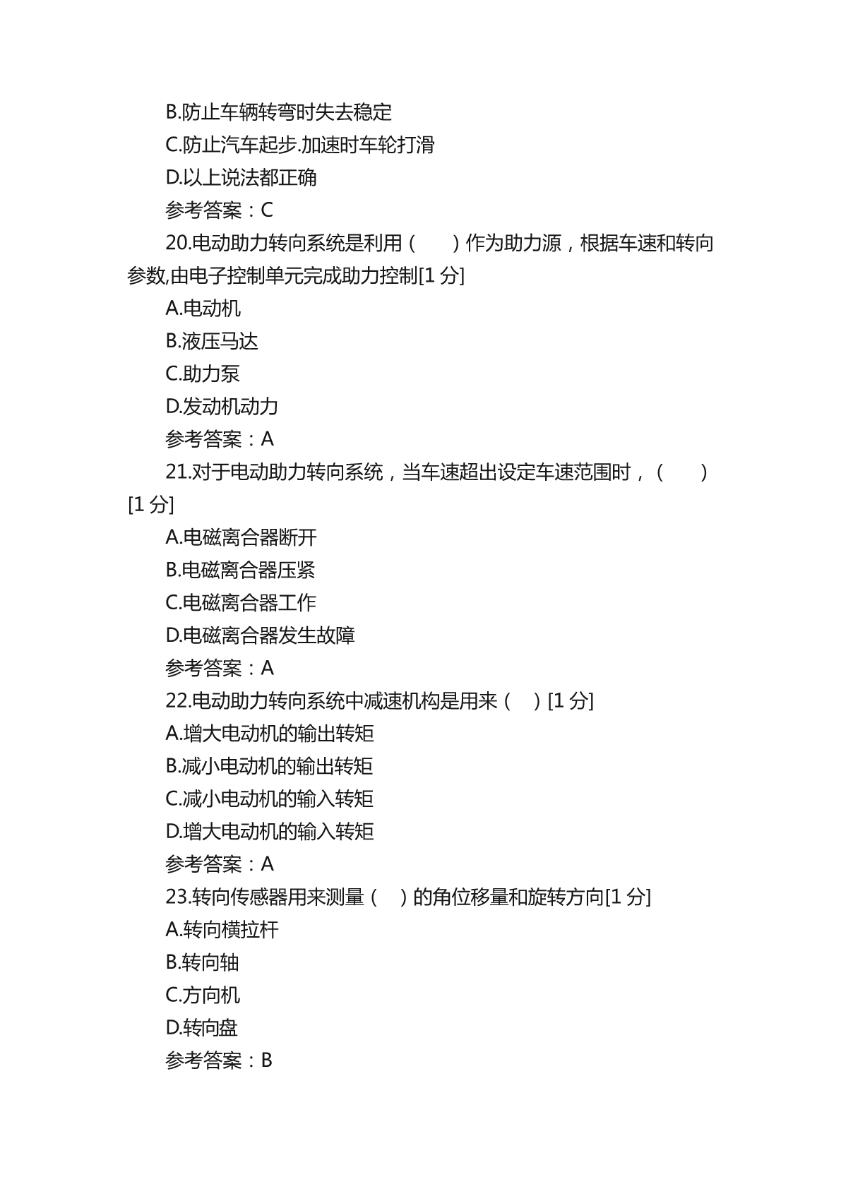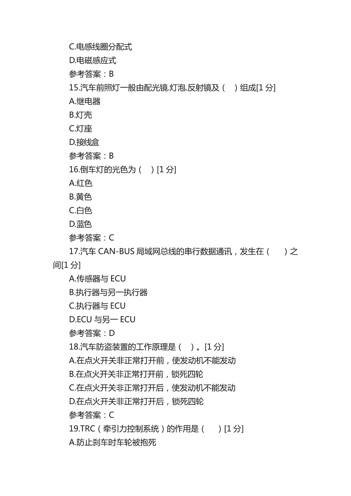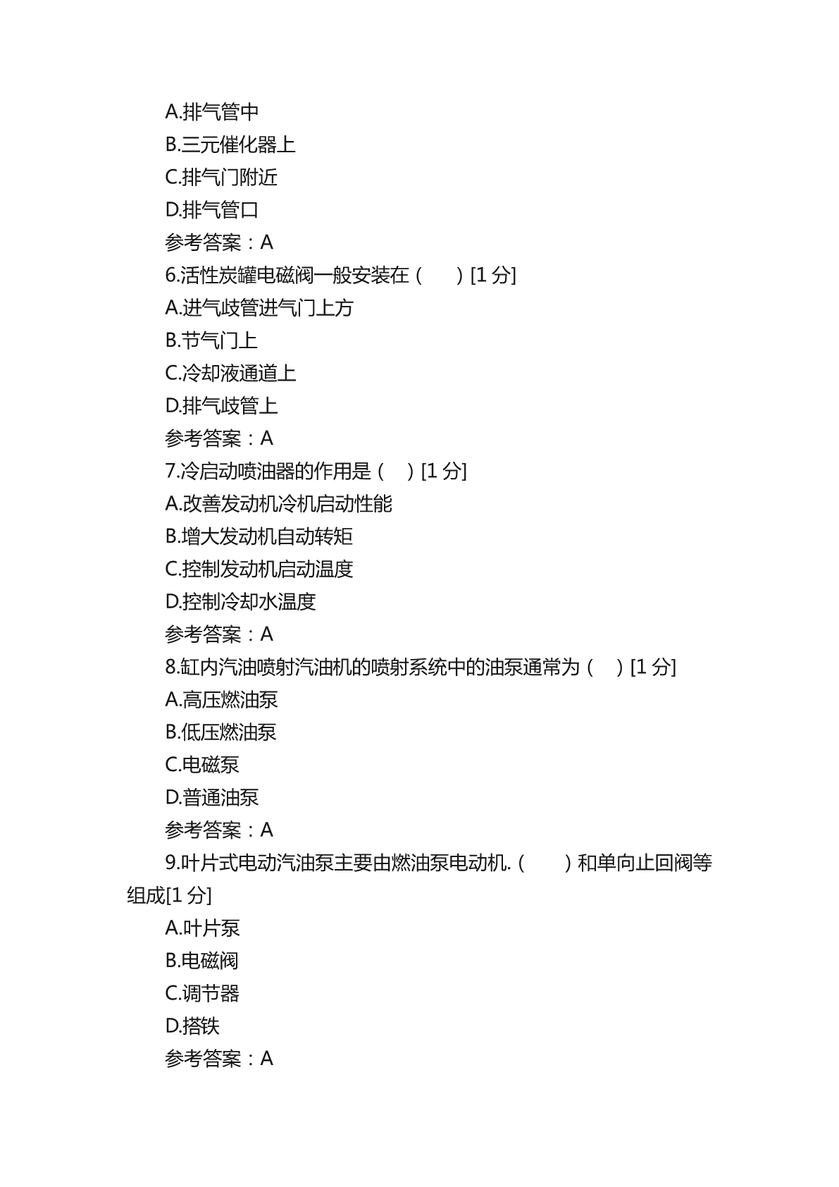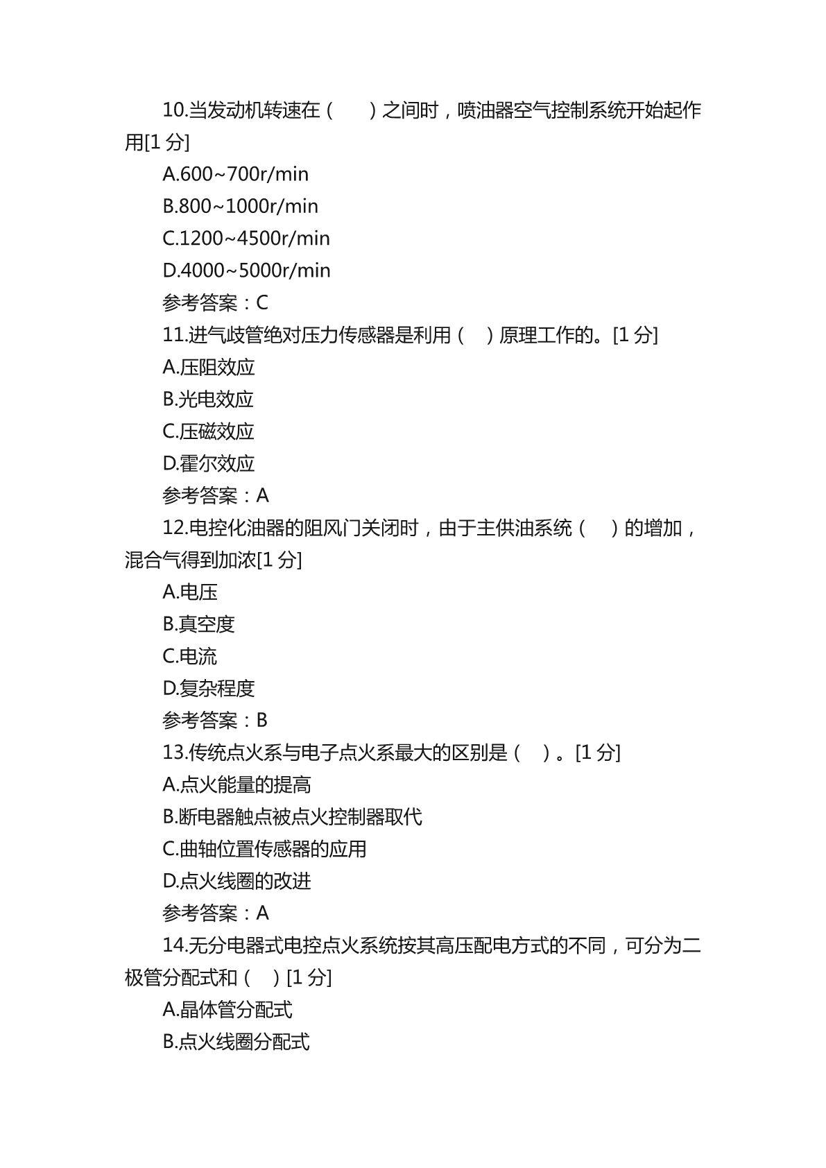 每天一套题过关没问题 一、单项选择题:(共80题,每小题1分,共80分) 1.燃油喷射量等于()[1分] A.基本燃油量+补偿喷射量 B.基本燃油量-补偿喷射量 C.基本燃油量+补偿喷射量*补偿系数 D.基本燃油量-补偿喷射量*补偿系数 参考答案:A 2.喷油器是一种加工精度非常高的精密器件,它由()控制工作 [1分] A.ECU B.电磁阀 C.机械 D.喷油泵 参考答案:A 3.热膜式空气流量计的工作原理与热线式空气流量计类似,都是 用()工作的[1分] A.惠斯登电桥 B.光敏电阻 C.磁阻效应 D.压电效应 参考答案:A 4.真空控制式怠速控制阀主要由旁通空气阀和()组成[1分] A.真空阀 B.压力阀 C.电磁阀 D.电泵 参考答案:A 5.氧传感器一般安装在()[1分] A.排气管中 B.三元催化器上 C.排气门附近 D.排气管口 参考答案:A 6.活性炭罐电磁阀一般安装在()[1分] A.进气歧管进气门上方 B.节气门上 C.冷却液通道上 D.排气歧管上 参考答案:A 7.冷启动喷油器的作用是()[1分] A.改善发动机冷机启动性能 B.增大发动机自动转矩 C.控制发动机启动温度 D.控制冷却水温度 参考答案:A 8.缸内汽油喷射汽油机的喷射系统中的油泵通常为()[1分] A.高压燃油泵 B.低压燃油泵 C.电磁泵 D.普通油泵 参考答案:A 9.叶片式电动汽油泵主要由燃油泵电动机.()和单向止回阀等 组成[1分] A.叶片泵 B.电磁阀 C.调节器 D.搭铁 参考答案:A 10.当发动机转速在()之间时,喷油器空气控制系统开始起作 用[1分] A.600~700r/min B.800~1000r/min C.1200~4500r/min D.4000~5000r/min 参考答案:C 11.进气歧管绝对压力传感器是利用()原理工作的。[1分] A.压阻效应 B.光电效应 C.压磁效应 D.霍尔效应 参考答案:A 12.电控化油器的阻风门关闭时,由于主供油系统()的增加, 混合气得到加浓[1分] A.电压 B.真空度 C.电流 D.复杂程度 参考答案:B 13.传统点火系与电子点火系最大的区别是()。[1分] A.点火能量的提高 B.断电器触点被点火控制器取代 C.曲轴位置传感器的应用 D.点火线圈的改进 参考答案:A 14.无分电器式电控点火系统按其高压配电方式的不同,可分为二 极管分配式和()[1分] A.晶体管分配式 B.点火线圈分配式 C.电感线圈分配式 D.电磁感应式 参考答案:B 15.汽车前照灯一般由配光镜.灯泡.反射镜及()组成[1分] A.继电器 B.灯壳 C.灯座 D.接线盒 参考答案:B 16.倒车灯的光色为()[1分] A.红色 B.黄色 C.白色 D.蓝色 参考答案:C 17.汽车CAN-BUS局域网总线的串行数据通讯,发生在()之 间[1分] A.传感器与ECU B.执行器与另一执行器 C.执行器与ECU D.ECU与另一ECU 参考答案:D 18.汽车防盗装置的工作原理是()。[1分] A.在点火开关非正常打开前,使发动机不能发动 B.在点火开关非正常打开前,锁死四轮 C.在点火开关非正常打开后,使发动机不能发动 D.在点火开关非正常打开后,锁死四轮 参考答案:C 19.TRC(牵引力控制系统)的作用是()[1分] A.防止刹车时车轮被抱死 B.防止车辆转弯时失去稳定 C.防止汽车起步.加速时车轮打滑 D.以上说法都正确 参考答案:C 20.电动助力转向系统是利用()作为助力源,根据车速和转向 参数,由电子控制单元完成助力控制[1分] A.电动机 B.液压马达 C.助力泵 D.发动机动力 参考答案:A 21.对于电动助力转向系统,当车速超出设定车速范围时,() [1分] A.电磁离合器断开 B.电磁离合器压紧 C.电磁离合器工作 D.电磁离合器发生故障 参考答案:A 22.电动助力转向系统中减速机构是用来()[1分] A.增大电动机的输出转矩 B.减小电动机的输出转矩 C.减小电动机的输入转矩 D.增大电动机的输入转矩 参考答案:A 23.转向传感器用来测量()的角位移量和旋转方向[1分] A.转向横拉杆 B.转向轴 C.方向机 D.转向盘 参考答案:B 24.EFI必须进行(),从而产生最适宜的可燃混合气[1分] A.喷射量补偿 B.冷却水温度检测 C.进气量检测 D.点火时间检测 参考答案:A 25.EFI-D检测的是()[1分] A.进气流量 B.排气流量 C.进气歧管压力 D.进气温度 参考答案:C 26.发动机起动时,基本喷射时间是由()决定的[1分] A.冷却水温度 B.节气门开度 C.润滑油温度 D.进气歧管压力 参考答案:A 27.发动机暖机时的燃料喷射时