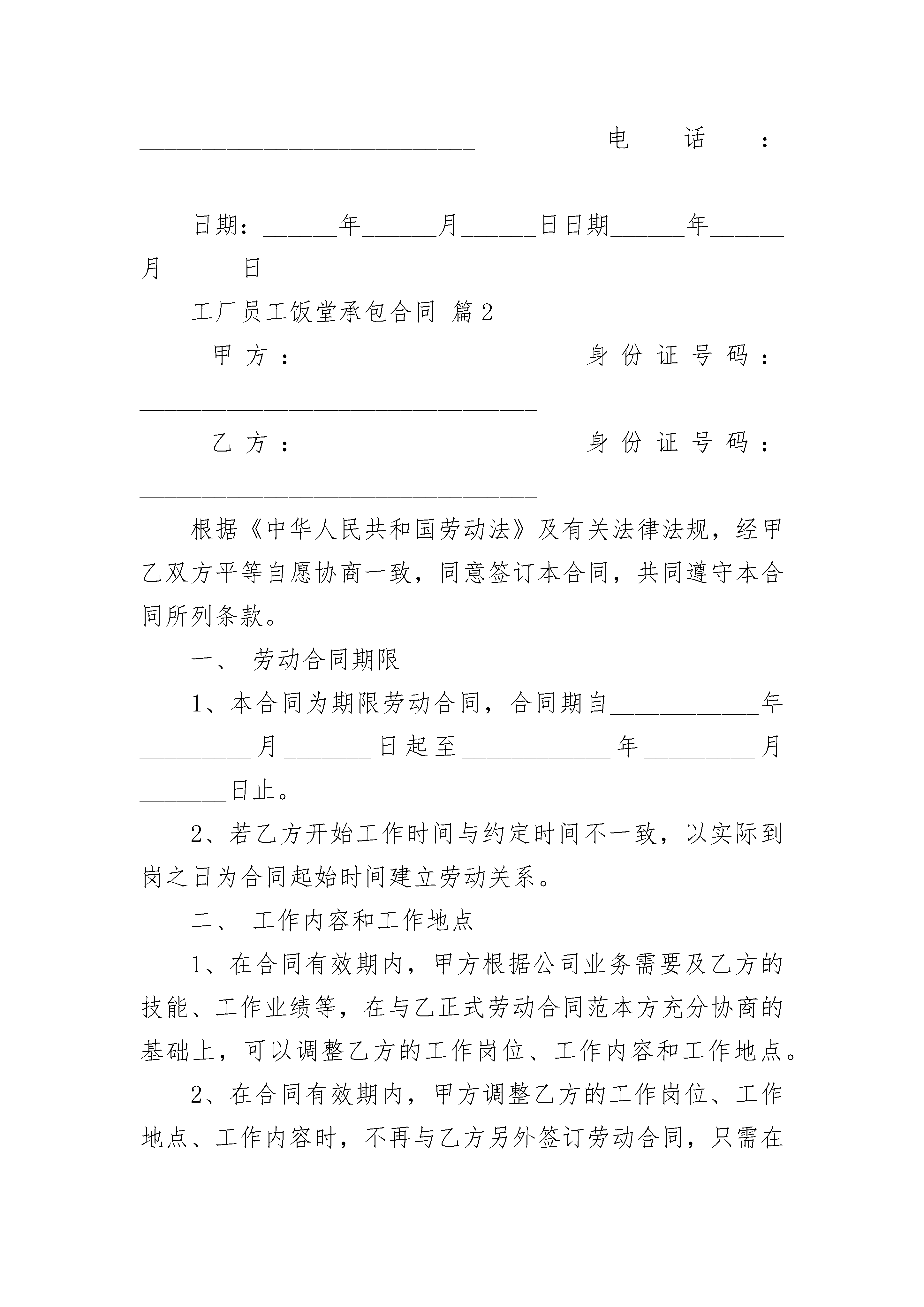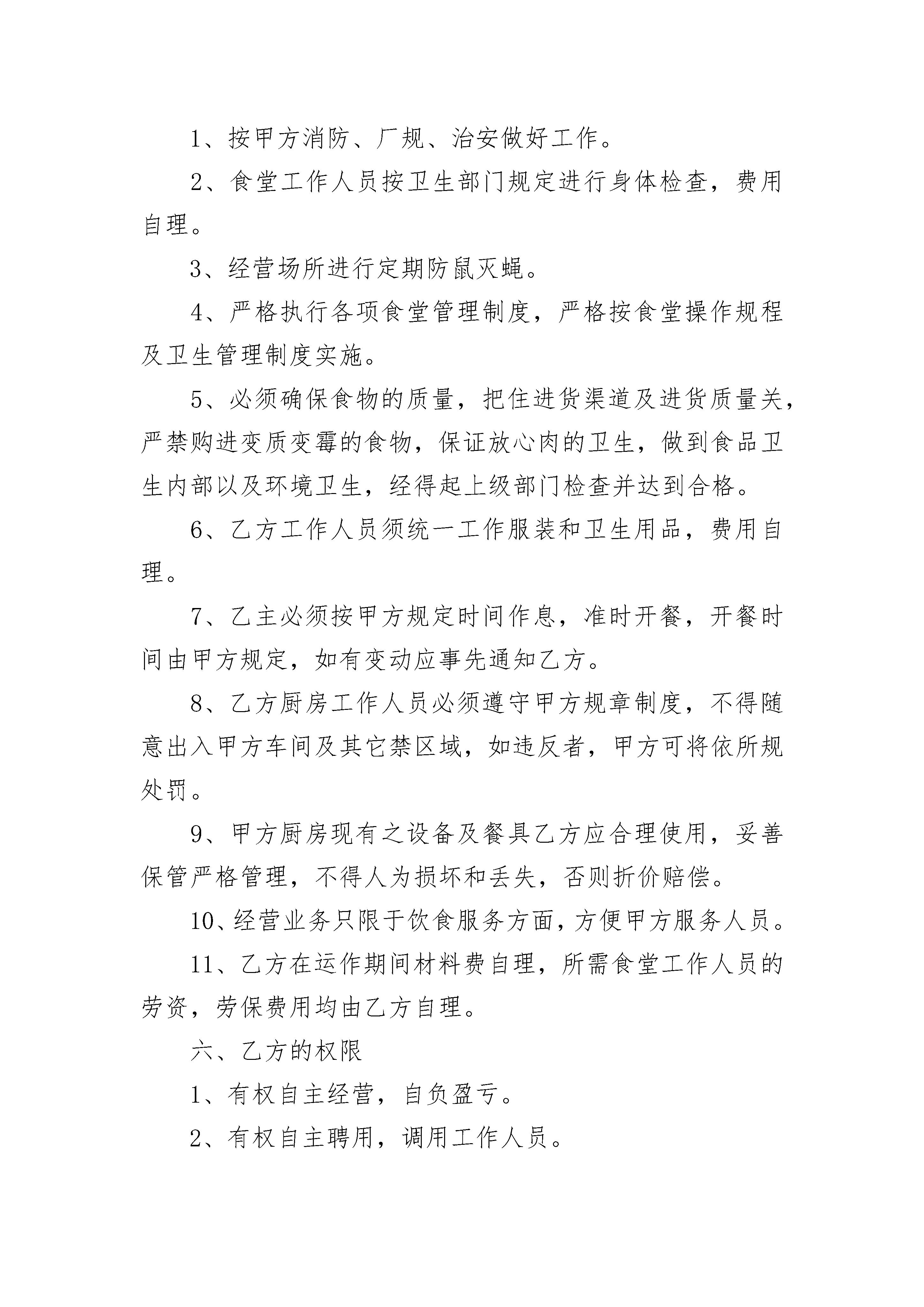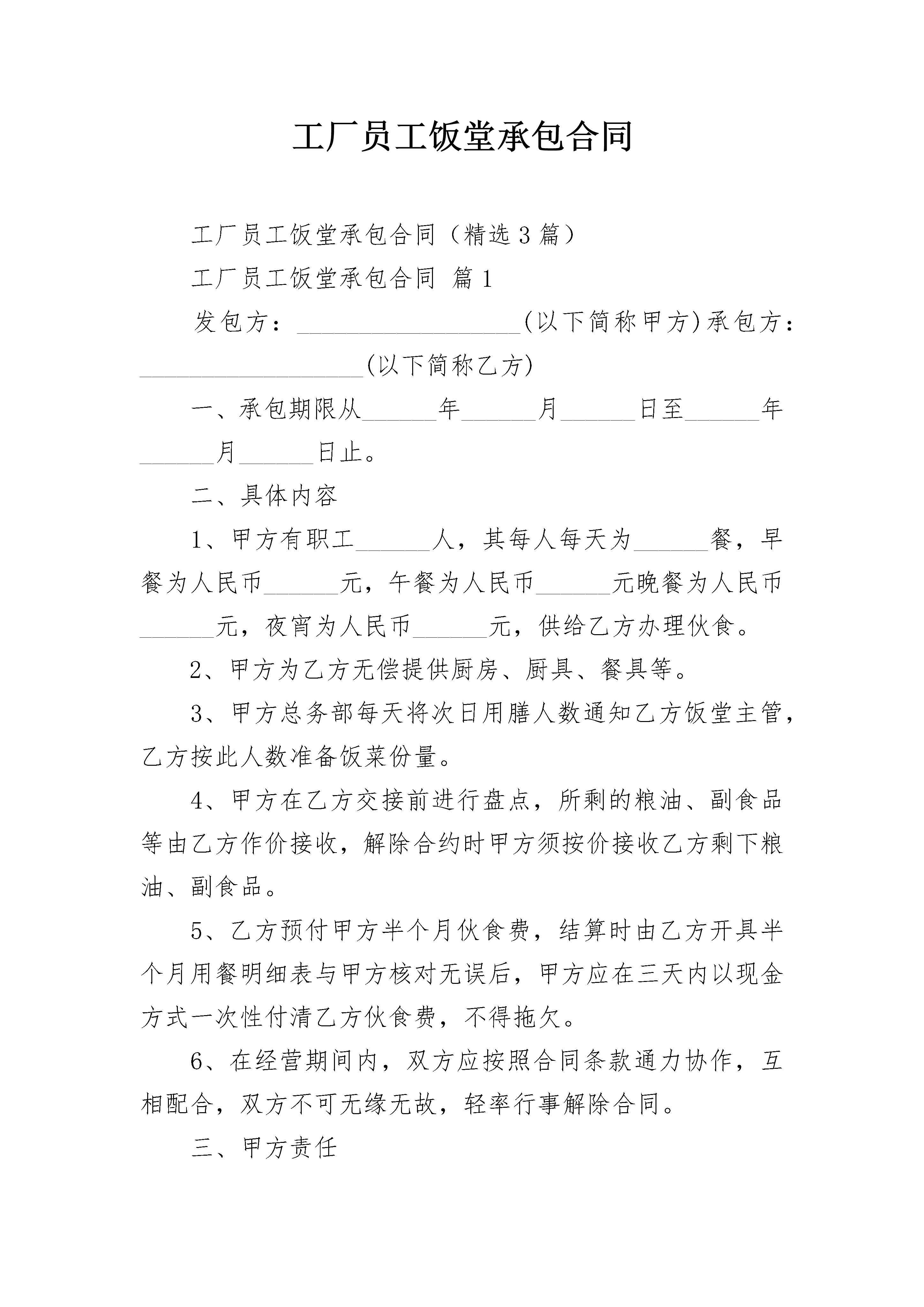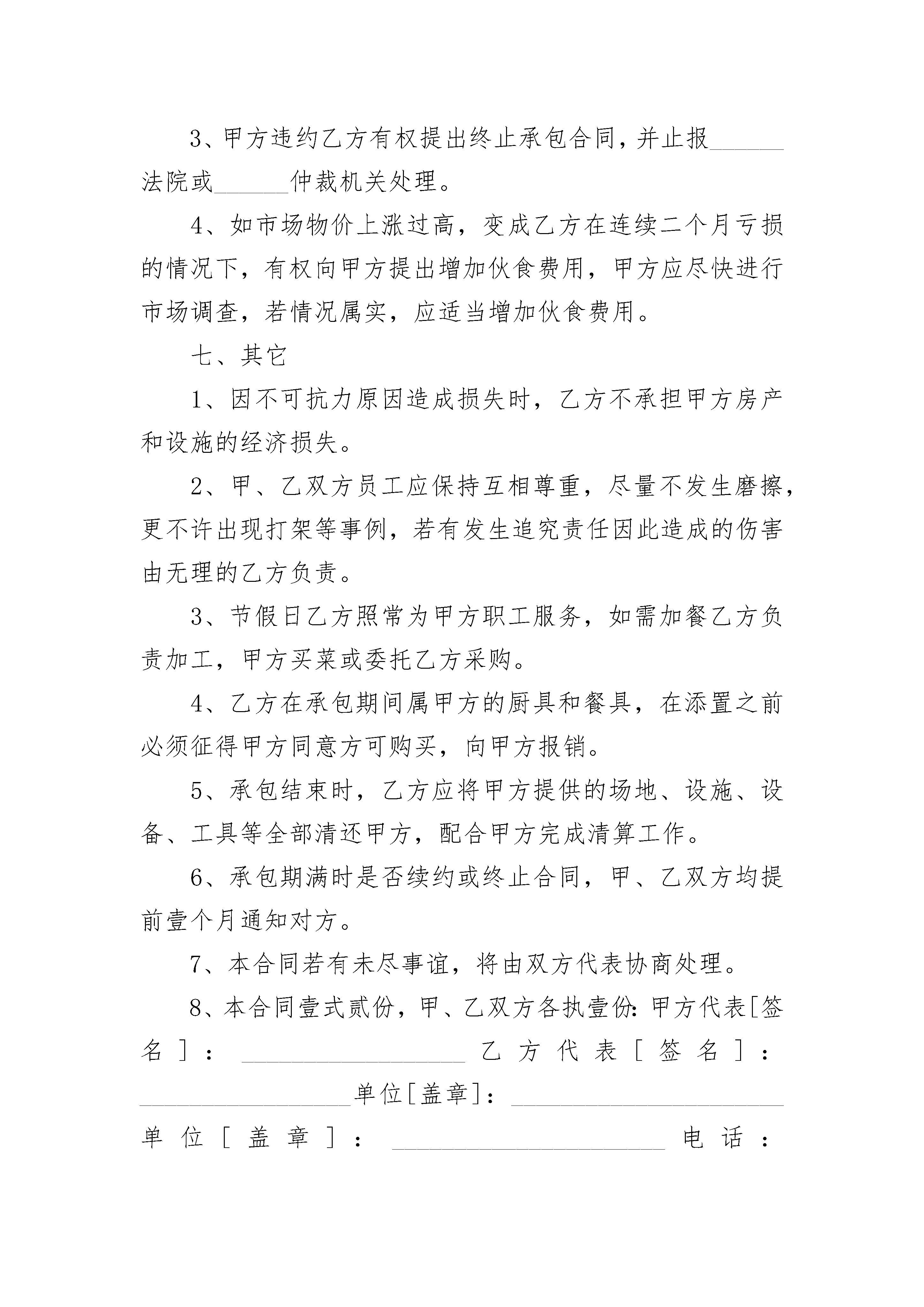 工厂员工饭堂承包合同工厂员工饭堂承包合同(精选3篇)工厂员工饭堂承包合同篇1发包方:__________________(以下简称甲方)承包方:__________________(以下简称乙方)一、承包期限从______年______月______日至______年______月______日止。二、具体内容1、甲方有职工______人,其每人每天为______餐,早餐为人民币______元,午餐为人民币______元晚餐为人民币______元,夜宵为人民币______元,供给乙方办理伙食。2、甲方为乙方无偿提供厨房、厨具、餐具等。3、甲方总务部每天将次日用膳人数通知乙方饭堂主管,乙方按此人数准备饭菜份量。4、甲方在乙方交接前进行盘点,所剩的粮油、副食品等由乙方作价接收,解除合约时甲方须按价接收乙方剩下粮油、副食品。5、乙方预付甲方半个月伙食费,结算时由乙方开具半个月用餐明细表与甲方核对无误后,甲方应在三天内以现金方式一次性付清乙方伙食费,不得拖欠。6、在经营期间内,双方应按照合同条款通力协作,互相配合,双方不可无缘无故,轻率行事解除合同。三、甲方责任1、提供设备的维修保养。2、提供乙方工作人员的住宿,包括水和照明用电费。3、甲方无偿提供厨房所用的燃料、水、电。4、不得随意停止承包和随增加收费项目。5、甲方必须提前预报就餐人数,失误造成后果,由甲方负责。四、甲方权限1、甲方有权对乙方进行各种行政管理,如:卫生、安全、治安、消防、综合治理、监督等,特别要禁止食物中毒事故发生,一但发生类似事故,甲方有权追究乙方的责任。2、乙方因食堂工作人员失职影响甲方正常工作,(如无特殊情况下),甲方有权追究乙方的责任。3、甲方有权对饭菜质量数量、卫生服务等情况进行监督检查,如乙方未达到饭菜质量,甲方有权要求进行适量赔偿或终止本协议。4、根据食堂工作情况和员工意见甲方有权采用其他方式进行食堂管理。5、承包方其他违约时,甲方须立即告知乙方,乙方应尽快调查落实,把处理结果告知甲方。6、乙方除因特殊情况外,造成误餐或停餐,甲方有权对乙方给予适当的经济处罚。7、乙方违约,甲方有权提出终止承包合同,造成甲方损失的,上报______法院或______仲裁机关处理。五、乙方责任1、按甲方消防、厂规、治安做好工作。2、食堂工作人员按卫生部门规定进行身体检查,费用自理。3、经营场所进行定期防鼠灭蝇。4、严格执行各项食堂管理制度,严格按食堂操作规程及卫生管理制度实施。5、必须确保食物的质量,把住进货渠道及进货质量关,严禁购进变质变霉的食物,保证放心肉的卫生,做到食品卫生内部以及环境卫生,经得起上级部门检查并达到合格。6、乙方工作人员须统一工作服装和卫生用品,费用自理。7、乙主必须按甲方规定时间作息,准时开餐,开餐时间由甲方规定,如有变动应事先通知乙方。8、乙方厨房工作人员必须遵守甲方规章制度,不得随意出入甲方车间及其它禁区域,如违反者,甲方可将依所规处罚。9、甲方厨房现有之设备及餐具乙方应合理使用,妥善保管严格管理,不得人为损坏和丢失,否则折价赔偿。10、经营业务只限于饮食服务方面,方便甲方服务人员。11、乙方在运作期间材料费自理,所需食堂工作人员的劳资,劳保费用均由乙方自理。六、乙方的权限1、有权自主经营,自负盈亏。2、有权自主聘用,调用工作人员。3、甲方违约乙方有权提出终止承包合同,并止报______法院或______仲裁机关处理。4、如市场物价上涨过高,变成乙方在连续二个月亏损的情况下,有权向甲方提出增加伙食费用,甲方应尽快进行市场调查,若情况属实,应适当增加伙食费用。七、其它1、因不可抗力原因造成损失时,乙方不承担甲方房产和设施的经济损失。2、甲、乙双方员工应保持互相尊重,尽量不发生磨擦,更不许出现打架等事例,若有发生追究责任因此造成的伤害由无理的乙方负责。3、节假日乙方照常为甲方职工服务,如需加餐乙方负责加工,甲方买菜或委托乙方采购。4、乙方在承包期间属甲方的厨具和餐具,在添置之前必须征得甲方同意方可购买,向甲方报销。5、承包结束时,乙方应将甲方提供的场地、设施、设备、工具等全部清还甲方,配合甲方完成清算工作。6、承包期满时是否续约或终止合同,甲、乙双方均提前壹个月通知对方。7、本合同若有未尽事谊,将由双方代表协商处理。8、本合同壹式贰份,甲、乙双方各执壹份:甲方代表[签名]:__________________乙方代表[签名]:_________________单位[盖章]:______________________单位[盖章]:______________________电话:___________________________电话:____________________________日期:______年______月______日日期_