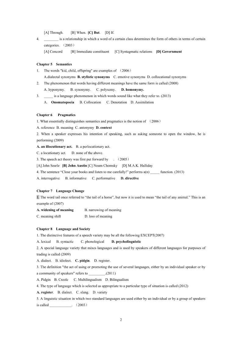 Chapter1Introduction 1.Thedistinctionbetweenparoleandlanguewasmadeby(2006) A.HollidayB.ChomskyC.BloomfieldD.Saussure 2.WhichofthefollowingisNOTadesignfeatureofhumanlanguage?(2008) A.Arbitrariness.B.Displacement.C.Duality.D.Diachronicity. 3.Thestudyofthementalprocessesoflanguagecomprehensionandproductionis(2009) A.corpuslinguistics.B.sociolinguistics. C.theoreticallinguistics.D.psycholinguistics. 4.Languageistoolofcommunication,thesymbol“highwayclosed”serves(2010) A.anexpressivefunction.B.aninformativefunction. C.aperformativefunctionD.apersuasivefunction 5.WhichofthefollowingisNOTadistinctivefeatureofhumanlanguage?(2005) [A]Arbitrariness.[B]Productivity.[C]Culturaltransmission.[D]Finiteness. Chapter2Phonology 1.AvowelisdifferentfromaconsonantinEnglishbecauseof________.(2011) A.absenceofobstructionB.presenceofobstruction C.mannerofarticulationD.placeofarticulation 2.InEnglishifawordbeginswitha[l]ora[r],thenthenextsoundmustbeavowel.Thisisa(n)(2012) A.assimilationrule.B.sequentialrule.C.deletionrule.D.grammarrule. 3.Englishconsonantscanbeclassifiedintostops,fricatives,nasals,etc.intermsof.(2004) [A]mannerofarticulation[B]opennessofmouth[C]placeofarticulation[D]voicing 4._______studiesthesoundsystemsinacertainlanguage.(2003) [A]Phonetics[B]Phonology[C]Semantics[D]Pragmatics Chapter3Morphology 1._______referstothestudyoftheinternalstructureofwordsandtherulesofwordformation.(2007) A.PhonologyB.MorphologyC.SemanticsD.Sociolinguistics 2.Theword“motel”comesfrom“motor–hotel”.Thisisanexampleof“…”inmorphology.(2010) A.backformationB.conversionC.blendingD.acronym 3.Whichofthefollowingisanexampleofclipping?(2012) A.APEC.B.Motel.C.Xerox.D.Disco. 4._______isthesmallestunitoflanguageintermsofrelationshipbetweenexpressionandcontent.(2004) [A]Word[B]Morpheme[C]Allomorph[D]Root 5.Whichofthefollowingitalicizedpartsisaninflectionalmorpheme?(2013) A.unlockB.governmentC.goesD.off-stage Chapter4Syntax 1.Whattypeofsentenceis“Marklikesfiction,butTimisinterestedinpoetry.”?(2008) A.Asimplese