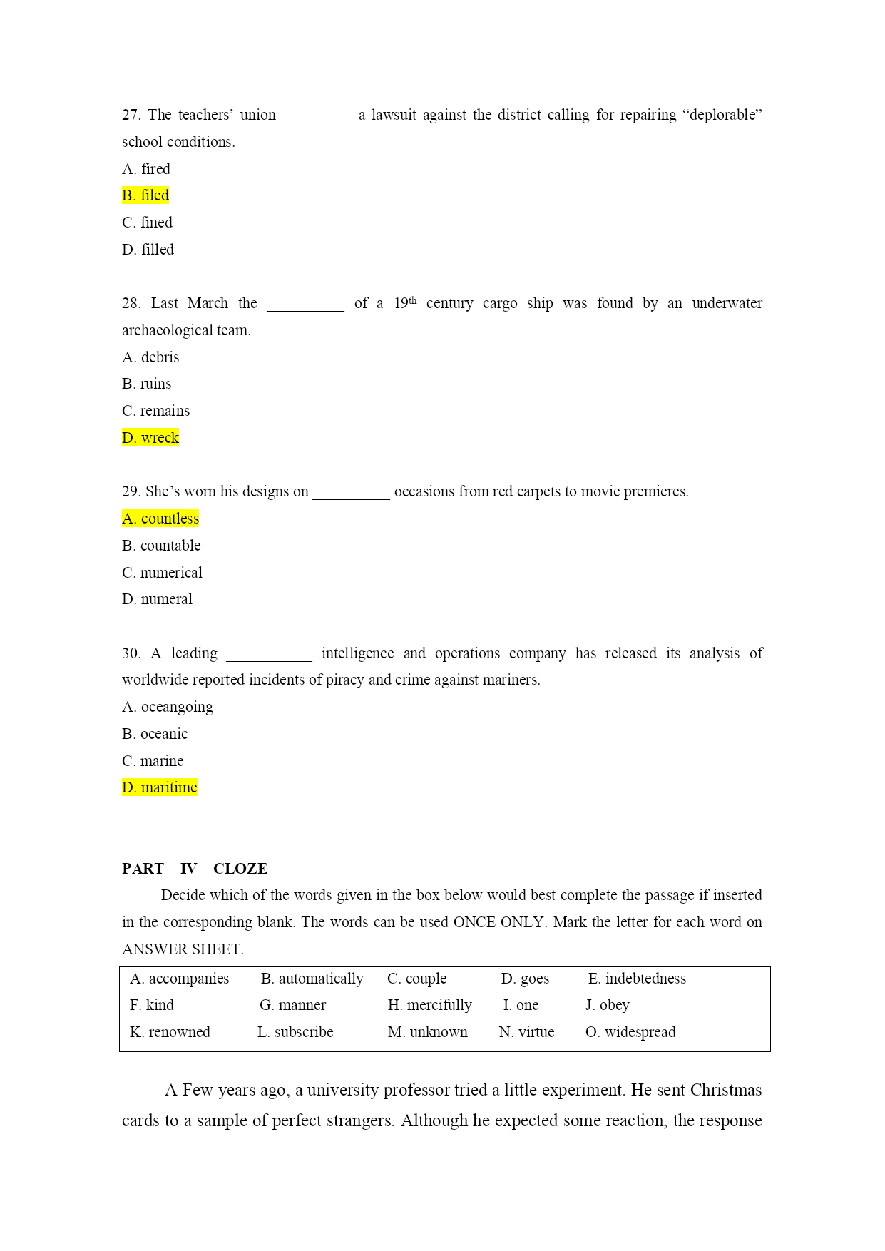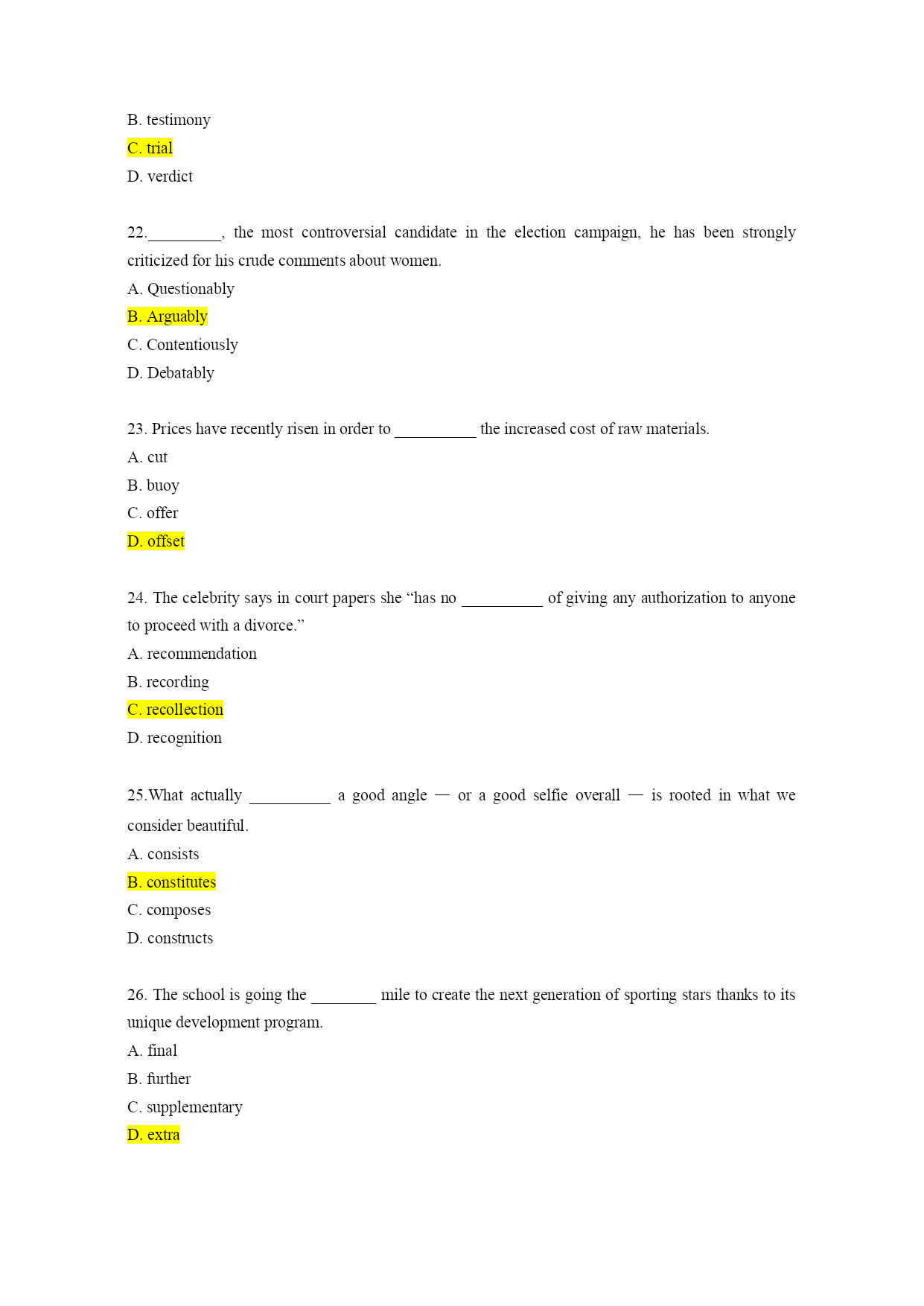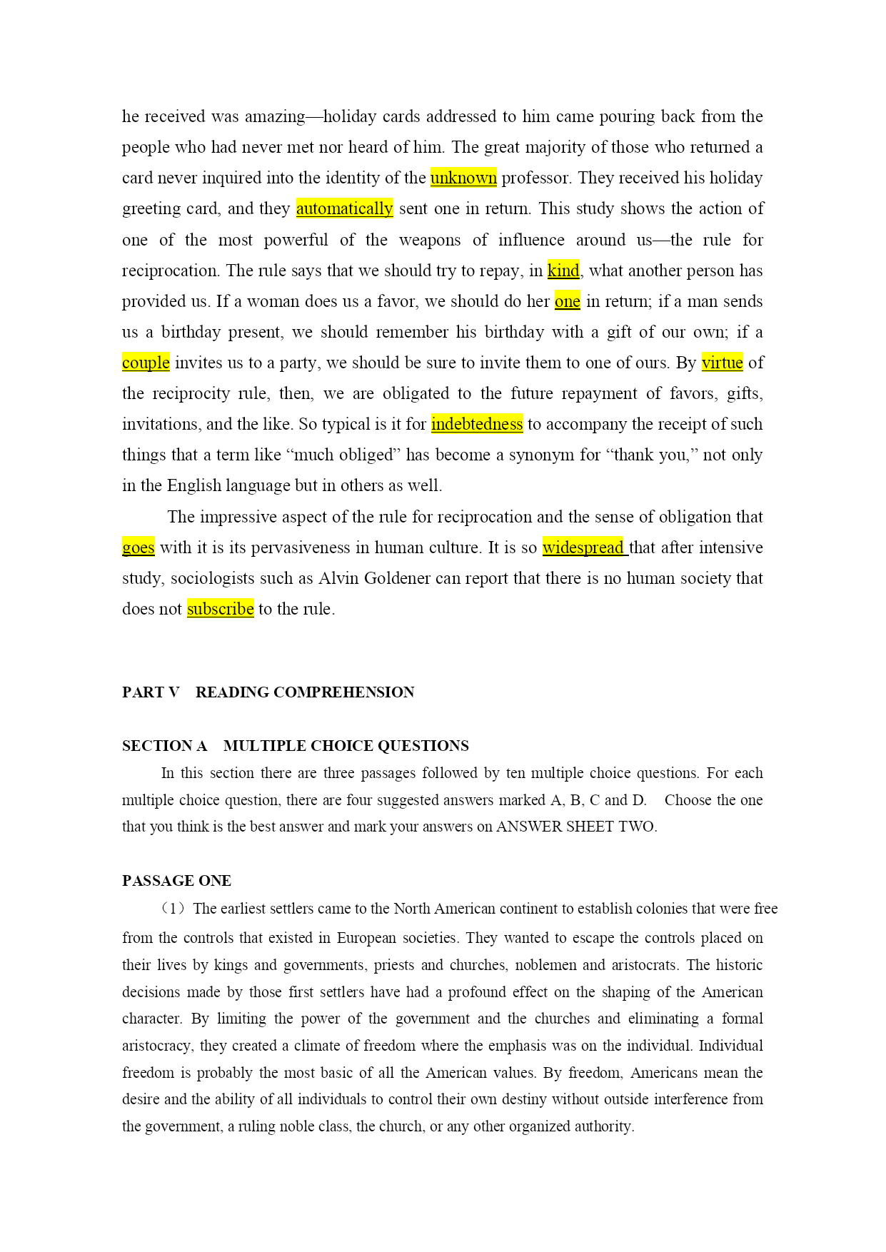 2018英语专业四级考试真题及参考答案 PARTIIILANGUAGEUSAGE Therearetwentysentencesinthissection.BeneatheachsentencetherearefouroptionsmarkedA,B,CandD.Choosetheonethatbestcompletesthesentenceoranswersthequestion.MarkhouranswersonANSWERSHEETTWO. 11.TheBentPyramidoutsideCairo__________ancientEgypt’sfirstattempttobuildasmooth-sidedpyramid. A.hasbeenbelievedtohavebeen B.wasbelievedtobe C.isbelievedtohavebeen D.isbelievedtobe 12.U.S.News____________rankingsofcollegessince1983.Theyareaverypopularresourceforstudentslookingtoapplytouniversitycampus. A.maintains B.ismaintaining C.maintained D.hasbeenmaintaining 13.Hewasluredintoacrimehewouldnot____________havecommitted. A.actually B.accidentally C.otherwise D.seldom 14.Shewasonceayoungcountrywifewithchickensinthebackyardandaviewof_____________mountainsbehindtheappleorchard. A.bluehazyVirginia B.hazyblueVirginia C.Virginiahazyblue D.Virginiabluehazy 15.Ilongtoalleviate__________,butIcannot. A.theevil B.evil C.evils D.anevil 16.Indeed,itisarguablethatbodyshatteringistheverypointoffootball,askillingandmaiming______________. A.war B.arewar C.ofwar D.areofwar 17.At____________,photographyisachemicalprocess,duringwhichalight-sensitivematerialisalteredwhenexposedtolight. A.itsmostbasic B.itsbasic C.themostbasic D.thebasic 18.Shehiredalawyertoinvestigate,onlytolearnthatGabrielhadremovedhernamefromthedeed.Theinfinitiveverbphrase“onlytolearn”isused__________. A.toexpressanintendedpurpose B.toindicateahighdegreeofpossibility C.torevealanundesirableconsequence D.todramatizeastatedfact 19.WhichofthefollowingitalicizedwordsDOESNOTcarrythemetaphoricalmeaning? A.Iwonderwhat’sbehindthischangeofplan. B.Jimturnedtospeaktothepersonstandingbehindhim. C.Thisworkshouldhavebeenfinishedyesterday.I’mgettingterriblybehind. D.IsupposeI’mluckybecausemyparentswerebehindmealltheway. 20.Mymotherwasdeterminedtohelpthoseinneedandshewouldhavebeenimmenselyproudofwhathasbeenachievedtheselast20years.Theitalicizedpartinthesentenceexpresses_______. A.ahypothesis B.asuggest
