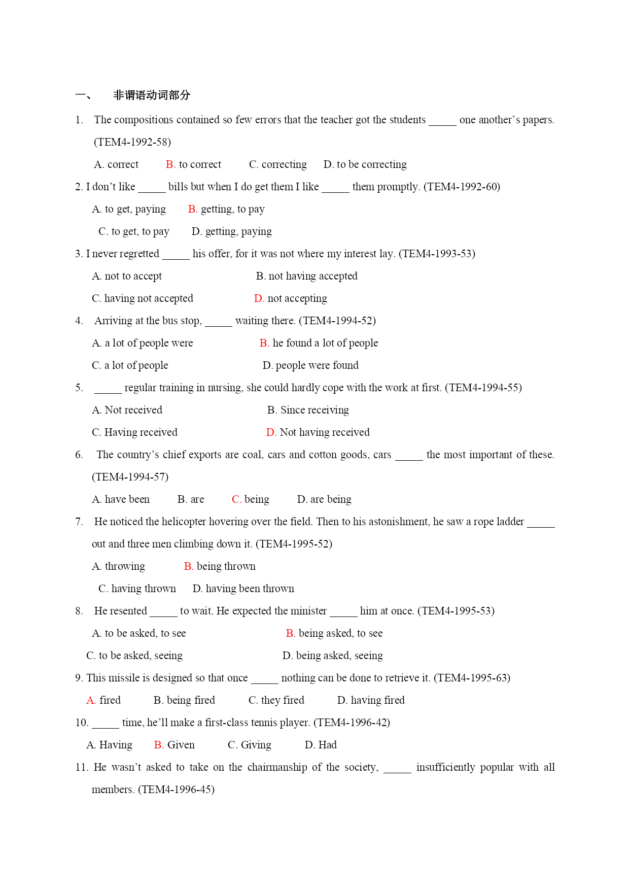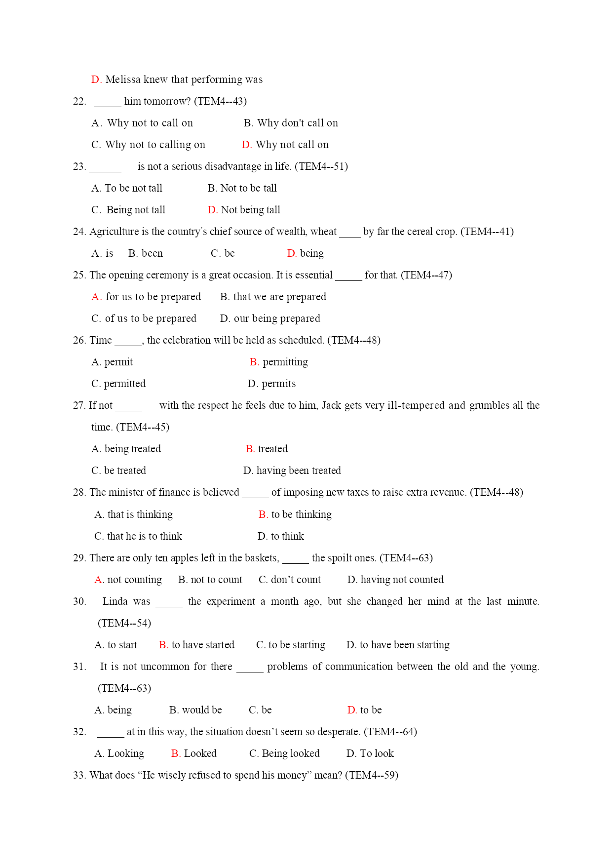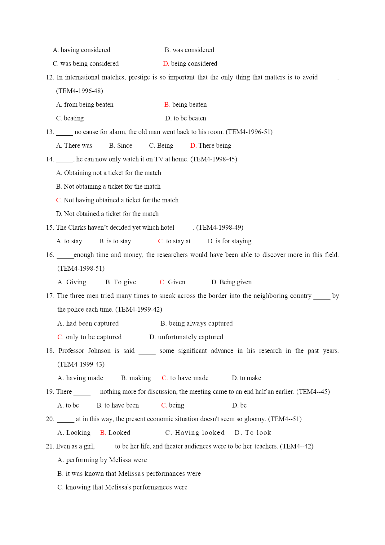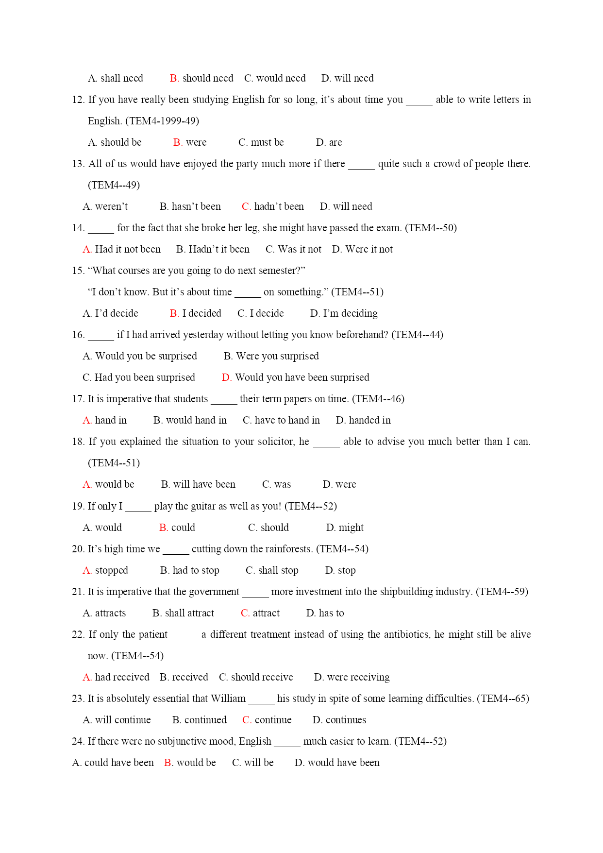 英语专业四级历年语法试题 虚拟语气部分 1.Ifyou_____insuchahurry,you_____sugarintothesauceinsteadofsalt.(TEM4-1992-50) A.werenot,wouldnotputB.were,wouldput C.hadbeen,wouldhaveputD.hadnotbeen,wouldnothaveput 2._____theirhelp,wewouldnothavesucceeded.(TEM4-1992-55) A.Hadn’tbeenforB.Hadnotitbeenfor C.Ithadn’tbeenforD.Haditnotbeenfor 3.Sheaskedthatshe_____allowedtoseehersoninpolicecustody.(TEM4-1993-50) A.wouldbeB.couldbeC.beD.was 4._____yourtimelyadvice,Iwouldneverhaveknownhowtogoaboutthework.(TEM4-1994-53) A.UnlessB.ButforC.ExceptforD.Notfor 5.Itwasrecommendedthatpassengers_____smokeduringtheflight.(TEM4-1994-58) A.notB.neednotC.couldnotD.wouldnot 6._____youwerebusy,Iwouldn’thavebotheredyouwithquestions.(TEM4-1994-62) A.IfIrealizedB.HadIrealizedC.IrealizedD.AsIrealized 7._____,hewouldnothaverecoveredsoquickly.(TEM4-1995-65) A.Hadn’thebeentakengoodcareof B.Hadhenotbeentakengoodcareof C.Hadnothebeentakengoodcareof D.Hadhebeennottakengoodcareof 8.I_____thepartymuchmoreiftherehadn’tbeenquitesuchacrowdofpeoplethere.(TEM4-1996-43) A.wouldenjoyB.willhaveenjoyed C.couldhaveenjoyedD.willbeenjoying 9.Heleftordersthatnothing_____toucheduntilthepolicearrivedthere.(TEM4-1997-43) A.shouldbeB.oughttobeC.mustbeD.wouldbe 10.Iwastohavemadeaspeechif_____.(TEM4-1997-51) A.Iwasnotcalledaway B.nobodywouldhavecalledmeaway C.Ihadnotbeencalledaway D.nobodycalledmeaway 11.Ifyourcar_____anyattentionduringthefirst12months,takeittoauthorizeddealer.(TEM4-1998-43) A.shallneedB.shouldneedC.wouldneedD.willneed 12.IfyouhavereallybeenstudyingEnglishforsolong,it’sabouttimeyou_____abletowritelettersinEnglish.(TEM4-1999-49) A.shouldbeB.wereC.mustbeD.are 13.Allofuswouldhaveenjoyedthepartymuchmoreifthere_____quitesuchacrowdofpeoplethere.(TEM4--49) A.weren’tB.hasn’tbeenC.hadn’tbeenD.willneed 14._____forthefactthatshebrokeherleg,shemighthavepassedtheexam.(TEM4--50) A.HaditnotbeenB.Hadn’titbeenC.WasitnotD.Wereitnot 15.“Whatcoursesareyougoingtodonextsemester?” “Idon’tknow.Butit’sabouttime_____onsomething.”(TEM4--51) A.I’ddecideB.I