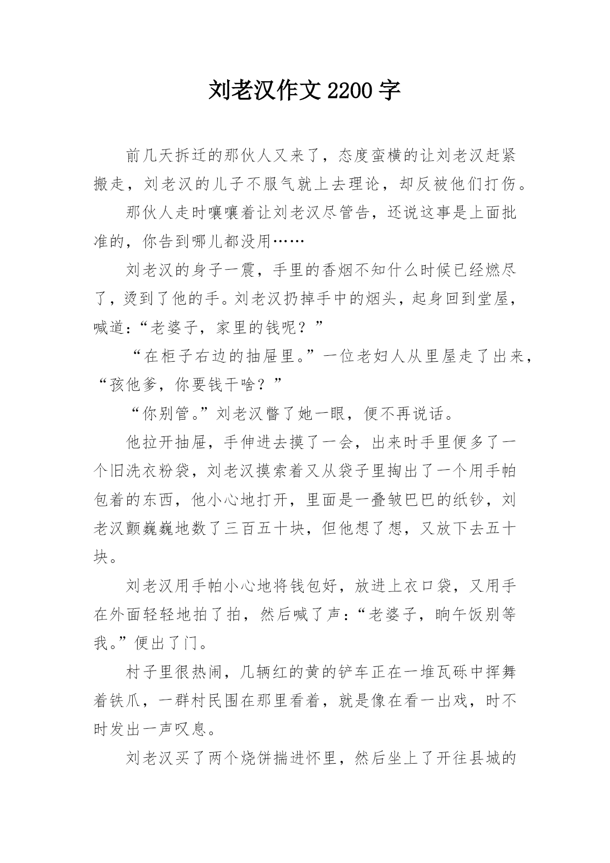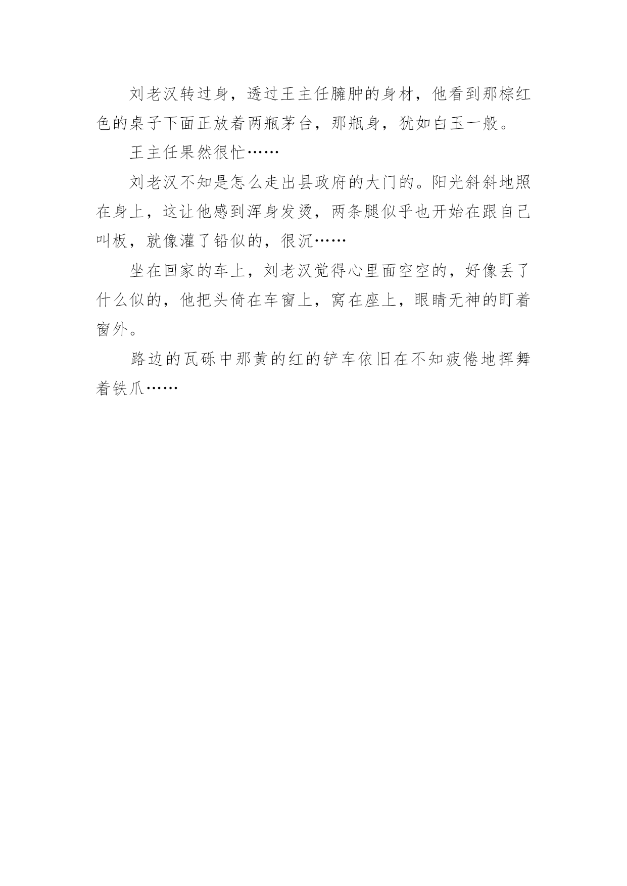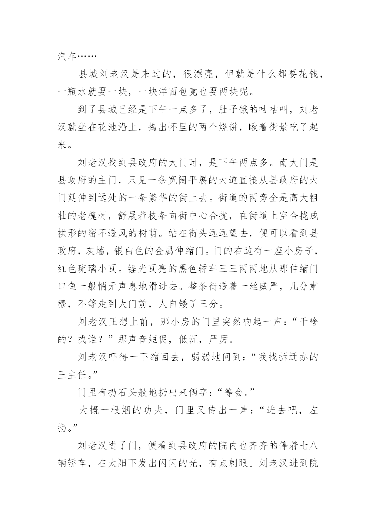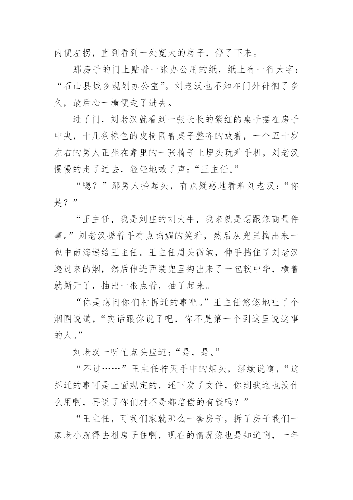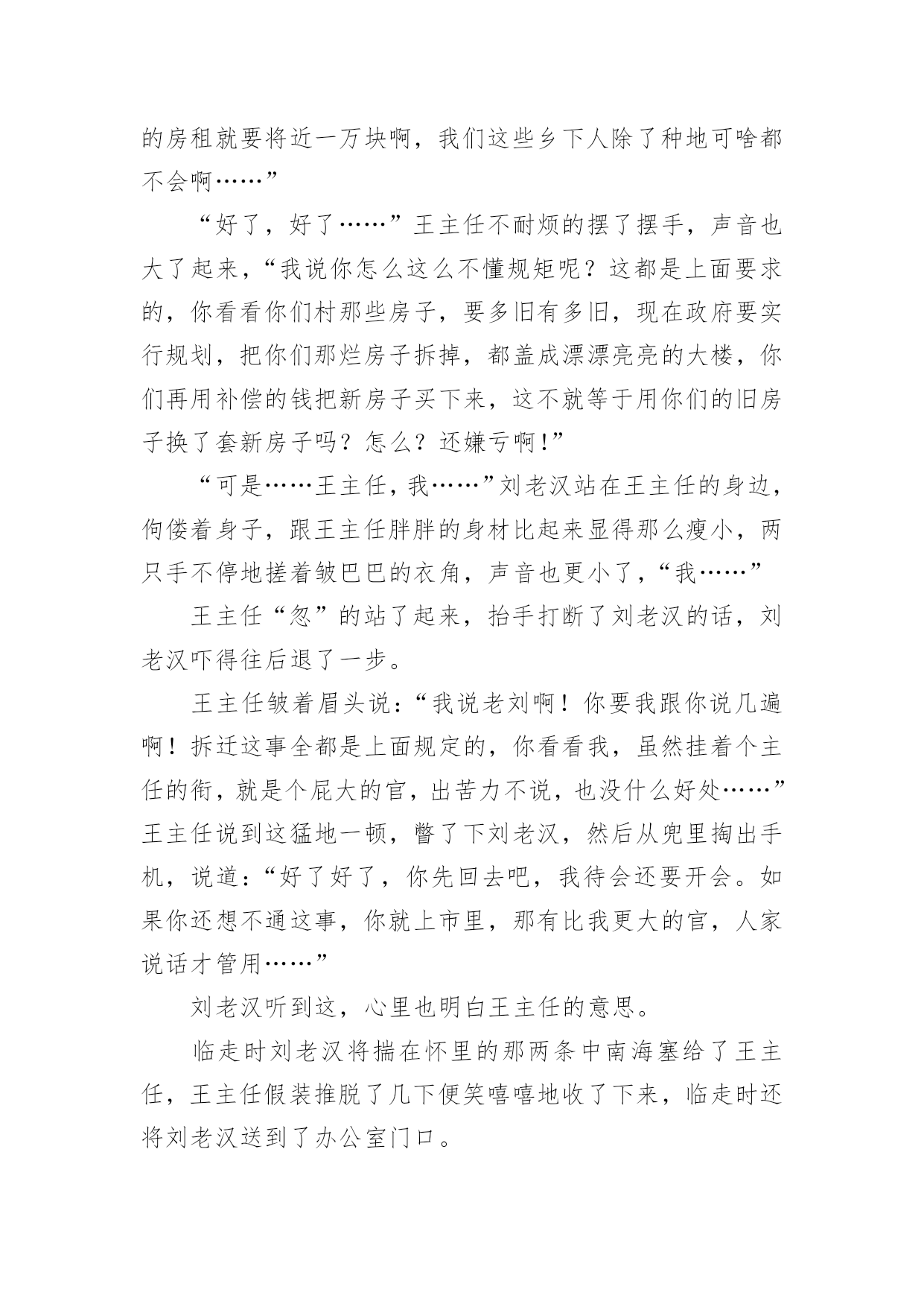 刘老汉作文2200字 前几天拆迁的那伙人又来了,态度蛮横的让刘老汉赶紧搬走,刘老汉的儿子不服气就上去理论,却反被他们打伤。那伙人走时嚷嚷着让刘老汉尽管告,还说这事是上面批准的,你告到哪儿都没用……刘老汉的身子一震,手里的香烟不知什么时候已经燃尽了,烫到了他的手。刘老汉扔掉手中的烟头,起身回到堂屋,喊道:“老婆子,家里的钱呢?”“在柜子右边的抽屉里。”一位老妇人从里屋走了出来,“孩他爹,你要钱干啥?”“你别管。”刘老汉瞥了她一眼,便不再说话。他拉开抽屉,手伸进去摸了一会,出来时手里便多了一个旧洗衣粉袋,刘老汉摸索着又从袋子里掏出了一个用手帕包着的东西,他小心地打开,里面是一叠皱巴巴的纸钞,刘老汉颤巍巍地数了三百五十块,但他想了想,又放下去五十块。刘老汉用手帕小心地将钱包好,放进上衣口袋,又用手在外面轻轻地拍了拍,然后喊了声:“老婆子,晌午饭别等我。”便出了门。村子里很热闹,几辆红的黄的铲车正在一堆瓦砾中挥舞着铁爪,一群村民围在那里看着,就是像在看一出戏,时不时发出一声叹息。刘老汉买了两个烧饼揣进怀里,然后坐上了开往县城的汽车……县城刘老汉是来过的,很漂亮,但就是什么都要花钱,一瓶水就要一块,一块洋面包竟也要两块呢。到了县城已经是下午一点多了,肚子饿的咕咕叫,刘老汉就坐在花池沿上,掏出怀里的两个烧饼,瞅着街景吃了起来。刘老汉找到县政府的大门时,是下午两点多。南大门是县政府的主门,只见一条宽阔平展的大道直接从县政府的大门延伸到远处的一条繁华的街上去。街道的两旁全是高大粗壮的老槐树,舒展着枝条向街中心合拢,在街道上空合拢成拱形的密不透风的树荫。站在街头远远望去,便可以看到县政府,灰墙,银白色的金属伸缩门。门的右边有一座小房子,红色琉璃小瓦。锃光瓦亮的黑色轿车三三两两地从那伸缩门口鱼一般悄无声息地滑进去。整条街透着一丝威严,几分肃穆,不等走到大门前,人自矮了三分。刘老汉正想上前,那小房的门里突然响起一声:“干啥的?找谁?”那声音短促,低沉,严厉。刘老汉吓得一下缩回去,弱弱地问到:“我找拆迁办的王主任。”门里有扔石头般地扔出来俩字:“等会。”大概一根烟的功夫,门里又传出一声:“进去吧,左拐。”刘老汉进了门,便看到县政府的院内也齐齐的停着七八辆轿车,在太阳下发出闪闪的光,有点刺眼。刘老汉进到院内便左拐,直到看到一处宽大的房子,停了下来。那房子的门上贴着一张办公用的纸,纸上有一行大字:“石山县城乡规划办公室”。刘老汉也不知在门外徘徊了多久,最后心一横便走了进去。进了门,刘老汉就看到一张长长的紫红的桌子摆在房子中央,十几条棕色的皮椅围着桌子整齐的放着,一个五十岁左右的男人正坐在靠里的一张椅子上埋头玩着手机,刘老汉慢慢的走了过去,轻轻地喊了声:“王主任。”“嗯?”那男人抬起头,有点疑惑地看着刘老汉:“你是?”“王主任,我是刘庄的刘大牛,我来就是想跟您商量件事。”刘老汉搓着手有点谄媚的笑着,然后从兜里掏出来一包中南海递给王主任。王主任眉头微皱,伸手挡住了刘老汉递过来的烟,然后伸进西装兜里掏出来了一包软中华,横着就撕开了,抽出一根点着,抽了起来。“你是想问你们村拆迁的事吧。”王主任悠悠地吐了个烟圈说道,“实话跟你说了吧,你不是第一个到这里说这事的人。”刘老汉一听忙点头应道:“是,是。”“不过……”王主任拧灭手中的烟头,继续说道,“这拆迁的事可是上面规定的,还下发了文件,你到我这也没什么用啊,再说了你们村不是都赔偿的有钱吗?”“王主任,可我们家就那么一套房子,拆了房子我们一家老小就得去租房子住啊,现在的情况您也是知道啊,一年的房租就要将近一万块啊,我们这些乡下人除了种地可啥都不会啊……”“好了,好了……”王主任不耐烦的摆了摆手,声音也大了起来,“我说你怎么这么不懂规矩呢?这都是上面要求的,你看看你们村那些房子,要多旧有多旧,现在政府要实行规划,把你们那烂房子拆掉,都盖成漂漂亮亮的大楼,你们再用补偿的钱把新房子买下来,这不就等于用你们的旧房子换了套新房子吗?怎么?还嫌亏啊!”“可是……王主任,我……”刘老汉站在王主任的身边,佝偻着身子,跟王主任胖胖的身材比起来显得那么瘦小,两只手不停地搓着皱巴巴的衣角,声音也更小了,“我……”王主任“忽”的站了起来,抬手打断了刘老汉的话,刘老汉吓得往后退了一步。王主任皱着眉头说:“我说老刘啊!你要我跟你说几遍啊!拆迁这事全都是上面规定的,你看看我,虽然挂着个主任的衔,就是个屁大的官,出苦力不说,也没什么好处……”王主任说到这猛地一顿,瞥了下刘老汉,然后从兜里掏出手机,说道:“好了好了,你先回去吧,我待会还要开会。如果你还想不通这事,你就上市里,那有比我更大的官,人家说话才管用……”刘老汉听到这,心里也明白王主任的意思。临走时刘老汉将揣在怀里的那两条中南海塞给了王主任,王主任假装推脱了几下便笑嘻嘻地收了下来,临走时还将刘