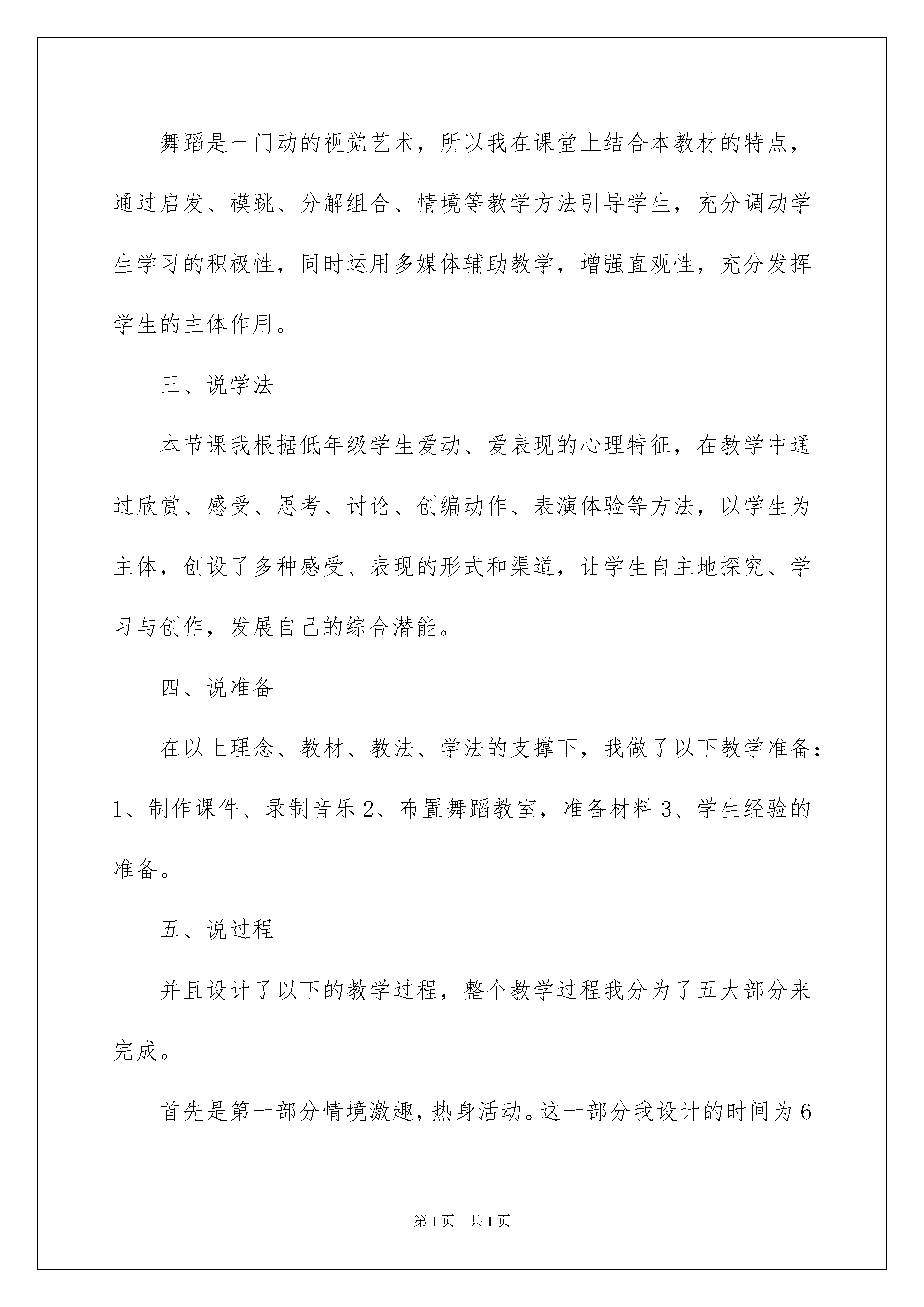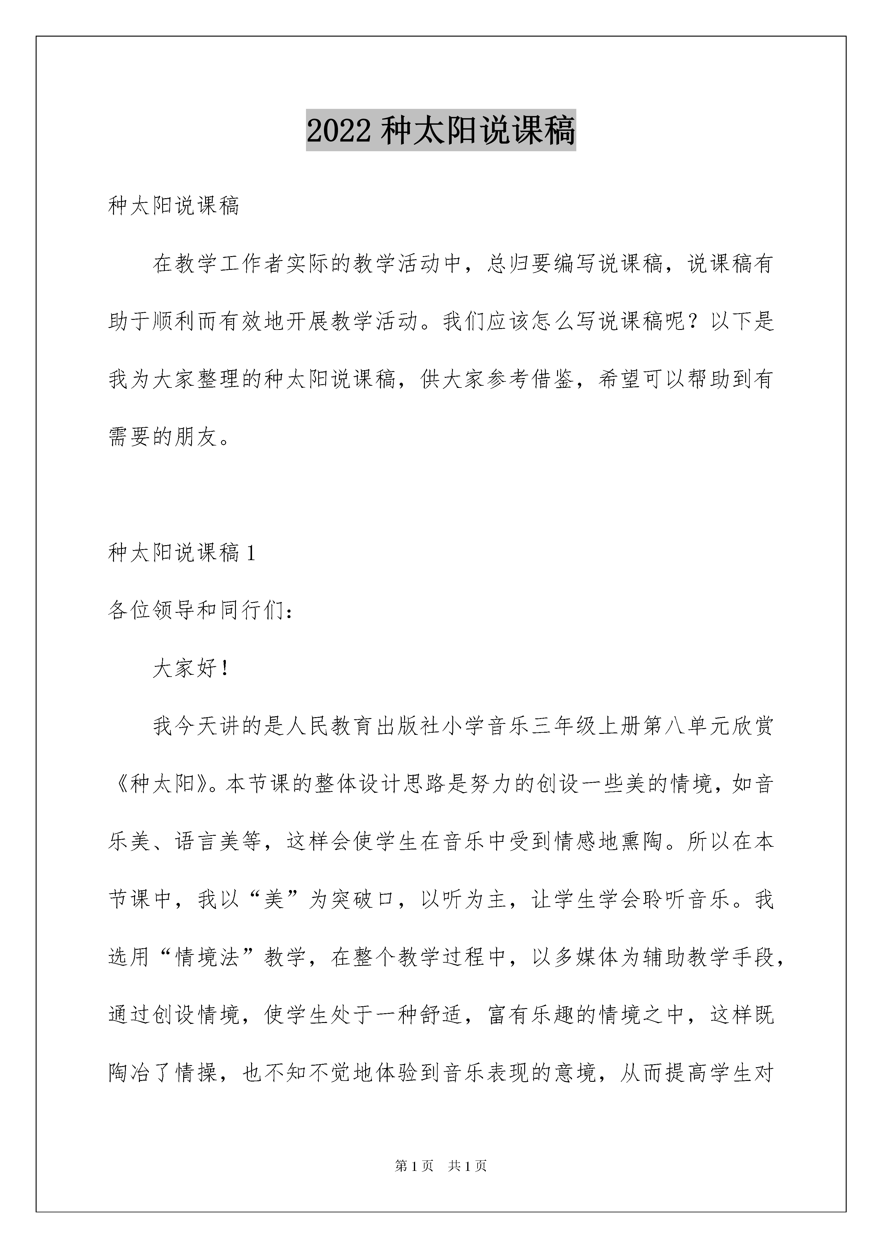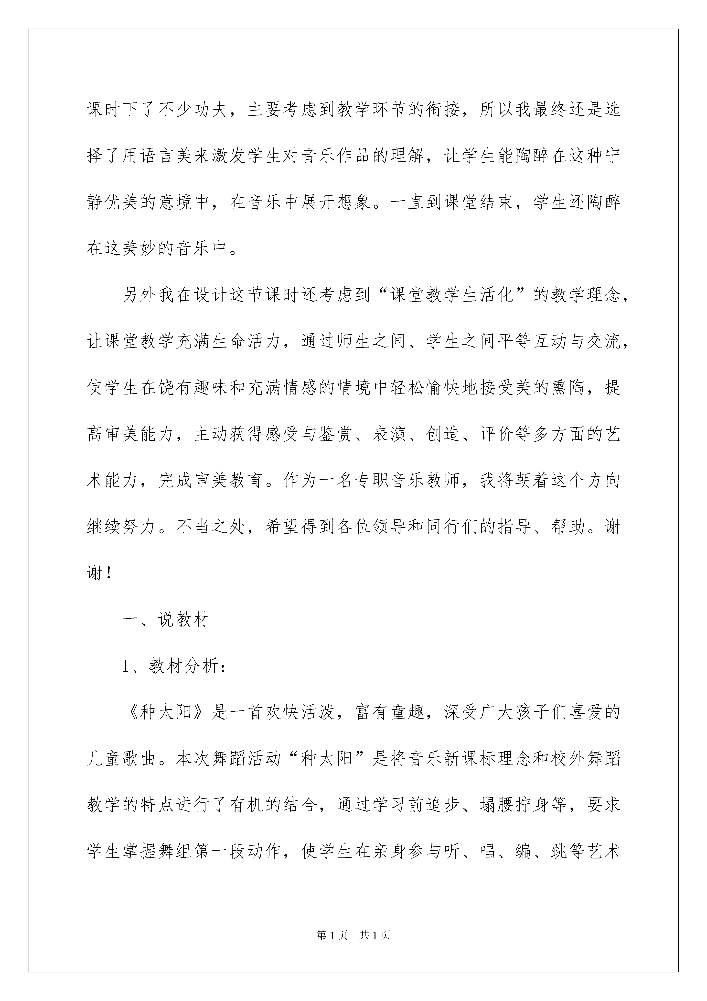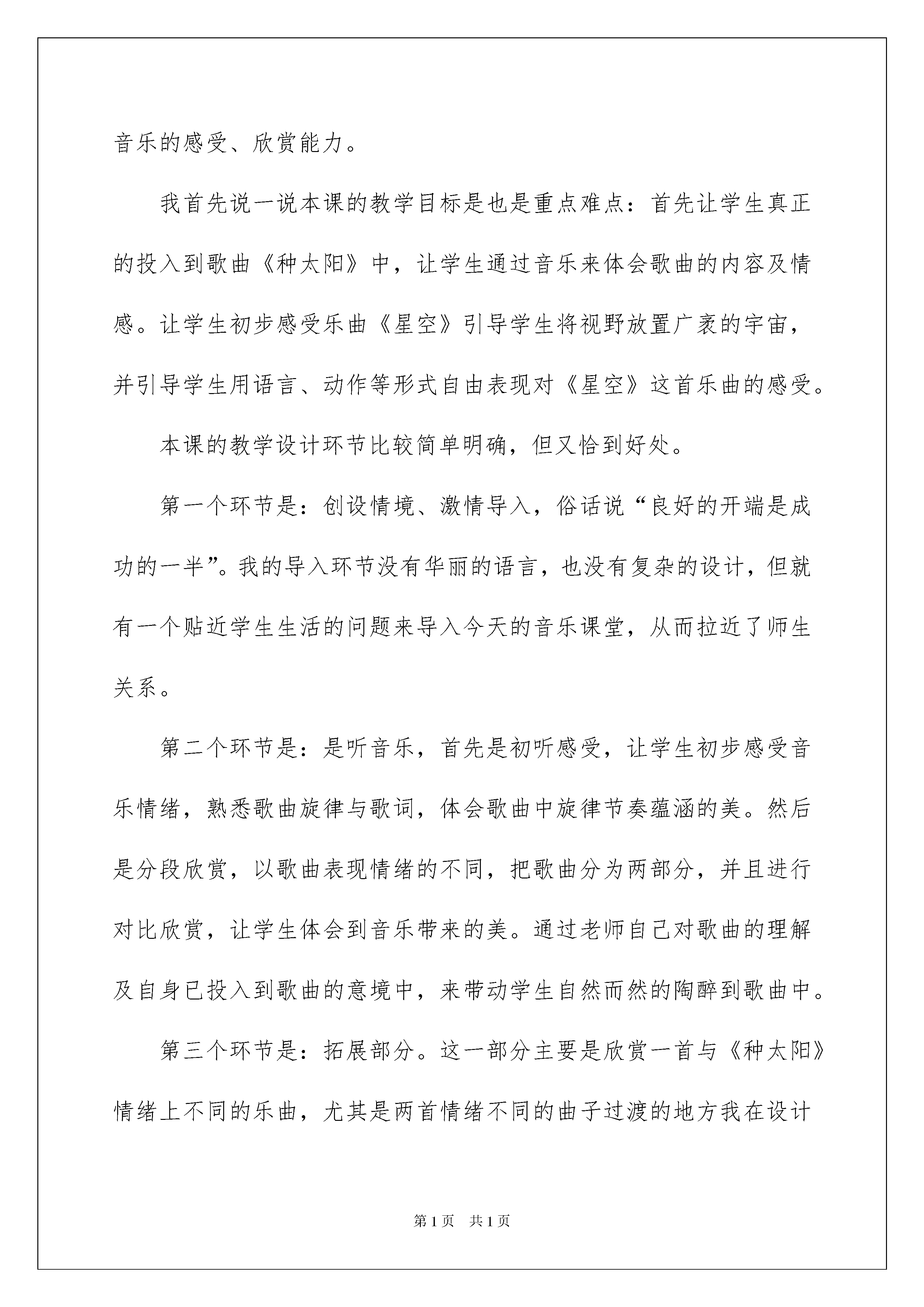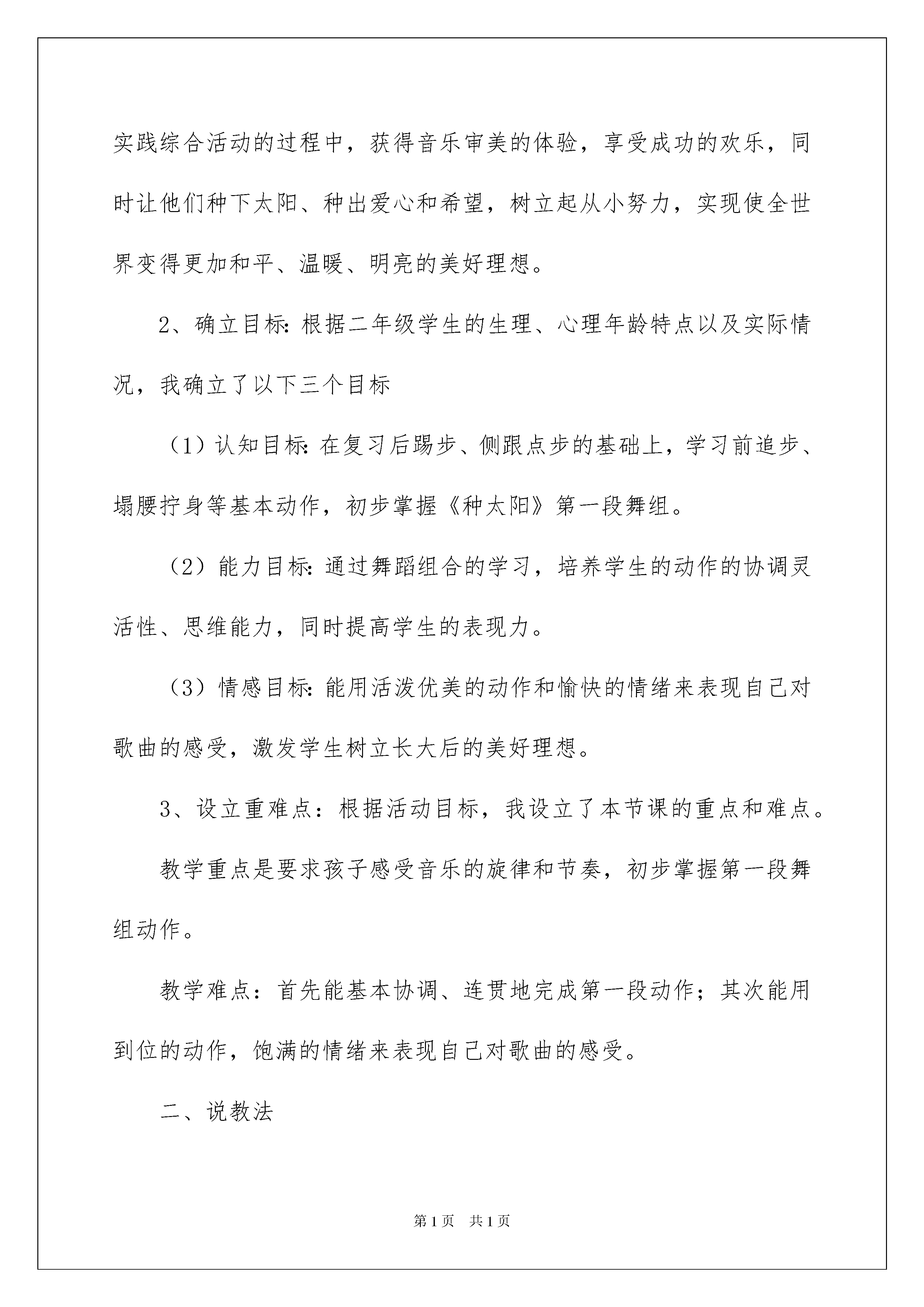 2022种太阳说课稿种太阳说课稿在教学工作者实际的教学活动中,总归要编写说课稿,说课稿有助于顺利而有效地开展教学活动。我们应该怎么写说课稿呢?以下是我为大家整理的种太阳说课稿,供大家参考借鉴,希望可以帮助到有需要的朋友。种太阳说课稿1各位领导和同行们:大家好!我今天讲的是人民教育出版社小学音乐三年级上册第八单元欣赏《种太阳》。本节课的整体设计思路是努力的创设一些美的情境,如音乐美、语言美等,这样会使学生在音乐中受到情感地熏陶。所以在本节课中,我以“美”为突破口,以听为主,让学生学会聆听音乐。我选用“情境法”教学,在整个教学过程中,以多媒体为辅助教学手段,通过创设情境,使学生处于一种舒适,富有乐趣的情境之中,这样既陶冶了情操,也不知不觉地体验到音乐表现的意境,从而提高学生对音乐的感受、欣赏能力。我首先说一说本课的教学目标是也是重点难点:首先让学生真正的投入到歌曲《种太阳》中,让学生通过音乐来体会歌曲的内容及情感。让学生初步感受乐曲《星空》引导学生将视野放置广袤的宇宙,并引导学生用语言、动作等形式自由表现对《星空》这首乐曲的感受。本课的教学设计环节比较简单明确,但又恰到好处。第一个环节是:创设情境、激情导入,俗话说“良好的开端是成功的一半”。我的导入环节没有华丽的语言,也没有复杂的设计,但就有一个贴近学生生活的问题来导入今天的音乐课堂,从而拉近了师生关系。第二个环节是:是听音乐,首先是初听感受,让学生初步感受音乐情绪,熟悉歌曲旋律与歌词,体会歌曲中旋律节奏蕴涵的美。然后是分段欣赏,以歌曲表现情绪的不同,把歌曲分为两部分,并且进行对比欣赏,让学生体会到音乐带来的美。通过老师自己对歌曲的理解及自身已投入到歌曲的意境中,来带动学生自然而然的陶醉到歌曲中。第三个环节是:拓展部分。这一部分主要是欣赏一首与《种太阳》情绪上不同的乐曲,尤其是两首情绪不同的曲子过渡的地方我在设计课时下了不少功夫,主要考虑到教学环节的衔接,所以我最终还是选择了用语言美来激发学生对音乐作品的理解,让学生能陶醉在这种宁静优美的意境中,在音乐中展开想象。一直到课堂结束,学生还陶醉在这美妙的音乐中。另外我在设计这节课时还考虑到“课堂教学生活化”的教学理念,让课堂教学充满生命活力,通过师生之间、学生之间平等互动与交流,使学生在饶有趣味和充满情感的情境中轻松愉快地接受美的熏陶,提高审美能力,主动获得感受与鉴赏、表演、创造、评价等多方面的艺术能力,完成审美教育。作为一名专职音乐教师,我将朝着这个方向继续努力。不当之处,希望得到各位领导和同行们的指导、帮助。谢谢!一、说教材1、教材分析:《种太阳》是一首欢快活泼,富有童趣,深受广大孩子们喜爱的儿童歌曲。本次舞蹈活动“种太阳”是将音乐新课标理念和校外舞蹈教学的特点进行了有机的结合,通过学习前追步、塌腰拧身等,要求学生掌握舞组第一段动作,使学生在亲身参与听、唱、编、跳等艺术实践综合活动的过程中,获得音乐审美的体验,享受成功的欢乐,同时让他们种下太阳、种出爱心和希望,树立起从小努力,实现使全世界变得更加和平、温暖、明亮的美好理想。2、确立目标:根据二年级学生的生理、心理年龄特点以及实际情况,我确立了以下三个目标(1)认知目标:在复习后踢步、侧跟点步的基础上,学习前追步、塌腰拧身等基本动作,初步掌握《种太阳》第一段舞组。(2)能力目标:通过舞蹈组合的学习,培养学生的动作的协调灵活性、思维能力,同时提高学生的表现力。(3)情感目标:能用活泼优美的动作和愉快的情绪来表现自己对歌曲的感受,激发学生树立长大后的美好理想。3、设立重难点:根据活动目标,我设立了本节课的重点和难点。教学重点是要求孩子感受音乐的旋律和节奏,初步掌握第一段舞组动作。教学难点:首先能基本协调、连贯地完成第一段动作;其次能用到位的动作,饱满的情绪来表现自己对歌曲的感受。二、说教法舞蹈是一门动的视觉艺术,所以我在课堂上结合本教材的特点,通过启发、模跳、分解组合、情境等教学方法引导学生,充分调动学生学习的积极性,同时运用多媒体辅助教学,增强直观性,充分发挥学生的主体作用。三、说学法本节课我根据低年级学生爱动、爱表现的心理特征,在教学中通过欣赏、感受、思考、讨论、创编动作、表演体验等方法,以学生为主体,创设了多种感受、表现的形式和渠道,让学生自主地探究、学习与创作,发展自己的综合潜能。四、说准备在以上理念、教材、教法、学法的支撑下,我做了以下教学准备:1、制作课件、录制音乐2、布置舞蹈教室,准备材料3、学生经验的准备。五、说过程并且设计了以下的教学过程,整个教学过程我分为了五大部分来完成。首先是第一部分情境激趣,热身活动。这一
