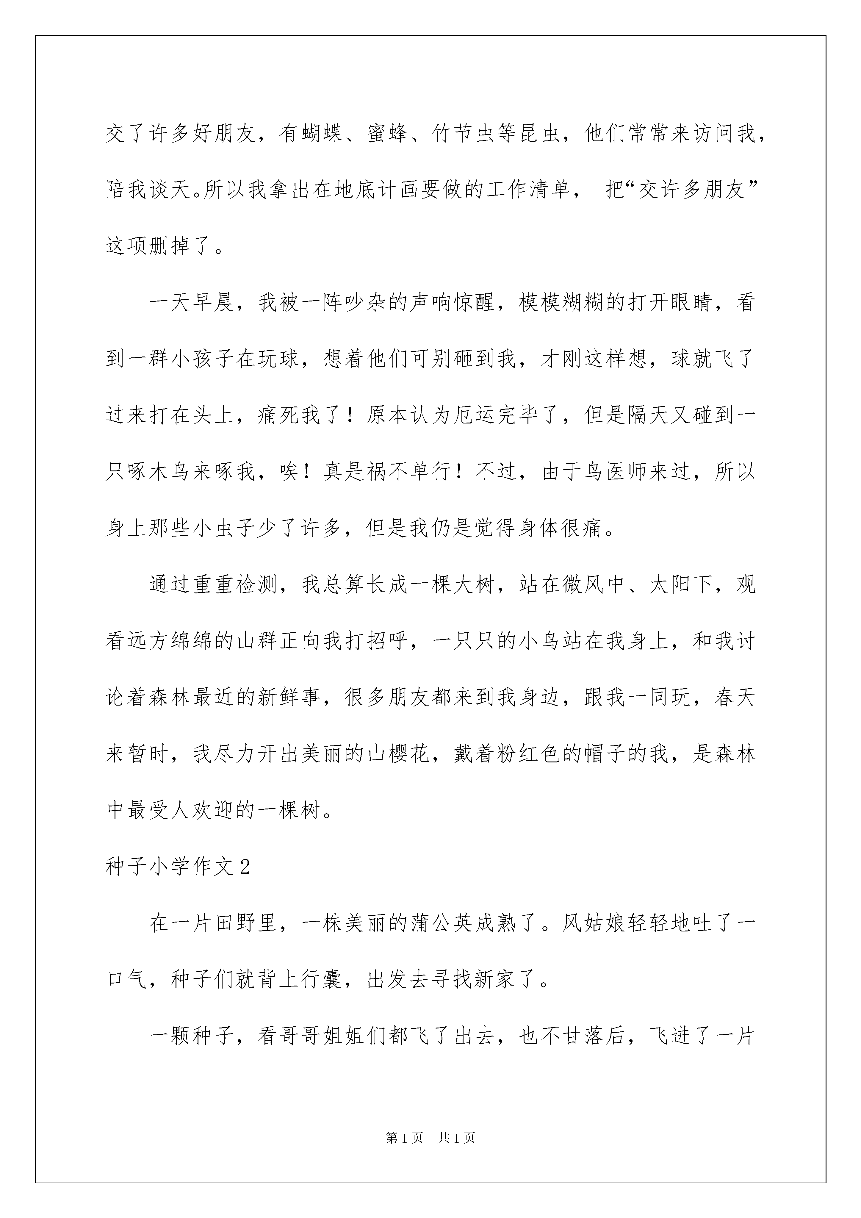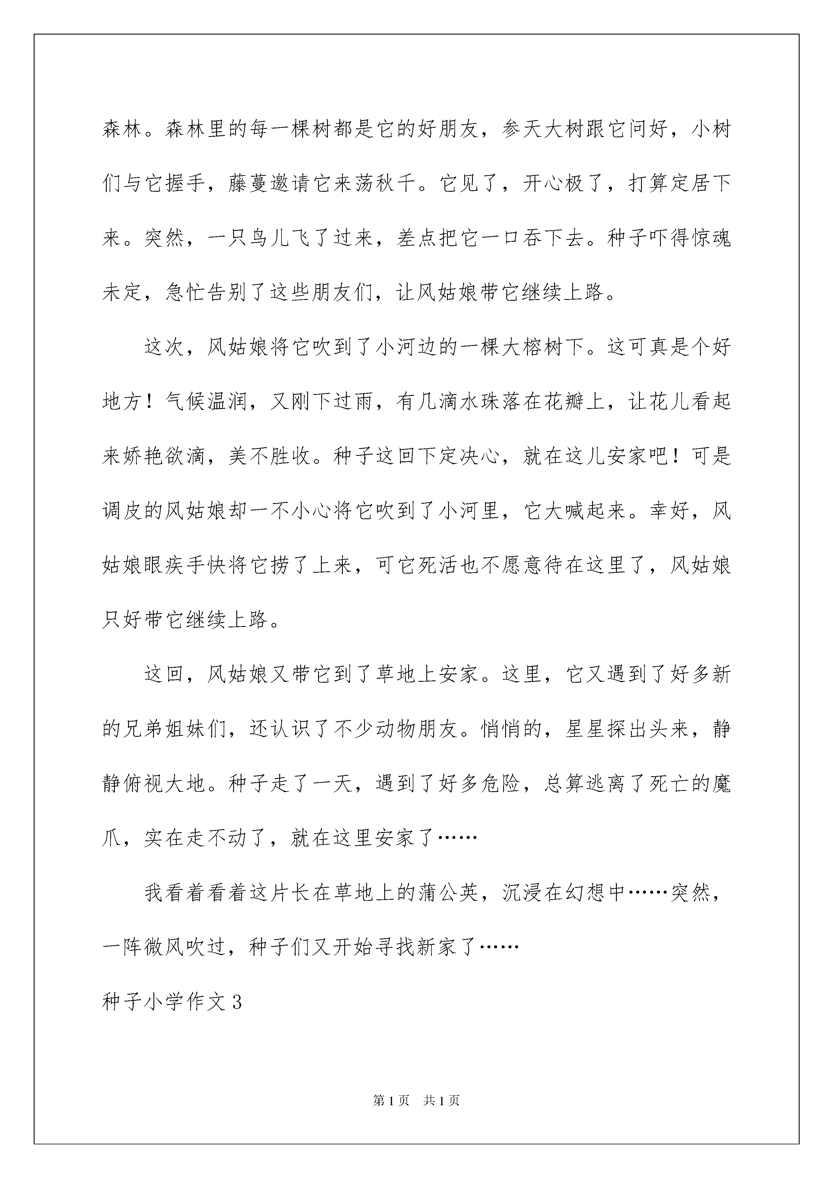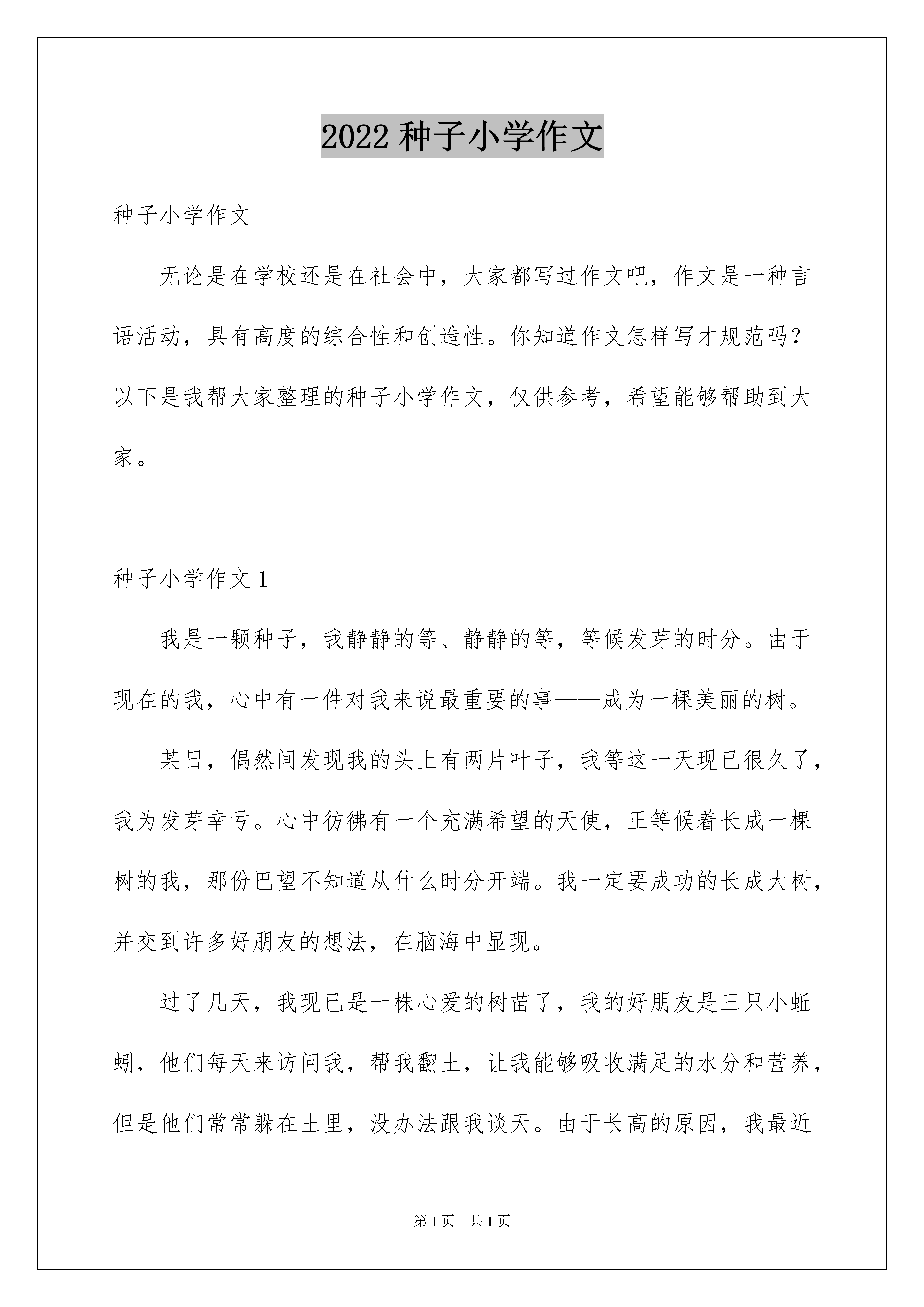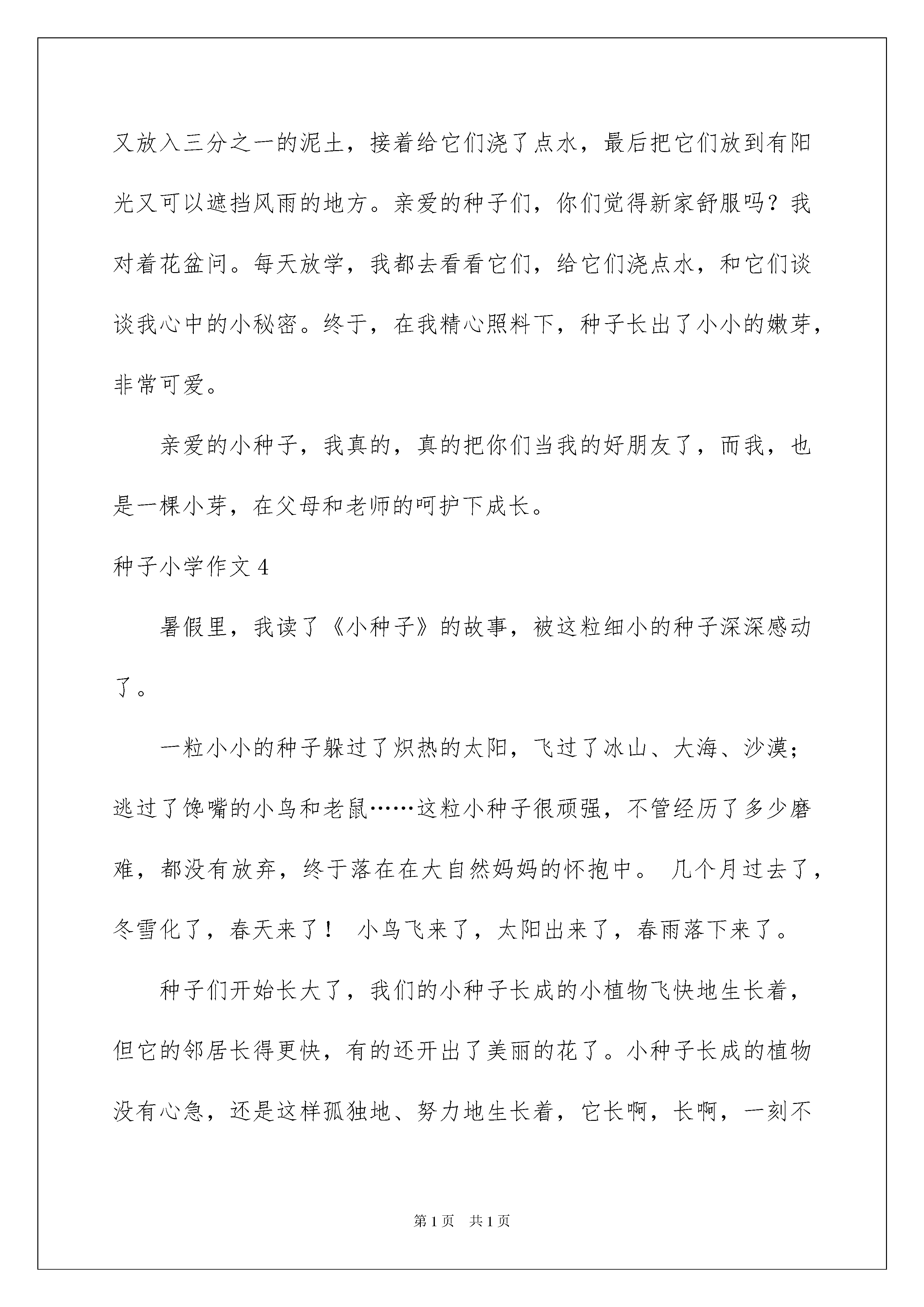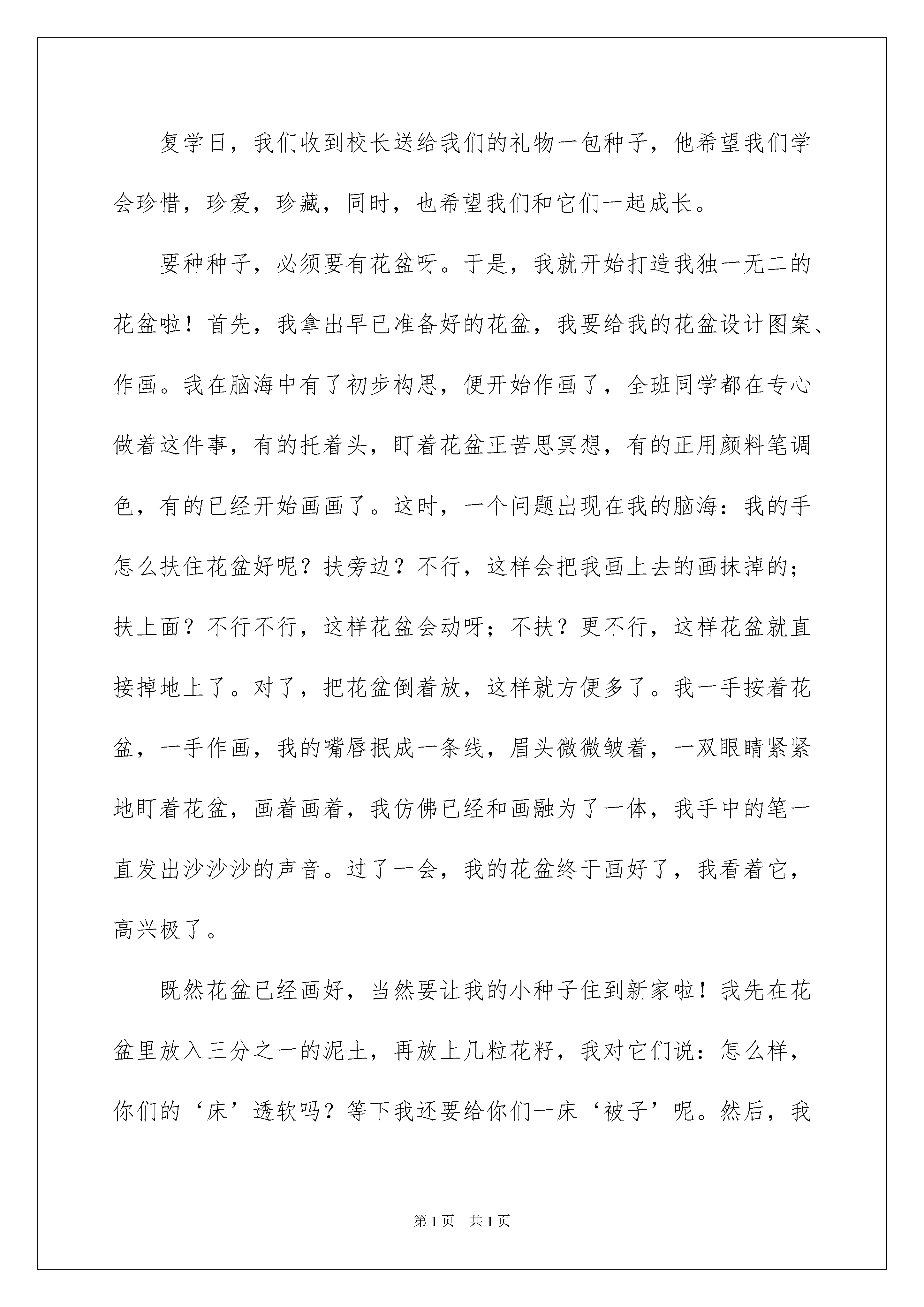 2022种子小学作文种子小学作文无论是在学校还是在社会中,大家都写过作文吧,作文是一种言语活动,具有高度的综合性和创造性。你知道作文怎样写才规范吗?以下是我帮大家整理的种子小学作文,仅供参考,希望能够帮助到大家。种子小学作文1我是一颗种子,我静静的等、静静的等,等候发芽的时分。由于现在的我,心中有一件对我来说最重要的事——成为一棵美丽的树。某日,偶然间发现我的头上有两片叶子,我等这一天现已很久了,我为发芽幸亏。心中彷彿有一个充满希望的天使,正等候着长成一棵树的我,那份巴望不知道从什么时分开端。我一定要成功的长成大树,并交到许多好朋友的想法,在脑海中显现。过了几天,我现已是一株心爱的树苗了,我的好朋友是三只小蚯蚓,他们每天来访问我,帮我翻土,让我能够吸收满足的水分和营养,但是他们常常躲在土里,没办法跟我谈天。由于长高的原因,我最近交了许多好朋友,有蝴蝶、蜜蜂、竹节虫等昆虫,他们常常来访问我,陪我谈天。所以我拿出在地底计画要做的工作清单,把“交许多朋友”这项删掉了。一天早晨,我被一阵吵杂的声响惊醒,模模糊糊的打开眼睛,看到一群小孩子在玩球,想着他们可别砸到我,才刚这样想,球就飞了过来打在头上,痛死我了!原本认为厄运完毕了,但是隔天又碰到一只啄木鸟来啄我,唉!真是祸不单行!不过,由于鸟医师来过,所以身上那些小虫子少了许多,但是我仍是觉得身体很痛。通过重重检测,我总算长成一棵大树,站在微风中、太阳下,观看远方绵绵的山群正向我打招呼,一只只的小鸟站在我身上,和我讨论着森林最近的新鲜事,很多朋友都来到我身边,跟我一同玩,春天来暂时,我尽力开出美丽的山樱花,戴着粉红色的帽子的我,是森林中最受人欢迎的一棵树。种子小学作文2在一片田野里,一株美丽的蒲公英成熟了。风姑娘轻轻地吐了一口气,种子们就背上行囊,出发去寻找新家了。一颗种子,看哥哥姐姐们都飞了出去,也不甘落后,飞进了一片森林。森林里的每一棵树都是它的好朋友,参天大树跟它问好,小树们与它握手,藤蔓邀请它来荡秋千。它见了,开心极了,打算定居下来。突然,一只鸟儿飞了过来,差点把它一口吞下去。种子吓得惊魂未定,急忙告别了这些朋友们,让风姑娘带它继续上路。这次,风姑娘将它吹到了小河边的一棵大榕树下。这可真是个好地方!气候温润,又刚下过雨,有几滴水珠落在花瓣上,让花儿看起来娇艳欲滴,美不胜收。种子这回下定决心,就在这儿安家吧!可是调皮的风姑娘却一不小心将它吹到了小河里,它大喊起来。幸好,风姑娘眼疾手快将它捞了上来,可它死活也不愿意待在这里了,风姑娘只好带它继续上路。这回,风姑娘又带它到了草地上安家。这里,它又遇到了好多新的兄弟姐妹们,还认识了不少动物朋友。悄悄的,星星探出头来,静静俯视大地。种子走了一天,遇到了好多危险,总算逃离了死亡的魔爪,实在走不动了,就在这里安家了……我看着看着这片长在草地上的蒲公英,沉浸在幻想中……突然,一阵微风吹过,种子们又开始寻找新家了……种子小学作文3复学日,我们收到校长送给我们的礼物一包种子,他希望我们学会珍惜,珍爱,珍藏,同时,也希望我们和它们一起成长。要种种子,必须要有花盆呀。于是,我就开始打造我独一无二的花盆啦!首先,我拿出早已准备好的花盆,我要给我的花盆设计图案、作画。我在脑海中有了初步构思,便开始作画了,全班同学都在专心做着这件事,有的托着头,盯着花盆正苦思冥想,有的正用颜料笔调色,有的已经开始画画了。这时,一个问题出现在我的脑海:我的手怎么扶住花盆好呢?扶旁边?不行,这样会把我画上去的画抹掉的;扶上面?不行不行,这样花盆会动呀;不扶?更不行,这样花盆就直接掉地上了。对了,把花盆倒着放,这样就方便多了。我一手按着花盆,一手作画,我的嘴唇抿成一条线,眉头微微皱着,一双眼睛紧紧地盯着花盆,画着画着,我仿佛已经和画融为了一体,我手中的笔一直发出沙沙沙的声音。过了一会,我的花盆终于画好了,我看着它,高兴极了。既然花盆已经画好,当然要让我的小种子住到新家啦!我先在花盆里放入三分之一的泥土,再放上几粒花籽,我对它们说:怎么样,你们的‘床’透软吗?等下我还要给你们一床‘被子’呢。然后,我又放入三分之一的泥土,接着给它们浇了点水,最后把它们放到有阳光又可以遮挡风雨的地方。亲爱的种子们,你们觉得新家舒服吗?我对着花盆问。每天放学,我都去看看它们,给它们浇点水,和它们谈谈我心中的小秘密。终于,在我精心照料下,种子长出了小小的嫩芽,非常可爱。亲爱的小种子,我真的,真的把你们当我的好朋友了,而我,也是一棵小芽,在父母和老师的呵护下成长。种子小学作文4暑假里,我读了《小种子》的故事,被这粒细小的种子深深感动了。一粒小小的种子躲过了