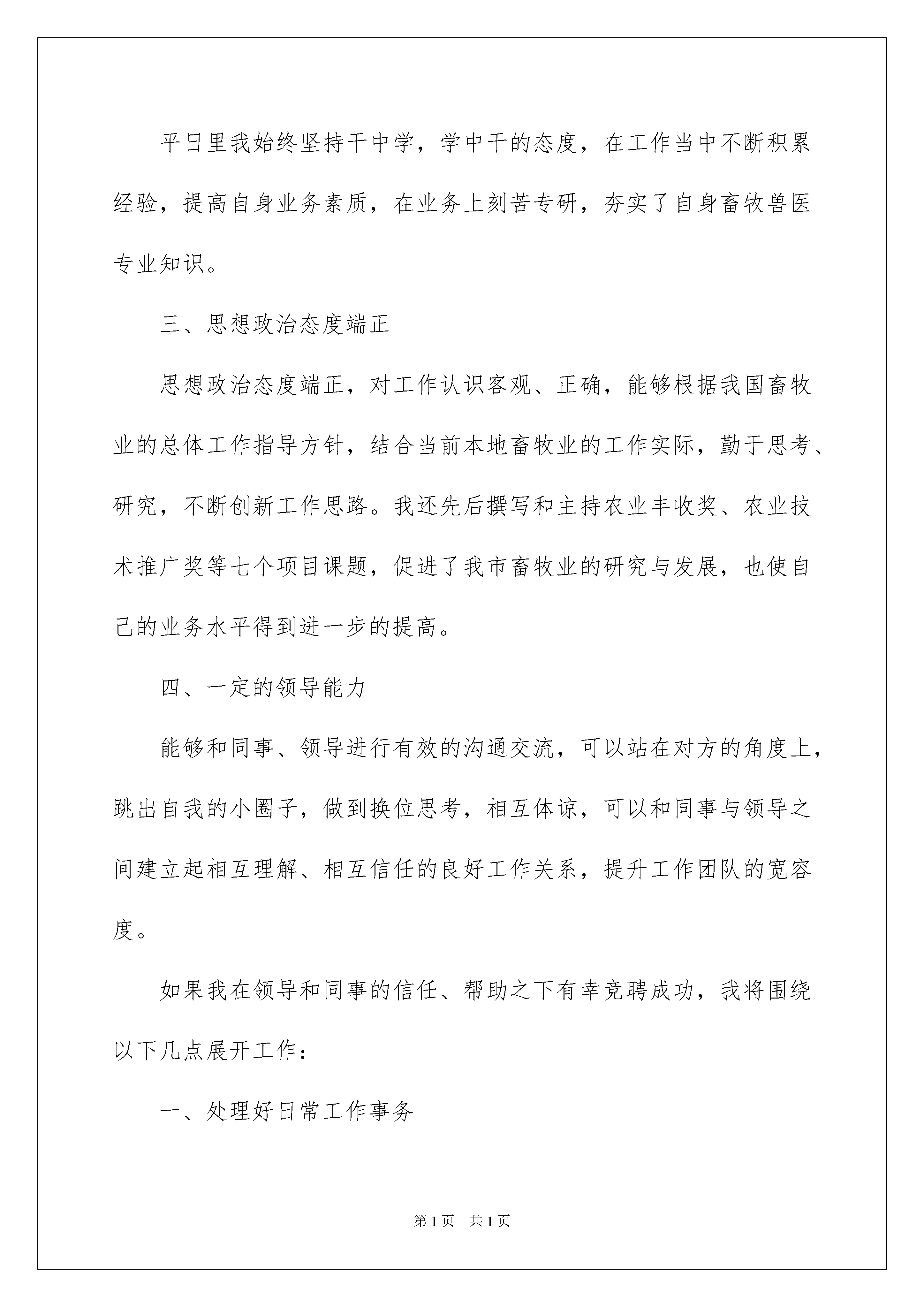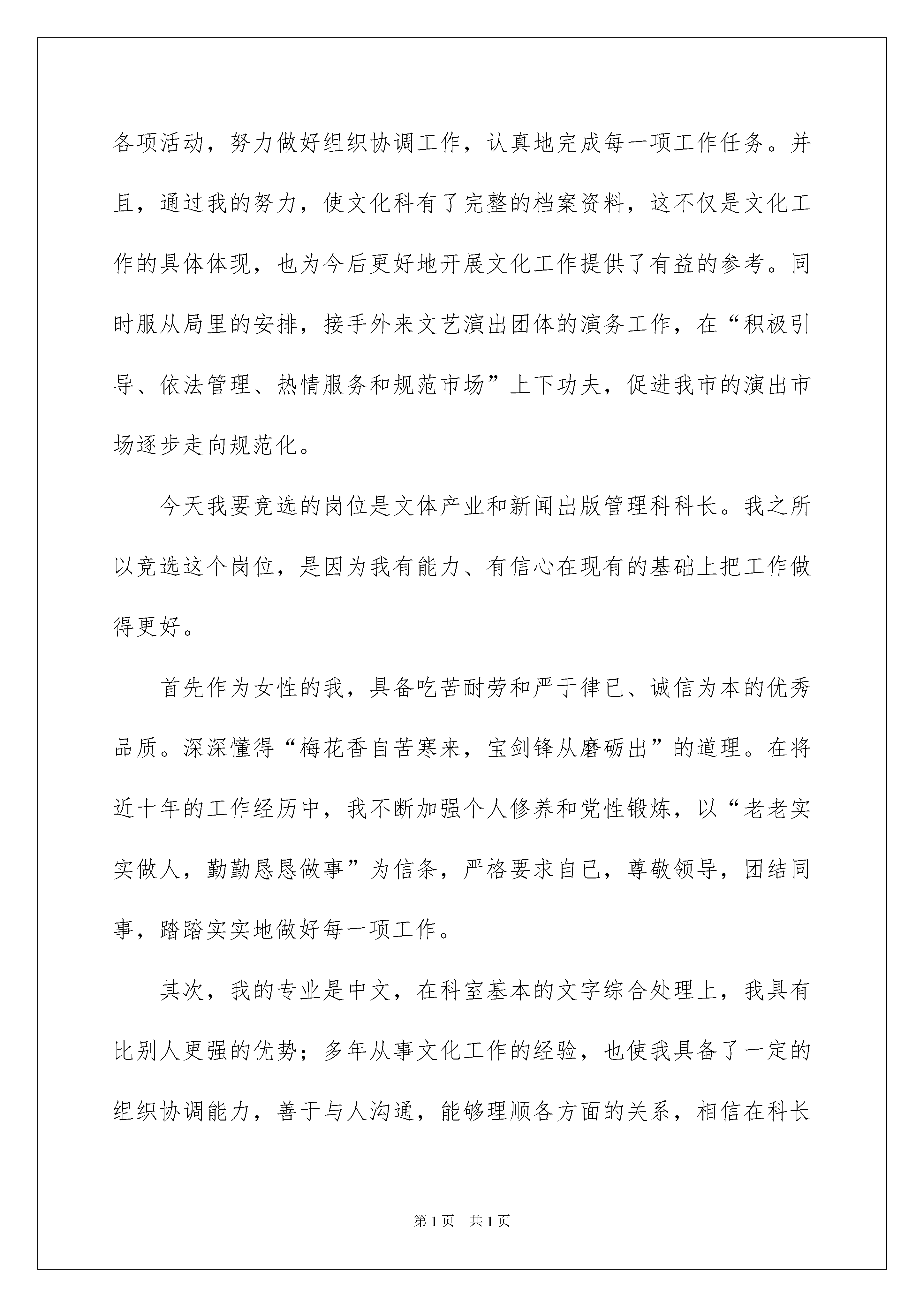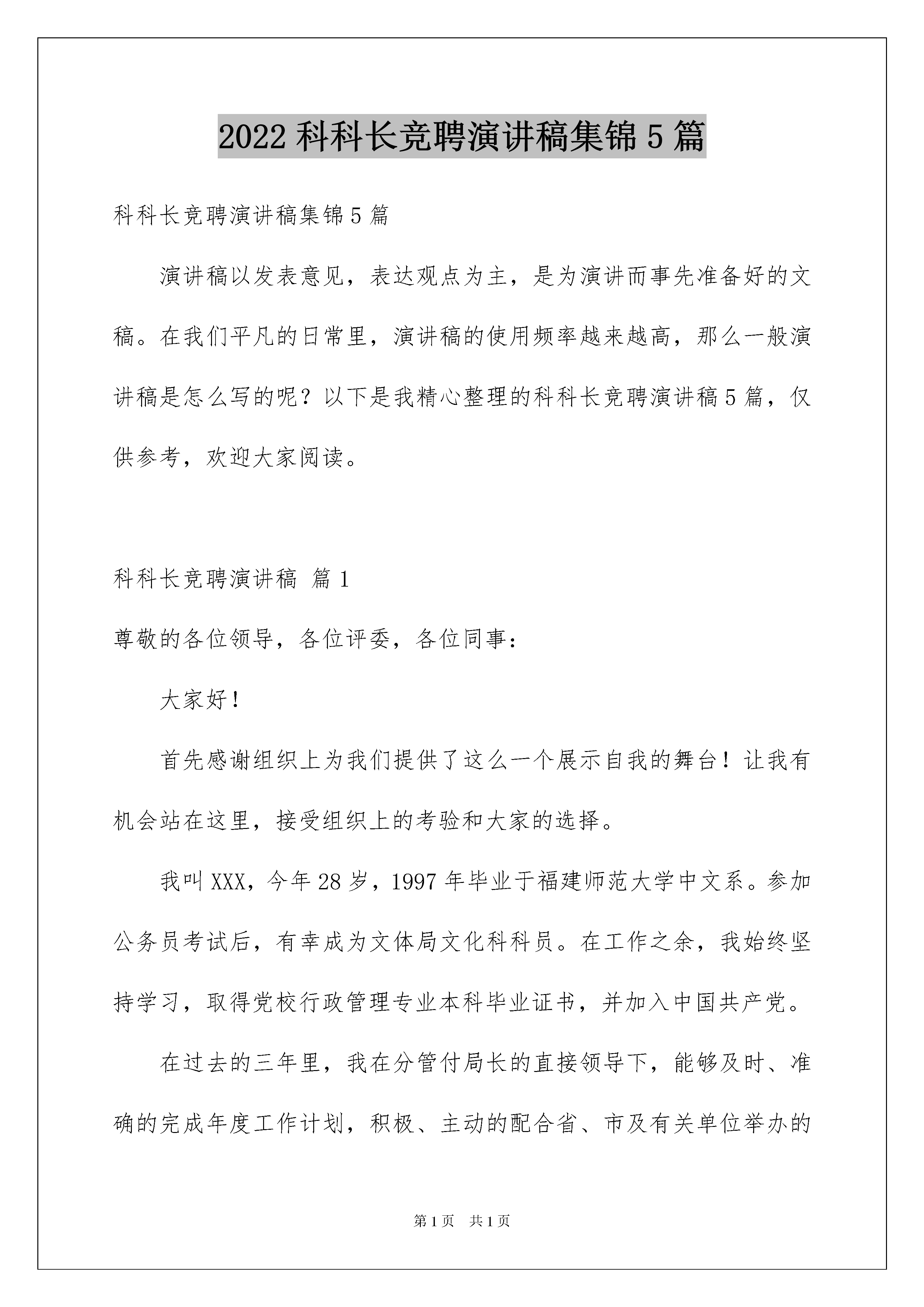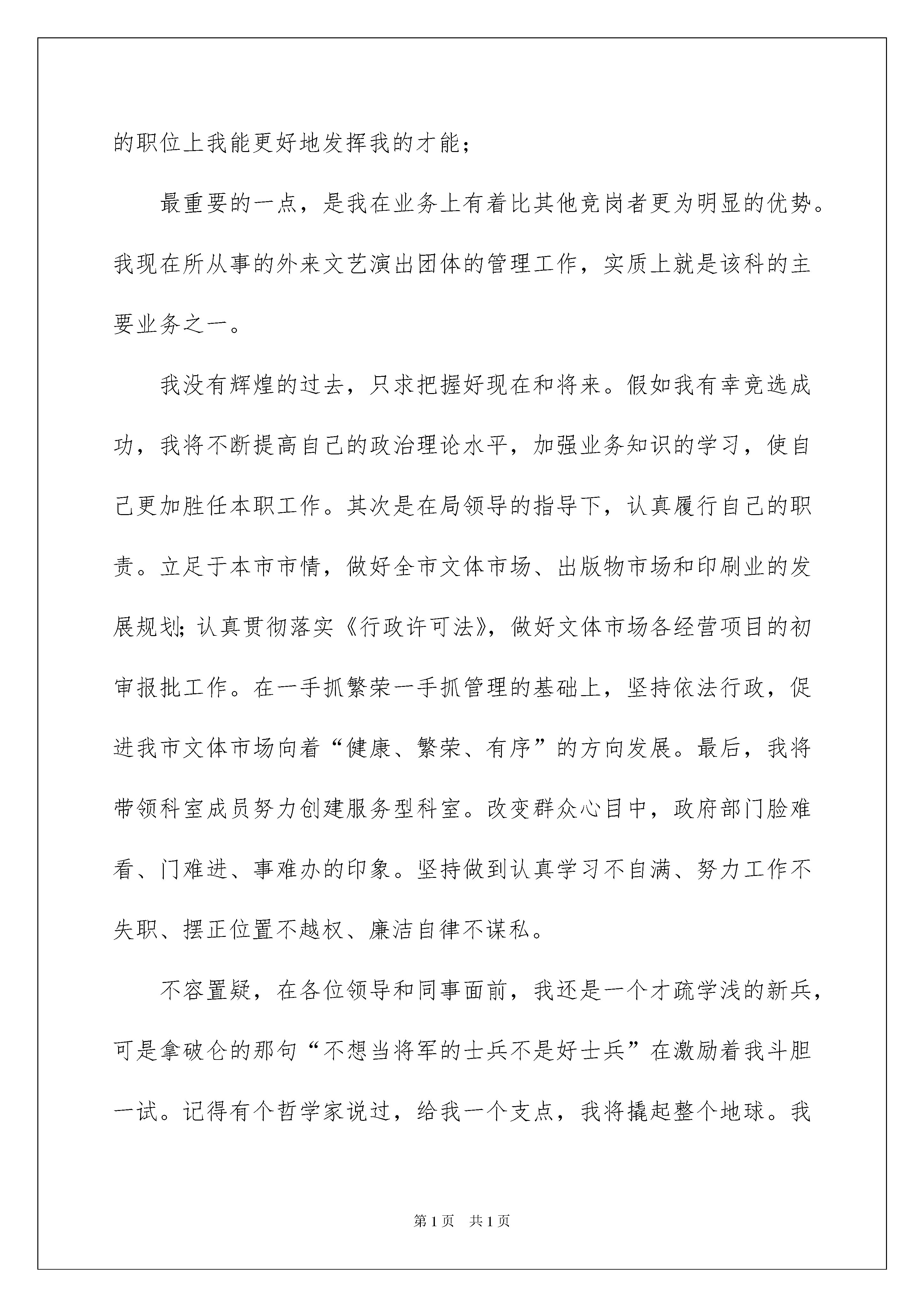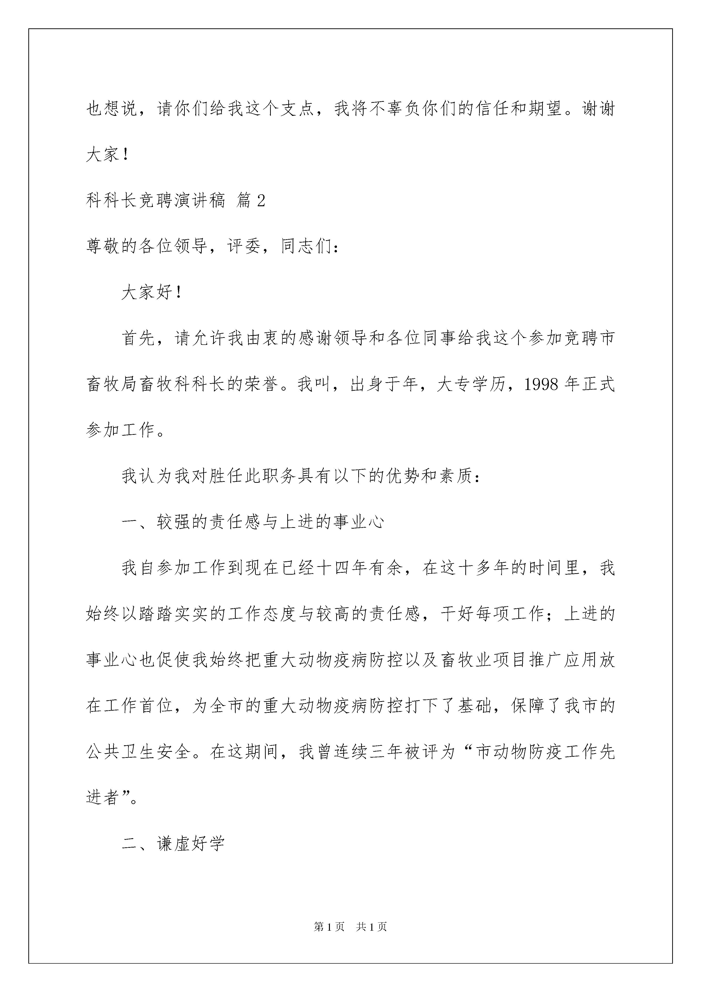 2022科科长竞聘演讲稿集锦5篇科科长竞聘演讲稿集锦5篇演讲稿以发表意见,表达观点为主,是为演讲而事先准备好的文稿。在我们平凡的日常里,演讲稿的使用频率越来越高,那么一般演讲稿是怎么写的呢?以下是我精心整理的科科长竞聘演讲稿5篇,仅供参考,欢迎大家阅读。科科长竞聘演讲稿篇1尊敬的各位领导,各位评委,各位同事:大家好!首先感谢组织上为我们提供了这么一个展示自我的舞台!让我有机会站在这里,接受组织上的考验和大家的选择。我叫XXX,今年28岁,1997年毕业于福建师范大学中文系。参加公务员考试后,有幸成为文体局文化科科员。在工作之余,我始终坚持学习,取得党校行政管理专业本科毕业证书,并加入中国共产党。在过去的三年里,我在分管付局长的直接领导下,能够及时、准确的完成年度工作计划,积极、主动的配合省、市及有关单位举办的各项活动,努力做好组织协调工作,认真地完成每一项工作任务。并且,通过我的努力,使文化科有了完整的档案资料,这不仅是文化工作的具体体现,也为今后更好地开展文化工作提供了有益的参考。同时服从局里的安排,接手外来文艺演出团体的演务工作,在“积极引导、依法管理、热情服务和规范市场”上下功夫,促进我市的演出市场逐步走向规范化。今天我要竞选的岗位是文体产业和新闻出版管理科科长。我之所以竞选这个岗位,是因为我有能力、有信心在现有的基础上把工作做得更好。首先作为女性的我,具备吃苦耐劳和严于律已、诚信为本的优秀品质。深深懂得“梅花香自苦寒来,宝剑锋从磨砺出”的道理。在将近十年的工作经历中,我不断加强个人修养和党性锻炼,以“老老实实做人,勤勤恳恳做事”为信条,严格要求自已,尊敬领导,团结同事,踏踏实实地做好每一项工作。其次,我的专业是中文,在科室基本的文字综合处理上,我具有比别人更强的优势;多年从事文化工作的经验,也使我具备了一定的组织协调能力,善于与人沟通,能够理顺各方面的关系,相信在科长的职位上我能更好地发挥我的才能;最重要的一点,是我在业务上有着比其他竞岗者更为明显的优势。我现在所从事的外来文艺演出团体的管理工作,实质上就是该科的主要业务之一。我没有辉煌的过去,只求把握好现在和将来。假如我有幸竞选成功,我将不断提高自己的政治理论水平,加强业务知识的学习,使自己更加胜任本职工作。其次是在局领导的指导下,认真履行自己的职责。立足于本市市情,做好全市文体市场、出版物市场和印刷业的发展规划;认真贯彻落实《行政许可法》,做好文体市场各经营项目的初审报批工作。在一手抓繁荣一手抓管理的基础上,坚持依法行政,促进我市文体市场向着“健康、繁荣、有序”的方向发展。最后,我将带领科室成员努力创建服务型科室。改变群众心目中,政府部门脸难看、门难进、事难办的印象。坚持做到认真学习不自满、努力工作不失职、摆正位置不越权、廉洁自律不谋私。不容置疑,在各位领导和同事面前,我还是一个才疏学浅的新兵,可是拿破仑的那句“不想当将军的士兵不是好士兵”在激励着我斗胆一试。记得有个哲学家说过,给我一个支点,我将撬起整个地球。我也想说,请你们给我这个支点,我将不辜负你们的信任和期望。谢谢大家!科科长竞聘演讲稿篇2尊敬的各位领导,评委,同志们:大家好!首先,请允许我由衷的感谢领导和各位同事给我这个参加竞聘市畜牧局畜牧科科长的荣誉。我叫,出身于年,大专学历,1998年正式参加工作。我认为我对胜任此职务具有以下的优势和素质:一、较强的责任感与上进的事业心我自参加工作到现在已经十四年有余,在这十多年的时间里,我始终以踏踏实实的工作态度与较高的责任感,干好每项工作;上进的事业心也促使我始终把重大动物疫病防控以及畜牧业项目推广应用放在工作首位,为全市的重大动物疫病防控打下了基础,保障了我市的公共卫生安全。在这期间,我曾连续三年被评为“市动物防疫工作先进者”。二、谦虚好学平日里我始终坚持干中学,学中干的态度,在工作当中不断积累经验,提高自身业务素质,在业务上刻苦专研,夯实了自身畜牧兽医专业知识。三、思想政治态度端正思想政治态度端正,对工作认识客观、正确,能够根据我国畜牧业的总体工作指导方针,结合当前本地畜牧业的工作实际,勤于思考、研究,不断创新工作思路。我还先后撰写和主持农业丰收奖、农业技术推广奖等七个项目课题,促进了我市畜牧业的研究与发展,也使自己的业务水平得到进一步的提高。四、一定的领导能力能够和同事、领导进行有效的沟通交流,可以站在对方的角度上,跳出自我的小圈子,做到换位思考,相互体谅,可以和同事与领导之间建立起相互理解、相互信任的良好工作关系,提升工作团队的宽容度。如果我在领导和同事的信任、帮助之下有幸竞聘成功,我将围绕以下几点展开
