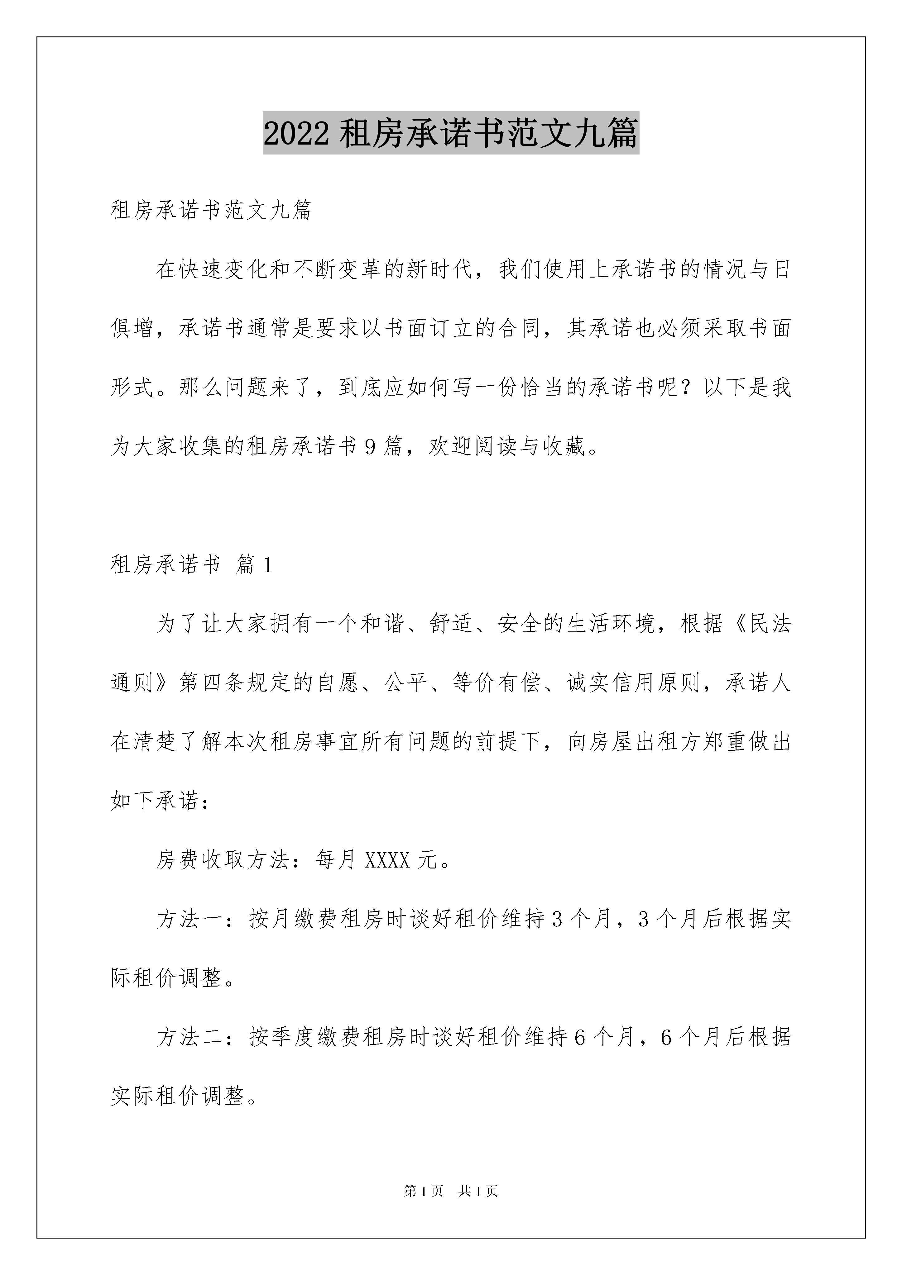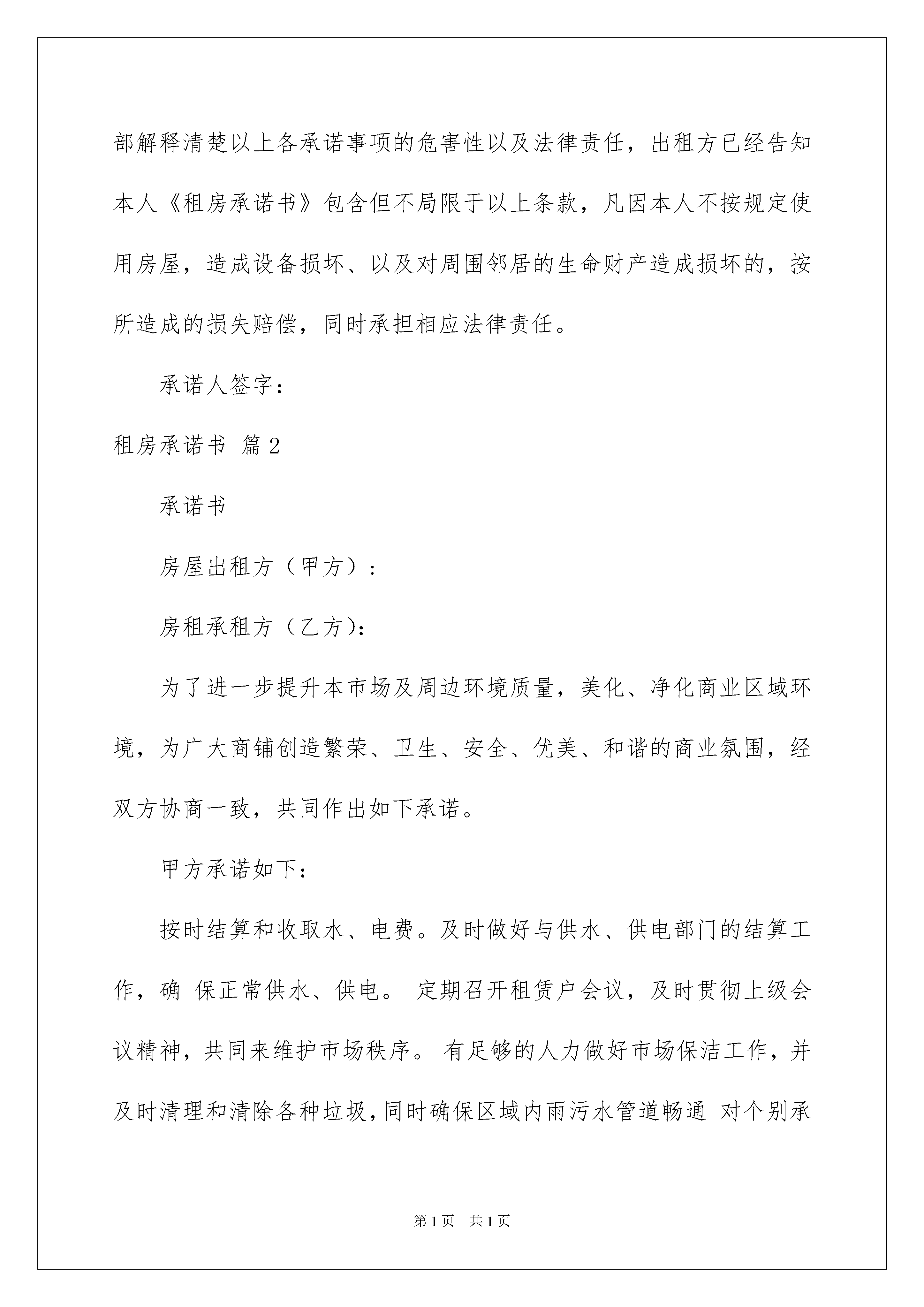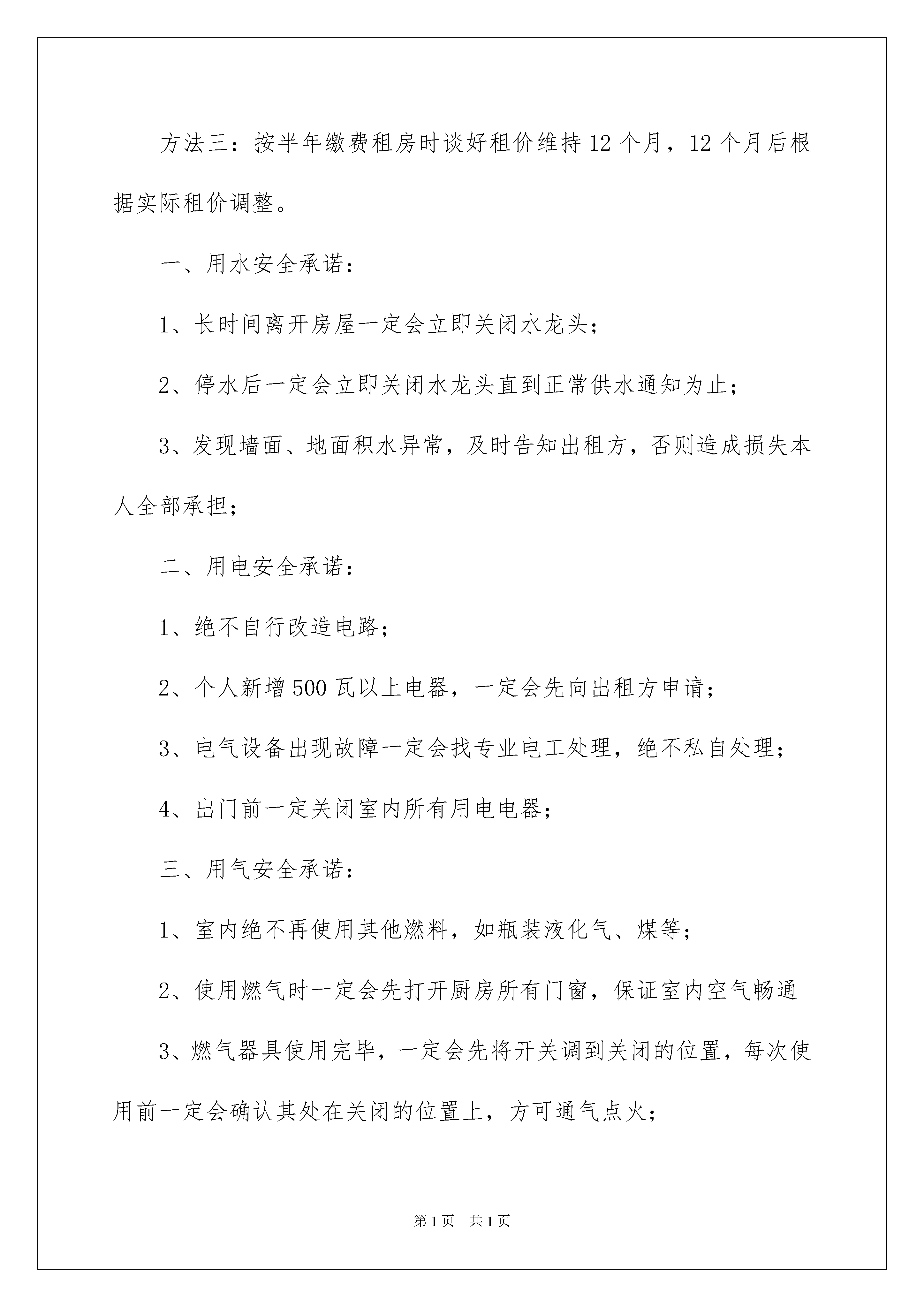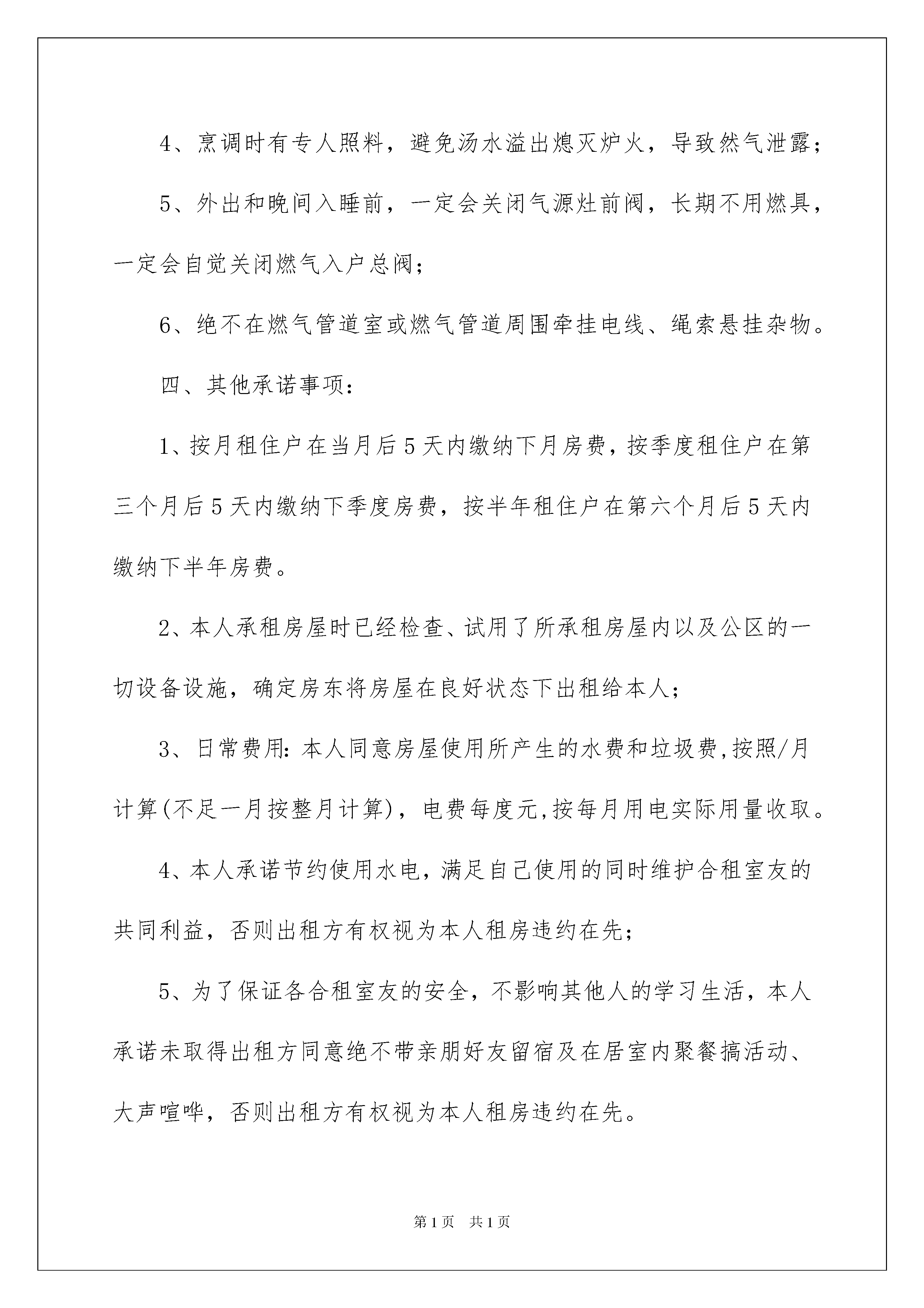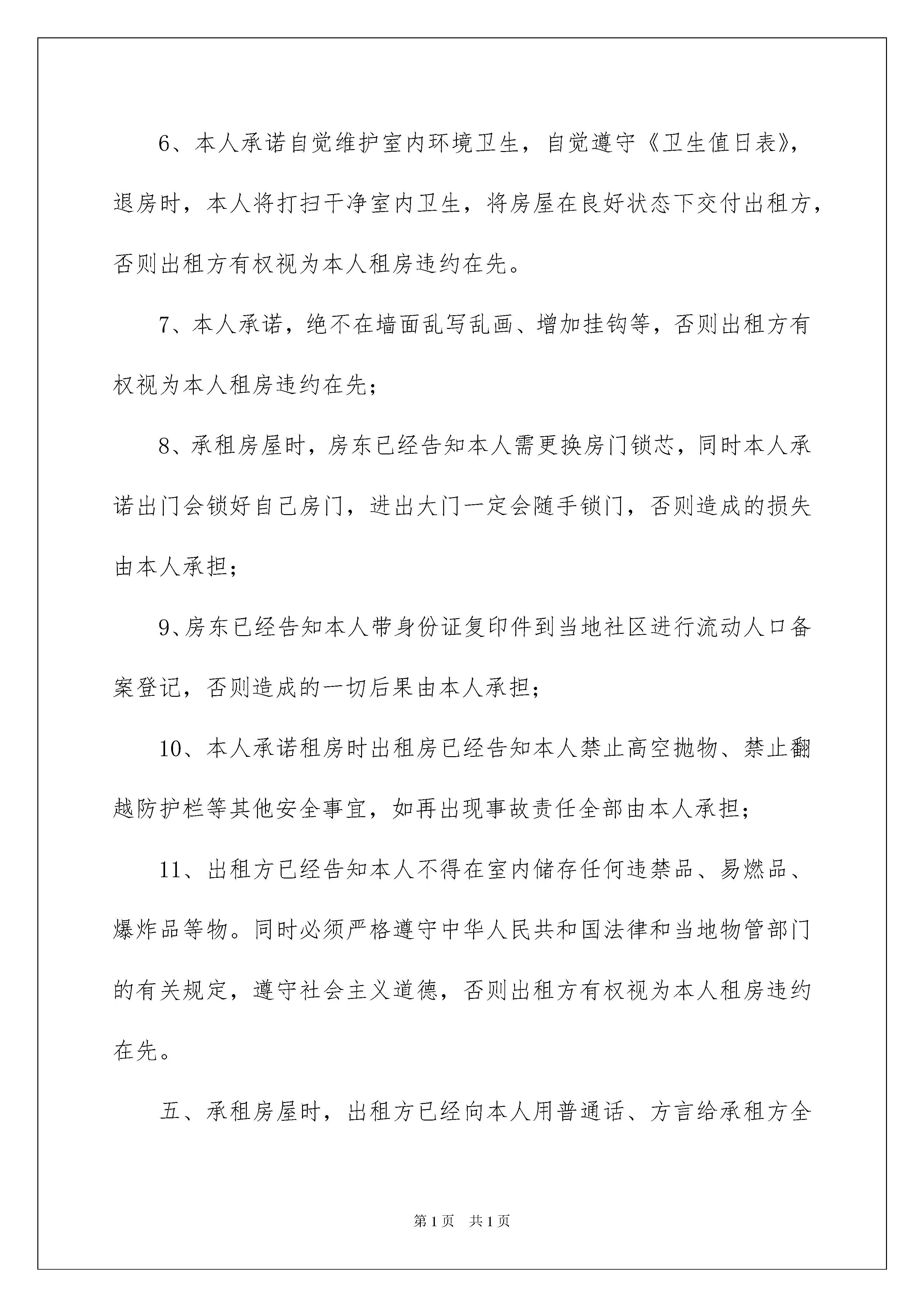 2022租房承诺书范文九篇租房承诺书范文九篇在快速变化和不断变革的新时代,我们使用上承诺书的情况与日俱增,承诺书通常是要求以书面订立的合同,其承诺也必须采取书面形式。那么问题来了,到底应如何写一份恰当的承诺书呢?以下是我为大家收集的租房承诺书9篇,欢迎阅读与收藏。租房承诺书篇1为了让大家拥有一个和谐、舒适、安全的生活环境,根据《民法通则》第四条规定的自愿、公平、等价有偿、诚实信用原则,承诺人在清楚了解本次租房事宜所有问题的前提下,向房屋出租方郑重做出如下承诺:房费收取方法:每月XXXX元。方法一:按月缴费租房时谈好租价维持3个月,3个月后根据实际租价调整。方法二:按季度缴费租房时谈好租价维持6个月,6个月后根据实际租价调整。方法三:按半年缴费租房时谈好租价维持12个月,12个月后根据实际租价调整。一、用水安全承诺:1、长时间离开房屋一定会立即关闭水龙头;2、停水后一定会立即关闭水龙头直到正常供水通知为止;3、发现墙面、地面积水异常,及时告知出租方,否则造成损失本人全部承担;二、用电安全承诺:1、绝不自行改造电路;2、个人新增500瓦以上电器,一定会先向出租方申请;3、电气设备出现故障一定会找专业电工处理,绝不私自处理;4、出门前一定关闭室内所有用电电器;三、用气安全承诺:1、室内绝不再使用其他燃料,如瓶装液化气、煤等;2、使用燃气时一定会先打开厨房所有门窗,保证室内空气畅通3、燃气器具使用完毕,一定会先将开关调到关闭的位置,每次使用前一定会确认其处在关闭的位置上,方可通气点火;4、烹调时有专人照料,避免汤水溢出熄灭炉火,导致然气泄露;5、外出和晚间入睡前,一定会关闭气源灶前阀,长期不用燃具,一定会自觉关闭燃气入户总阀;6、绝不在燃气管道室或燃气管道周围牵挂电线、绳索悬挂杂物。四、其他承诺事项:1、按月租住户在当月后5天内缴纳下月房费,按季度租住户在第三个月后5天内缴纳下季度房费,按半年租住户在第六个月后5天内缴纳下半年房费。2、本人承租房屋时已经检查、试用了所承租房屋内以及公区的一切设备设施,确定房东将房屋在良好状态下出租给本人;3、日常费用:本人同意房屋使用所产生的水费和垃圾费,按照/月计算(不足一月按整月计算),电费每度元,按每月用电实际用量收取。4、本人承诺节约使用水电,满足自己使用的同时维护合租室友的共同利益,否则出租方有权视为本人租房违约在先;5、为了保证各合租室友的安全,不影响其他人的学习生活,本人承诺未取得出租方同意绝不带亲朋好友留宿及在居室内聚餐搞活动、大声喧哗,否则出租方有权视为本人租房违约在先。6、本人承诺自觉维护室内环境卫生,自觉遵守《卫生值日表》,退房时,本人将打扫干净室内卫生,将房屋在良好状态下交付出租方,否则出租方有权视为本人租房违约在先。7、本人承诺,绝不在墙面乱写乱画、增加挂钩等,否则出租方有权视为本人租房违约在先;8、承租房屋时,房东已经告知本人需更换房门锁芯,同时本人承诺出门会锁好自己房门,进出大门一定会随手锁门,否则造成的损失由本人承担;9、房东已经告知本人带身份证复印件到当地社区进行流动人口备案登记,否则造成的一切后果由本人承担;10、本人承诺租房时出租房已经告知本人禁止高空抛物、禁止翻越防护栏等其他安全事宜,如再出现事故责任全部由本人承担;11、出租方已经告知本人不得在室内储存任何违禁品、易燃品、爆炸品等物。同时必须严格遵守中华人民共和国法律和当地物管部门的有关规定,遵守社会主义道德,否则出租方有权视为本人租房违约在先。五、承租房屋时,出租方已经向本人用普通话、方言给承租方全部解释清楚以上各承诺事项的危害性以及法律责任,出租方已经告知本人《租房承诺书》包含但不局限于以上条款,凡因本人不按规定使用房屋,造成设备损坏、以及对周围邻居的生命财产造成损坏的,按所造成的损失赔偿,同时承担相应法律责任。承诺人签字:租房承诺书篇2承诺书房屋出租方(甲方):房租承租方(乙方):为了进一步提升本市场及周边环境质量,美化、净化商业区域环境,为广大商铺创造繁荣、卫生、安全、优美、和谐的商业氛围,经双方协商一致,共同作出如下承诺。甲方承诺如下:按时结算和收取水、电费。及时做好与供水、供电部门的结算工作,确保正常供水、供电。定期召开租赁户会议,及时贯彻上级会议精神,共同来维护市场秩序。有足够的人力做好市场保洁工作,并及时清理和清除各种垃圾,同时确保区域内雨污水管道畅通对个别承租人,有违规行为的,如乱设广告牌、乱拉电线、门外乱堆货物的等等,必须制止和处理,确保市场容貌整洁。设立专门水、电维修人员,保证随叫随到。经常维护和更新消防器材,确保用时拿得出、打得响。