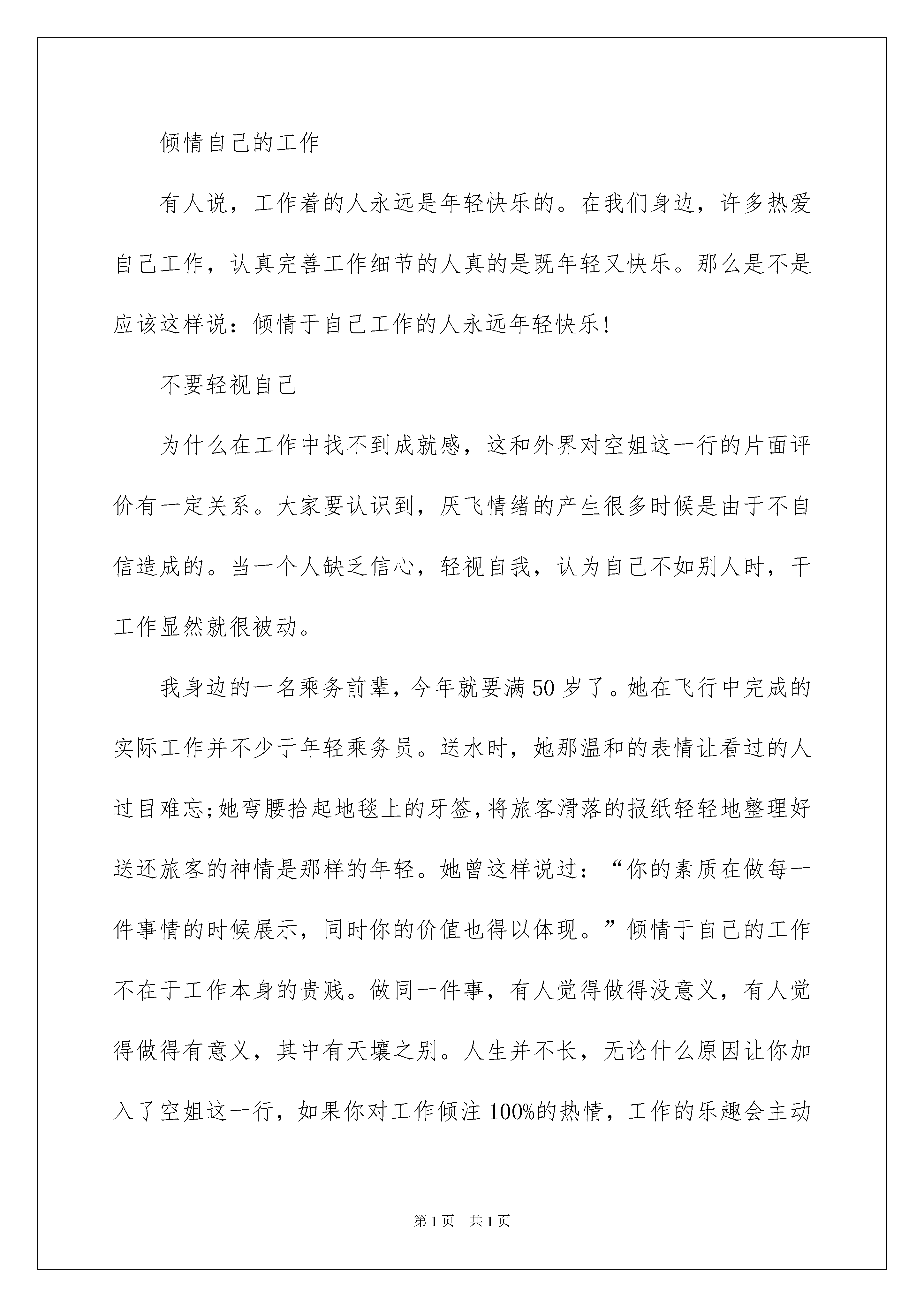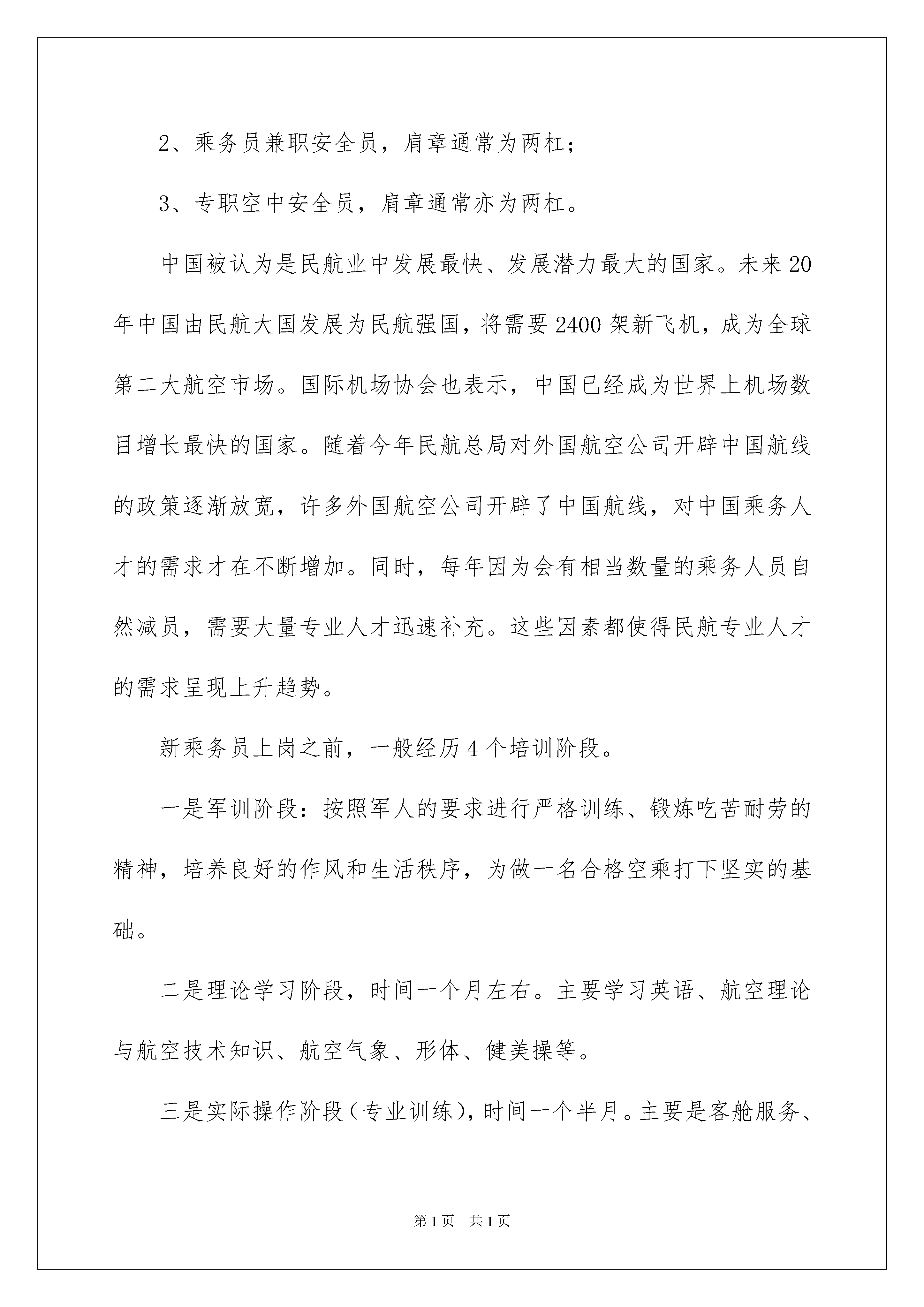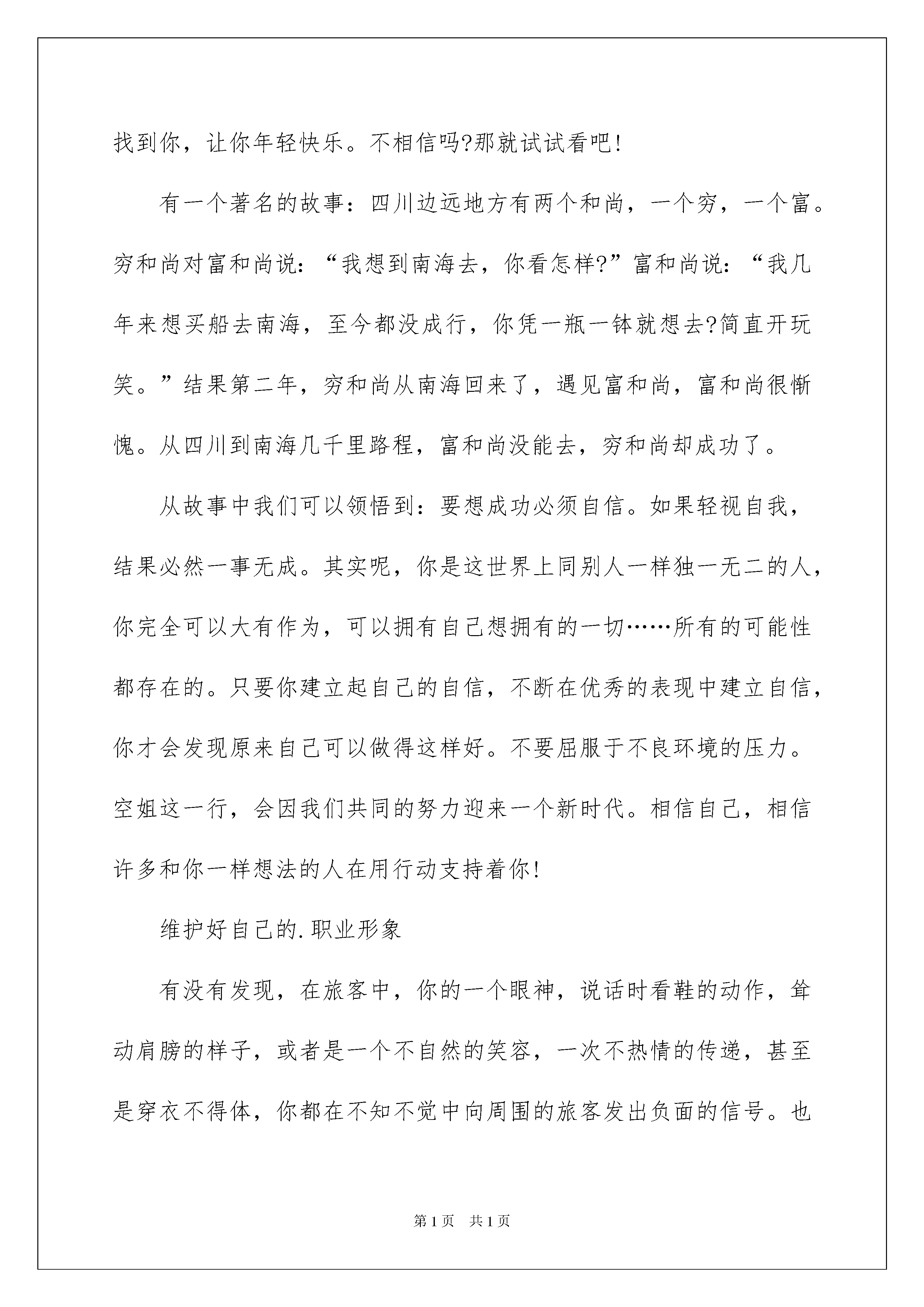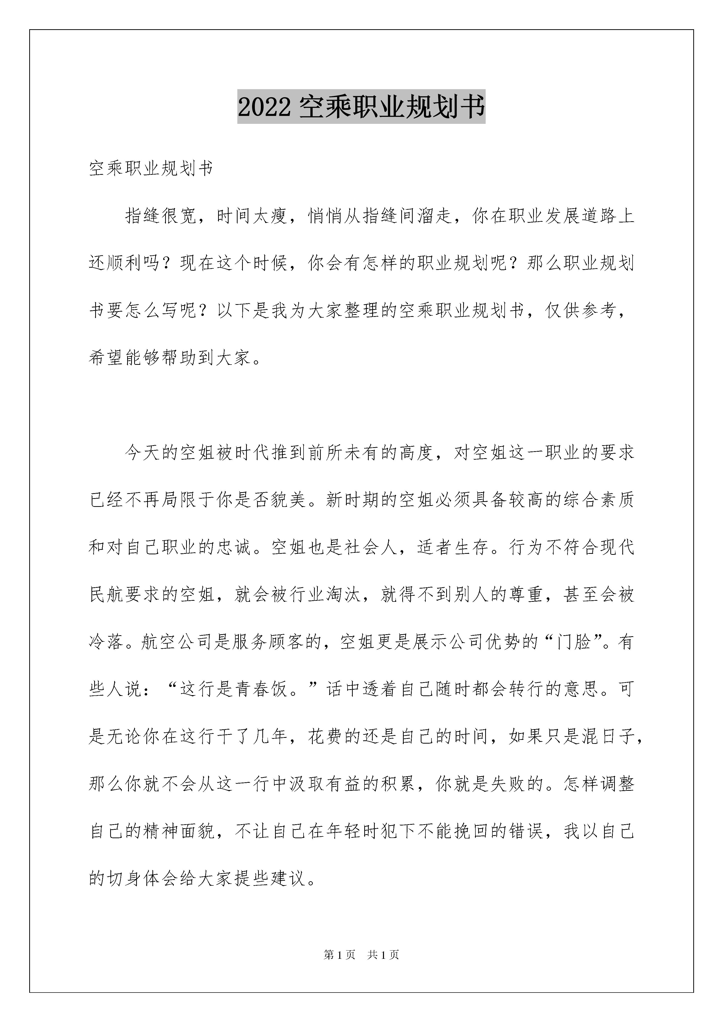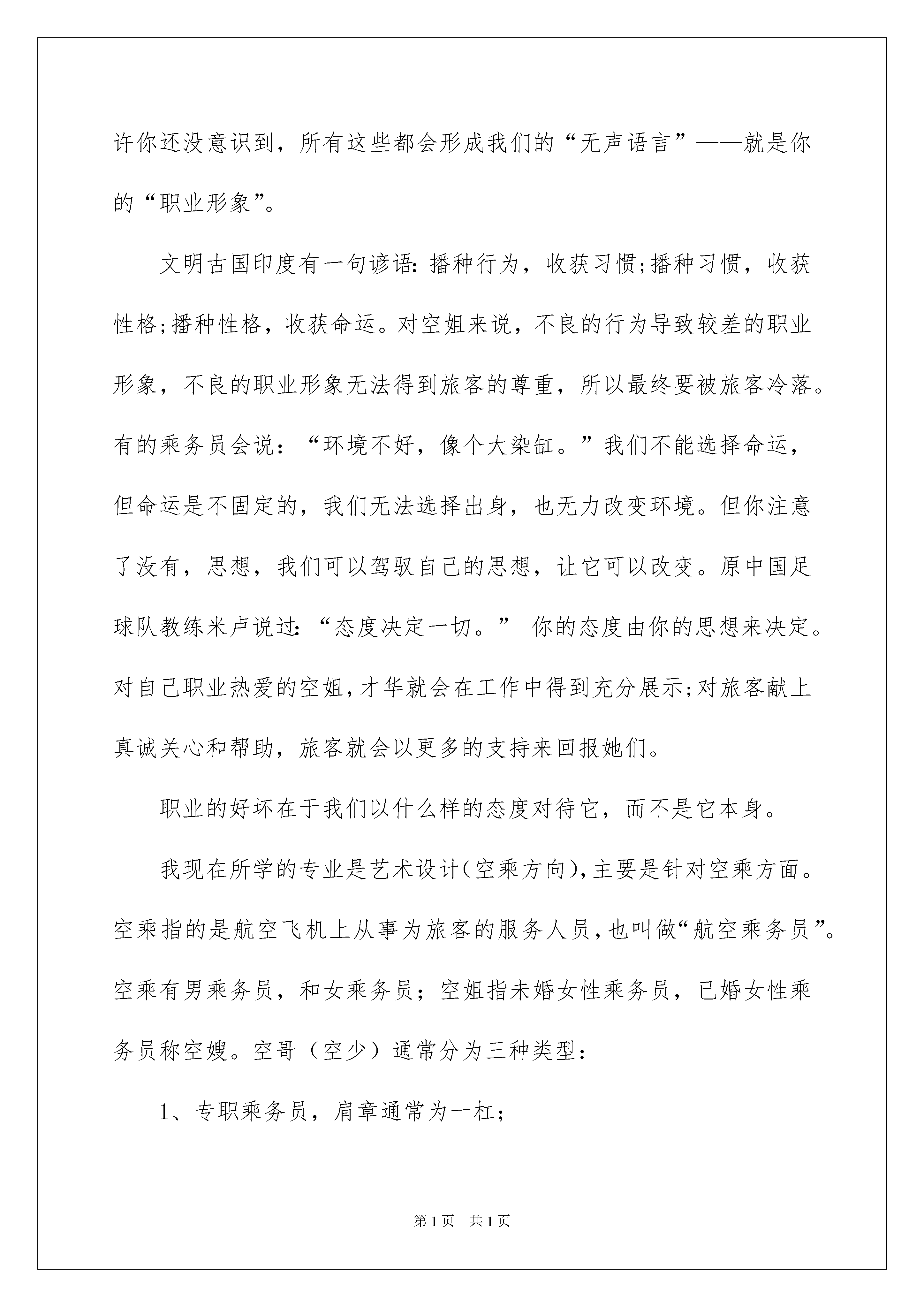 2022空乘职业规划书空乘职业规划书指缝很宽,时间太瘦,悄悄从指缝间溜走,你在职业发展道路上还顺利吗?现在这个时候,你会有怎样的职业规划呢?那么职业规划书要怎么写呢?以下是我为大家整理的空乘职业规划书,仅供参考,希望能够帮助到大家。今天的空姐被时代推到前所未有的高度,对空姐这一职业的要求已经不再局限于你是否貌美。新时期的空姐必须具备较高的综合素质和对自己职业的忠诚。空姐也是社会人,适者生存。行为不符合现代民航要求的空姐,就会被行业淘汰,就得不到别人的尊重,甚至会被冷落。航空公司是服务顾客的,空姐更是展示公司优势的“门脸”。有些人说:“这行是青春饭。”话中透着自己随时都会转行的意思。可是无论你在这行干了几年,花费的还是自己的时间,如果只是混日子,那么你就不会从这一行中汲取有益的积累,你就是失败的。怎样调整自己的精神面貌,不让自己在年轻时犯下不能挽回的错误,我以自己的切身体会给大家提些建议。倾情自己的工作有人说,工作着的人永远是年轻快乐的。在我们身边,许多热爱自己工作,认真完善工作细节的人真的是既年轻又快乐。那么是不是应该这样说:倾情于自己工作的人永远年轻快乐!不要轻视自己为什么在工作中找不到成就感,这和外界对空姐这一行的片面评价有一定关系。大家要认识到,厌飞情绪的产生很多时候是由于不自信造成的。当一个人缺乏信心,轻视自我,认为自己不如别人时,干工作显然就很被动。我身边的一名乘务前辈,今年就要满50岁了。她在飞行中完成的实际工作并不少于年轻乘务员。送水时,她那温和的表情让看过的人过目难忘;她弯腰拾起地毯上的牙签,将旅客滑落的报纸轻轻地整理好送还旅客的神情是那样的年轻。她曾这样说过:“你的素质在做每一件事情的时候展示,同时你的价值也得以体现。”倾情于自己的工作不在于工作本身的贵贱。做同一件事,有人觉得做得没意义,有人觉得做得有意义,其中有天壤之别。人生并不长,无论什么原因让你加入了空姐这一行,如果你对工作倾注100%的热情,工作的乐趣会主动找到你,让你年轻快乐。不相信吗?那就试试看吧!有一个著名的故事:四川边远地方有两个和尚,一个穷,一个富。穷和尚对富和尚说:“我想到南海去,你看怎样?”富和尚说:“我几年来想买船去南海,至今都没成行,你凭一瓶一钵就想去?简直开玩笑。”结果第二年,穷和尚从南海回来了,遇见富和尚,富和尚很惭愧。从四川到南海几千里路程,富和尚没能去,穷和尚却成功了。从故事中我们可以领悟到:要想成功必须自信。如果轻视自我,结果必然一事无成。其实呢,你是这世界上同别人一样独一无二的人,你完全可以大有作为,可以拥有自己想拥有的一切……所有的可能性都存在的。只要你建立起自己的自信,不断在优秀的表现中建立自信,你才会发现原来自己可以做得这样好。不要屈服于不良环境的压力。空姐这一行,会因我们共同的努力迎来一个新时代。相信自己,相信许多和你一样想法的人在用行动支持着你!维护好自己的.职业形象有没有发现,在旅客中,你的一个眼神,说话时看鞋的动作,耸动肩膀的样子,或者是一个不自然的笑容,一次不热情的传递,甚至是穿衣不得体,你都在不知不觉中向周围的旅客发出负面的信号。也许你还没意识到,所有这些都会形成我们的“无声语言”——就是你的“职业形象”。文明古国印度有一句谚语:播种行为,收获习惯;播种习惯,收获性格;播种性格,收获命运。对空姐来说,不良的行为导致较差的职业形象,不良的职业形象无法得到旅客的尊重,所以最终要被旅客冷落。有的乘务员会说:“环境不好,像个大染缸。”我们不能选择命运,但命运是不固定的,我们无法选择出身,也无力改变环境。但你注意了没有,思想,我们可以驾驭自己的思想,让它可以改变。原中国足球队教练米卢说过:“态度决定一切。”你的态度由你的思想来决定。对自己职业热爱的空姐,才华就会在工作中得到充分展示;对旅客献上真诚关心和帮助,旅客就会以更多的支持来回报她们。职业的好坏在于我们以什么样的态度对待它,而不是它本身。我现在所学的专业是艺术设计(空乘方向),主要是针对空乘方面。空乘指的是航空飞机上从事为旅客的服务人员,也叫做“航空乘务员”。空乘有男乘务员,和女乘务员;空姐指未婚女性乘务员,已婚女性乘务员称空嫂。空哥(空少)通常分为三种类型:1、专职乘务员,肩章通常为一杠;2、乘务员兼职安全员,肩章通常为两杠;3、专职空中安全员,肩章通常亦为两杠。中国被认为是民航业中发展最快、发展潜力最大的国家。未来20年中国由民航大国发展为民航强国,将需要2400架新飞机,成为全球第二大航空市场。国际机场协会也表示,中国已经成为世界上机场数目增长最快的国家。随着今年民航总局对外国航空公司开辟中国航线