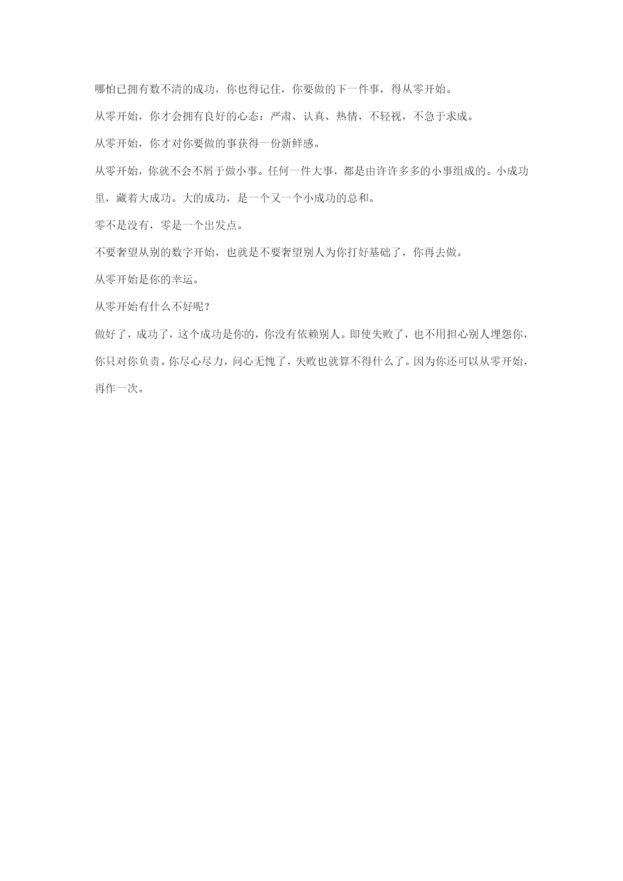 哪怕已拥有数不清的成功,你也得记住,你要做的下一件事,得从零开始。 从零开始,你才会拥有良好的心态:严肃、认真、热情,不轻视,不急于求成。 从零开始,你才对你要做的事获得一份新鲜感。 从零开始,你就不会不屑于做小事。任何一件大事,都是由许许多多的小事组成的。小成功里,藏着大成功。大的成功,是一个又一个小成功的总和。 零不是没有,零是一个出发点。 不要奢望从别的数字开始,也就是不要奢望别人为你打好基础了,你再去做。 从零开始是你的幸运。 从零开始有什么不好呢? 做好了,成功了,这个成功是你的,你没有依赖别人。即使失败了,也不用担心别人埋怨你,你只对你负责。你尽心尽力,问心无愧了,失败也就算不得什么了。因为你还可以从零开始,再作一次。
