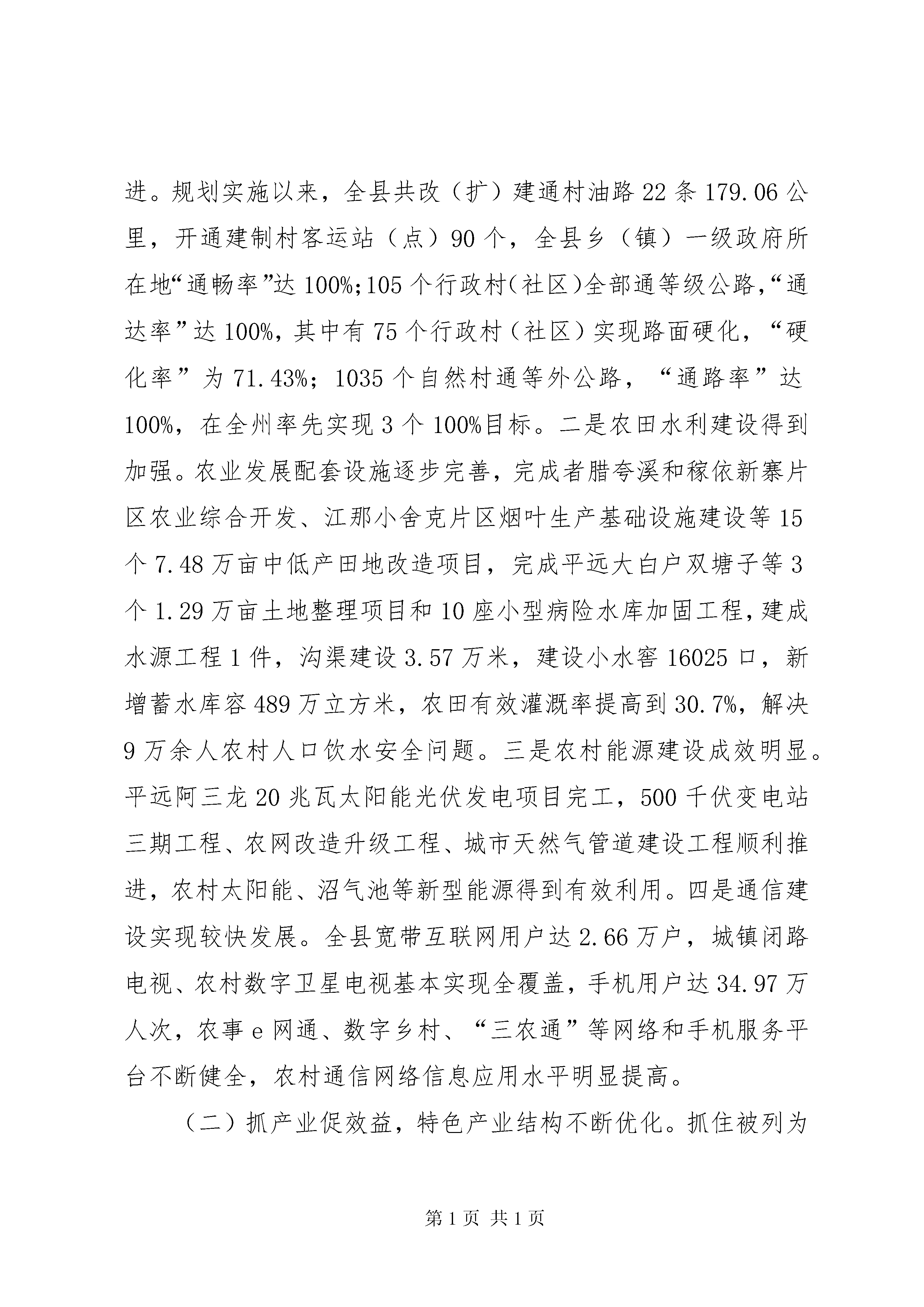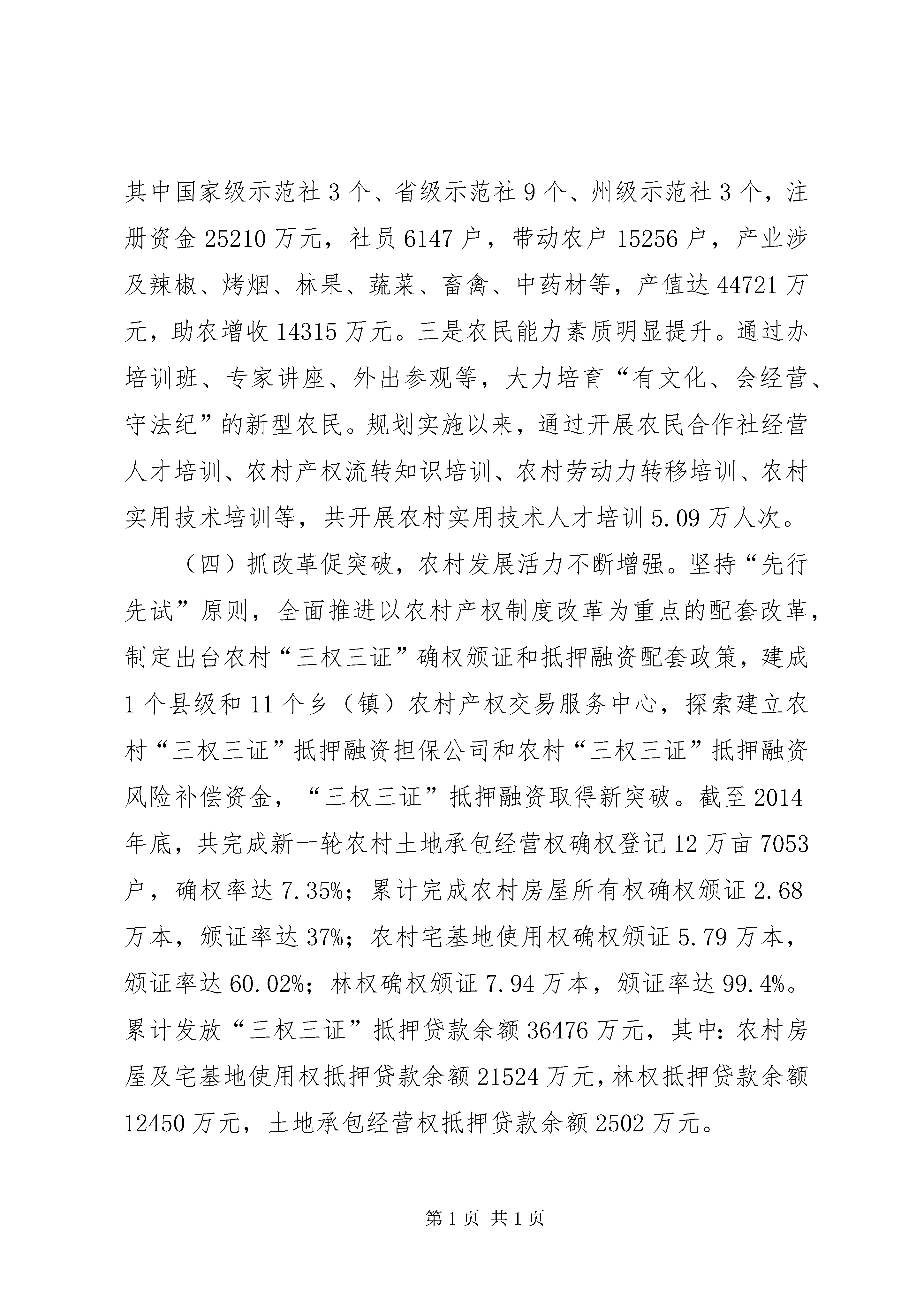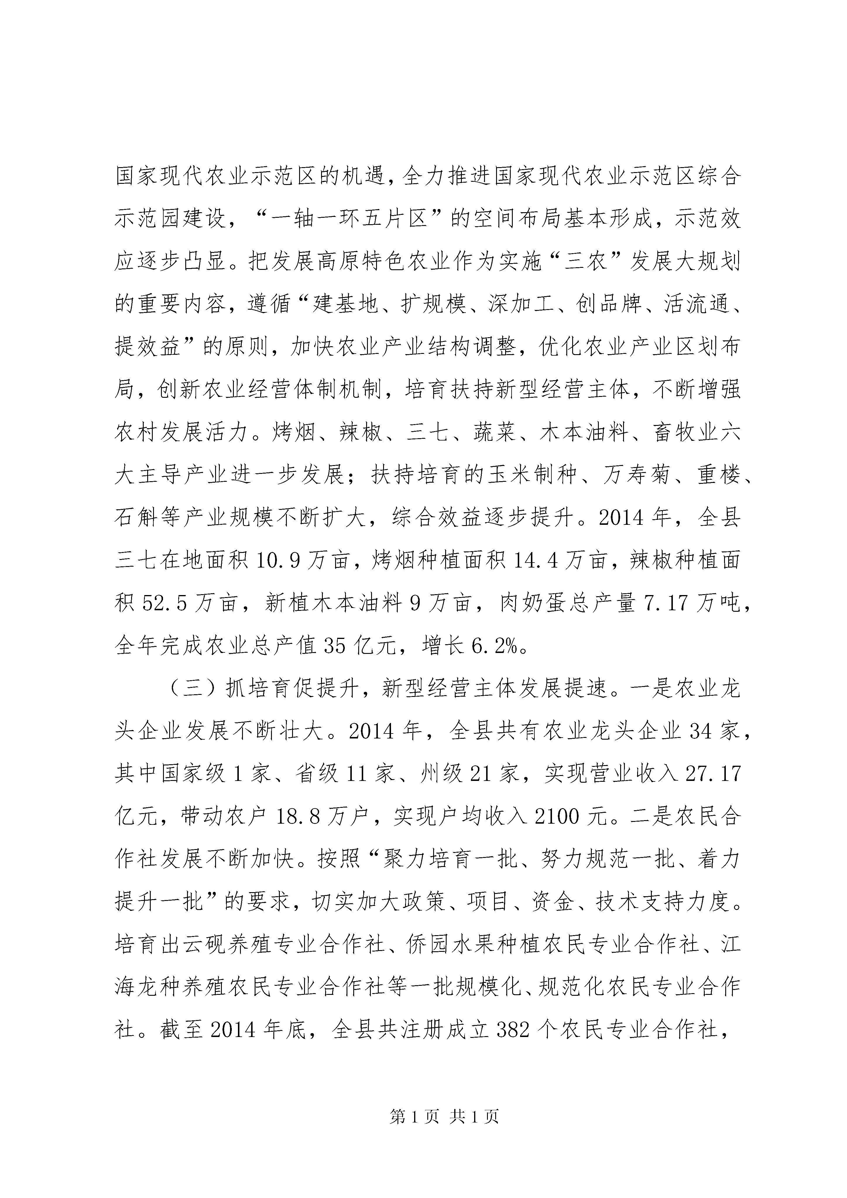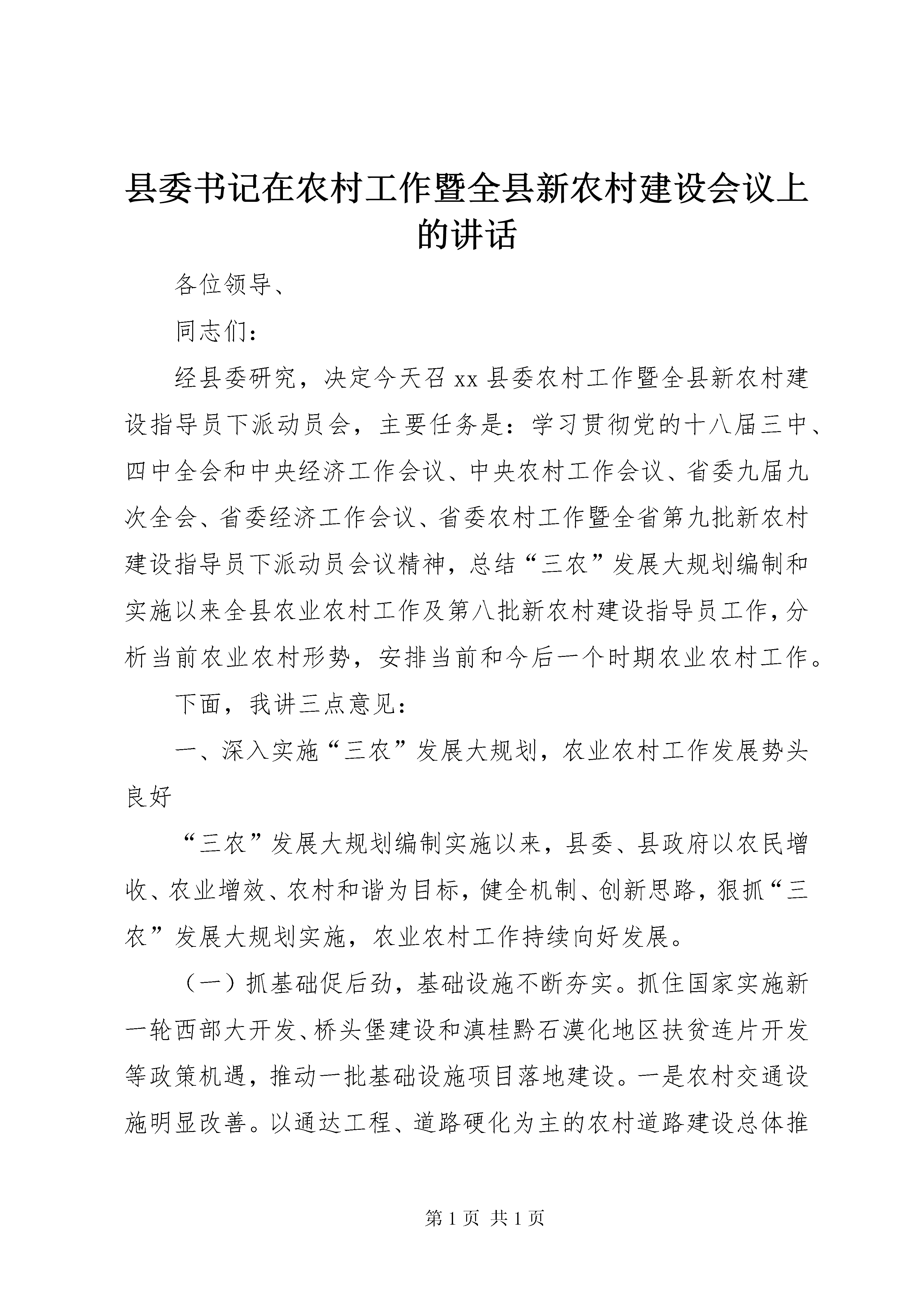 县委书记在农村工作暨全县新农村建设会议上的讲话各位领导、同志们:经县委研究,决定今天召xx县委农村工作暨全县新农村建设指导员下派动员会,主要任务是:学习贯彻党的十八届三中、四中全会和中央经济工作会议、中央农村工作会议、省委九届九次全会、省委经济工作会议、省委农村工作暨全省第九批新农村建设指导员下派动员会议精神,总结“三农”发展大规划编制和实施以来全县农业农村工作及第八批新农村建设指导员工作,分析当前农业农村形势,安排当前和今后一个时期农业农村工作。下面,我讲三点意见:一、深入实施“三农”发展大规划,农业农村工作发展势头良好“三农”发展大规划编制实施以来,县委、县政府以农民增收、农业增效、农村和谐为目标,健全机制、创新思路,狠抓“三农”发展大规划实施,农业农村工作持续向好发展。(一)抓基础促后劲,基础设施不断夯实。抓住国家实施新一轮西部大开发、桥头堡建设和滇桂黔石漠化地区扶贫连片开发等政策机遇,推动一批基础设施项目落地建设。一是农村交通设施明显改善。以通达工程、道路硬化为主的农村道路建设总体推进。规划实施以来,全县共改(扩)建通村油路22条179.06公里,开通建制村客运站(点)90个,全县乡(镇)一级政府所在地“通畅率”达100%;105个行政村(社区)全部通等级公路,“通达率”达100%,其中有75个行政村(社区)实现路面硬化,“硬化率”为71.43%;1035个自然村通等外公路,“通路率”达100%,在全州率先实现3个100%目标。二是农田水利建设得到加强。农业发展配套设施逐步完善,完成者腊夸溪和稼依新寨片区农业综合开发、江那小舍克片区烟叶生产基础设施建设等15个7.48万亩中低产田地改造项目,完成平远大白户双塘子等3个1.29万亩土地整理项目和10座小型病险水库加固工程,建成水源工程1件,沟渠建设3.57万米,建设小水窖16025口,新增蓄水库容489万立方米,农田有效灌溉率提高到30.7%,解决9万余人农村人口饮水安全问题。三是农村能源建设成效明显。平远阿三龙20兆瓦太阳能光伏发电项目完工,500千伏变电站三期工程、农网改造升级工程、城市天然气管道建设工程顺利推进,农村太阳能、沼气池等新型能源得到有效利用。四是通信建设实现较快发展。全县宽带互联网用户达2.66万户,城镇闭路电视、农村数字卫星电视基本实现全覆盖,手机用户达34.97万人次,农事e网通、数字乡村、“三农通”等网络和手机服务平台不断健全,农村通信网络信息应用水平明显提高。(二)抓产业促效益,特色产业结构不断优化。抓住被列为国家现代农业示范区的机遇,全力推进国家现代农业示范区综合示范园建设,“一轴一环五片区”的空间布局基本形成,示范效应逐步凸显。把发展高原特色农业作为实施“三农”发展大规划的重要内容,遵循“建基地、扩规模、深加工、创品牌、活流通、提效益”的原则,加快农业产业结构调整,优化农业产业区划布局,创新农业经营体制机制,培育扶持新型经营主体,不断增强农村发展活力。烤烟、辣椒、三七、蔬菜、木本油料、畜牧业六大主导产业进一步发展;扶持培育的玉米制种、万寿菊、重楼、石斛等产业规模不断扩大,综合效益逐步提升。2014年,全县三七在地面积10.9万亩,烤烟种植面积14.4万亩,辣椒种植面积52.5万亩,新植木本油料9万亩,肉奶蛋总产量7.17万吨,全年完成农业总产值35亿元,增长6.2%。(三)抓培育促提升,新型经营主体发展提速。一是农业龙头企业发展不断壮大。2014年,全县共有农业龙头企业34家,其中国家级1家、省级11家、州级21家,实现营业收入27.17亿元,带动农户18.8万户,实现户均收入2100元。二是农民合作社发展不断加快。按照“聚力培育一批、努力规范一批、着力提升一批”的要求,切实加大政策、项目、资金、技术支持力度。培育出云砚养殖专业合作社、侨园水果种植农民专业合作社、江海龙种养殖农民专业合作社等一批规模化、规范化农民专业合作社。截至2014年底,全县共注册成立382个农民专业合作社,其中国家级示范社3个、省级示范社9个、州级示范社3个,注册资金25210万元,社员6147户,带动农户15256户,产业涉及辣椒、烤烟、林果、蔬菜、畜禽、中药材等,产值达44721万元,助农增收14315万元。三是农民能力素质明显提升。通过办培训班、专家讲座、外出参观等,大力培育“有文化、会经营、守法纪”的新型农民。规划实施以来,通过开展农民合作社经营人才培训、农村产权流转知识培训、农村劳动力转移培训、农村实用技术培训等,共开展农村实用技术人才培训5.09万人次。(四)抓改革促突破,农村发展活力不断增强。坚持“先行先试”原则,全面推进以农村产权制度改革为重点的配套改革,制定出台农村“三权三证”确权颁证和抵押融资配套政策,建成1个县级和11个乡