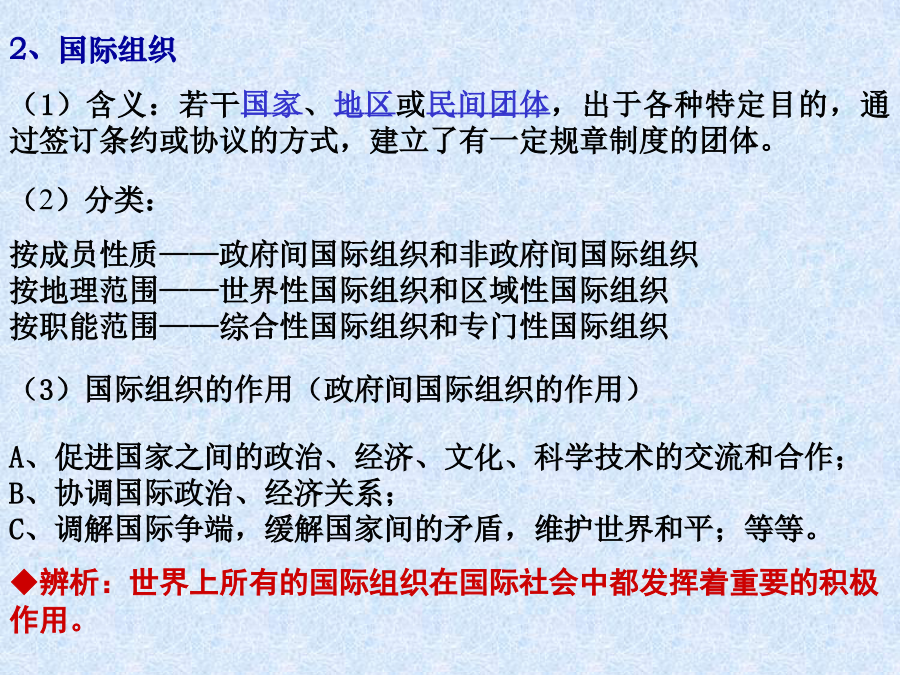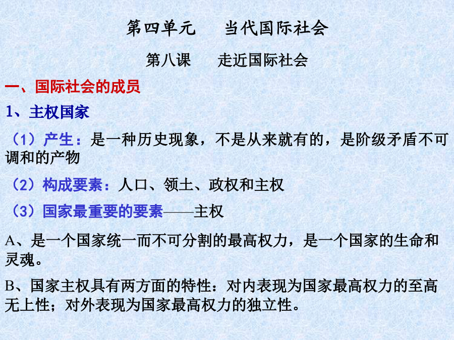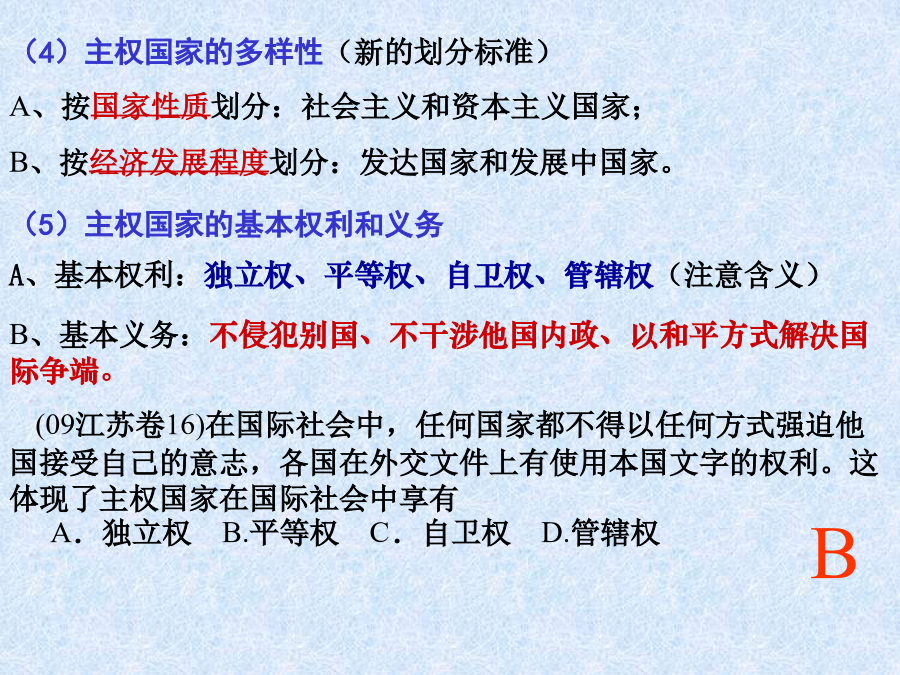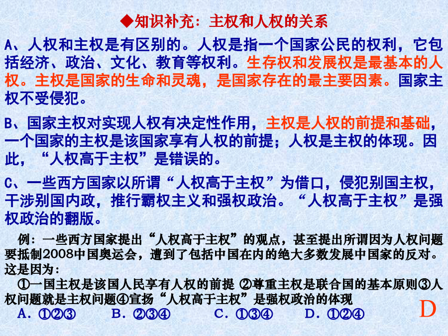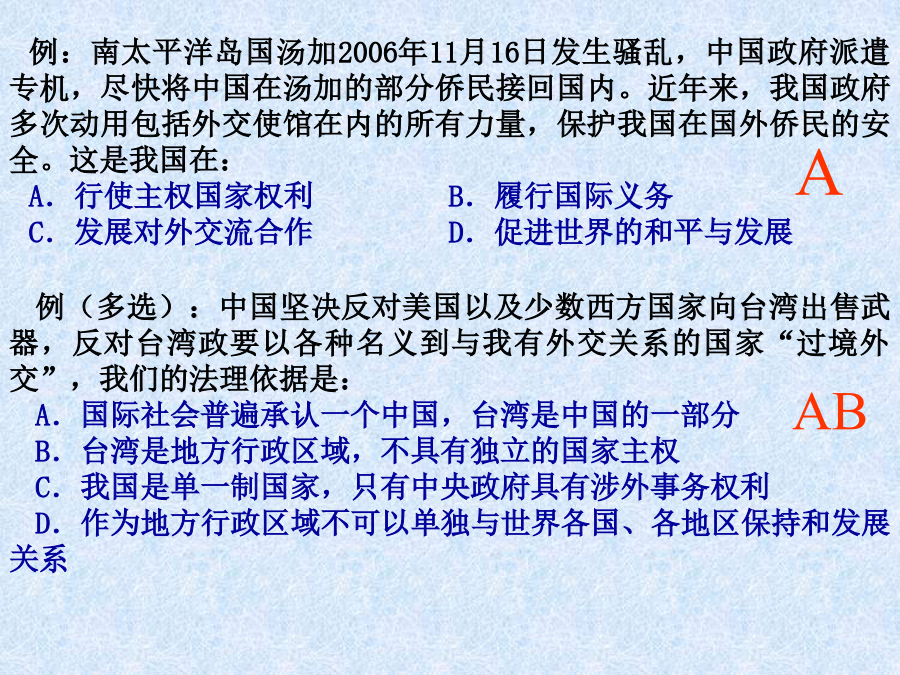 第四单元当代国际社会◆知识补充:主权和人权的关系(4)主权国家的多样性(新的划分标准)例:南太平洋岛国汤加2006年11月16日发生骚乱,中国政府派遣专机,尽快将中国在汤加的部分侨民接回国内。近年来,我国政府多次动用包括外交使馆在内的所有力量,保护我国在国外侨民的安全。这是我国在: A.行使主权国家权利B.履行国际义务 C.发展对外交流合作D.促进世界的和平与发展2、国际组织3、联合国例:2006年9月12日第61届联合国大会总务委员会举行首次会议,一致决定拒绝将冈比亚等极少数国家提出的所谓“台湾在联合国代表权”等提案列入本届联大议程,粉碎了台湾当局妄图在联合国宣扬“台独”的图谋。这是自1993年以来,连续第14次明确拒绝类似提案。回答1~2题。 1、台湾加入联合国图谋不能得逞的根本原因是: A.中国是安理会常任理事国 B.冈比亚等极少数国家的实力太小 C.台湾不具有独立主权实体性质 D.台湾的综合国力不强 2、冈比亚等极少数国家的行为: ①未履行不干涉他国内政的国际义务②未履行以和平方式解决其国际争端的国际义务③违背了联合国宪章规定的原则④违背了世界多极化的发展趋势 A.①②③B.①③C.①②③④D.①②④例(多选):联合国安理会一致通过的第1546号决议,规定美英必须结束对伊拉克的占领,承认伊临时政府。中国在表决时投了赞成票。中国的这一态度表明: A.中国对联合国及安理会的行动起决定作用 B.中国政府按照联合国宪章规定的原则处理国际事务 C.中国积极支持和参加联合国所进行的各项工作 D.中国奉行独立自主的和平外交政策二、处理国际关系的决定性因素★注意:关于国家利益与国家力量例:(2009年高考文综天津卷34)在世界贸易组织的谈判中,形成了以欧美成员国为一方,发展中成员国为另一方的格局,主要原因是: A.国家力量决定其地位和作用不同 B.双方各自有其相同的国家利益 C.当今国际关系是复杂多样的 D.合作与冲突是国际关系的基本形式2、维护我国的国家利益例(多选):6月1日,国家主席胡锦涛应约与美国总统通电话时表示,中国主张维护国际核不扩散体系,主张通过外交途径和谈判方式和平解决伊朗核问题。中方愿同美方保持沟通和协调,为尽早恢复伊朗核问题谈判发挥建设性作用。这表明: A.我国通过外交活动促进世界和平 B.我国在外交活动中注重维护国家的独立和主权 C.我国的国际地位和国际影响力提高 D.我国在国际事务中积极发挥自己的作用(09北京卷32)2009年5月,世界卫生组织召开成员国会议研究防控甲型HIN1流感的对策。中国政府表示,在做好国内疫情防控的同时,将加强与世界卫生组织、有关国家和地区的交流与合作,并提供必要的防控物资、经费和技术支持。这表明 ①解决国际问题必须通过国际组织②国际组织是国际合作的纽带 ③中国在国际事务中发挥主导作用④中国在国际事务中发挥建设性作用 A.①③B.①④C.②③D.②④(3)中国坚定地维护自己的国家利益,但我国在维护自身利益的同时,尊重其他国家合理的国家利益,并维护各国人民的共同利益。“和谐世界”是中国领导人在新形势下对国际关系理想状态的高度概括,各国和谐相处是和谐世界最基本、最核心的内涵,是和平共处概念的新发展。 辨题:建设和谐世界,就是要维护国家间的共同利益。