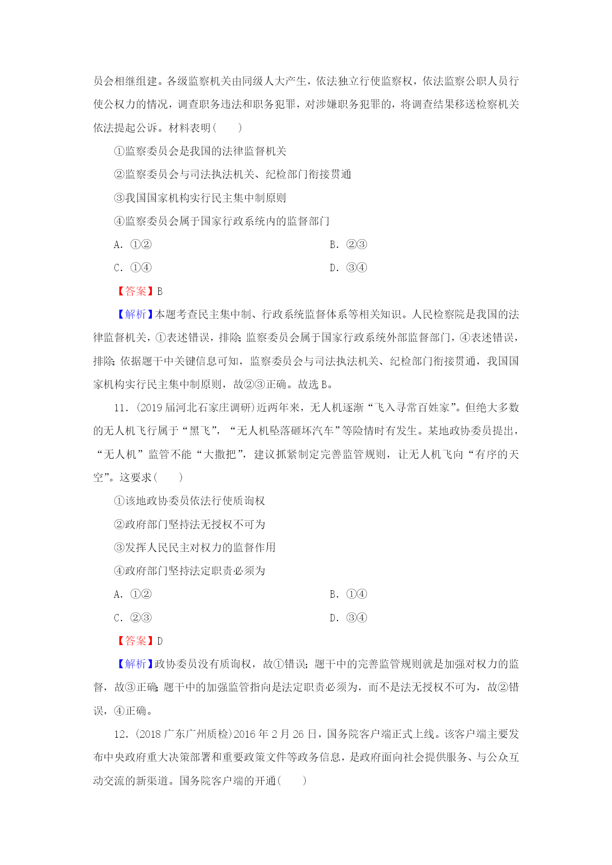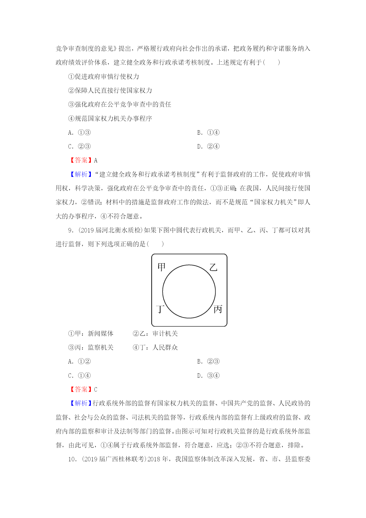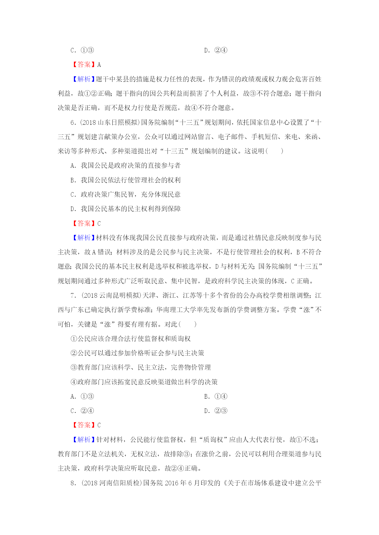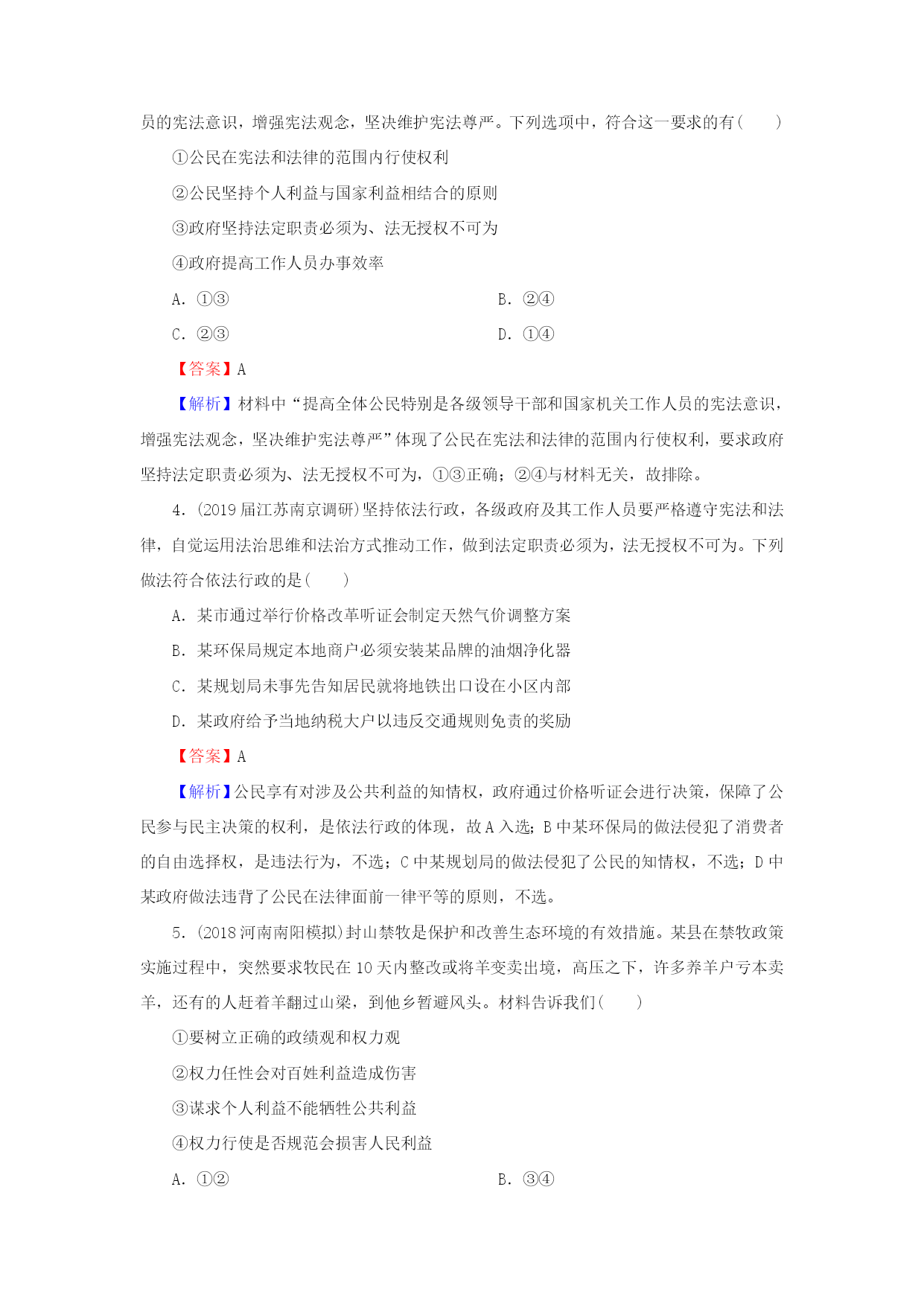 第15课我国政府受人民的监督 一、选择题 1.(2018湖南常德月考)“国家宪法日”设立以来,各地各部门积极行动,用多种多样的活动宣传、普及宪法知识,维护宪法尊严。维护宪法尊严要求政府() ①依法履行职能,推行政府权力清单制度 ②加强司法监督,努力构建阳光司法机制 ③提升公务员的法治意识,打造法治政府 ④坚持公正廉洁,以党风来引领社会风气 A.①② B.②④ C.①③ D.③④ 【答案】C 【解析】维护宪法尊严要求政府依法履行其职能,推行政府权力清单制度,提升公务员的法治意识,打造法治政府。故①③表述正确,入选;政府是行政部门,不是司法部门,②错误;④说的是党,不符合题意。 2.(2018山东日照模拟)修改后的行政诉讼法实施一年来,北京全市法院受理各类诉讼案件16281件,同比上升99%。在作出判决的案件中,行政机关败诉率达29%。同时,行政机关负责人出庭率仍然较低,“一把手”出庭应诉少,副职出庭应诉占绝大多数。这种状况表明() ①政府应充分利用法律手段管理自身、管理社会事务 ②依法治国方略得到了全面落实 ③政府的权威受到了挑战 ④政府及其工作人员要提高德行操守 A.①② B.①④ C.②③ D.③④ 【答案】B 【解析】材料只是涉及了依法治国在行政诉讼方面的贯彻,不能说明依法治国方略得到了全面落实,②错误;区分政府有无权威的标志是政府的管理和服务是否得到人民的认可,不会因为行政机关败诉而影响政府权威,③错误;材料信息体现出政府及其工作人员要提高德行操守,充分利用法律手段管理自身、管理社会事务,①④正确。 3.(2018江西南丰联考)《中央宣传部、司法部关于在公民中开展法治宣传教育的第七个五年规划(2016—2020年)》提出,提高全体公民特别是各级领导干部和国家机关工作人员的宪法意识,增强宪法观念,坚决维护宪法尊严。下列选项中,符合这一要求的有() ①公民在宪法和法律的范围内行使权利 ②公民坚持个人利益与国家利益相结合的原则 ③政府坚持法定职责必须为、法无授权不可为 ④政府提高工作人员办事效率 A.①③ B.②④ C.②③ D.①④ 【答案】A 【解析】材料中“提高全体公民特别是各级领导干部和国家机关工作人员的宪法意识,增强宪法观念,坚决维护宪法尊严”体现了公民在宪法和法律的范围内行使权利,要求政府坚持法定职责必须为、法无授权不可为,①③正确;②④与材料无关,故排除。 4.(2019届江苏南京调研)坚持依法行政,各级政府及其工作人员要严格遵守宪法和法律,自觉运用法治思维和法治方式推动工作,做到法定职责必须为,法无授权不可为。下列做法符合依法行政的是() A.某市通过举行价格改革听证会制定天然气价调整方案 B.某环保局规定本地商户必须安装某品牌的油烟净化器 C.某规划局未事先告知居民就将地铁出口设在小区内部 D.某政府给予当地纳税大户以违反交通规则免责的奖励 【答案】A 【解析】公民享有对涉及公共利益的知情权,政府通过价格听证会进行决策,保障了公民参与民主决策的权利,是依法行政的体现,故A入选;B中某环保局的做法侵犯了消费者的自由选择权,是违法行为,不选;C中某规划局的做法侵犯了公民的知情权,不选;D中某政府做法违背了公民在法律面前一律平等的原则,不选。 5.(2018河南南阳模拟)封山禁牧是保护和改善生态环境的有效措施。某县在禁牧政策实施过程中,突然要求牧民在10天内整改或将羊变卖出境,高压之下,许多养羊户亏本卖羊,还有的人赶着羊翻过山梁,到他乡暂避风头。材料告诉我们() ①要树立正确的政绩观和权力观 ②权力任性会对百姓利益造成伤害 ③谋求个人利益不能牺牲公共利益 ④权力行使是否规范会损害人民利益 A.①② B.③④ C.①③ D.②④ 【答案】A 【解析】题干中某县的措施是权力任性的表现,作为错误的政绩观或权力观会危害百姓利益,故①②正确;题干指向的因公共利益而损害了个人利益,故③不符合题意;题干指向决策是否正确,而不是权力行使是否规范,故④不符合题意。 6.(2018山东日照模拟)国务院编制“十三五”规划期间,依托国家信息中心设置了“十三五”规划建言献策办公室,公众可以通过网站留言、电子邮件、手机短信、来电、来函、来访等多种形式、多种渠道提出对“十三五”规划编制的建议。这说明() A.我国公民是政府决策的直接参与者 B.我国公民依法行使管理社会的权利 C.政府决策广集民智,充分体现民意 D.我国公民基本的民主权利得到保障 【答案】C 【解析】材料没有体现我国公民直接参与政府决策,而是通过社情民意反映制度参与民主决策,故A错误;材料涉及的是公民参与民主决策,不是行使管理社会的权利,B不符合题意;我国公民的基本民主权利是选举权和被选举权,D与材料无关;国务院编制“十三五”规划期间通过多种形式广泛听取民意、集中民智,是政府科学