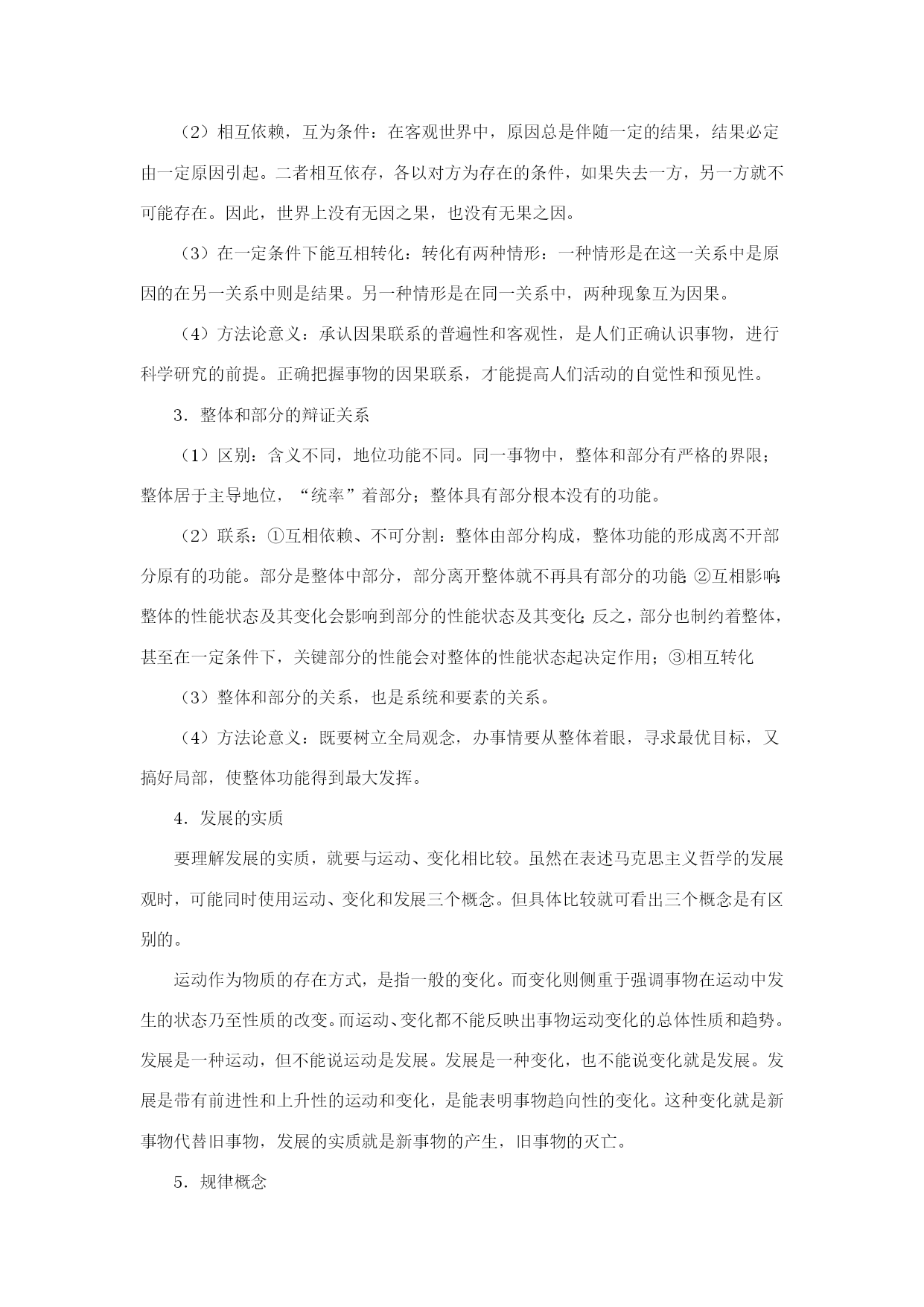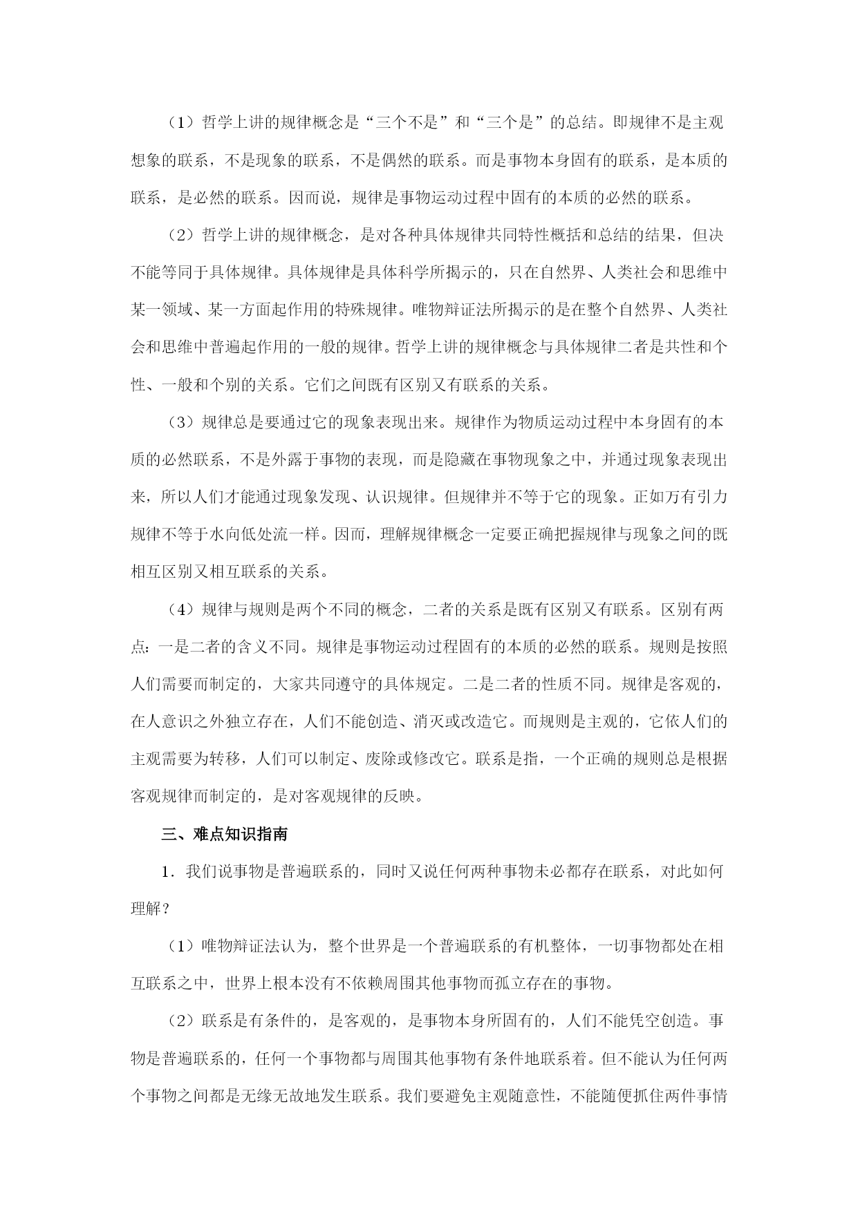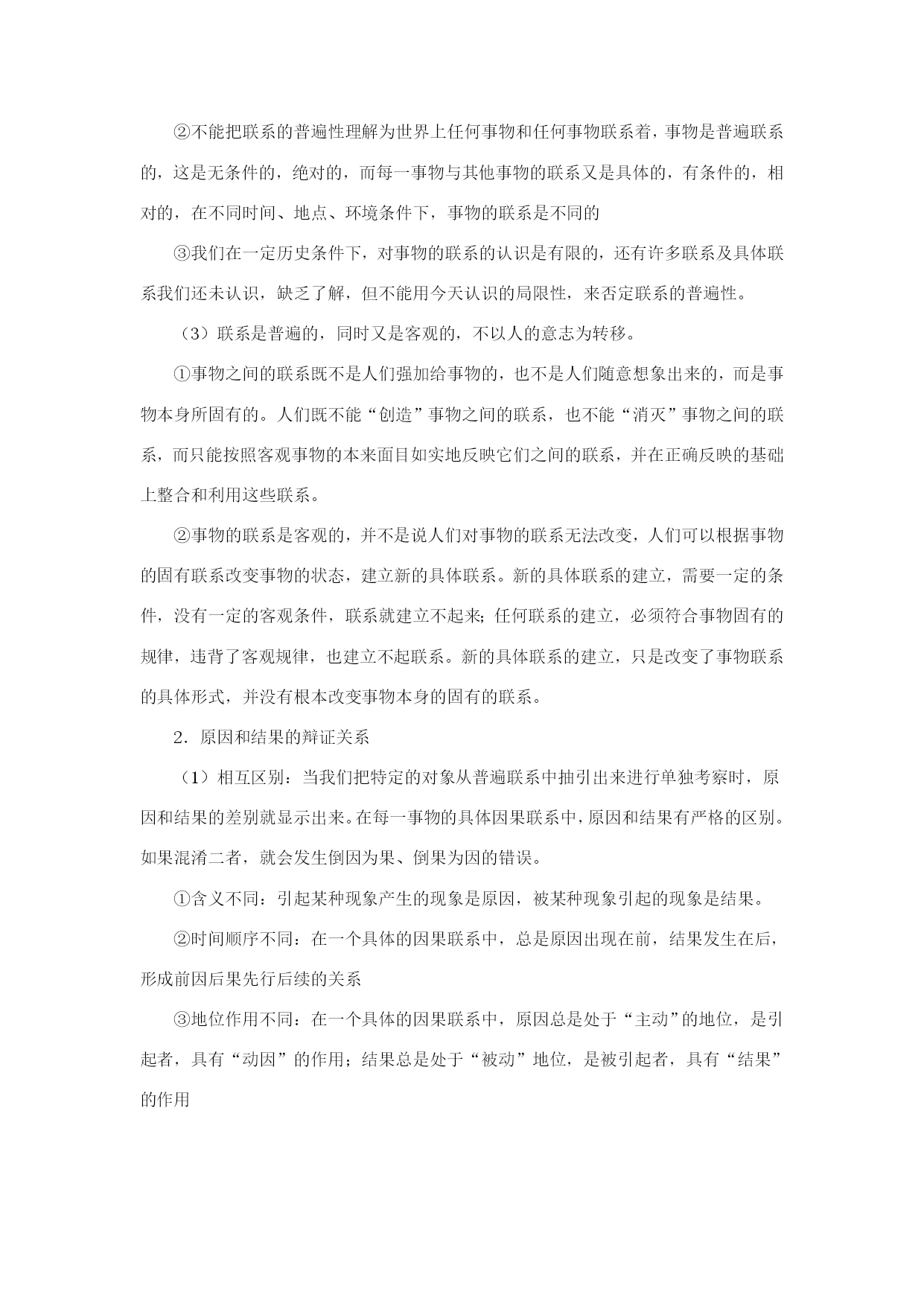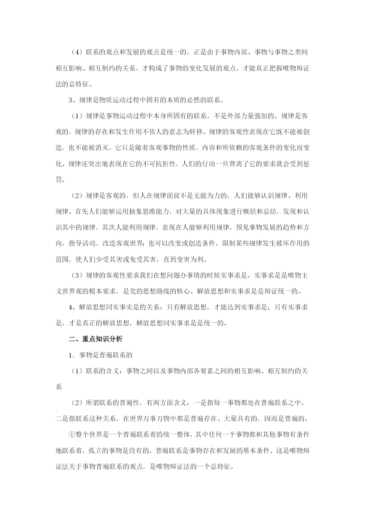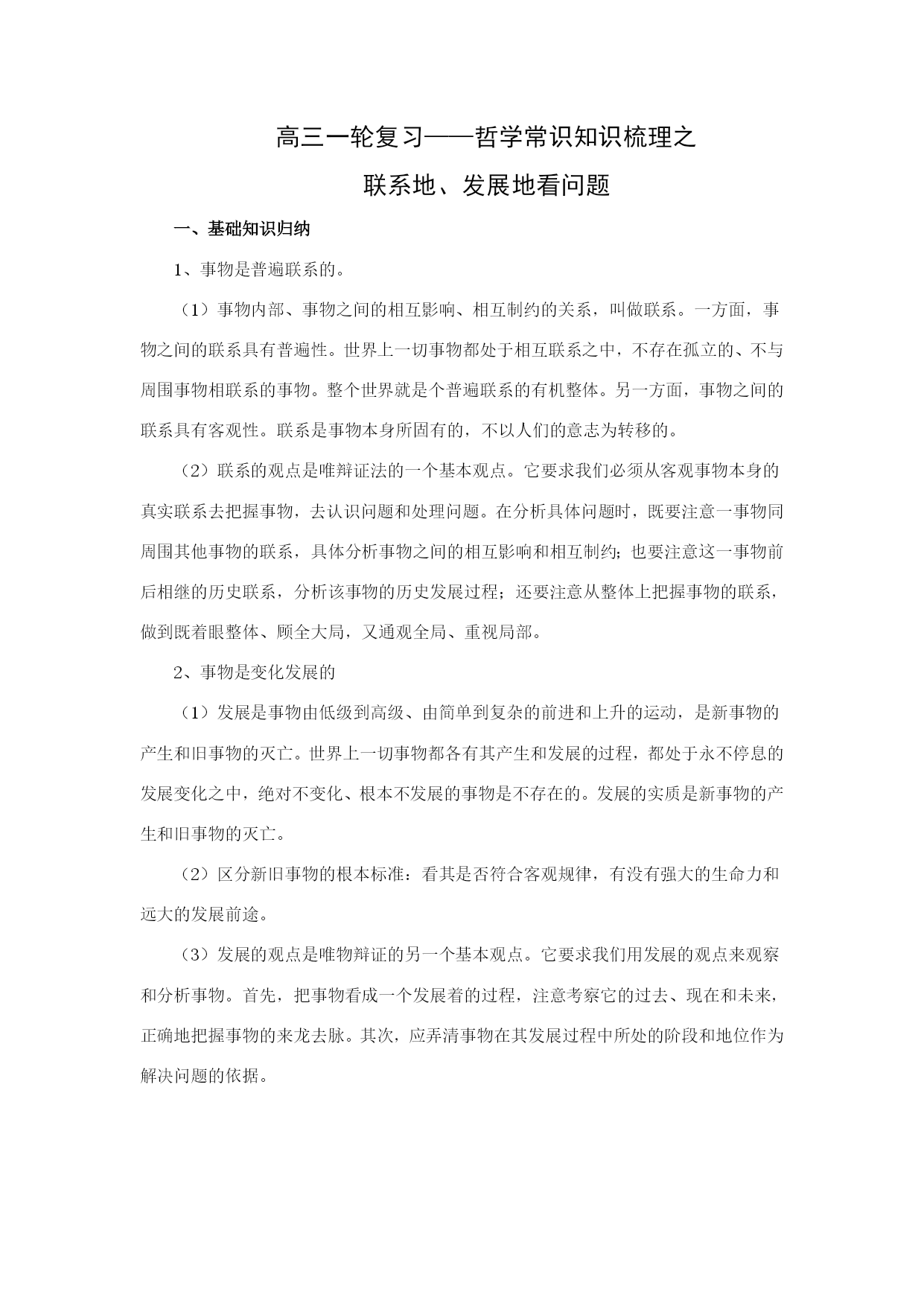 高三一轮复习——哲学常识知识梳理之 联系地、发展地看问题 一、基础知识归纳 1、事物是普遍联系的。 (1)事物内部、事物之间的相互影响、相互制约的关系,叫做联系。一方面,事物之间的联系具有普遍性。世界上一切事物都处于相互联系之中,不存在孤立的、不与周围事物相联系的事物。整个世界就是个普遍联系的有机整体。另一方面,事物之间的联系具有客观性。联系是事物本身所固有的,不以人们的意志为转移的。 (2)联系的观点是唯辩证法的一个基本观点。它要求我们必须从客观事物本身的真实联系去把握事物,去认识问题和处理问题。在分析具体问题时,既要注意一事物同周围其他事物的联系,具体分析事物之间的相互影响和相互制约;也要注意这一事物前后相继的历史联系,分析该事物的历史发展过程;还要注意从整体上把握事物的联系,做到既着眼整体、顾全大局,又通观全局、重视局部。 2、事物是变化发展的 (1)发展是事物由低级到高级、由简单到复杂的前进和上升的运动,是新事物的产生和旧事物的灭亡。世界上一切事物都各有其产生和发展的过程,都处于永不停息的发展变化之中,绝对不变化、根本不发展的事物是不存在的。发展的实质是新事物的产生和旧事物的灭亡。 (2)区分新旧事物的根本标准:看其是否符合客观规律,有没有强大的生命力和远大的发展前途。 (3)发展的观点是唯物辩证的另一个基本观点。它要求我们用发展的观点来观察和分析事物。首先,把事物看成一个发展着的过程,注意考察它的过去、现在和未来,正确地把握事物的来龙去脉。其次,应弄清事物在其发展过程中所处的阶段和地位作为解决问题的依据。 (4)联系的观点和发展的观点是统一的,正是由于事物内部、事物与事物之类间相互影响、相互制约的关系,才构成了事物的变化发展的观点,才能真正把握唯物辩证法的总特征。 3、规律是物质运动过程中固有的本质的必然的联系。 (1)规律是事物运动过程中本身所固有的联系,不是外部力量强加的。规律是客观的,规律的存在和发生作用不依人的意志为转移。规律的客观性表现在它既不能被创造,也不能被消灭,它只是随着客观事物的性质,内容和所依赖的客观条件的变化而变化。规律还突出地表现在它的不可抗拒性,人们的行动一旦背离了它的要求就会受到惩罚。 (2)规律是客观的,但人在规律面前不是无能为力的,人们能够认识规律、利用规律。首先人们能够运用抽象思维能力,对大量的具体现象进行概括和总结,发现和认识其中的规律,其次人能利用规律,表现在人能够利用规律,预见事物发展的趋势和方向,指导活动,改造客观世界;也可以改变或创造条件,限制某些规律发生破坏作用的范围,使人们少受其害或免受其害,直到变害为利。 (3)规律的客观性要求我们在想问题办事情的时候实事求是。实事求是是唯物主义世界观的根本要求,是党的思想路线的核心。解放思想和实事求是是辩证统一的。 4、解放思想同实事实是的关系:只有解放思想,才能达到实事求是;只有实事求是,才是真正的解放思想,解放思想同实事求是是统一的。 二、重点知识分析 1.事物是普遍联系的 (1)联系的含义:事物之间以及事物内部各要素之间的相互影响、相互制约的关系 (2)所谓联系的普遍性,有两方面含义:一是指每一事物都处在普遍联系之中,二是指联系这种关系,在世界万事万物中都是普遍存在、大量具有的,因而是普遍的。 ①整个世界是一个普遍联系着的统一整体,其中任何一个事物都和其他事物有条件地联系着,孤立的事物是没有的。普遍联系是事物存在和发展的基本条件。这是唯物辩证法关于事物普遍联系的观点,是唯物辩证法的一个总特征。 ②不能把联系的普遍性理解为世界上任何事物和任何事物联系着,事物是普遍联系的,这是无条件的,绝对的,而每一事物与其他事物的联系又是具体的,有条件的,相对的,在不同时间、地点、环境条件下,事物的联系是不同的 ③我们在一定历史条件下,对事物的联系的认识是有限的,还有许多联系及具体联系我们还未认识,缺乏了解,但不能用今天认识的局限性,来否定联系的普遍性。 (3)联系是普遍的,同时又是客观的,不以人的意志为转移。 ①事物之间的联系既不是人们强加给事物的,也不是人们随意想象出来的,而是事物本身所固有的。人们既不能“创造”事物之间的联系,也不能“消灭”事物之间的联系,而只能按照客观事物的本来面目如实地反映它们之间的联系,并在正确反映的基础上整合和利用这些联系。 ②事物的联系是客观的,并不是说人们对事物的联系无法改变,人们可以根据事物的固有联系改变事物的状态,建立新的具体联系。新的具体联系的建立,需要一定的条件,没有一定的客观条件,联系就建立不起来;任何联系的建立,必须符合事物固有的规律,违背了客观规律,也建立不起联系。新的具体联系的建立,只是改变了事物联系的具体形式,并没有根本改变事物本身的固有的联系。 2.原因和结果的辩证关系 (1)相互区别:当我