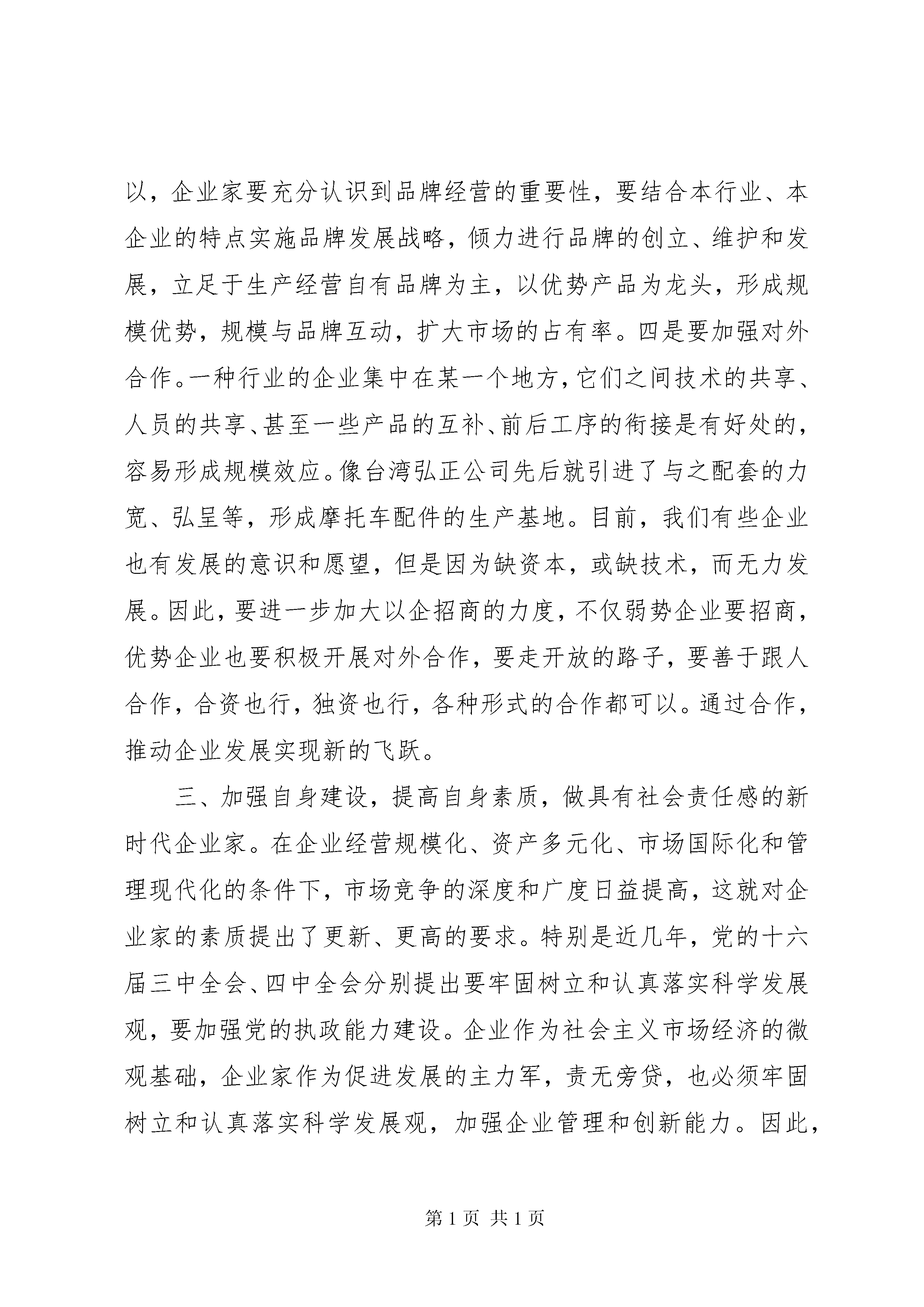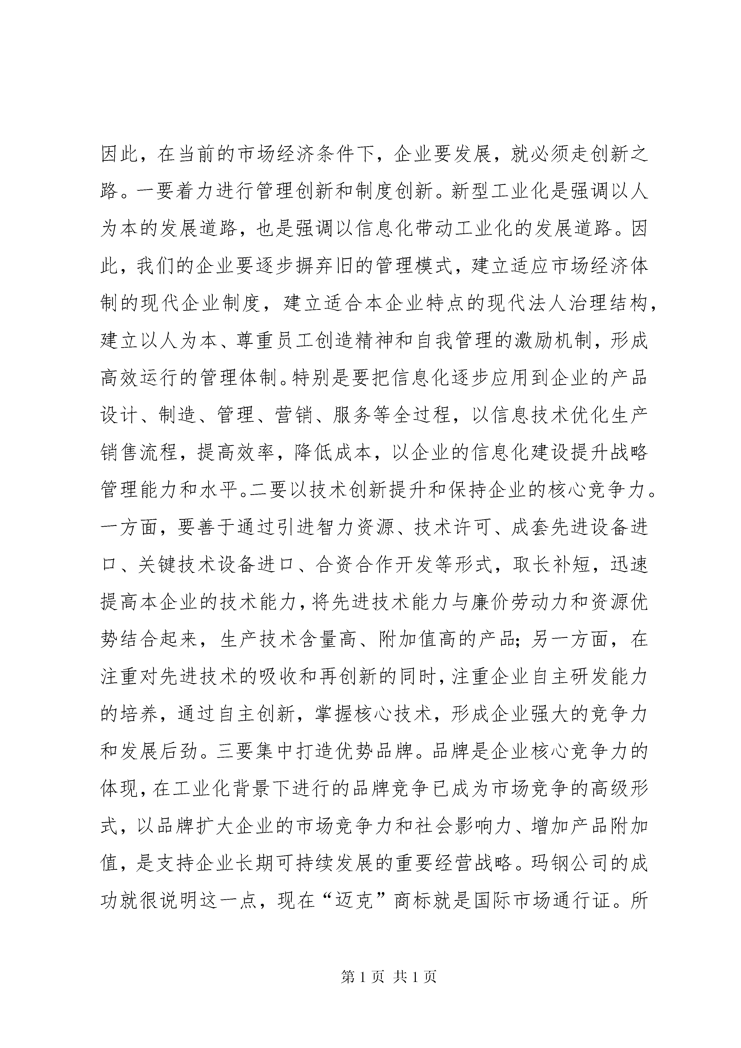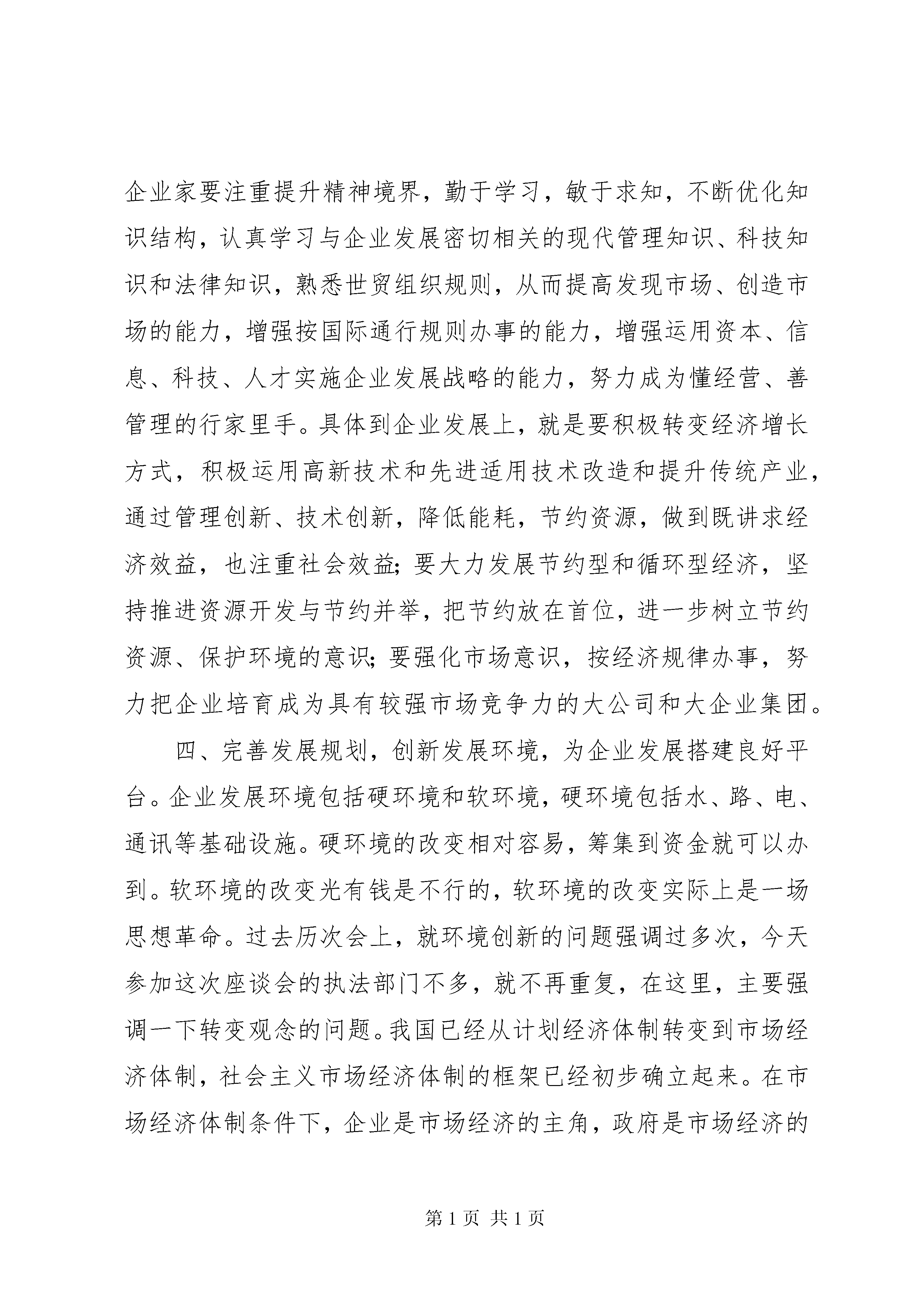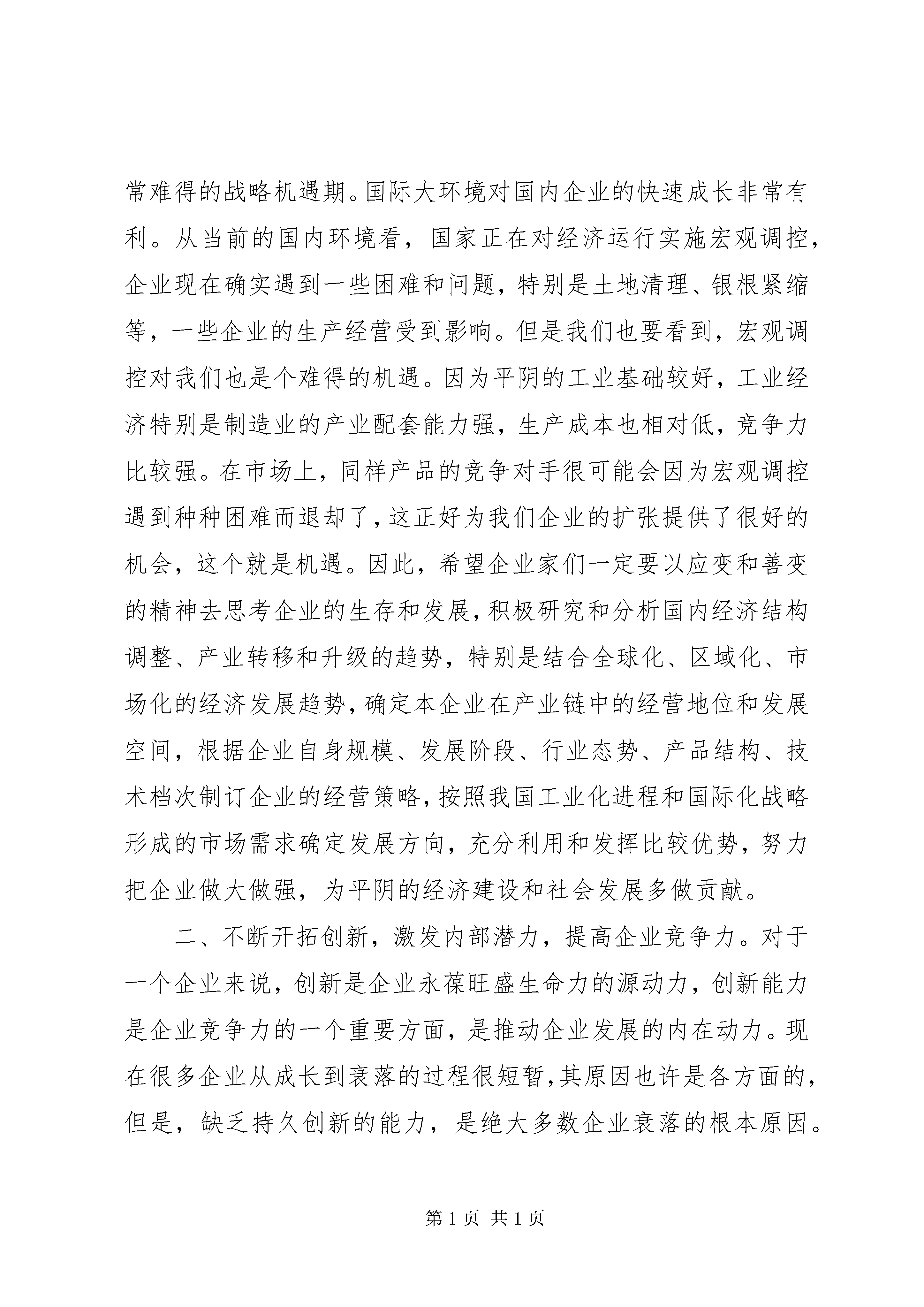 县委书记在县域骨干企业座谈会上的讲话同志们:今天,我们召开这次骨干企业座谈会,目的是交流情况、相互沟通,展望发展、互相启发,进一步加快明年和今后一个时期我县工业经济的发展。会议开始的时候,经贸局通报了县域工业经济运行情况,从通报的情况看,今年以来我县工业经济克服了原材料涨价、国家宏观调控等因素的影响,继续保持了快速增长的良好势头,规模以上企业的销售收入等四项指标增幅都在19%以上。这些成绩的取得,离不开在座各位企业家的辛勤努力,在此,我代表县委、县政府表示衷心地感谢。刚才,各位企业家也分别畅谈了企业的发展情况,对明年乃至今后一个时期的企业发展思路作了阐述,听了以后很受启发和鼓舞。当前,我县经济社会发展已经进入了全面建设小康社会的关键时期,加快发展的任务更加突出地摆在我们面前。企业家作为市场经济主体中最积极的力量,必须认清形势,抓住机遇,以强烈的社会责任感和历史使命感,与时俱进,开拓创新,勇争潮头,进一步发挥好推动平阴加快发展的主力军作用。下面,根据大家座谈的情况,结合我县的工作,我谈几点希望和要求。一、树立创业精神,牢牢把握机遇,把企业做大作强。当前,我们正面临着国际经济一体化加速推进、我国占世界经济的总量快速膨胀的重要历史时期,这也是我们迅速把企业做大做强的非常难得的战略机遇期。国际大环境对国内企业的快速成长非常有利。从当前的国内环境看,国家正在对经济运行实施宏观调控,企业现在确实遇到一些困难和问题,特别是土地清理、银根紧缩等,一些企业的生产经营受到影响。但是我们也要看到,宏观调控对我们也是个难得的机遇。因为平阴的工业基础较好,工业经济特别是制造业的产业配套能力强,生产成本也相对低,竞争力比较强。在市场上,同样产品的竞争对手很可能会因为宏观调控遇到种种困难而退却了,这正好为我们企业的扩张提供了很好的机会,这个就是机遇。因此,希望企业家们一定要以应变和善变的精神去思考企业的生存和发展,积极研究和分析国内经济结构调整、产业转移和升级的趋势,特别是结合全球化、区域化、市场化的经济发展趋势,确定本企业在产业链中的经营地位和发展空间,根据企业自身规模、发展阶段、行业态势、产品结构、技术档次制订企业的经营策略,按照我国工业化进程和国际化战略形成的市场需求确定发展方向,充分利用和发挥比较优势,努力把企业做大做强,为平阴的经济建设和社会发展多做贡献。二、不断开拓创新,激发内部潜力,提高企业竞争力。对于一个企业来说,创新是企业永葆旺盛生命力的源动力,创新能力是企业竞争力的一个重要方面,是推动企业发展的内在动力。现在很多企业从成长到衰落的过程很短暂,其原因也许是各方面的,但是,缺乏持久创新的能力,是绝大多数企业衰落的根本原因。因此,在当前的市场经济条件下,企业要发展,就必须走创新之路。一要着力进行管理创新和制度创新。新型工业化是强调以人为本的发展道路,也是强调以信息化带动工业化的发展道路。因此,我们的企业要逐步摒弃旧的管理模式,建立适应市场经济体制的现代企业制度,建立适合本企业特点的现代法人治理结构,建立以人为本、尊重员工创造精神和自我管理的激励机制,形成高效运行的管理体制。特别是要把信息化逐步应用到企业的产品设计、制造、管理、营销、服务等全过程,以信息技术优化生产销售流程,提高效率,降低成本,以企业的信息化建设提升战略管理能力和水平。二要以技术创新提升和保持企业的核心竞争力。一方面,要善于通过引进智力资源、技术许可、成套先进设备进口、关键技术设备进口、合资合作开发等形式,取长补短,迅速提高本企业的技术能力,将先进技术能力与廉价劳动力和资源优势结合起来,生产技术含量高、附加值高的产品;另一方面,在注重对先进技术的吸收和再创新的同时,注重企业自主研发能力的培养,通过自主创新,掌握核心技术,形成企业强大的竞争力和发展后劲。三要集中打造优势品牌。品牌是企业核心竞争力的体现,在工业化背景下进行的品牌竞争已成为市场竞争的高级形式,以品牌扩大企业的市场竞争力和社会影响力、增加产品附加值,是支持企业长期可持续发展的重要经营战略。玛钢公司的成功就很说明这一点,现在“迈克”商标就是国际市场通行证。所以,企业家要充分认识到品牌经营的重要性,要结合本行业、本企业的特点实施品牌发展战略,倾力进行品牌的创立、维护和发展,立足于生产经营自有品牌为主,以优势产品为龙头,形成规模优势,规模与品牌互动,扩大市场的占有率。四是要加强对外合作。一种行业的企业集中在某一个地方,它们之间技术的共享、人员的共享、甚至一些产品的互补、前后工序的衔接是有好处的,容易形成规模效应。像台湾弘正公司先后就引进了与之配套的力宽、弘呈等,形成摩托车配件的生产基地。目前,我们有些企业也有发展的意识和愿望,但是因为缺资本,或缺技术,而无力发展。因此,要进一步加大以企招商的力度,不