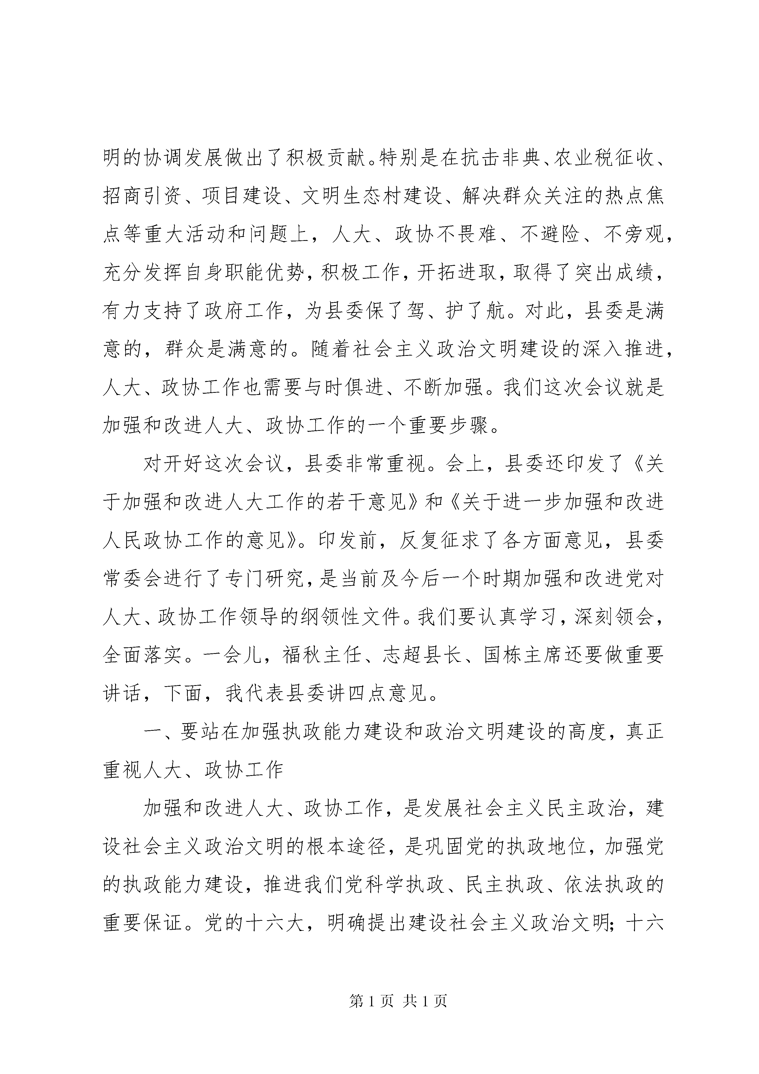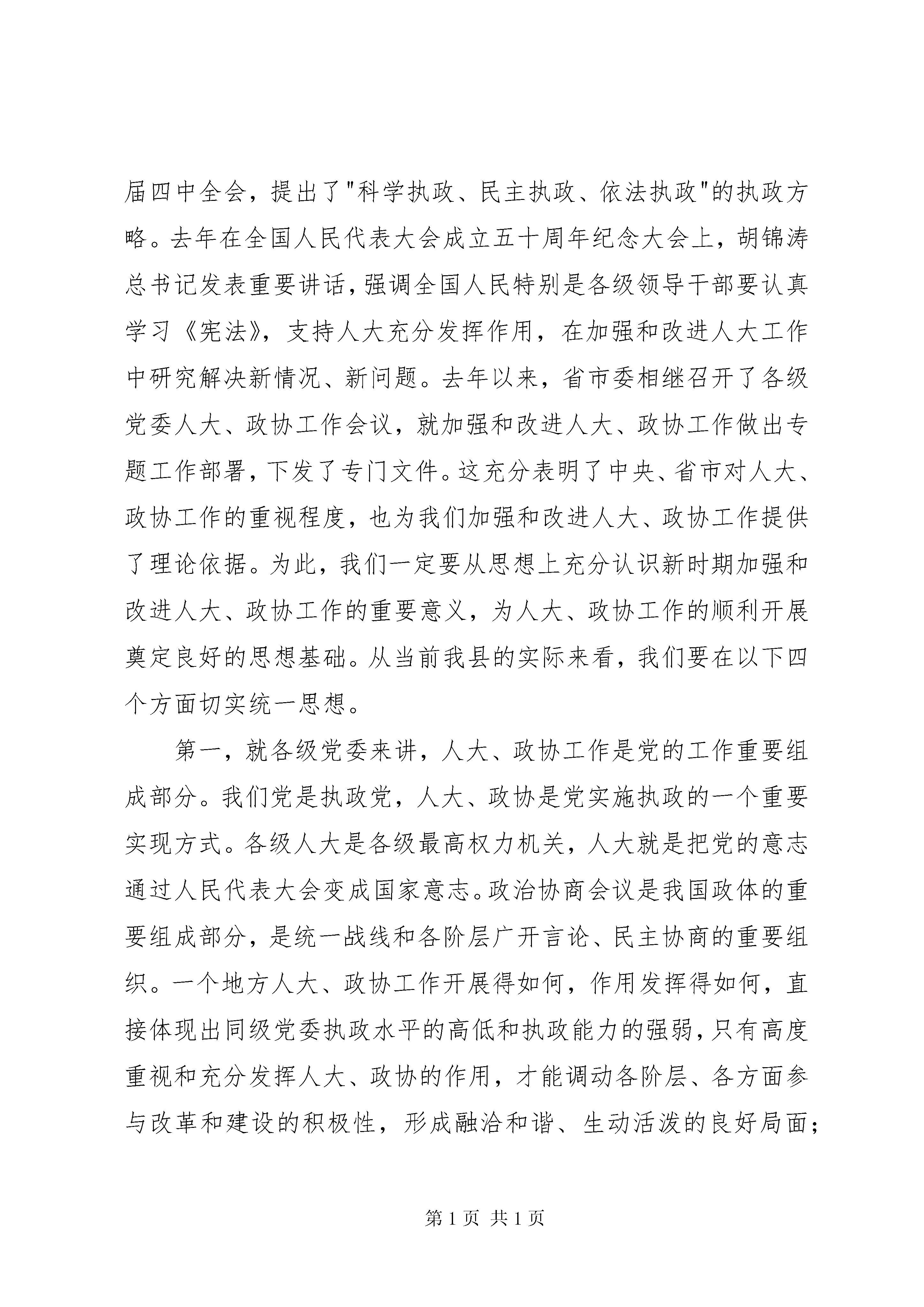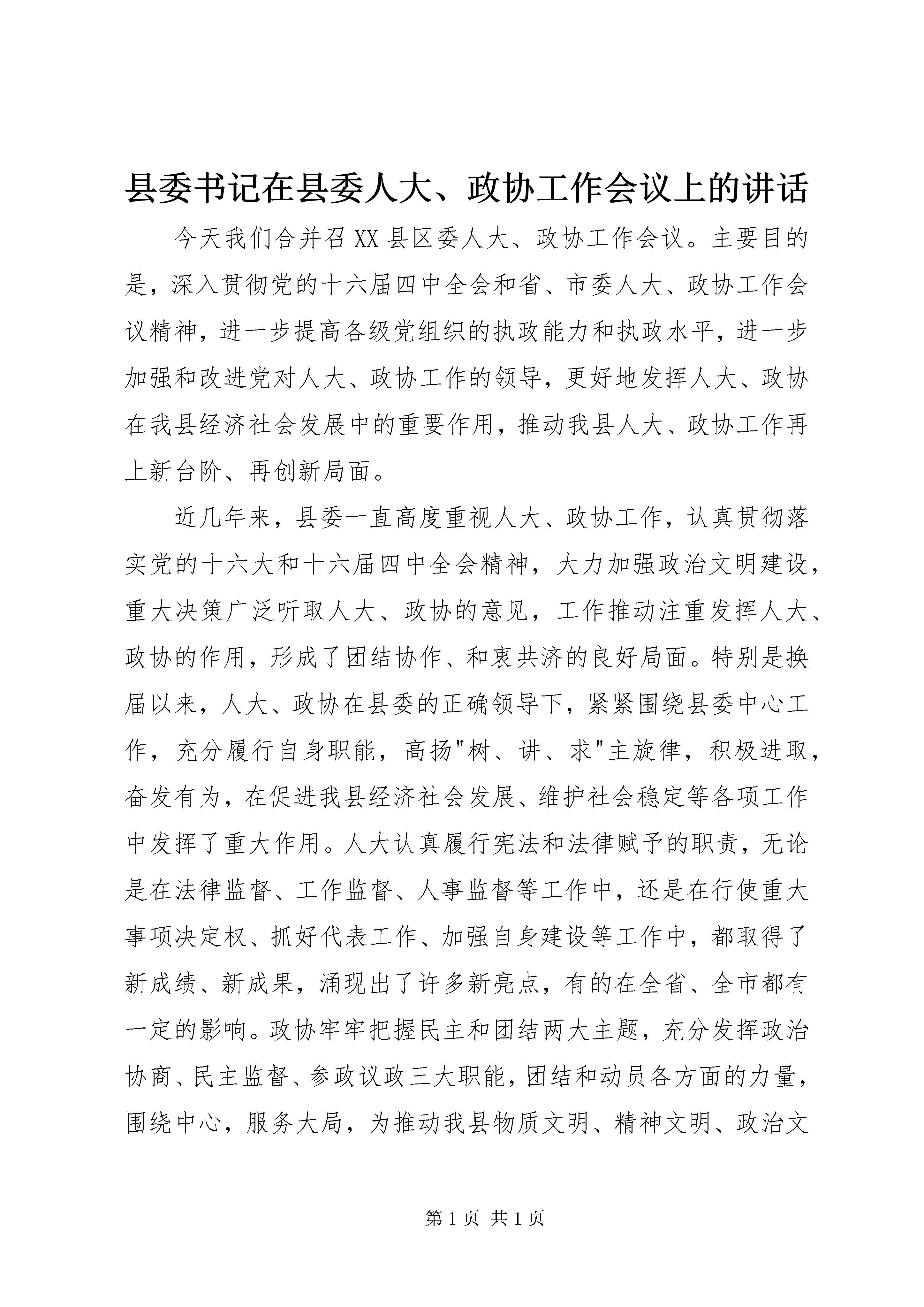 县委书记在县委人大、政协工作会议上的讲话今天我们合并召XX县区委人大、政协工作会议。主要目的是,深入贯彻党的十六届四中全会和省、市委人大、政协工作会议精神,进一步提高各级党组织的执政能力和执政水平,进一步加强和改进党对人大、政协工作的领导,更好地发挥人大、政协在我县经济社会发展中的重要作用,推动我县人大、政协工作再上新台阶、再创新局面。近几年来,县委一直高度重视人大、政协工作,认真贯彻落实党的十六大和十六届四中全会精神,大力加强政治文明建设,重大决策广泛听取人大、政协的意见,工作推动注重发挥人大、政协的作用,形成了团结协作、和衷共济的良好局面。特别是换届以来,人大、政协在县委的正确领导下,紧紧围绕县委中心工作,充分履行自身职能,高扬"树、讲、求"主旋律,积极进取,奋发有为,在促进我县经济社会发展、维护社会稳定等各项工作中发挥了重大作用。人大认真履行宪法和法律赋予的职责,无论是在法律监督、工作监督、人事监督等工作中,还是在行使重大事项决定权、抓好代表工作、加强自身建设等工作中,都取得了新成绩、新成果,涌现出了许多新亮点,有的在全省、全市都有一定的影响。政协牢牢把握民主和团结两大主题,充分发挥政治协商、民主监督、参政议政三大职能,团结和动员各方面的力量,围绕中心,服务大局,为推动我县物质文明、精神文明、政治文明的协调发展做出了积极贡献。特别是在抗击非典、农业税征收、招商引资、项目建设、文明生态村建设、解决群众关注的热点焦点等重大活动和问题上,人大、政协不畏难、不避险、不旁观,充分发挥自身职能优势,积极工作,开拓进取,取得了突出成绩,有力支持了政府工作,为县委保了驾、护了航。对此,县委是满意的,群众是满意的。随着社会主义政治文明建设的深入推进,人大、政协工作也需要与时俱进、不断加强。我们这次会议就是加强和改进人大、政协工作的一个重要步骤。对开好这次会议,县委非常重视。会上,县委还印发了《关于加强和改进人大工作的若干意见》和《关于进一步加强和改进人民政协工作的意见》。印发前,反复征求了各方面意见,县委常委会进行了专门研究,是当前及今后一个时期加强和改进党对人大、政协工作领导的纲领性文件。我们要认真学习,深刻领会,全面落实。一会儿,福秋主任、志超县长、国栋主席还要做重要讲话,下面,我代表县委讲四点意见。一、要站在加强执政能力建设和政治文明建设的高度,真正重视人大、政协工作加强和改进人大、政协工作,是发展社会主义民主政治,建设社会主义政治文明的根本途径,是巩固党的执政地位,加强党的执政能力建设,推进我们党科学执政、民主执政、依法执政的重要保证。党的十六大,明确提出建设社会主义政治文明;十六届四中全会,提出了"科学执政、民主执政、依法执政"的执政方略。去年在全国人民代表大会成立五十周年纪念大会上,胡锦涛总书记发表重要讲话,强调全国人民特别是各级领导干部要认真学习《宪法》,支持人大充分发挥作用,在加强和改进人大工作中研究解决新情况、新问题。去年以来,省市委相继召开了各级党委人大、政协工作会议,就加强和改进人大、政协工作做出专题工作部署,下发了专门文件。这充分表明了中央、省市对人大、政协工作的重视程度,也为我们加强和改进人大、政协工作提供了理论依据。为此,我们一定要从思想上充分认识新时期加强和改进人大、政协工作的重要意义,为人大、政协工作的顺利开展奠定良好的思想基础。从当前我县的实际来看,我们要在以下四个方面切实统一思想。第一,就各级党委来讲,人大、政协工作是党的工作重要组成部分。我们党是执政党,人大、政协是党实施执政的一个重要实现方式。各级人大是各级最高权力机关,人大就是把党的意志通过人民代表大会变成国家意志。政治协商会议是我国政体的重要组成部分,是统一战线和各阶层广开言论、民主协商的重要组织。一个地方人大、政协工作开展得如何,作用发挥得如何,直接体现出同级党委执政水平的高低和执政能力的强弱,只有高度重视和充分发挥人大、政协的作用,才能调动各阶层、各方面参与改革和建设的积极性,形成融洽和谐、生动活泼的良好局面;才能广开言路,集思广益,促进党执政的科学性、民主性,避免和减少失误;才能使党的主张和决策具有法定的约束力和强制力,更好地得到贯彻执行。可以说,支持人大和政协工作,就是加强党的领导;树立人大、政协的权威,就是树立党的执政权威;发挥人大、政协的作用,就是推进科学执政、民主执政和依法执政。因此,各级党委必须增强人大、政协意识,把坚持党的领导、人民当家作主、依法治国、民主执政有机结合起来,把人大、政协工作摆在全局工作的重要位置,列入总体布局,统一部署,统一检查,统一督促落实,为人大、政协履行好职责创造一个良好的工作环境。第二,从工作性质来看,人大、政协工作的根本出发点和党委工作是高度一致的。人大、政协工作,虽然工作性质
