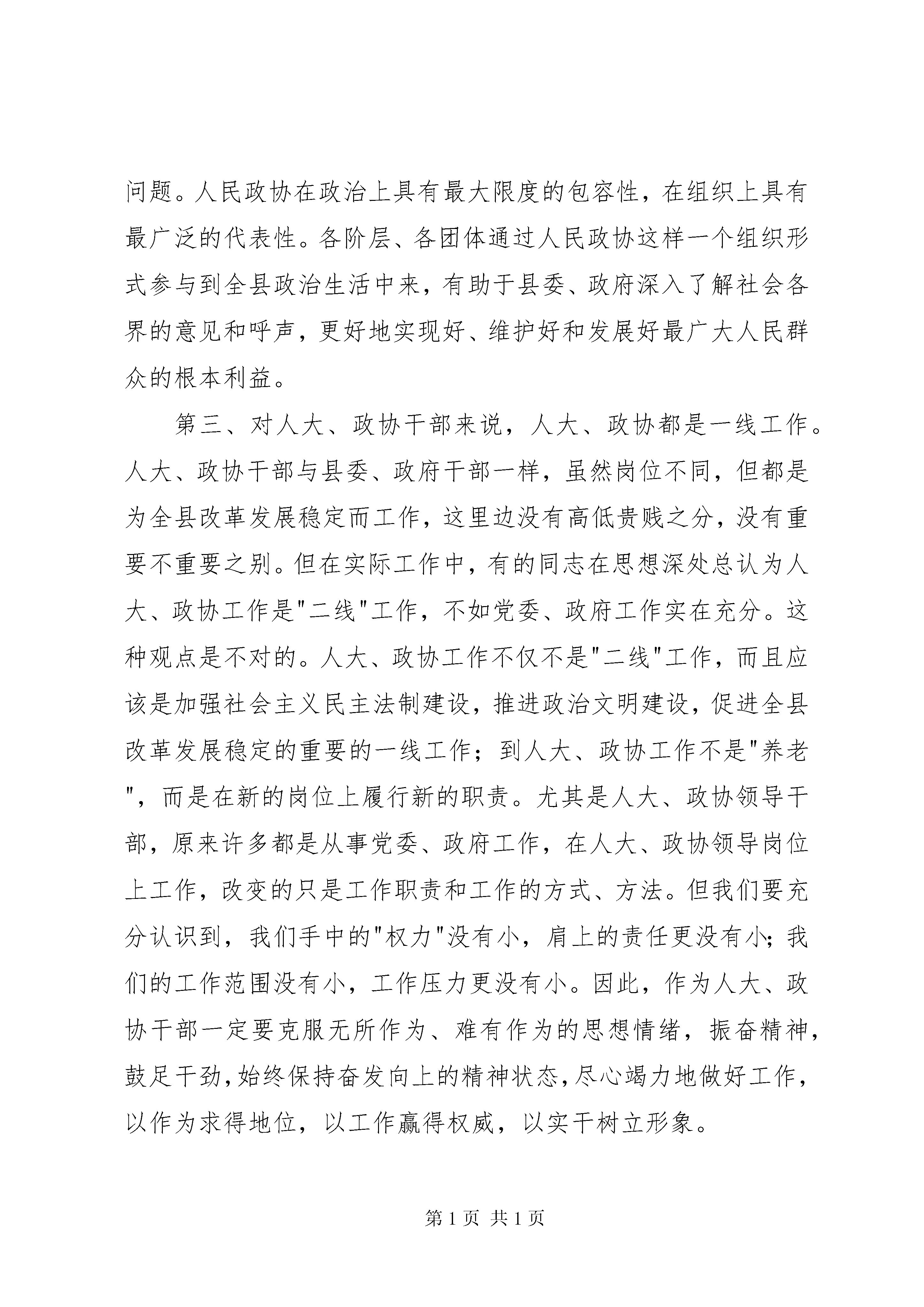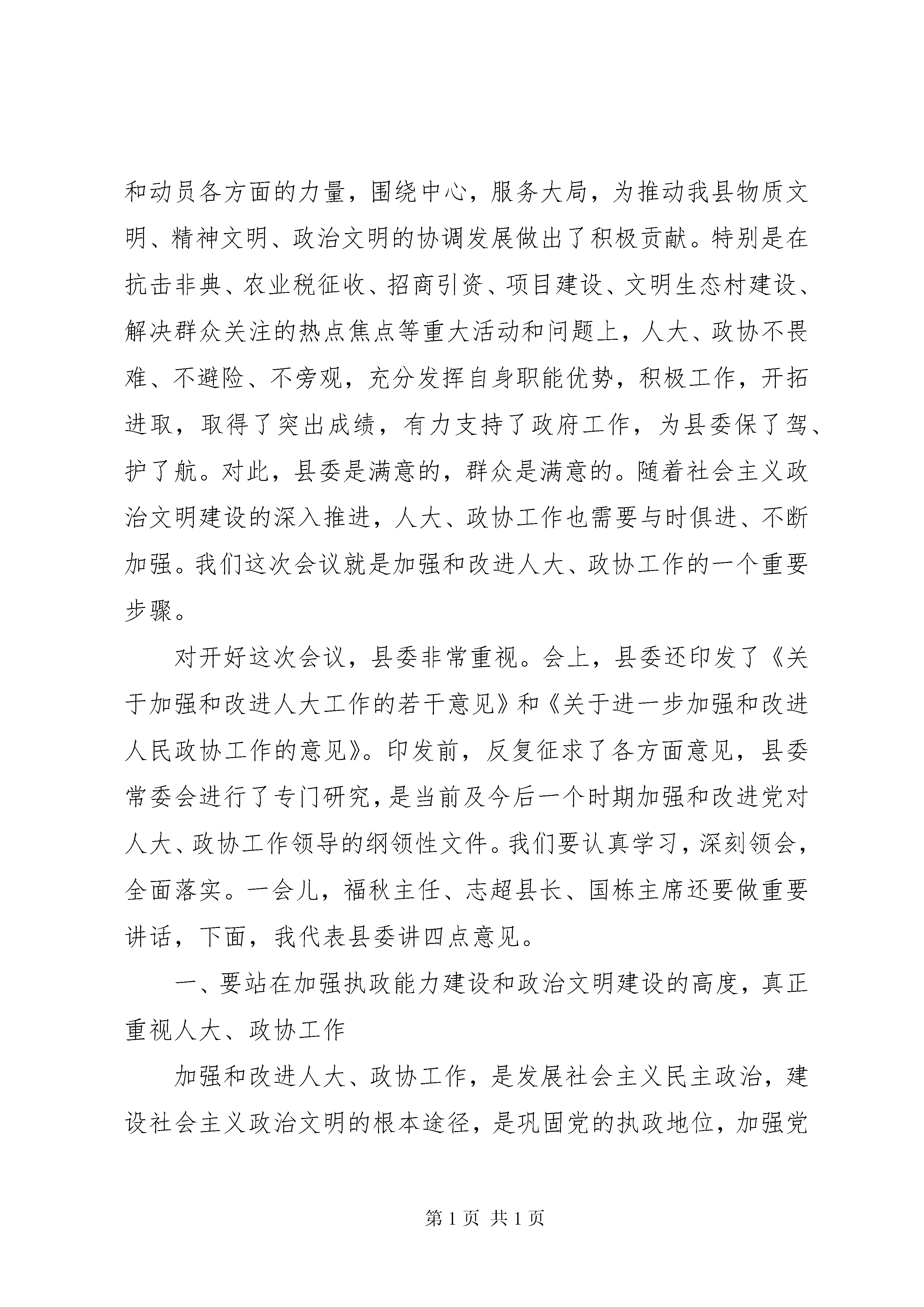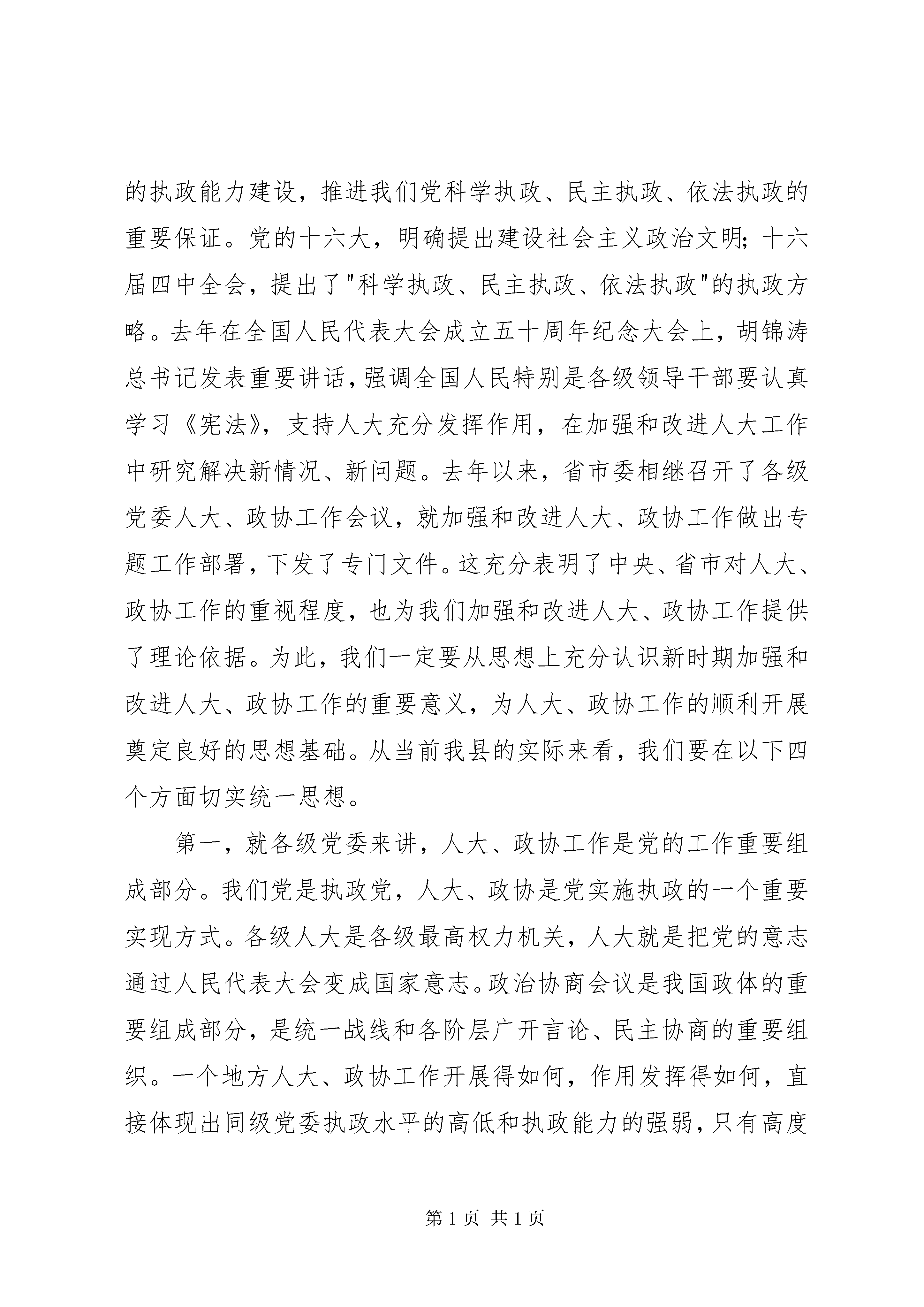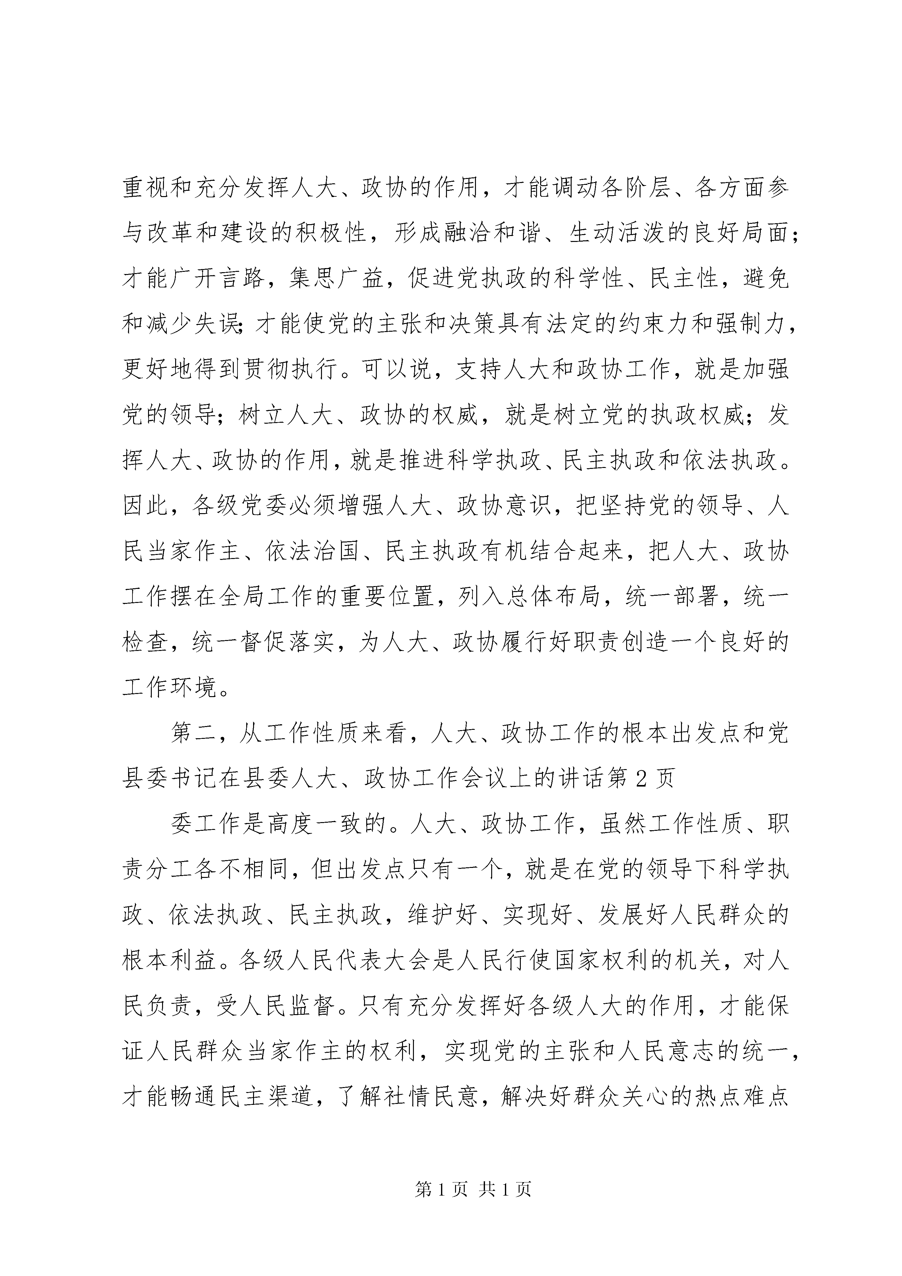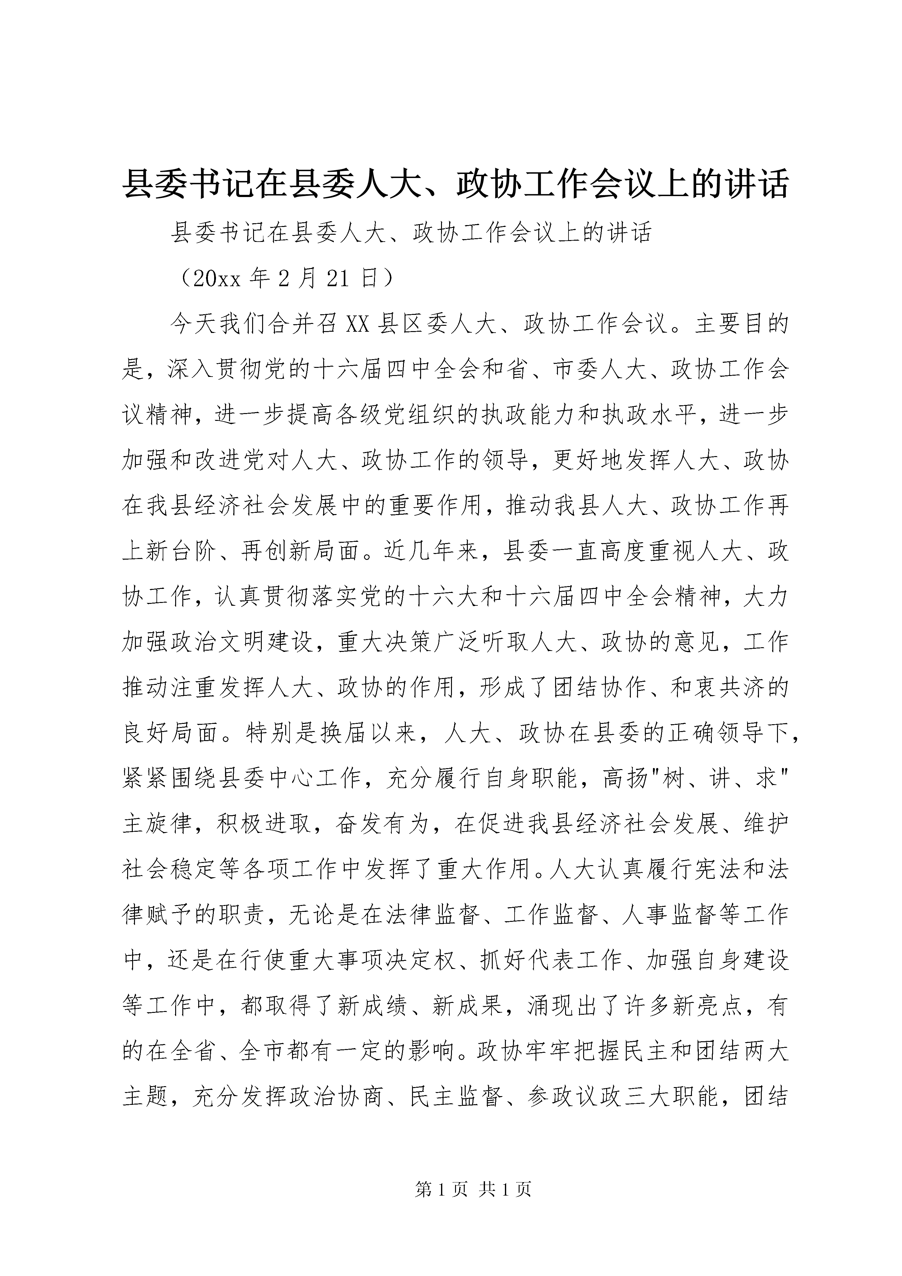 县委书记在县委人大、政协工作会议上的讲话县委书记在县委人大、政协工作会议上的讲话(20xx年2月21日)今天我们合并召XX县区委人大、政协工作会议。主要目的是,深入贯彻党的十六届四中全会和省、市委人大、政协工作会议精神,进一步提高各级党组织的执政能力和执政水平,进一步加强和改进党对人大、政协工作的领导,更好地发挥人大、政协在我县经济社会发展中的重要作用,推动我县人大、政协工作再上新台阶、再创新局面。近几年来,县委一直高度重视人大、政协工作,认真贯彻落实党的十六大和十六届四中全会精神,大力加强政治文明建设,重大决策广泛听取人大、政协的意见,工作推动注重发挥人大、政协的作用,形成了团结协作、和衷共济的良好局面。特别是换届以来,人大、政协在县委的正确领导下,紧紧围绕县委中心工作,充分履行自身职能,高扬"树、讲、求"主旋律,积极进取,奋发有为,在促进我县经济社会发展、维护社会稳定等各项工作中发挥了重大作用。人大认真履行宪法和法律赋予的职责,无论是在法律监督、工作监督、人事监督等工作中,还是在行使重大事项决定权、抓好代表工作、加强自身建设等工作中,都取得了新成绩、新成果,涌现出了许多新亮点,有的在全省、全市都有一定的影响。政协牢牢把握民主和团结两大主题,充分发挥政治协商、民主监督、参政议政三大职能,团结和动员各方面的力量,围绕中心,服务大局,为推动我县物质文明、精神文明、政治文明的协调发展做出了积极贡献。特别是在抗击非典、农业税征收、招商引资、项目建设、文明生态村建设、解决群众关注的热点焦点等重大活动和问题上,人大、政协不畏难、不避险、不旁观,充分发挥自身职能优势,积极工作,开拓进取,取得了突出成绩,有力支持了政府工作,为县委保了驾、护了航。对此,县委是满意的,群众是满意的。随着社会主义政治文明建设的深入推进,人大、政协工作也需要与时俱进、不断加强。我们这次会议就是加强和改进人大、政协工作的一个重要步骤。对开好这次会议,县委非常重视。会上,县委还印发了《关于加强和改进人大工作的若干意见》和《关于进一步加强和改进人民政协工作的意见》。印发前,反复征求了各方面意见,县委常委会进行了专门研究,是当前及今后一个时期加强和改进党对人大、政协工作领导的纲领性文件。我们要认真学习,深刻领会,全面落实。一会儿,福秋主任、志超县长、国栋主席还要做重要讲话,下面,我代表县委讲四点意见。一、要站在加强执政能力建设和政治文明建设的高度,真正重视人大、政协工作加强和改进人大、政协工作,是发展社会主义民主政治,建设社会主义政治文明的根本途径,是巩固党的执政地位,加强党的执政能力建设,推进我们党科学执政、民主执政、依法执政的重要保证。党的十六大,明确提出建设社会主义政治文明;十六届四中全会,提出了"科学执政、民主执政、依法执政"的执政方略。去年在全国人民代表大会成立五十周年纪念大会上,胡锦涛总书记发表重要讲话,强调全国人民特别是各级领导干部要认真学习《宪法》,支持人大充分发挥作用,在加强和改进人大工作中研究解决新情况、新问题。去年以来,省市委相继召开了各级党委人大、政协工作会议,就加强和改进人大、政协工作做出专题工作部署,下发了专门文件。这充分表明了中央、省市对人大、政协工作的重视程度,也为我们加强和改进人大、政协工作提供了理论依据。为此,我们一定要从思想上充分认识新时期加强和改进人大、政协工作的重要意义,为人大、政协工作的顺利开展奠定良好的思想基础。从当前我县的实际来看,我们要在以下四个方面切实统一思想。第一,就各级党委来讲,人大、政协工作是党的工作重要组成部分。我们党是执政党,人大、政协是党实施执政的一个重要实现方式。各级人大是各级最高权力机关,人大就是把党的意志通过人民代表大会变成国家意志。政治协商会议是我国政体的重要组成部分,是统一战线和各阶层广开言论、民主协商的重要组织。一个地方人大、政协工作开展得如何,作用发挥得如何,直接体现出同级党委执政水平的高低和执政能力的强弱,只有高度重视和充分发挥人大、政协的作用,才能调动各阶层、各方面参与改革和建设的积极性,形成融洽和谐、生动活泼的良好局面;才能广开言路,集思广益,促进党执政的科学性、民主性,避免和减少失误;才能使党的主张和决策具有法定的约束力和强制力,更好地得到贯彻执行。可以说,支持人大和政协工作,就是加强党的领导;树立人大、政协的权威,就是树立党的执政权威;发挥人大、政协的作用,就是推进科学执政、民主执政和依法执政。因此,各级党委必须增强人大、政协意识,把坚持党的领导、人民当家作主、依法治国、民主执政有机结合起来,把人大、政协工作摆在全局工作的重要位置,列入总体布局,统一部署,统一检查,统一督促落实,为人大、政协履行好职责创造一个良好的工作环境。第二,从工作性质来看,人大、政协工作