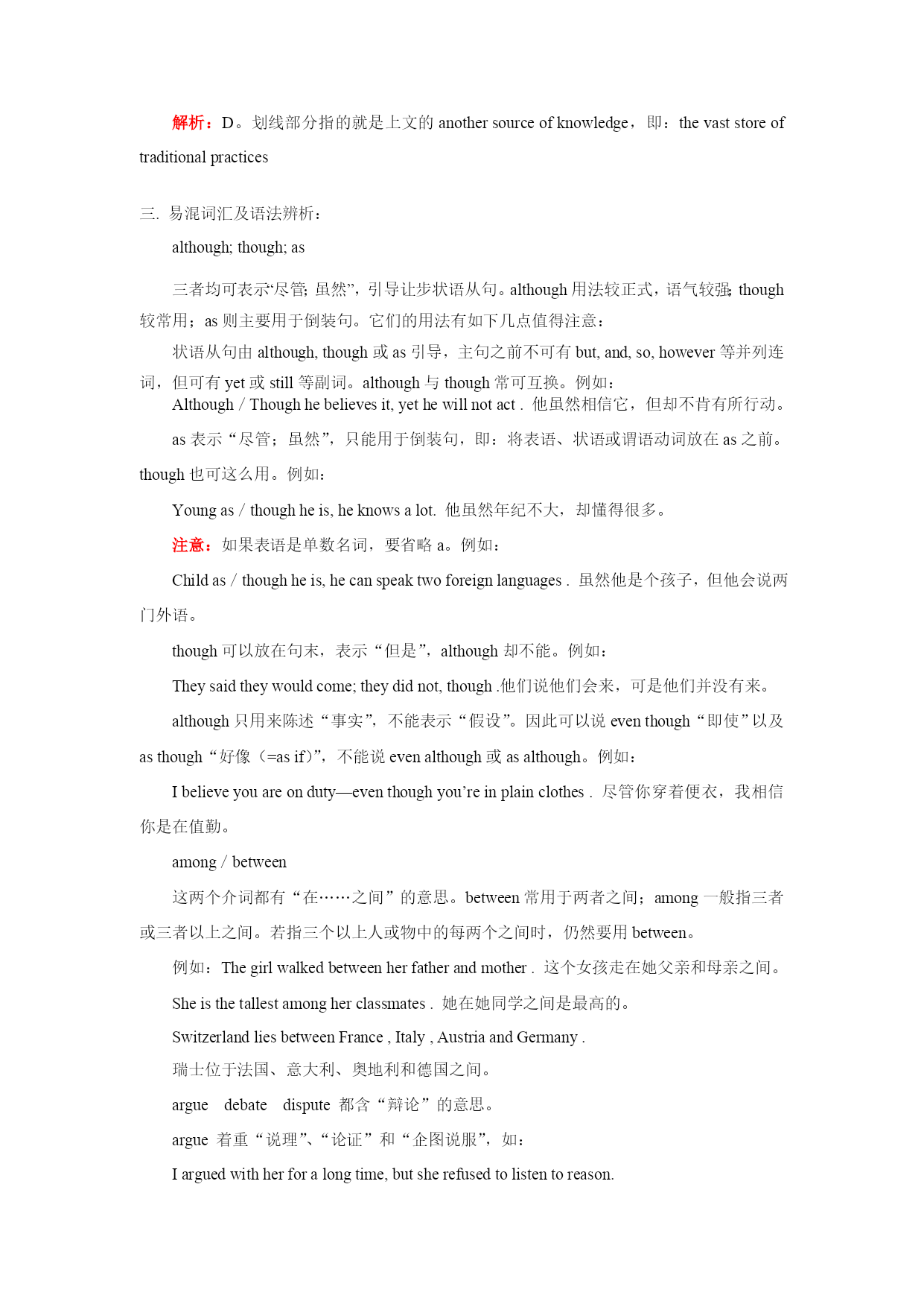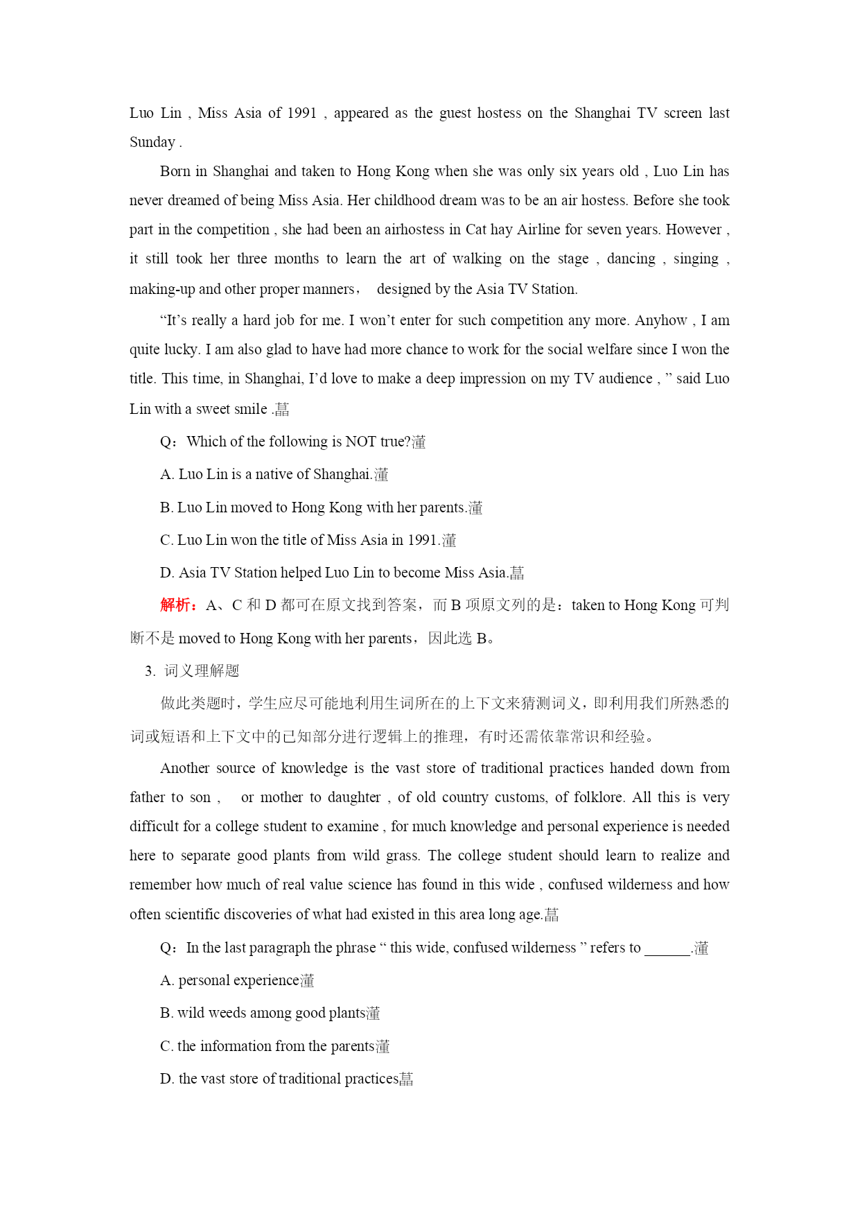 高一英语寒假专题三外研社 【本讲教育信息】 一.教学内容: 寒假专题三 阅读技巧二:英语阅读理解解析 二.事实题: 在阅读理解题中,又有相当一部分属于事实或细节题,下面仅就这类题的正确解法作简要说明。 1.直接事实题 在解答这类问题时要求学生抓住题干文字信息,采用针对性方法进行阅读,因为这类题的答案在文章中可以直接找到。 AgiantdamwasbuiltmanyyearsagotocontroltheColoradoRiverintheU.S.Thisdamwasbuilttoprotectthelandandhousesaroundtheriver. ThishugedamisintheBlackCanyon.Itispossibletodriveacarfromonesideoftherivertotheotheronaroad,whichisonthetopofthedam.Thisdamissobigthatthereisanelevatorinside.Theelevatorgoesdownforty-fourstoriesfromtheroadtothebottom.ThereisenoughconcreteinthisdamtobuildahighwayfromNewYorktoSanFrancisco.Thousandsofpeopleworkedonthisdamforfiveyears. ThishugedamwascalledBoulderDamwhenitwasfinishedin1936.LateritwasrenamedHooverDaminhonorofapresidentoftheUnitedStates.HooverDam,oneofthehighestdamsintheworld,issituatedbetweenthestatesofArizonaandNevada. Q:HooverDamlies______. A.betweenArizonaandNevada B.intheBlackCanyon C.betweenNewYorkandSanFrancisco D.bothAandB 解析:由第二段的第一句话和最后一段的最后一句话可得出正确答案。 2.间接事实题 解此类题需要结合上下文提供的语境和信息进行简单的概括和判断。 InvitedbyMr.YeHuixian,hostofthewellreceivedTVprogramme“StarsTonight”,MissLuoLin,MissAsiaof1991,appearedastheguesthostessontheShanghaiTVscreenlastSunday. BorninShanghaiandtakentoHongKongwhenshewasonlysixyearsold,LuoLinhasneverdreamedofbeingMissAsia.Herchildhooddreamwastobeanairhostess.Beforeshetookpartinthecompetition,shehadbeenanairhostessinCathayAirlineforsevenyears.However,itstilltookherthreemonthstolearntheartofwalkingonthestage,dancing,singing,making-upandotherpropermanners,designedbytheAsiaTVStation. “It’sreallyahardjobforme.Iwon’tenterforsuchcompetitionanymore.Anyhow,Iamquitelucky.IamalsogladtohavehadmorechancetoworkforthesocialwelfaresinceIwonthetitle.Thistime,inShanghai,I’dlovetomakeadeepimpressiononmyTVaudience,”saidLuoLinwithasweetsmile. Q:WhichofthefollowingisNOTtrue? A.LuoLinisanativeofShanghai. B.LuoLinmovedtoHongKongwithherparents. C.LuoLinwonthetitleofMissAsiain1991. D.AsiaTVStationhelpedLuoLintobecomeMissAsia. 解析:A、C和D都可在原文找到答案,而B项原文列的是:takentoHongKong