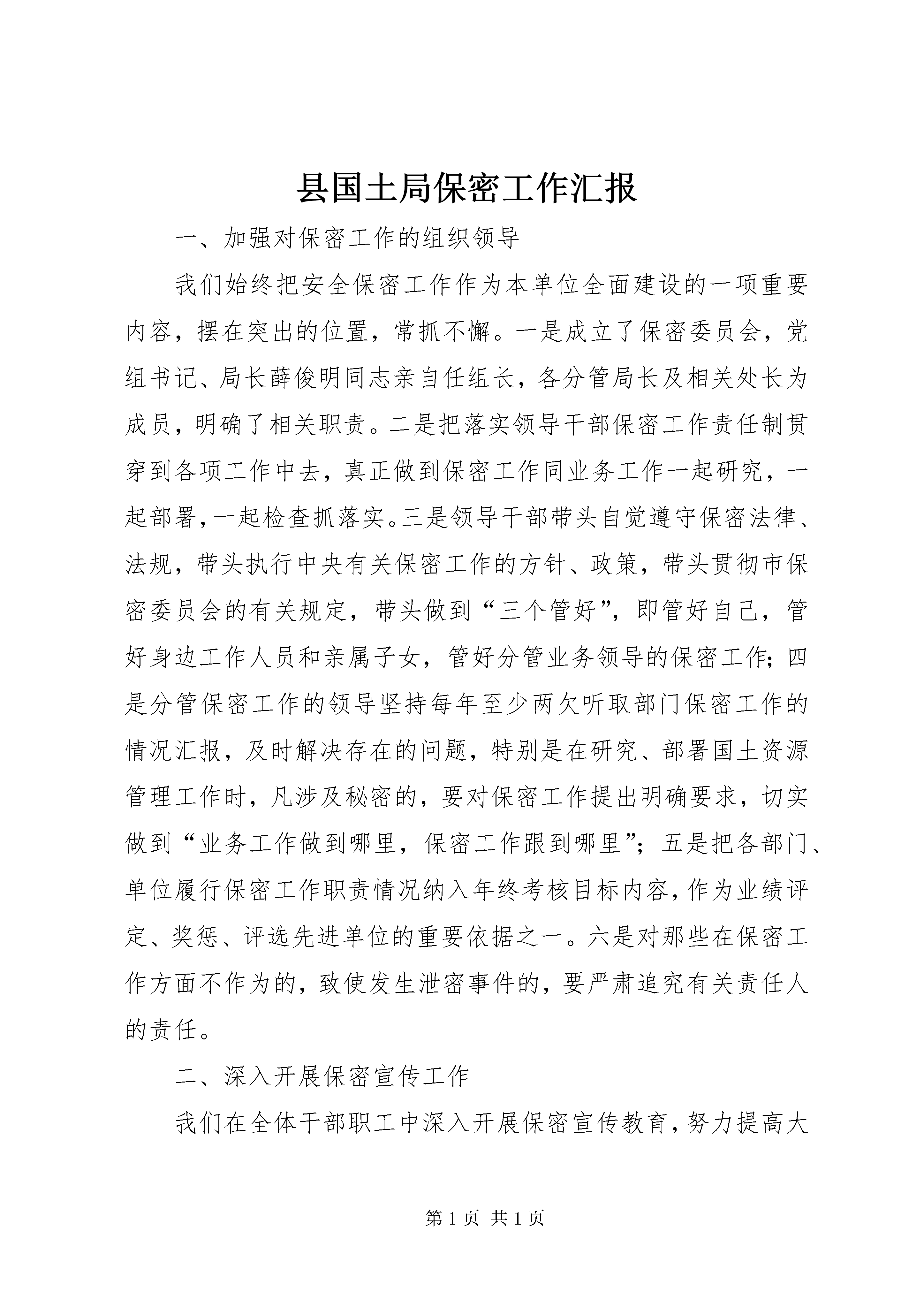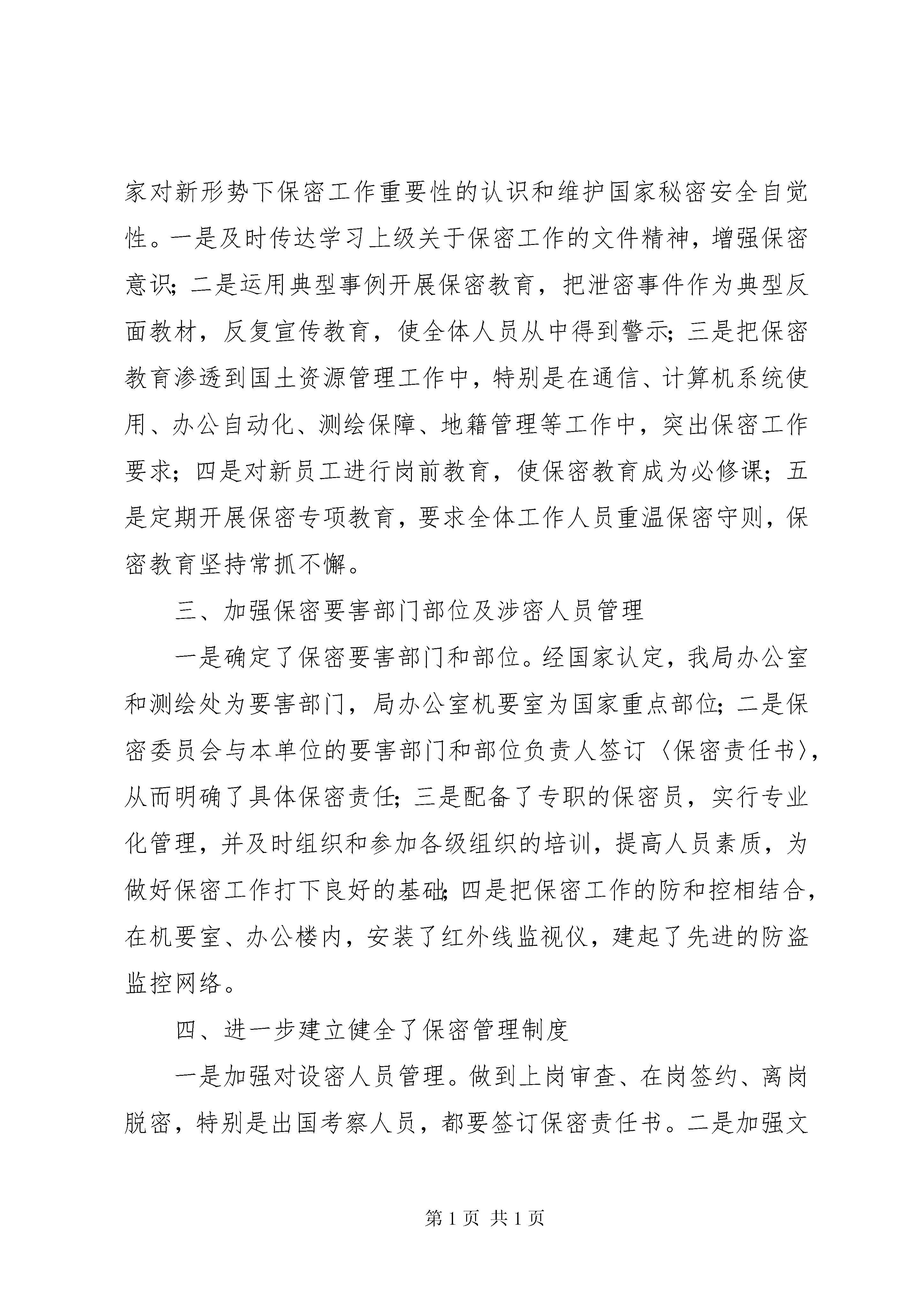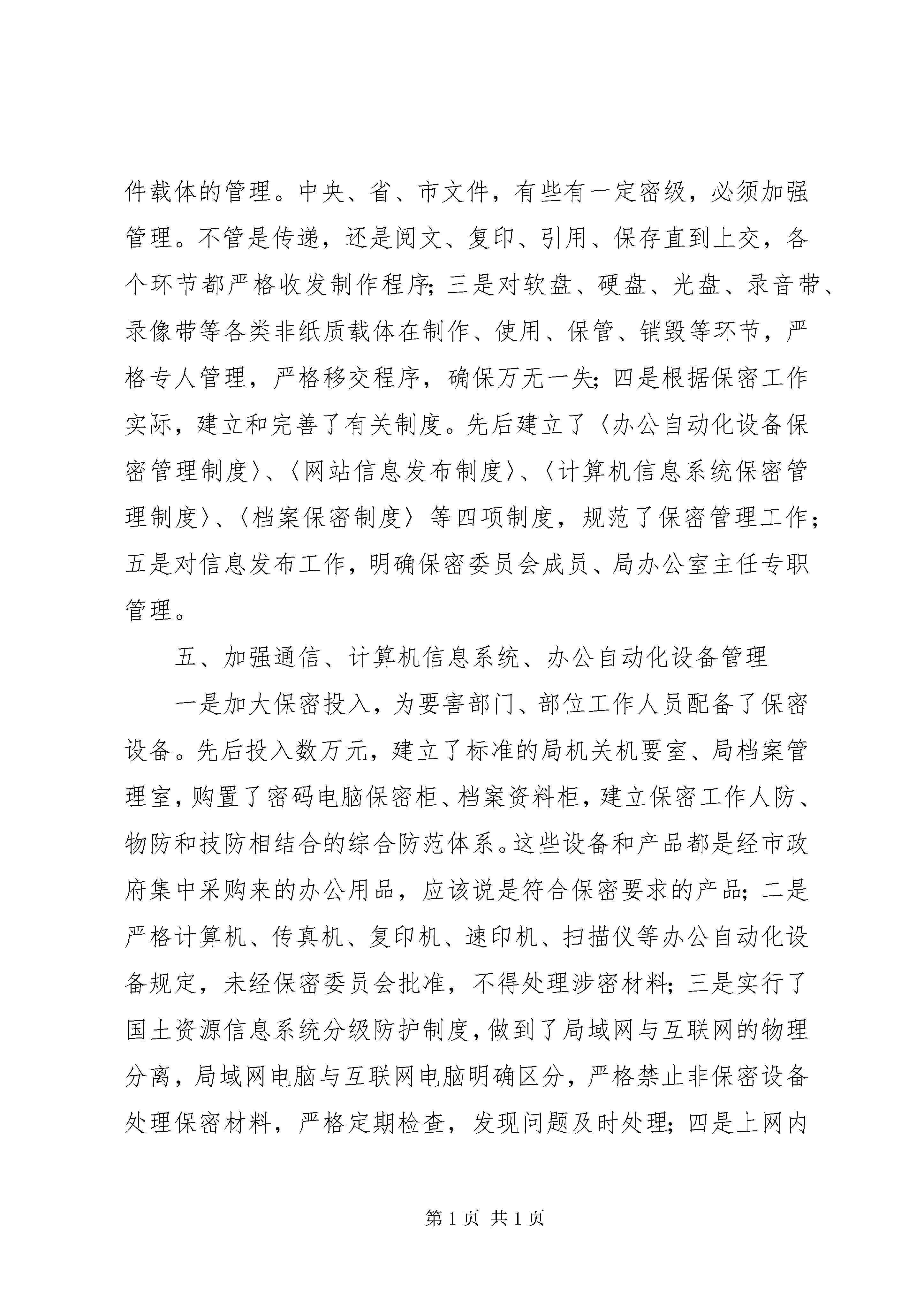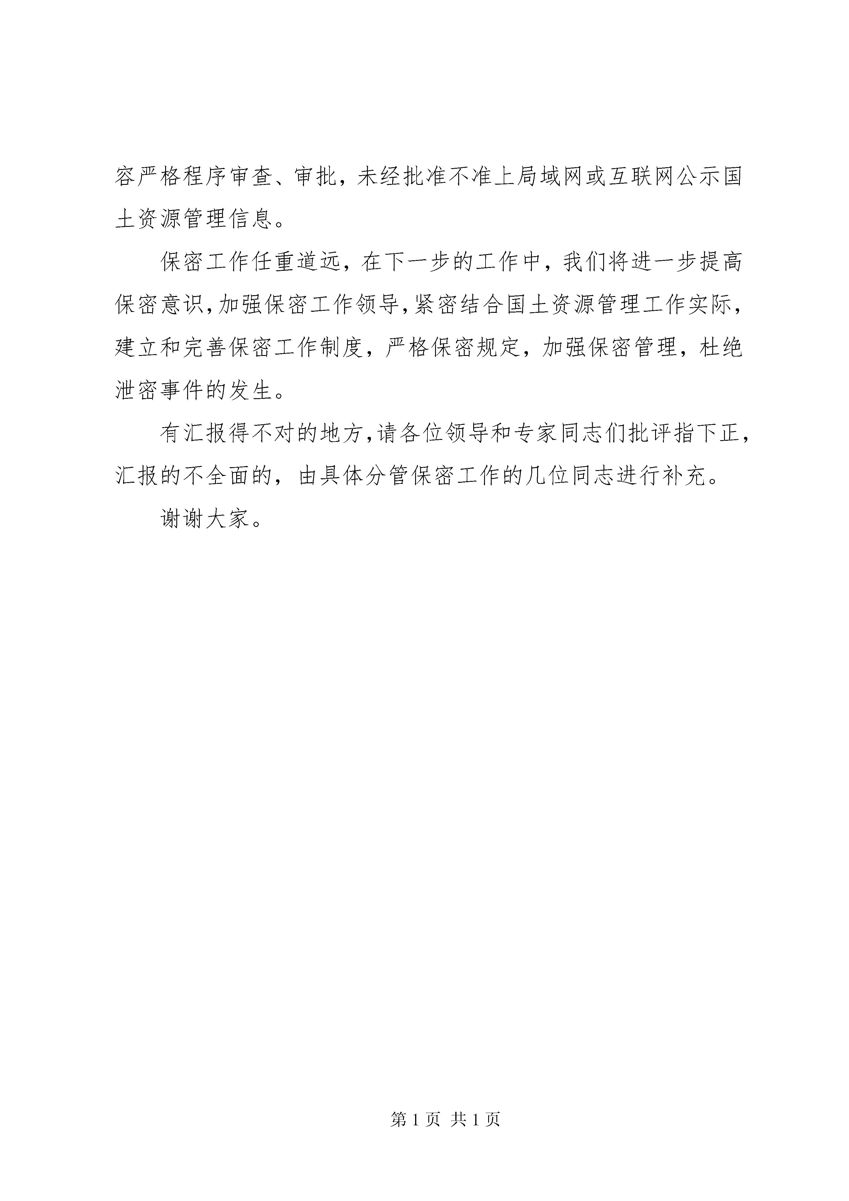 县国土局保密工作汇报一、加强对保密工作的组织领导我们始终把安全保密工作作为本单位全面建设的一项重要内容,摆在突出的位置,常抓不懈。一是成立了保密委员会,党组书记、局长薛俊明同志亲自任组长,各分管局长及相关处长为成员,明确了相关职责。二是把落实领导干部保密工作责任制贯穿到各项工作中去,真正做到保密工作同业务工作一起研究,一起部署,一起检查抓落实。三是领导干部带头自觉遵守保密法律、法规,带头执行中央有关保密工作的方针、政策,带头贯彻市保密委员会的有关规定,带头做到“三个管好”,即管好自己,管好身边工作人员和亲属子女,管好分管业务领导的保密工作;四是分管保密工作的领导坚持每年至少两欠听取部门保密工作的情况汇报,及时解决存在的问题,特别是在研究、部署国土资源管理工作时,凡涉及秘密的,要对保密工作提出明确要求,切实做到“业务工作做到哪里,保密工作跟到哪里”;五是把各部门、单位履行保密工作职责情况纳入年终考核目标内容,作为业绩评定、奖惩、评选先进单位的重要依据之一。六是对那些在保密工作方面不作为的,致使发生泄密事件的,要严肃追究有关责任人的责任。二、深入开展保密宣传工作我们在全体干部职工中深入开展保密宣传教育,努力提高大家对新形势下保密工作重要性的认识和维护国家秘密安全自觉性。一是及时传达学习上级关于保密工作的文件精神,增强保密意识;二是运用典型事例开展保密教育,把泄密事件作为典型反面教材,反复宣传教育,使全体人员从中得到警示;三是把保密教育渗透到国土资源管理工作中,特别是在通信、计算机系统使用、办公自动化、测绘保障、地籍管理等工作中,突出保密工作要求;四是对新员工进行岗前教育,使保密教育成为必修课;五是定期开展保密专项教育,要求全体工作人员重温保密守则,保密教育坚持常抓不懈。三、加强保密要害部门部位及涉密人员管理一是确定了保密要害部门和部位。经国家认定,我局办公室和测绘处为要害部门,局办公室机要室为国家重点部位;二是保密委员会与本单位的要害部门和部位负责人签订〈保密责任书〉,从而明确了具体保密责任;三是配备了专职的保密员,实行专业化管理,并及时组织和参加各级组织的培训,提高人员素质,为做好保密工作打下良好的基础;四是把保密工作的防和控相结合,在机要室、办公楼内,安装了红外线监视仪,建起了先进的防盗监控网络。四、进一步建立健全了保密管理制度一是加强对设密人员管理。做到上岗审查、在岗签约、离岗脱密,特别是出国考察人员,都要签订保密责任书。二是加强文件载体的管理。中央、省、市文件,有些有一定密级,必须加强管理。不管是传递,还是阅文、复印、引用、保存直到上交,各个环节都严格收发制作程序;三是对软盘、硬盘、光盘、录音带、录像带等各类非纸质载体在制作、使用、保管、销毁等环节,严格专人管理,严格移交程序,确保万无一失;四是根据保密工作实际,建立和完善了有关制度。先后建立了〈办公自动化设备保密管理制度〉、〈网站信息发布制度〉、〈计算机信息系统保密管理制度〉、〈档案保密制度〉等四项制度,规范了保密管理工作;五是对信息发布工作,明确保密委员会成员、局办公室主任专职管理。五、加强通信、计算机信息系统、办公自动化设备管理一是加大保密投入,为要害部门、部位工作人员配备了保密设备。先后投入数万元,建立了标准的局机关机要室、局档案管理室,购置了密码电脑保密柜、档案资料柜,建立保密工作人防、物防和技防相结合的综合防范体系。这些设备和产品都是经市政府集中采购来的办公用品,应该说是符合保密要求的产品;二是严格计算机、传真机、复印机、速印机、扫描仪等办公自动化设备规定,未经保密委员会批准,不得处理涉密材料;三是实行了国土资源信息系统分级防护制度,做到了局域网与互联网的物理分离,局域网电脑与互联网电脑明确区分,严格禁止非保密设备处理保密材料,严格定期检查,发现问题及时处理;四是上网内容严格程序审查、审批,未经批准不准上局域网或互联网公示国土资源管理信息。保密工作任重道远,在下一步的工作中,我们将进一步提高保密意识,加强保密工作领导,紧密结合国土资源管理工作实际,建立和完善保密工作制度,严格保密规定,加强保密管理,杜绝泄密事件的发生。有汇报得不对的地方,请各位领导和专家同志们批评指下正,汇报的不全面的,由具体分管保密工作的几位同志进行补充。谢谢大家。