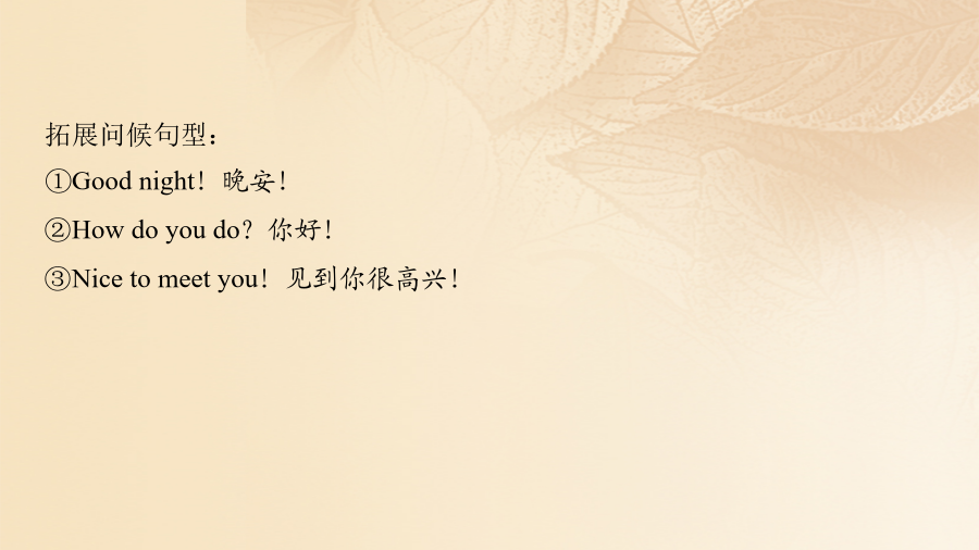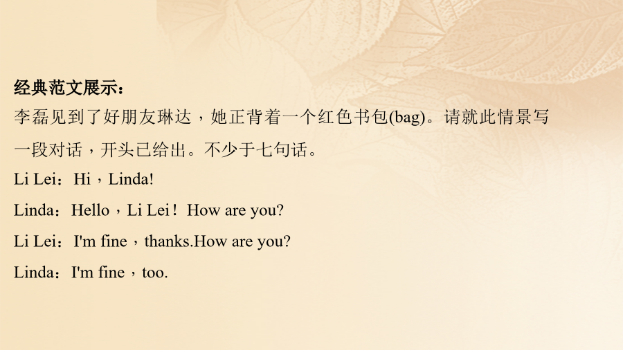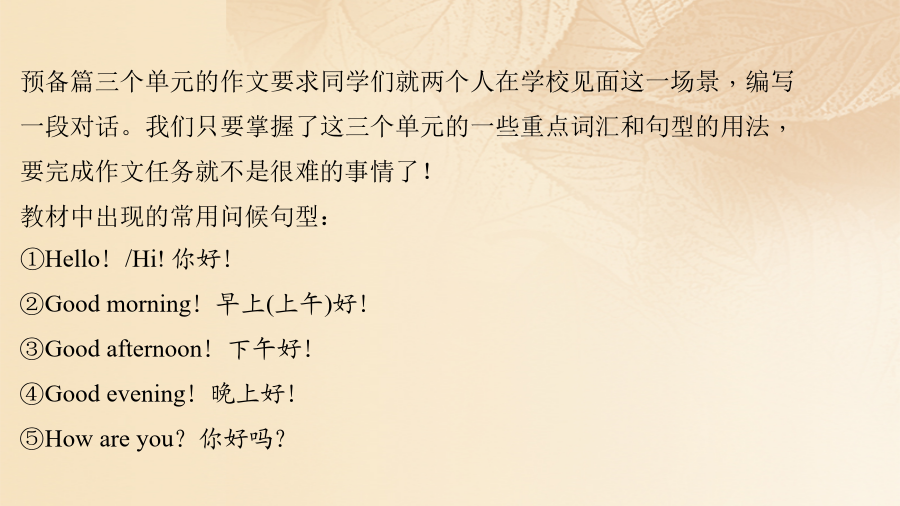 预备篇同步作文指导预备篇三个单元的作文要求同学们就两个人在学校见面这一场景,编写一段对话。我们只要掌握了这三个单元的一些重点词汇和句型的用法,要完成作文任务就不是很难的事情了! 教材中出现的常用问候句型: ①Hello!/Hi!你好! ②Goodmorning!早上(上午)好! ③Goodafternoon!下午好! ④Goodevening!晚上好! ⑤Howareyou?你好吗?拓展问候句型: ①Goodnight!晚安! ②Howdoyoudo?你好! ③Nicetomeetyou!见到你很高兴!经典范文展示: 李磊见到了好朋友琳达,她正背着一个红色书包(bag)。请就此情景写一段对话,开头已给出。不少于七句话。 LiLei:Hi,Linda! Linda:Hello,LiLei!Howareyou? LiLei:I'mfine,thanks.Howareyou? Linda:I'mfine,too.LiLei:What'sthisinEnglish? Linda:It'sabag. LiLei:Spellit,please. Linda:BAG. LiLei:Whatcolorisit? Linda:It'sred.【点评】灵活运用了表示问候的句型,题目中给出具体时间的,可用“Goodmorning/afternoon!”等,没有给出具体时间的,一般用Hi!/Hello!在对话中合理增加一些信息,使对话更加完整。多种表达方式使对话更加吸引人。热点作文练习: 今天是魔法学校开学的第一天,哈利·波特(HarryPotter)一大早在校门口遇见了好朋友简(Jane),他们互相问好。哈利为了考考简的英语学得怎么样,就变出来一个橙子,并问她这个用英语怎么表达以及如何拼写。请你就此情景用英语编写一段对话。要求不少于6句话。HarryPotter:Goodmorning,Jane! Jane:Goodmorning,Harry!Howareyou? HarryPotter:I'mfine,thanks.Howareyou? Jane:I'mfine,too. HarryPotter:What'sthisinEnglish? Jane:It'sanorange. HarryPotter:Spellit,please. Jane:ORANGE. HarryPotter:Whatcolorisit? Jane:It'sorange.预备篇常见错误诊断 病号1:therulerisyellow,alice。 【处方】英语中句首字母要大写,人名的首字母也要大写。英语中句点的写法跟汉语不同,是实心点“.”,不是汉语的句号。故原句应为:Therulerisyellow,Alice. 病号2:—Howareyou? —I'mgood. 【处方】good意为“好的,令人满意的”,常用来表示事物的质量好和人的人品好。表示“健康状况良好”时,常用fine。病号3:Thisisaorange. 【处方】a用在以辅音音素开头的单词前,an用在以元音音素开头的单词前。orange以元音音素开头,所以其前应该用an。 病号4:I'mfine,thanksyou. 【处方】英语中表示感谢用thanks或thankyou。 病号5:—What'scolorisit? —It'sred. 【处方】对颜色提问用Whatcolor...?或者用What'sthecolorof...?故此处What's应改为What。