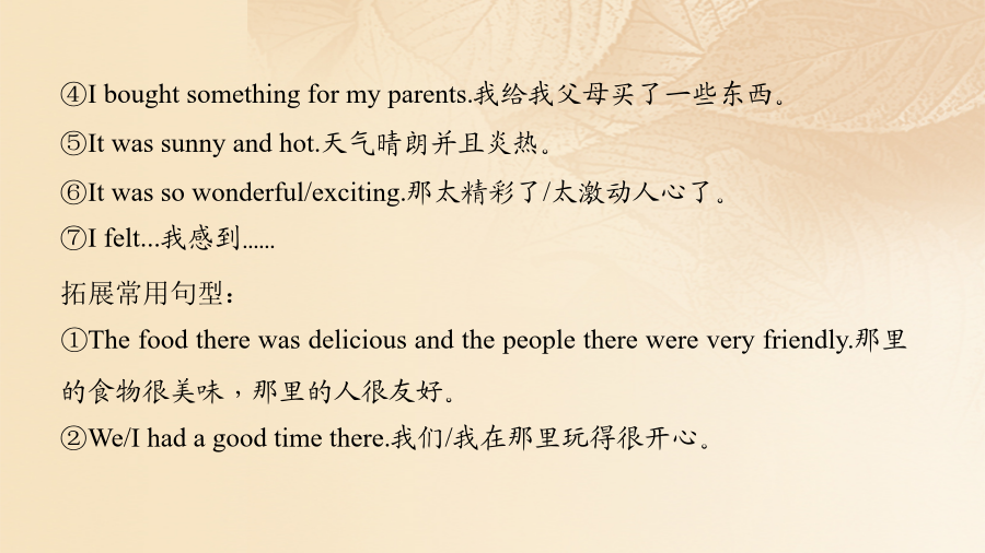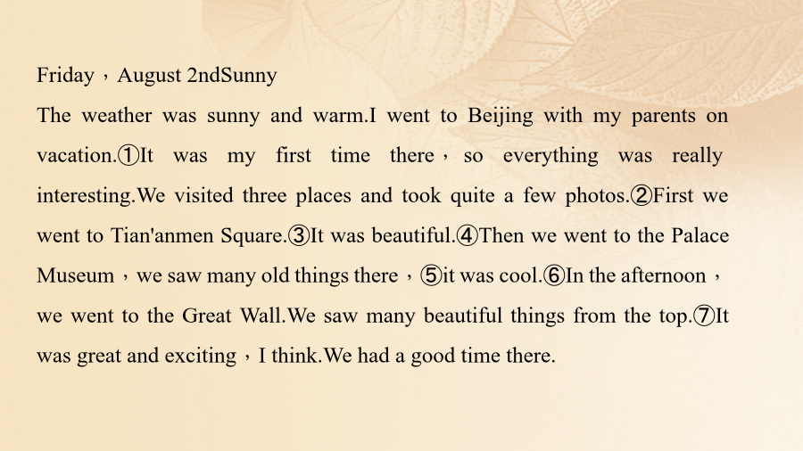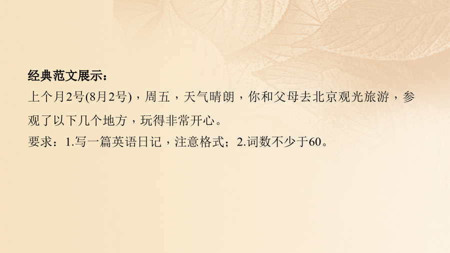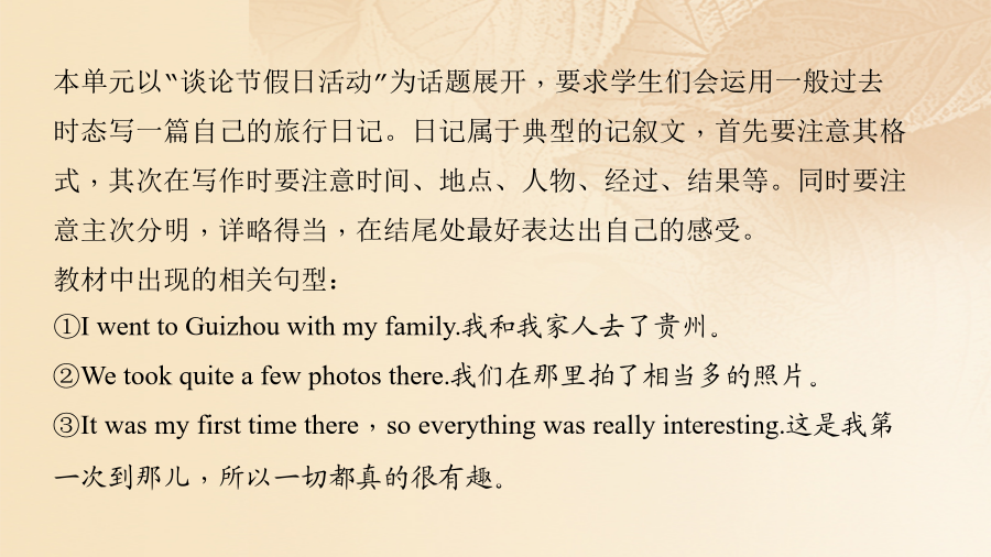 第七课时单元同步作文指导本单元以“谈论节假日活动”为话题展开,要求学生们会运用一般过去时态写一篇自己的旅行日记。日记属于典型的记叙文,首先要注意其格式,其次在写作时要注意时间、地点、人物、经过、结果等。同时要注意主次分明,详略得当,在结尾处最好表达出自己的感受。 教材中出现的相关句型: ①IwenttoGuizhouwithmyfamily.我和我家人去了贵州。 ②Wetookquiteafewphotosthere.我们在那里拍了相当多的照片。 ③Itwasmyfirsttimethere,soeverythingwasreallyinteresting.这是我第一次到那儿,所以一切都真的很有趣。④Iboughtsomethingformyparents.我给我父母买了一些东西。 ⑤Itwassunnyandhot.天气晴朗并且炎热。 ⑥Itwassowonderful/exciting.那太精彩了/太激动人心了。 ⑦Ifelt...我感到…… 拓展常用句型: ①Thefoodtherewasdeliciousandthepeopletherewereveryfriendly.那里的食物很美味,那里的人很友好。 ②We/Ihadagoodtimethere.我们/我在那里玩得很开心。经典范文展示: 上个月2号(8月2号),周五,天气晴朗,你和父母去北京观光旅游,参观了以下几个地方,玩得非常开心。 要求:1.写一篇英语日记,注意格式;2.词数不少于60。Friday,August2ndSunny Theweatherwassunnyandwarm.IwenttoBeijingwithmyparentsonvacation.①Itwasmyfirsttimethere,soeverythingwasreallyinteresting.Wevisitedthreeplacesandtookquiteafewphotos.②FirstwewenttoTian'anmenSquare.③Itwasbeautiful.④ThenwewenttothePalaceMuseum,wesawmanyoldthingsthere,⑤itwascool.⑥Intheafternoon,wewenttotheGreatWall.Wesawmanybeautifulthingsfromthetop.⑦Itwasgreatandexciting,Ithink.Wehadagoodtimethere.【点评】日记就是把自己当天经历的有意义的事以及见闻感受记录下来,通常用第一人称来写,且时态为一般过去时。注意日记的格式:正文上方自左起写上星期几、日期和天气情况,正文另起一行。写作时,要注意必须按照时间顺序来描述当天的活动,这样会显得层次分明、有条理性。如②④⑥处。在写作过程中,不要忘记写出自己的真实感受,如①③⑤⑦处。灵活运用各种所学句型,使文章显得更加生动。热点作文练习: 假如你是Laura,上周六你到乡村度过了有意义的一天。你想把你这一天的情况和你的美国朋友Dolly分享一下。请根据下面所给提示词,用英语写一封电子邮件,向她描述你的这一天。 提示词:coolandsunny,startat8:00,visitafarm,flyakite,goboating 要求:80词左右,可适当发挥(开头和结尾已给出,不计入总词数)。DearDolly, ItwascoolandsunnylastSaturday.MyfatherandIdecidedtovisitthecountryside.Westartedat8:00inthemorning.Weenjoyedthecleanairandbeautifulflowersalongtheway.Atabout10:00,wevisitedafarm.Wefedsomesheep,milkedacowandrodeahorseonthefarm.Intheafternoon,weflewakiteandwentboating. Itwasanexcitingday.Ihadagreattimethere.Ihopeyoucangowithmenexttime. Yours, Laura