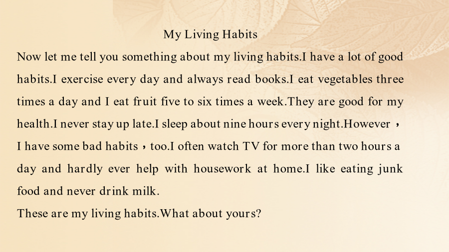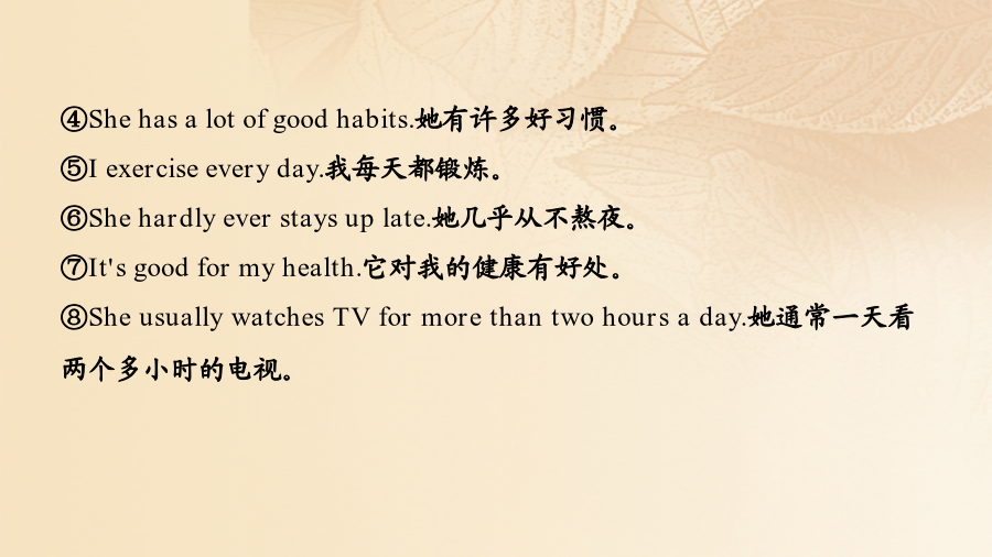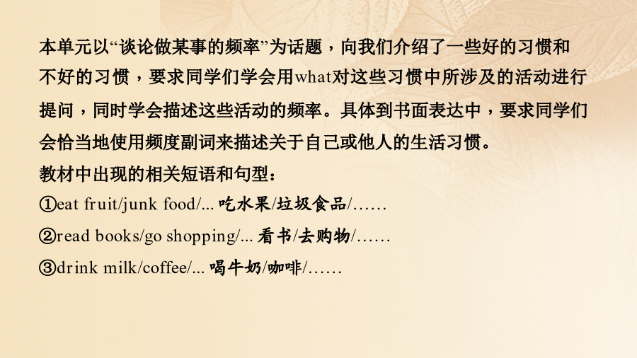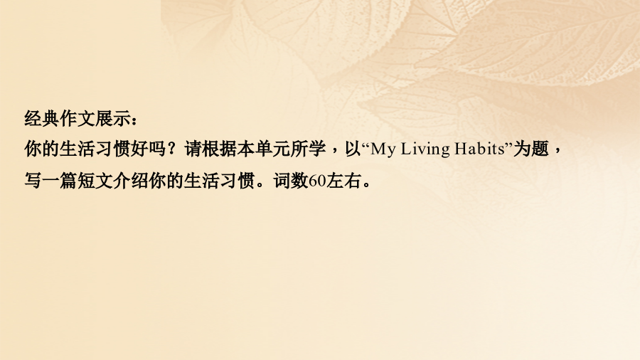 第七课时单元同步作文指导本单元以“谈论做某事的频率”为话题,向我们介绍了一些好的习惯和不好的习惯,要求同学们学会用what对这些习惯中所涉及的活动进行提问,同时学会描述这些活动的频率。具体到书面表达中,要求同学们会恰当地使用频度副词来描述关于自己或他人的生活习惯。 教材中出现的相关短语和句型: ①eatfruit/junkfood/...吃水果/垃圾食品/…… ②readbooks/goshopping/...看书/去购物/…… ③drinkmilk/coffee/...喝牛奶/咖啡/……④Shehasalotofgoodhabits.她有许多好习惯。 ⑤Iexerciseeveryday.我每天都锻炼。 ⑥Shehardlyeverstaysuplate.她几乎从不熬夜。 ⑦It'sgoodformyhealth.它对我的健康有好处。 ⑧SheusuallywatchesTVformorethantwohoursaday.她通常一天看两个多小时的电视。经典作文展示: 你的生活习惯好吗?请根据本单元所学,以“MyLivingHabits”为题,写一篇短文介绍你的生活习惯。词数60左右。MyLivingHabits Nowletmetellyousomethingaboutmylivinghabits.Ihavealotofgoodhabits.Iexerciseeverydayandalwaysreadbooks.IeatvegetablesthreetimesadayandIeatfruitfivetosixtimesaweek.Theyaregoodformyhealth.Ineverstayuplate.Isleepaboutninehourseverynight.However,Ihavesomebadhabits,too.IoftenwatchTVformorethantwohoursadayandhardlyeverhelpwithhouseworkathome.Ilikeeatingjunkfoodandneverdrinkmilk. Thesearemylivinghabits.Whataboutyours?热点作文展示: 假如你最好的朋友是Mary,她的各方面习惯都很好。请从以下几个方面向大家介绍一下她的生活习惯:1.在学校很努力,经常在家看书,有时上网;2.身体很健康,每周锻炼三四次,每天步行上学;3.饮食习惯很好,每天吃很多蔬菜和水果。Maryismybestfriend.Shestudieshardatschool,andsheoftenreadssomebooksathome.SometimessheusestheInternet.Sheisveryhealthy.Sheexercisesthreeorfourtimesaweek,likeplayingbasketball,playingsoccer,andrunning.Shewalkstoschooleveryday.Shehasgoodeatinghabits,too.Sheeatslotsofvegetablesandfruiteveryday.本课时其他知识点精讲精练 ►16yearold意为“十六岁的”,为复合形容词。这种复合形容词有两个特点:一是数词、名词、形容词之间要用连字符连接;二是数词后的名词要用单数形式。 ►however副词,意为“然而;不过”,在句中有转折的含义,相当于but。在句中位置灵活,但要注意用逗号将其与前后句隔开。but只能位于句中。 ►morethan意为“超过;多于”,相当于over。 【拓展】notmorethan=only仅仅;不过 nomorethan不多于;不超过 lessthan少于►none意为“没有人;没有东西”,既可指人,又可指物,作主语时谓语动词用单复数形式均可,常用来回答howmany或howmuch开头的问句。可与of短语连用。 【拓展】noone常用来回答以who开头的问句;nothing常用来回答以what开头的问句。一、根据句意及首字母提示完成下列单词。 1.Theyusuallygotoworkbybike,h________,theyhavetotakeabusonrainydays. 2.Janegoestothed______forteethcleaningonceamonth. 3.MyuncleisaP.E.teacher.Helikesreadingm_________aboutsports.二、根据句意及汉语意思完成下列单词或短语。 4.LiBoisa____________(十岁的)boy. 5._______(没有一个)ofusenjoygettingupea