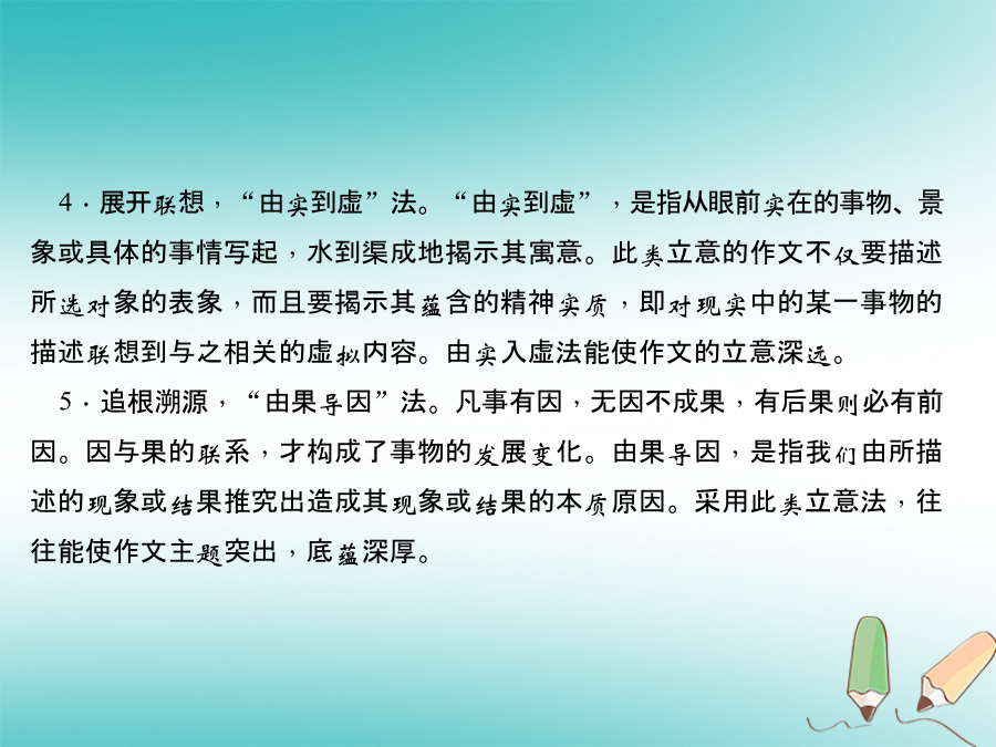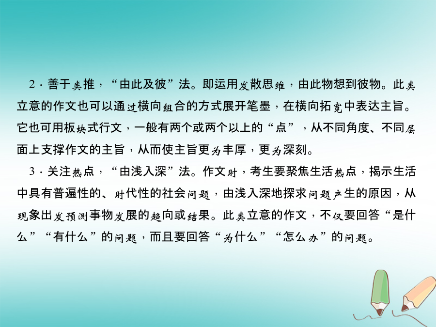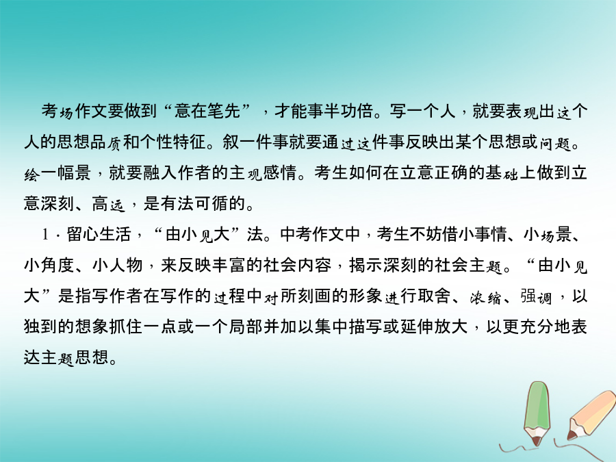 写作立意:别出心裁,巧妙选取角度考场作文要做到“意在笔先”,才能事半功倍。写一个人,就要表现出这个人的思想品质和个性特征。叙一件事就要通过这件事反映出某个思想或问题。绘一幅景,就要融入作者的主观感情。考生如何在立意正确的基础上做到立意深刻、高远,是有法可循的。 1.留心生活,“由小见大”法。中考作文中,考生不妨借小事情、小场景、小角度、小人物,来反映丰富的社会内容,揭示深刻的社会主题。“由小见大”是指写作者在写作的过程中对所刻画的形象进行取舍、浓缩、强调,以独到的想象抓住一点或一个局部并加以集中描写或延伸放大,以更充分地表达主题思想。2.善于类推,“由此及彼”法。即运用发散思维,由此物想到彼物。此类立意的作文也可以通过横向组合的方式展开笔墨,在横向拓宽中表达主旨。它也可用板块式行文,一般有两个或两个以上的“点”,从不同角度、不同层面上支撑作文的主旨,从而使主旨更为丰厚,更为深刻。 3.关注热点,“由浅入深”法。作文时,考生要聚焦生活热点,揭示生活中具有普遍性的、时代性的社会问题,由浅入深地探求问题产生的原因,从现象出发预测事物发展的趋向或结果。此类立意的作文,不仅要回答“是什么”“有什么”的问题,而且要回答“为什么”“怎么办”的问题。4.展开联想,“由实到虚”法。“由实到虚”,是指从眼前实在的事物、景象或具体的事情写起,水到渠成地揭示其寓意。此类立意的作文不仅要描述所选对象的表象,而且要揭示其蕴含的精神实质,即对现实中的某一事物的描述联想到与之相关的虚拟内容。由实入虚法能使作文的立意深远。 5.追根溯源,“由果导因”法。凡事有因,无因不成果,有后果则必有前因。因与果的联系,才构成了事物的发展变化。由果导因,是指我们由所描述的现象或结果推究出造成其现象或结果的本质原因。采用此类立意法,往往能使作文主题突出,底蕴深厚。【真题回放】 (广州中考)题目:请以《总会想起那张照片》为题,写一篇文章。 【满分佳作1】 总会想起那张照片 广州一考生 我总会想起那张在香港林间拍摄的照片。暑假,一家人来到表姐生活的城市——香港。走在街上,两旁高耸入云的楼房如片片黑云般,令我沉重、压抑。“走,我们骑车去!”表姐热情地挥挥手。我踩着单车,跟随表姐离市中心而去。忽然,随着一个急转弯,大片葱茏的绿色蹦跳着映入眼帘。这是一片森林!我心生惊叹。 车轮碾过落叶,发出“沙沙”的声响,似一曲悠扬的小调;阳光透过树丛,洒下斑驳的亮点,像一地晶莹的珍珠。我悠闲地穿梭于林间,享受着自然的洗礼,心中那根长久以来紧绷着的弦,渐渐松弛。前方,表姐正和一群好友并排骑行在一起。我按捺不住激动,飞快拿出相机,对准他们按下快门。 我从未见过如此美丽的照片:淡淡斜阳下,一条悠长的小径分隔左右。一边,是香港市区的高楼林立、灯火闪耀;另一边,是郊野丛林的连绵不绝、青葱翠绿。小径上,一行好友嬉笑玩乐的背影朦胧纯美;半空中,几只飞鸟展翅翱翔的身姿飘逸轻盈。 从前,我的照片中,总是只有城市,只有人群,或显纷扰嘈杂,或显单调空泛。面对这张香港林间的照片,我忽然找到了原因。是啊,人群有了飞鸟的点缀,更显灵动;城市有了绿树的搭配,平添生机。人本来就是自然的一部分,水滴溅出大海,便不再蔚蓝;人类脱离自然,便不再多彩。人与自然和平共处、相互融合,才能创造出“天人合一”的美好境界。 离开香港后,我总会想起那张在林间拍摄的照片。 当一栋栋高大的写字楼在美丽的街心绿地上拔地而起时,我想起了那张照片,不禁思考:什么时候,我们能在发展经济与保护环境间,寻找到完美的平衡点,给大自然以生存延续的空间?当一块块“仅供观赏,请勿踩踏”的牌子在规整的公园草坪边竖立时,我想起了那张照片,不禁疑惑:什么时候,我们能真正消除与大自然之间的隔阂,给每个人以亲近自然的机会? 直到如今,那张在香港林间拍摄的照片,总会浮现在我的眼前,它时时提醒着我: 人与自然,“和”为贵;人与自然,“合”最美!简评:选材独特,立意深刻。小作者永难忘记的那张照片,是一群好友在香港这个国际化大都市郊外的森林里骑行玩乐的画面。城市的繁华和郊野的绿意很自然地共存在一起,在这个画面的背后,是作者对香港在经济发展与保护环境之间做到完美平衡的称赞。文章最后自然地发出了我们应该与自然和谐相处的呼吁,触动人心。【满分佳作2】 总会想起那张照片 广州一考生 那张照片和其他照片一起,夹在我厚厚的、落满灰尘的相册里。但是,它却在我的记忆中显得分外清晰。那是一张由赛场摄像师拍下的照片,记录的是我的一场击剑比赛的最后一刻。 我仍然记得那次实力悬殊的晋级赛,我的对手是一位技术远远高于我的击剑高手。他可以在剑道上熟练地运用巧妙的步法、精湛的技术、意想不到的手段击中我,我却只能用蹩脚的技术抵挡着,被他凌厉的进攻逼得连连后退。在中场休息时,我甚至问教练:“我可以选择退出吗?”教练严肃地看了