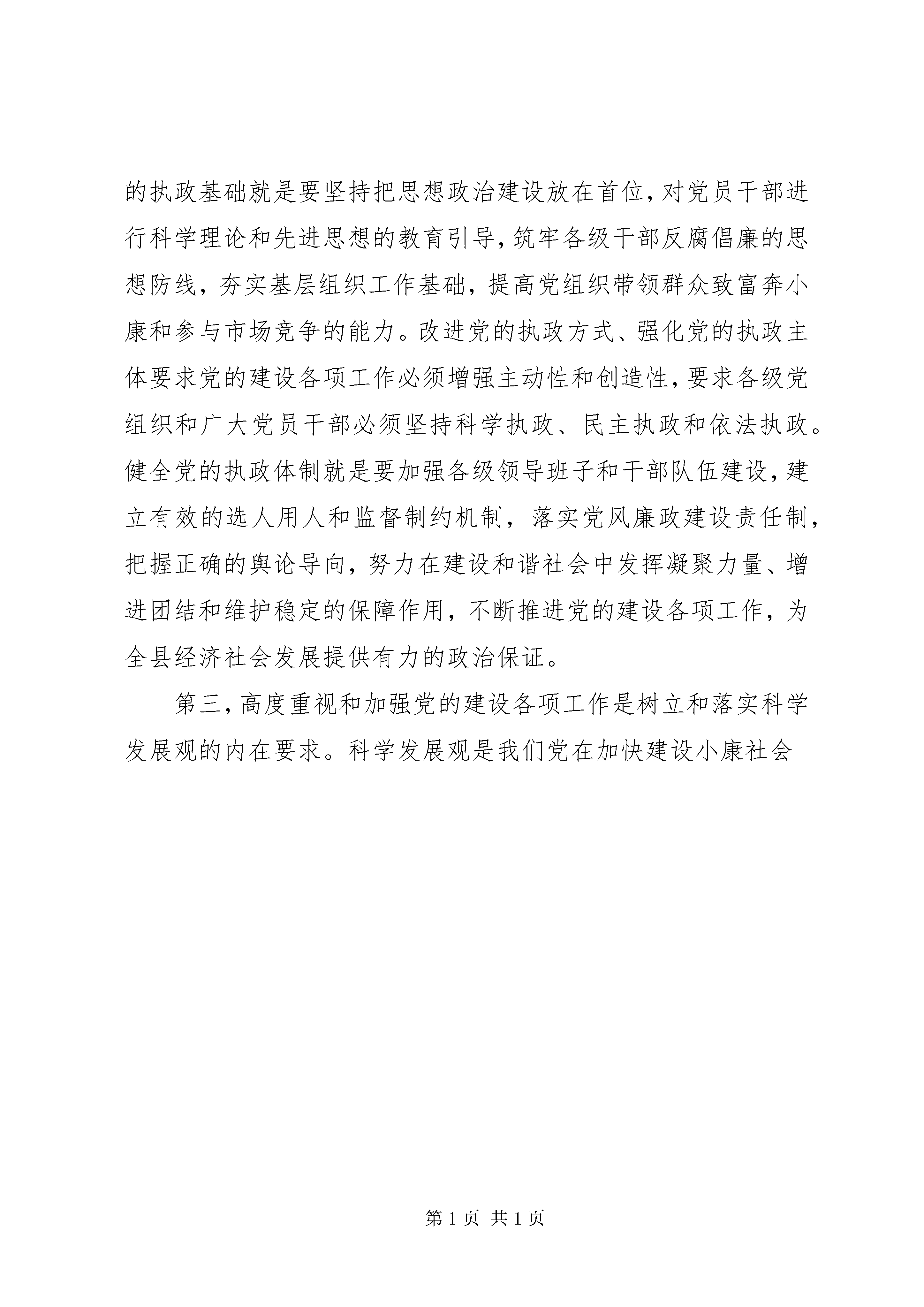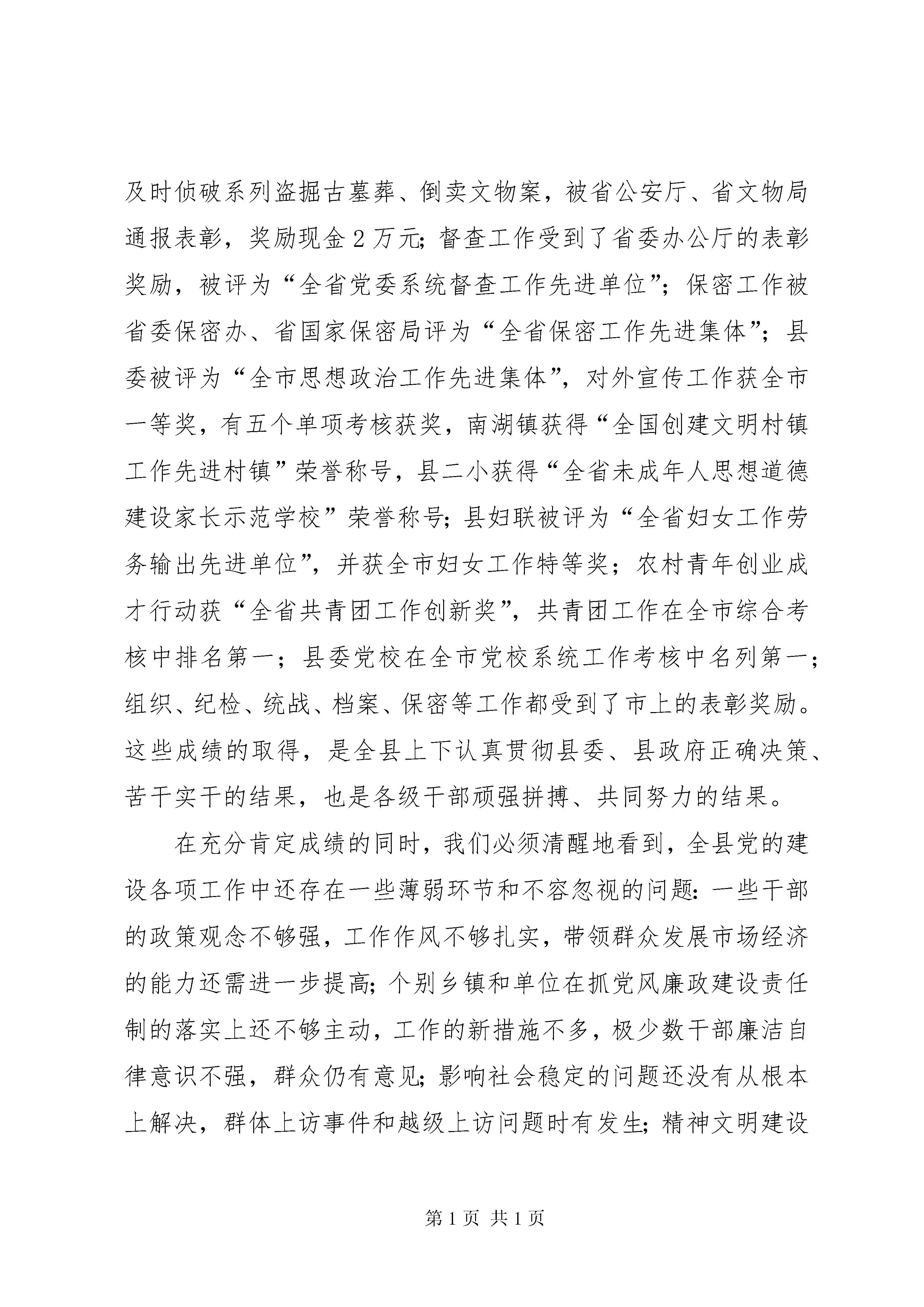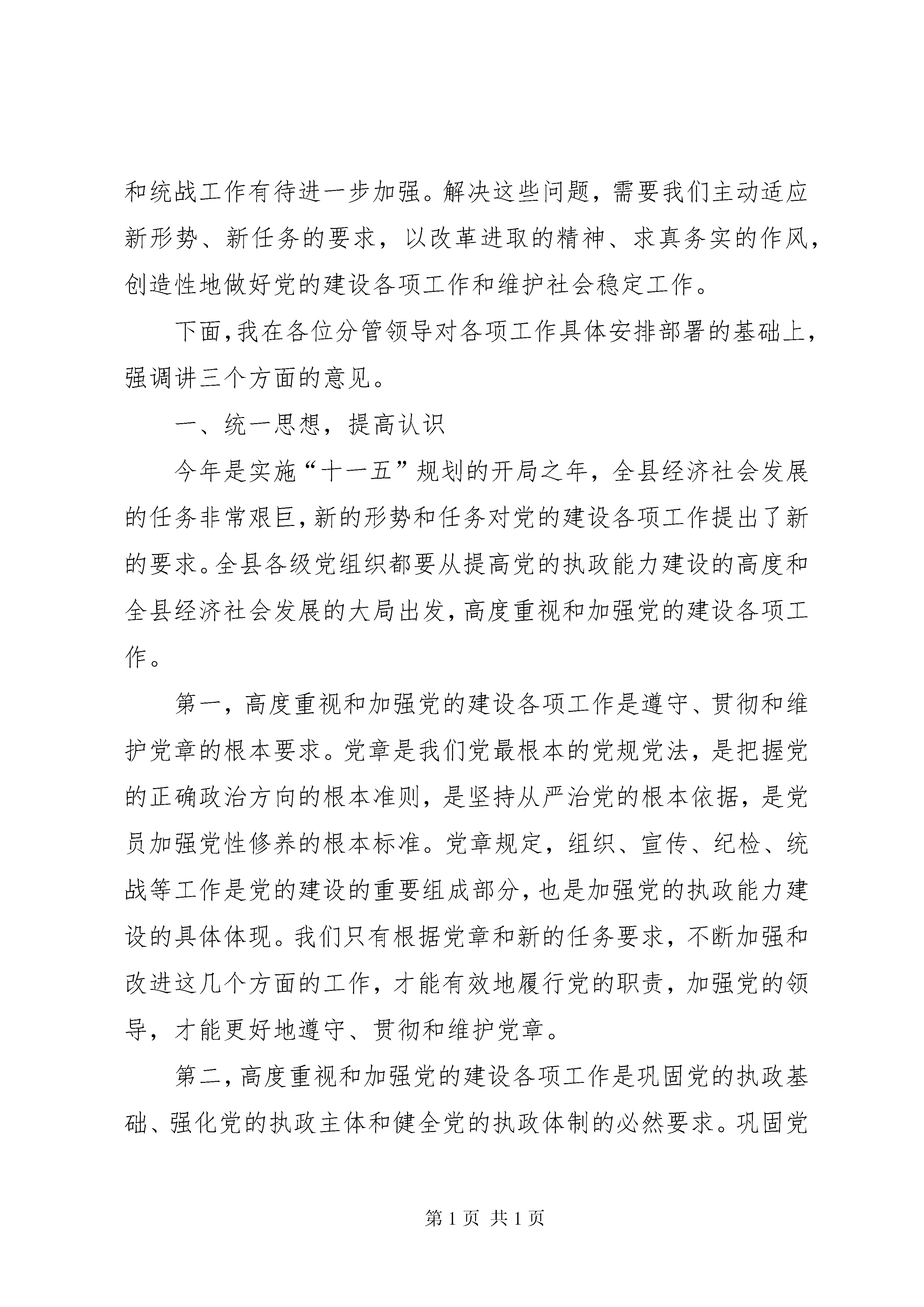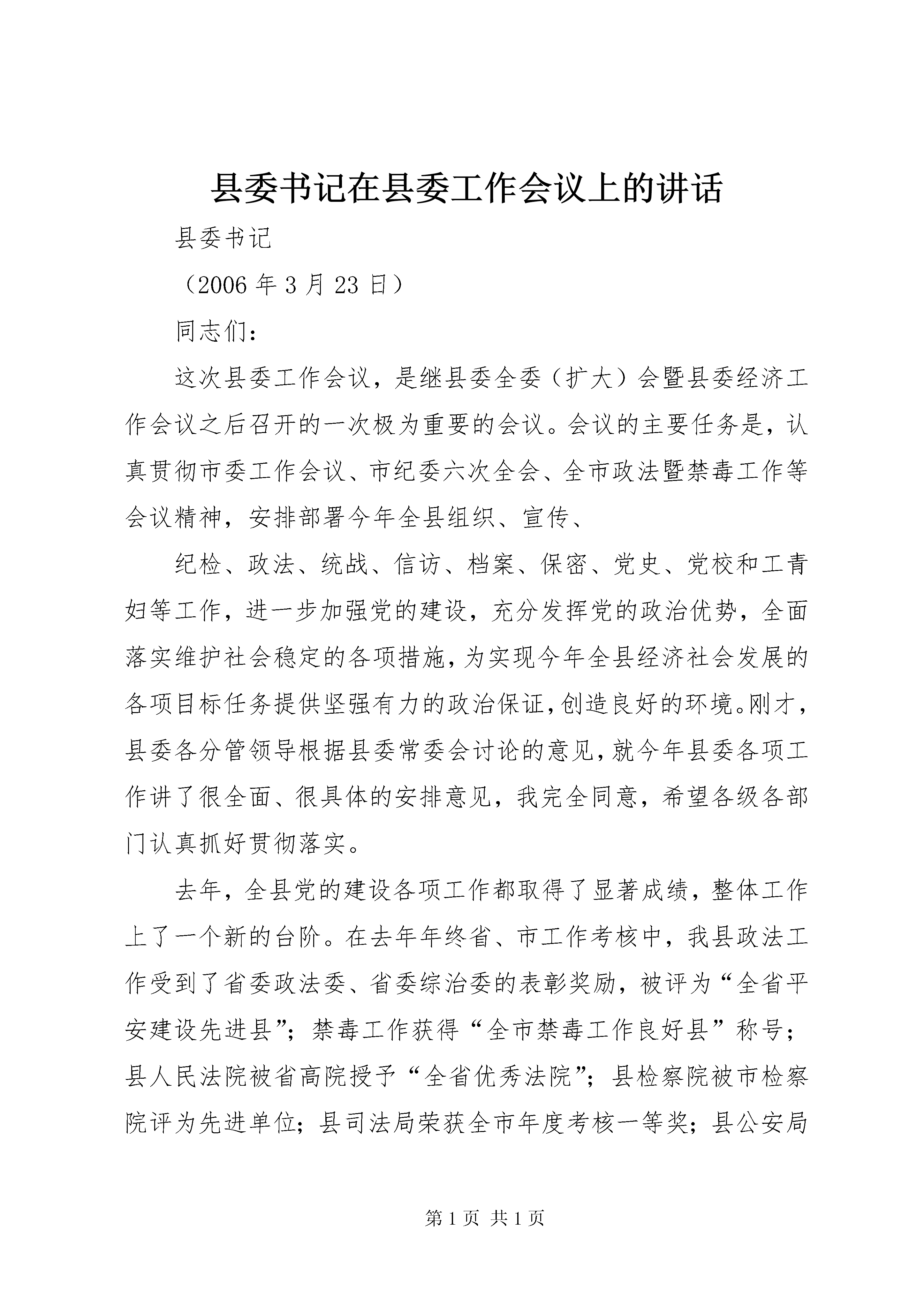 县委书记在县委工作会议上的讲话县委书记(2006年3月23日)同志们:这次县委工作会议,是继县委全委(扩大)会暨县委经济工作会议之后召开的一次极为重要的会议。会议的主要任务是,认真贯彻市委工作会议、市纪委六次全会、全市政法暨禁毒工作等会议精神,安排部署今年全县组织、宣传、纪检、政法、统战、信访、档案、保密、党史、党校和工青妇等工作,进一步加强党的建设,充分发挥党的政治优势,全面落实维护社会稳定的各项措施,为实现今年全县经济社会发展的各项目标任务提供坚强有力的政治保证,创造良好的环境。刚才,县委各分管领导根据县委常委会讨论的意见,就今年县委各项工作讲了很全面、很具体的安排意见,我完全同意,希望各级各部门认真抓好贯彻落实。去年,全县党的建设各项工作都取得了显著成绩,整体工作上了一个新的台阶。在去年年终省、市工作考核中,我县政法工作受到了省委政法委、省委综治委的表彰奖励,被评为“全省平安建设先进县”;禁毒工作获得“全市禁毒工作良好县”称号;县人民法院被省高院授予“全省优秀法院”;县检察院被市检察院评为先进单位;县司法局荣获全市年度考核一等奖;县公安局及时侦破系列盗掘古墓葬、倒卖文物案,被省公安厅、省文物局通报表彰,奖励现金2万元;督查工作受到了省委办公厅的表彰奖励,被评为“全省党委系统督查工作先进单位”;保密工作被省委保密办、省国家保密局评为“全省保密工作先进集体”;县委被评为“全市思想政治工作先进集体”,对外宣传工作获全市一等奖,有五个单项考核获奖,南湖镇获得“全国创建文明村镇工作先进村镇”荣誉称号,县二小获得“全省未成年人思想道德建设家长示范学校”荣誉称号;县妇联被评为“全省妇女工作劳务输出先进单位”,并获全市妇女工作特等奖;农村青年创业成才行动获“全省共青团工作创新奖”,共青团工作在全市综合考核中排名第一;县委党校在全市党校系统工作考核中名列第一;组织、纪检、统战、档案、保密等工作都受到了市上的表彰奖励。这些成绩的取得,是全县上下认真贯彻县委、县政府正确决策、苦干实干的结果,也是各级干部顽强拼搏、共同努力的结果。在充分肯定成绩的同时,我们必须清醒地看到,全县党的建设各项工作中还存在一些薄弱环节和不容忽视的问题:一些干部的政策观念不够强,工作作风不够扎实,带领群众发展市场经济的能力还需进一步提高;个别乡镇和单位在抓党风廉政建设责任制的落实上还不够主动,工作的新措施不多,极少数干部廉洁自律意识不强,群众仍有意见;影响社会稳定的问题还没有从根本上解决,群体上访事件和越级上访问题时有发生;精神文明建设和统战工作有待进一步加强。解决这些问题,需要我们主动适应新形势、新任务的要求,以改革进取的精神、求真务实的作风,创造性地做好党的建设各项工作和维护社会稳定工作。下面,我在各位分管领导对各项工作具体安排部署的基础上,强调讲三个方面的意见。一、统一思想,提高认识今年是实施“十一五”规划的开局之年,全县经济社会发展的任务非常艰巨,新的形势和任务对党的建设各项工作提出了新的要求。全县各级党组织都要从提高党的执政能力建设的高度和全县经济社会发展的大局出发,高度重视和加强党的建设各项工作。第一,高度重视和加强党的建设各项工作是遵守、贯彻和维护党章的根本要求。党章是我们党最根本的党规党法,是把握党的正确政治方向的根本准则,是坚持从严治党的根本依据,是党员加强党性修养的根本标准。党章规定,组织、宣传、纪检、统战等工作是党的建设的重要组成部分,也是加强党的执政能力建设的具体体现。我们只有根据党章和新的任务要求,不断加强和改进这几个方面的工作,才能有效地履行党的职责,加强党的领导,才能更好地遵守、贯彻和维护党章。第二,高度重视和加强党的建设各项工作是巩固党的执政基础、强化党的执政主体和健全党的执政体制的必然要求。巩固党的执政基础就是要坚持把思想政治建设放在首位,对党员干部进行科学理论和先进思想的教育引导,筑牢各级干部反腐倡廉的思想防线,夯实基层组织工作基础,提高党组织带领群众致富奔小康和参与市场竞争的能力。改进党的执政方式、强化党的执政主体要求党的建设各项工作必须增强主动性和创造性,要求各级党组织和广大党员干部必须坚持科学执政、民主执政和依法执政。健全党的执政体制就是要加强各级领导班子和干部队伍建设,建立有效的选人用人和监督制约机制,落实党风廉政建设责任制,把握正确的舆论导向,努力在建设和谐社会中发挥凝聚力量、增进团结和维护稳定的保障作用,不断推进党的建设各项工作,为全县经济社会发展提供有力的政治保证。第三,高度重视和加强党的建设各项工作是树立和落实科学发展观的内在要求。科学发展观是我们党在加快建设小康社会