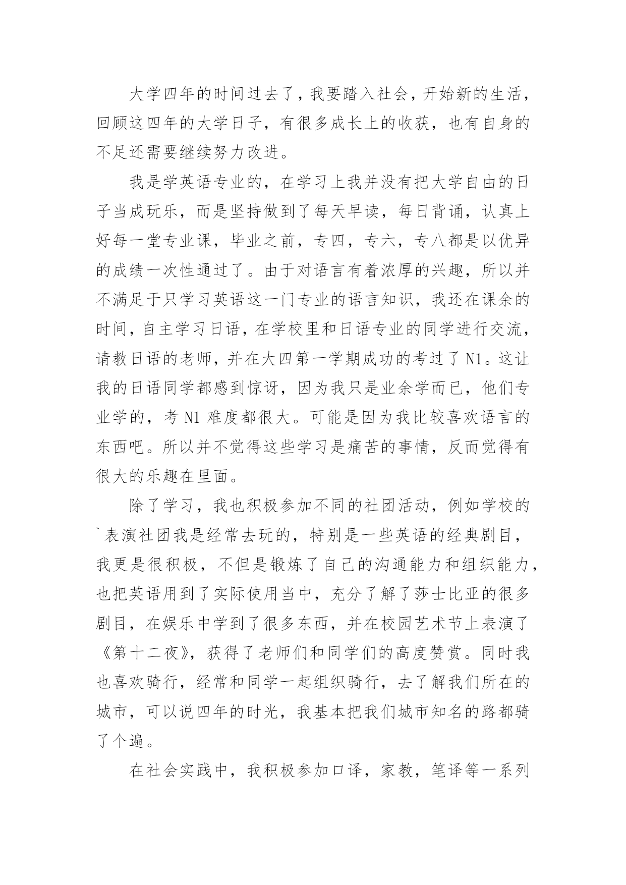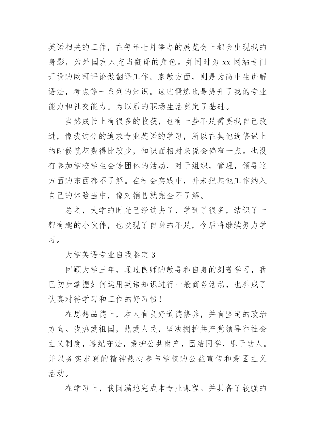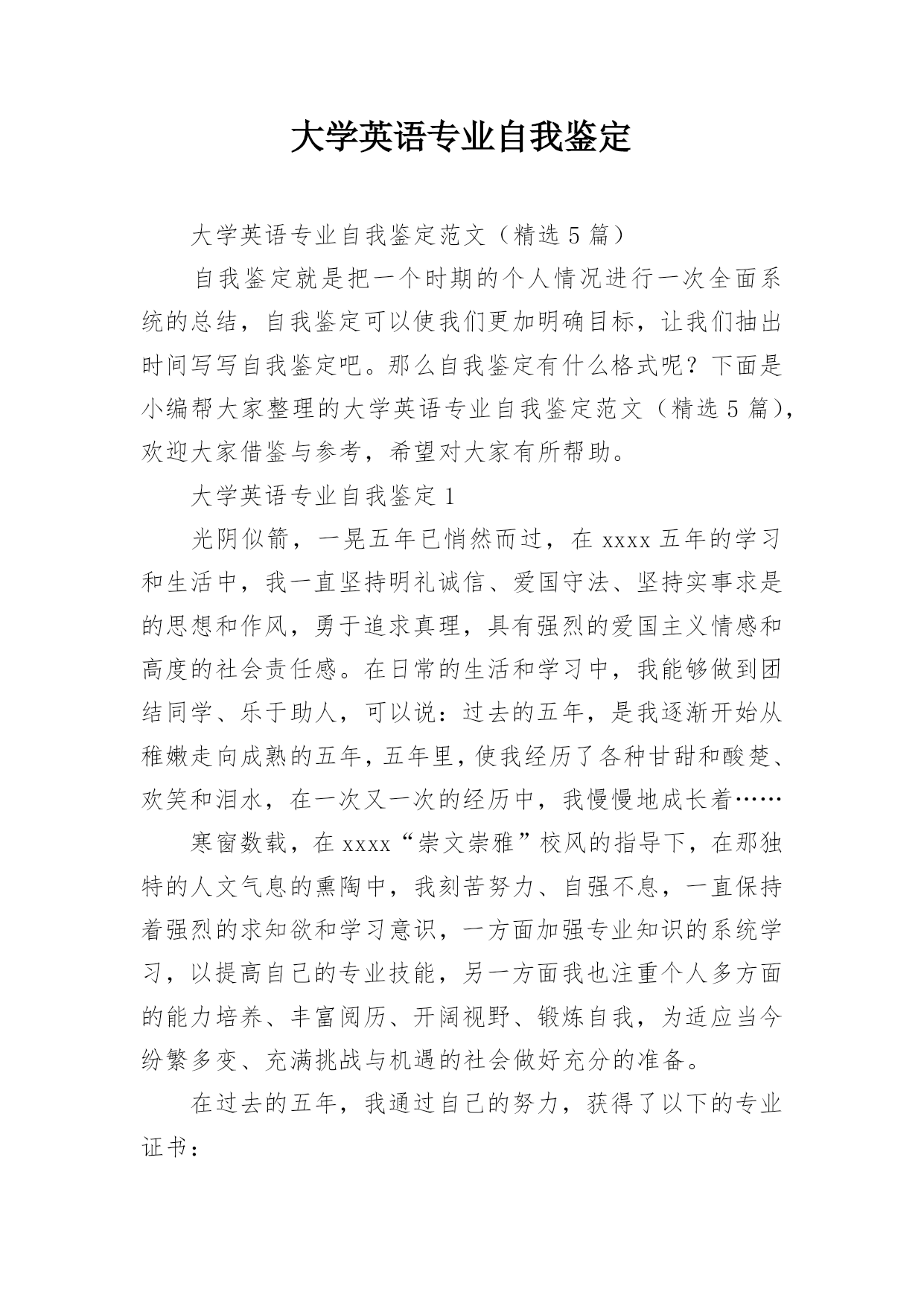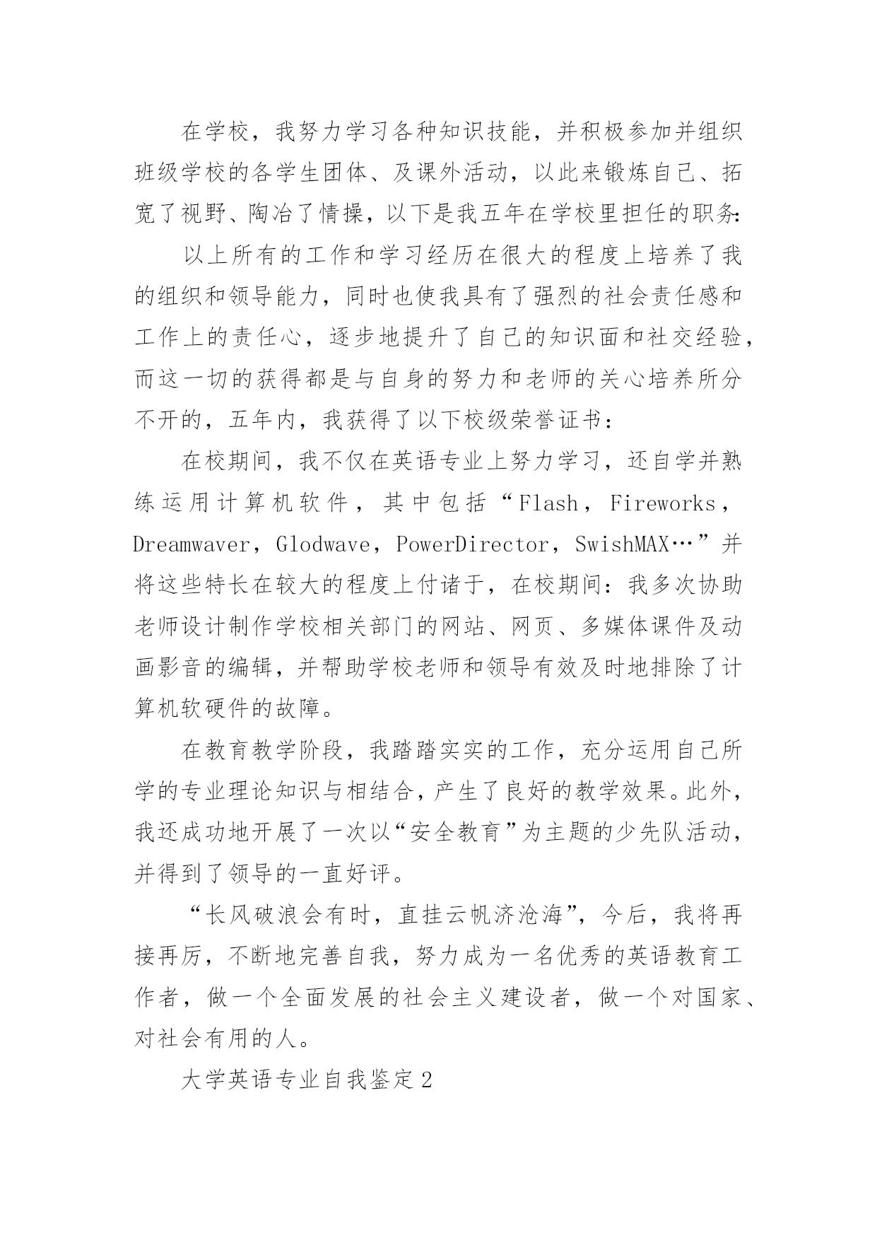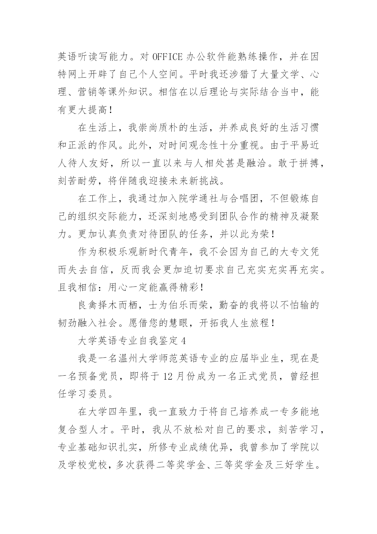 大学英语专业自我鉴定 大学英语专业自我鉴定范文(精选5篇)自我鉴定就是把一个时期的个人情况进行一次全面系统的总结,自我鉴定可以使我们更加明确目标,让我们抽出时间写写自我鉴定吧。那么自我鉴定有什么格式呢?下面是小编帮大家整理的大学英语专业自我鉴定范文(精选5篇),欢迎大家借鉴与参考,希望对大家有所帮助。大学英语专业自我鉴定1光阴似箭,一晃五年已悄然而过,在xxxx五年的学习和生活中,我一直坚持明礼诚信、爱国守法、坚持实事求是的思想和作风,勇于追求真理,具有强烈的爱国主义情感和高度的社会责任感。在日常的生活和学习中,我能够做到团结同学、乐于助人,可以说:过去的五年,是我逐渐开始从稚嫩走向成熟的五年,五年里,使我经历了各种甘甜和酸楚、欢笑和泪水,在一次又一次的经历中,我慢慢地成长着……寒窗数载,在xxxx“崇文崇雅”校风的指导下,在那独特的人文气息的熏陶中,我刻苦努力、自强不息,一直保持着强烈的求知欲和学习意识,一方面加强专业知识的系统学习,以提高自己的专业技能,另一方面我也注重个人多方面的能力培养、丰富阅历、开阔视野、锻炼自我,为适应当今纷繁多变、充满挑战与机遇的社会做好充分的准备。在过去的五年,我通过自己的努力,获得了以下的专业证书:在学校,我努力学习各种知识技能,并积极参加并组织班级学校的各学生团体、及课外活动,以此来锻炼自己、拓宽了视野、陶冶了情操,以下是我五年在学校里担任的职务:以上所有的工作和学习经历在很大的程度上培养了我的组织和领导能力,同时也使我具有了强烈的社会责任感和工作上的责任心,逐步地提升了自己的知识面和社交经验,而这一切的获得都是与自身的努力和老师的关心培养所分不开的,五年内,我获得了以下校级荣誉证书:在校期间,我不仅在英语专业上努力学习,还自学并熟练运用计算机软件,其中包括“Flash,Fireworks,Dreamwaver,Glodwave,PowerDirector,SwishMAX…”并将这些特长在较大的程度上付诸于,在校期间:我多次协助老师设计制作学校相关部门的网站、网页、多媒体课件及动画影音的编辑,并帮助学校老师和领导有效及时地排除了计算机软硬件的故障。在教育教学阶段,我踏踏实实的工作,充分运用自己所学的专业理论知识与相结合,产生了良好的教学效果。此外,我还成功地开展了一次以“安全教育”为主题的少先队活动,并得到了领导的一直好评。“长风破浪会有时,直挂云帆济沧海”,今后,我将再接再厉,不断地完善自我,努力成为一名优秀的英语教育工作者,做一个全面发展的社会主义建设者,做一个对国家、对社会有用的人。大学英语专业自我鉴定2大学四年的时间过去了,我要踏入社会,开始新的生活,回顾这四年的大学日子,有很多成长上的收获,也有自身的不足还需要继续努力改进。我是学英语专业的,在学习上我并没有把大学自由的日子当成玩乐,而是坚持做到了每天早读,每日背诵,认真上好每一堂专业课,毕业之前,专四,专六,专八都是以优异的成绩一次性通过了。由于对语言有着浓厚的兴趣,所以并不满足于只学习英语这一门专业的语言知识,我还在课余的时间,自主学习日语,在学校里和日语专业的同学进行交流,请教日语的老师,并在大四第一学期成功的考过了N1。这让我的日语同学都感到惊讶,因为我只是业余学而已,他们专业学的,考N1难度都很大。可能是因为我比较喜欢语言的东西吧。所以并不觉得这些学习是痛苦的事情,反而觉得有很大的乐趣在里面。除了学习,我也积极参加不同的社团活动,例如学校的`表演社团我是经常去玩的,特别是一些英语的经典剧目,我更是很积极,不但是锻炼了自己的沟通能力和组织能力,也把英语用到了实际使用当中,充分了解了莎士比亚的很多剧目,在娱乐中学到了很多东西,并在校园艺术节上表演了《第十二夜》,获得了老师们和同学们的高度赞赏。同时我也喜欢骑行,经常和同学一起组织骑行,去了解我们所在的城市,可以说四年的时光,我基本把我们城市知名的路都骑了个遍。在社会实践中,我积极参加口译,家教,笔译等一系列英语相关的工作,在每年七月举办的展览会上都会出现我的身影,为外国友人充当翻译的角色。并同时为xx网站专门开设的欧冠评论做翻译工作。家教方面,则是为高中生讲解语法,考点等一系列的知识。这些锻炼也是提升了我的专业能力和社交能力。为以后的职场生活奠定了基础。当然成长上有很多的收获,也有一些不足需要我自己改进,像我过分的追求专业英语的学习,所以在其他选修课上的时候就花费得比较少,知识面相对来说会偏窄一点。也没有参加学校学生会等团体的活动,对于组织,管理,领导这方面的东西都不了解。在社会实践中,并未把其他工作纳入自己的体验当中,像对销售就完全不了解。总之,大学的时光已经过去了,学到了很多,结识了一帮有趣的小伙伴,也发现了自身的不足,今后将继续努力学习。大学英语专业自我鉴定3回顾大学