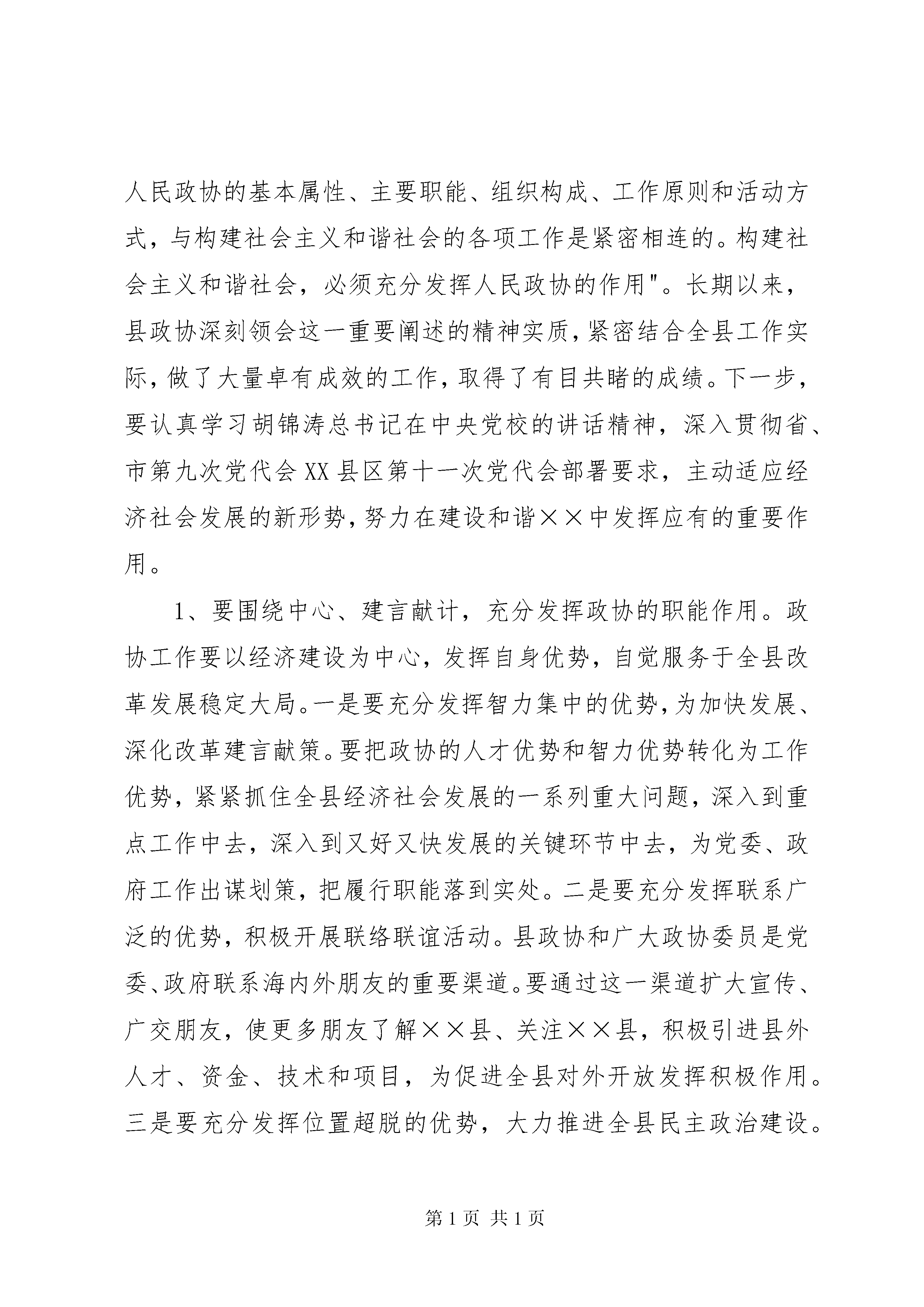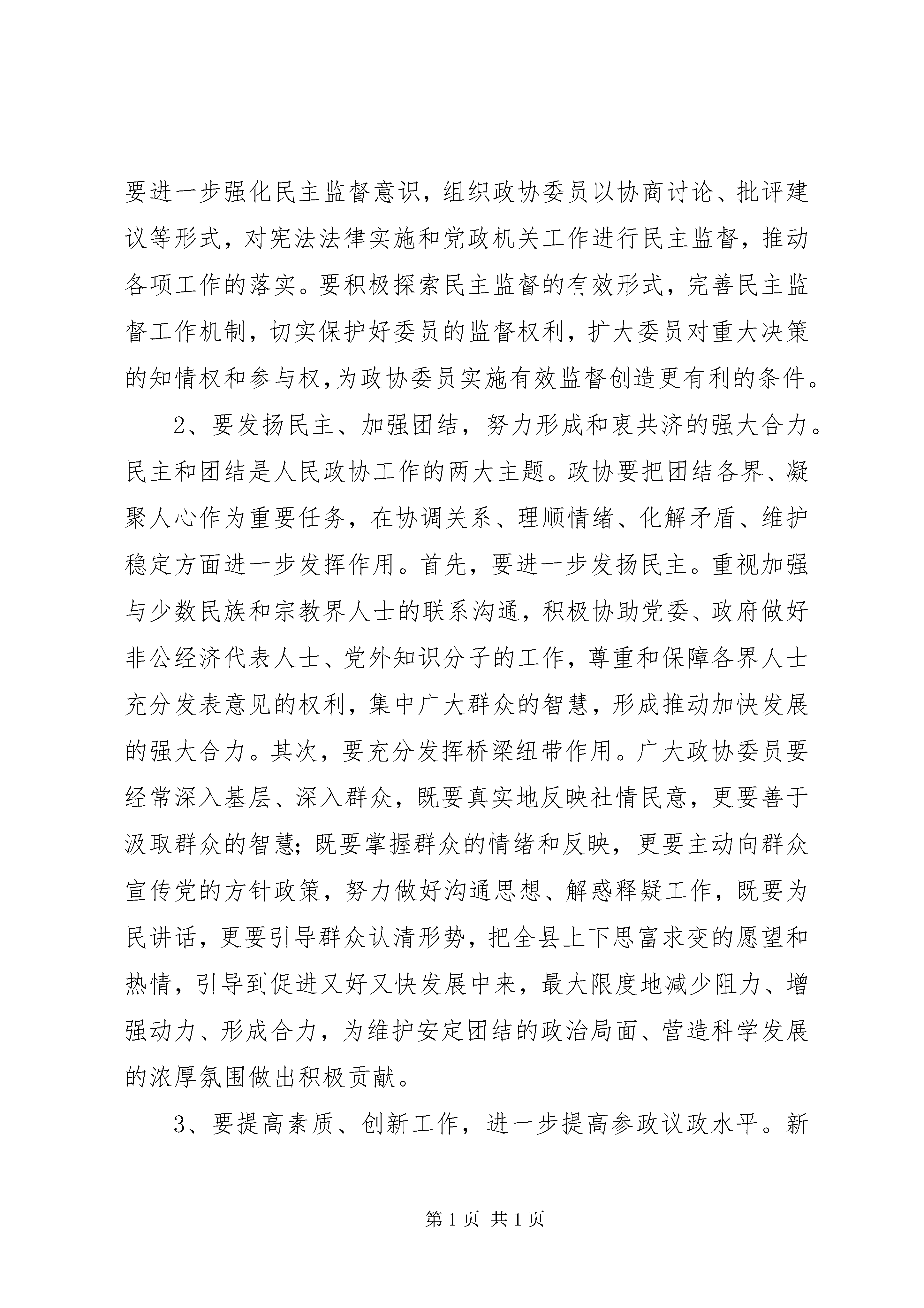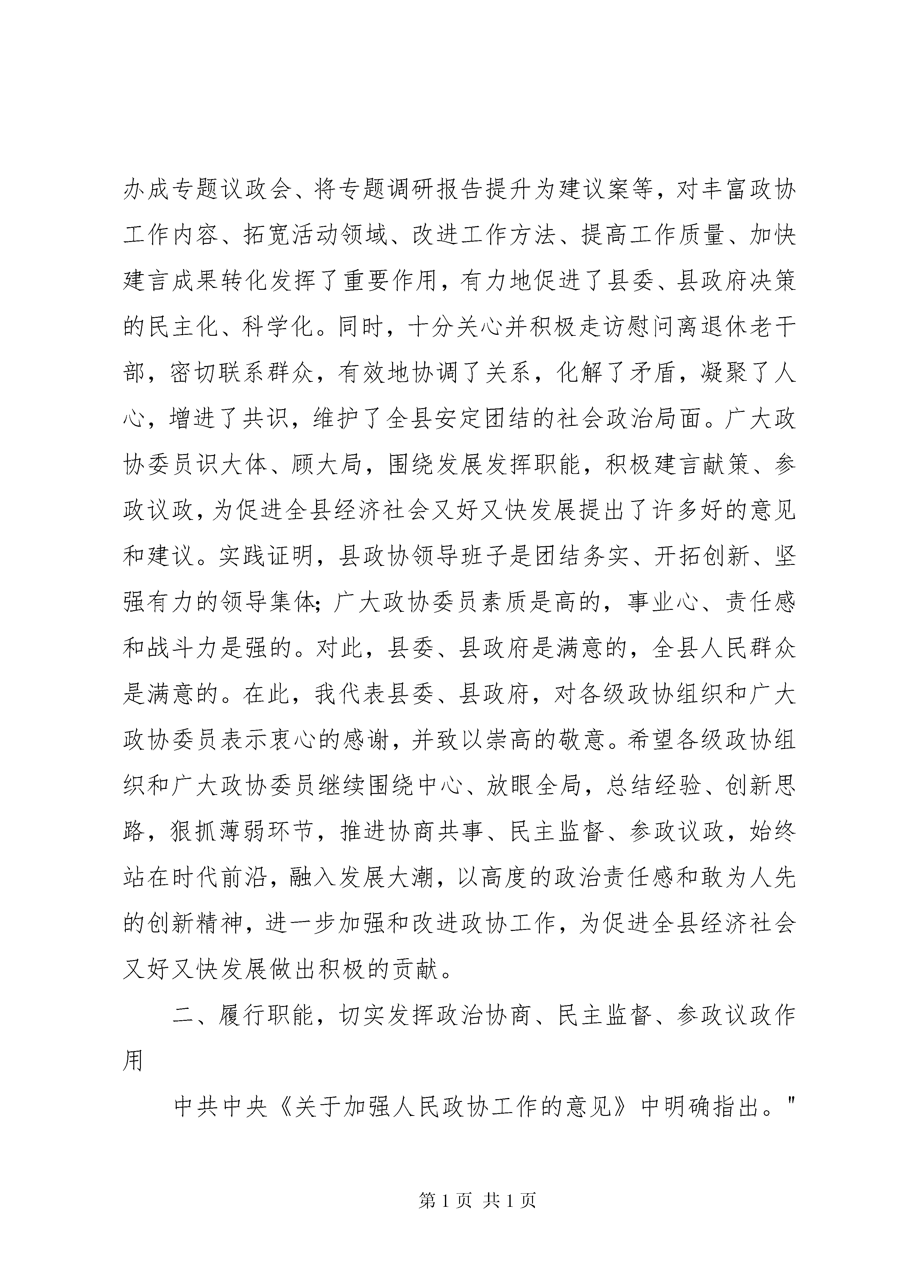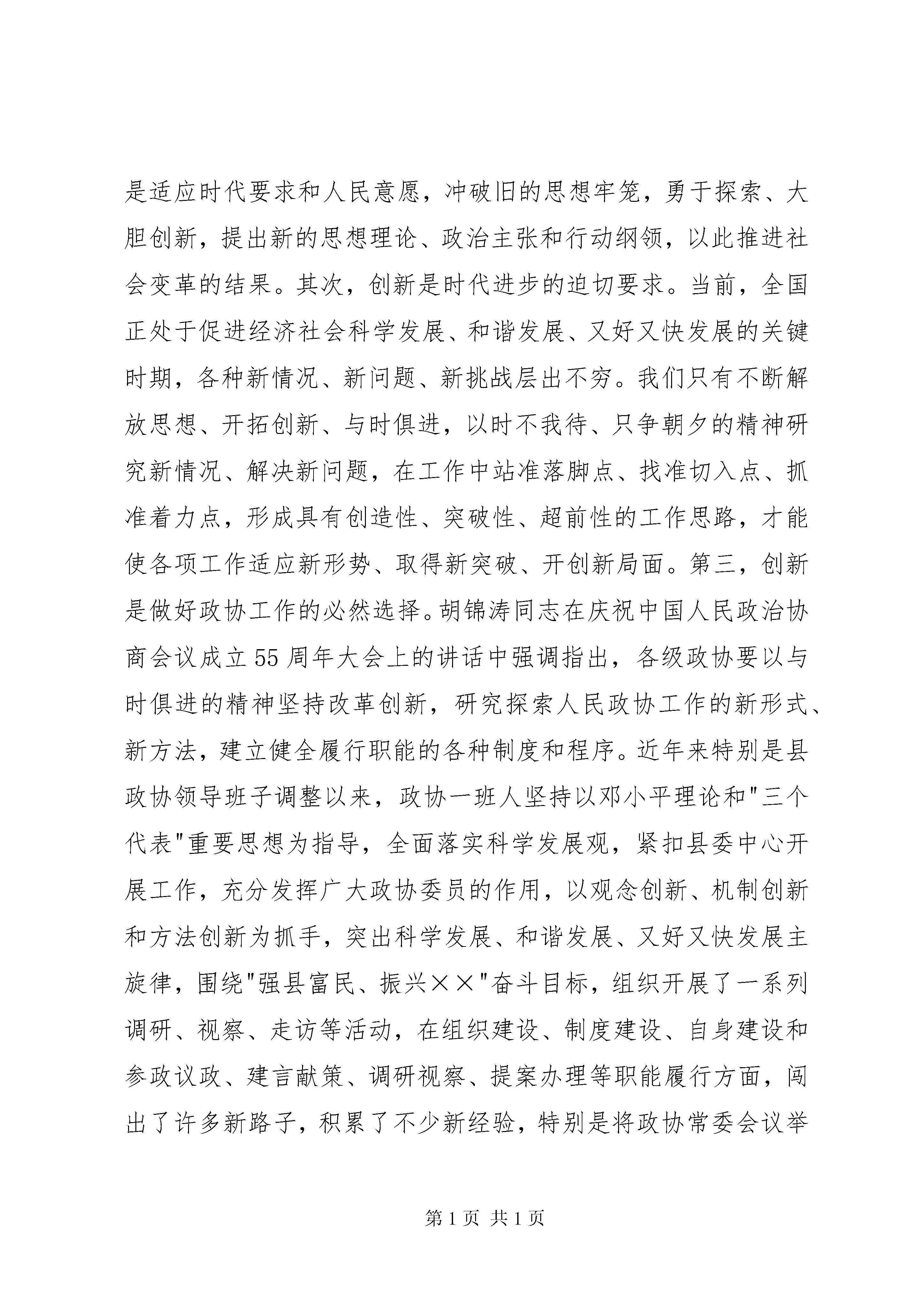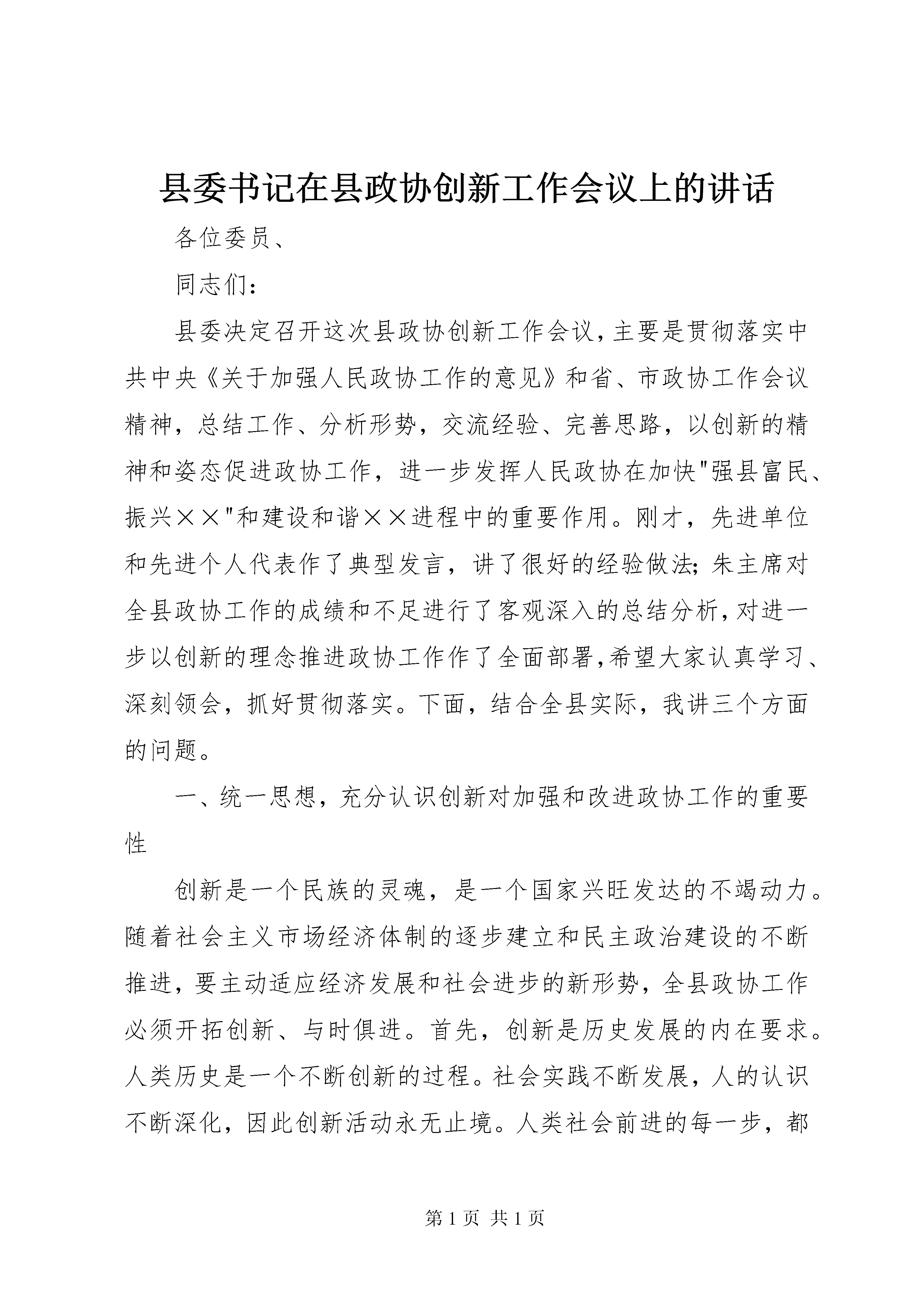 县委书记在县政协创新工作会议上的讲话各位委员、同志们:县委决定召开这次县政协创新工作会议,主要是贯彻落实中共中央《关于加强人民政协工作的意见》和省、市政协工作会议精神,总结工作、分析形势,交流经验、完善思路,以创新的精神和姿态促进政协工作,进一步发挥人民政协在加快"强县富民、振兴××"和建设和谐××进程中的重要作用。刚才,先进单位和先进个人代表作了典型发言,讲了很好的经验做法;朱主席对全县政协工作的成绩和不足进行了客观深入的总结分析,对进一步以创新的理念推进政协工作作了全面部署,希望大家认真学习、深刻领会,抓好贯彻落实。下面,结合全县实际,我讲三个方面的问题。一、统一思想,充分认识创新对加强和改进政协工作的重要性创新是一个民族的灵魂,是一个国家兴旺发达的不竭动力。随着社会主义市场经济体制的逐步建立和民主政治建设的不断推进,要主动适应经济发展和社会进步的新形势,全县政协工作必须开拓创新、与时俱进。首先,创新是历史发展的内在要求。人类历史是一个不断创新的过程。社会实践不断发展,人的认识不断深化,因此创新活动永无止境。人类社会前进的每一步,都是适应时代要求和人民意愿,冲破旧的思想牢笼,勇于探索、大胆创新,提出新的思想理论、政治主张和行动纲领,以此推进社会变革的结果。其次,创新是时代进步的迫切要求。当前,全国正处于促进经济社会科学发展、和谐发展、又好又快发展的关键时期,各种新情况、新问题、新挑战层出不穷。我们只有不断解放思想、开拓创新、与时俱进,以时不我待、只争朝夕的精神研究新情况、解决新问题,在工作中站准落脚点、找准切入点、抓准着力点,形成具有创造性、突破性、超前性的工作思路,才能使各项工作适应新形势、取得新突破、开创新局面。第三,创新是做好政协工作的必然选择。胡锦涛同志在庆祝中国人民政治协商会议成立55周年大会上的讲话中强调指出,各级政协要以与时俱进的精神坚持改革创新,研究探索人民政协工作的新形式、新方法,建立健全履行职能的各种制度和程序。近年来特别是县政协领导班子调整以来,政协一班人坚持以邓小平理论和"三个代表"重要思想为指导,全面落实科学发展观,紧扣县委中心开展工作,充分发挥广大政协委员的作用,以观念创新、机制创新和方法创新为抓手,突出科学发展、和谐发展、又好又快发展主旋律,围绕"强县富民、振兴××"奋斗目标,组织开展了一系列调研、视察、走访等活动,在组织建设、制度建设、自身建设和参政议政、建言献策、调研视察、提案办理等职能履行方面,闯出了许多新路子,积累了不少新经验,特别是将政协常委会议举办成专题议政会、将专题调研报告提升为建议案等,对丰富政协工作内容、拓宽活动领域、改进工作方法、提高工作质量、加快建言成果转化发挥了重要作用,有力地促进了县委、县政府决策的民主化、科学化。同时,十分关心并积极走访慰问离退休老干部,密切联系群众,有效地协调了关系,化解了矛盾,凝聚了人心,增进了共识,维护了全县安定团结的社会政治局面。广大政协委员识大体、顾大局,围绕发展发挥职能,积极建言献策、参政议政,为促进全县经济社会又好又快发展提出了许多好的意见和建议。实践证明,县政协领导班子是团结务实、开拓创新、坚强有力的领导集体;广大政协委员素质是高的,事业心、责任感和战斗力是强的。对此,县委、县政府是满意的,全县人民群众是满意的。在此,我代表县委、县政府,对各级政协组织和广大政协委员表示衷心的感谢,并致以崇高的敬意。希望各级政协组织和广大政协委员继续围绕中心、放眼全局,总结经验、创新思路,狠抓薄弱环节,推进协商共事、民主监督、参政议政,始终站在时代前沿,融入发展大潮,以高度的政治责任感和敢为人先的创新精神,进一步加强和改进政协工作,为促进全县经济社会又好又快发展做出积极的贡献。二、履行职能,切实发挥政治协商、民主监督、参政议政作用中共中央《关于加强人民政协工作的意见》中明确指出。"人民政协的基本属性、主要职能、组织构成、工作原则和活动方式,与构建社会主义和谐社会的各项工作是紧密相连的。构建社会主义和谐社会,必须充分发挥人民政协的作用"。长期以来,县政协深刻领会这一重要阐述的精神实质,紧密结合全县工作实际,做了大量卓有成效的工作,取得了有目共睹的成绩。下一步,要认真学习胡锦涛总书记在中央党校的讲话精神,深入贯彻省、市第九次党代会XX县区第十一次党代会部署要求,主动适应经济社会发展的新形势,努力在建设和谐××中发挥应有的重要作用。1、要围绕中心、建言献计,充分发挥政协的职能作用。政协工作要以经济建设为中心,发挥自身优势,自觉服务于全县改革发展稳定大局。一是要充分发挥智力集中的优势,为加快发展、深化改革建言献策。要把政协的人才优势和智力优势转化为工作优势,紧紧抓住全县经济社会发展的一系列重大问题,深入到重点工作中去,深入到又好又快发