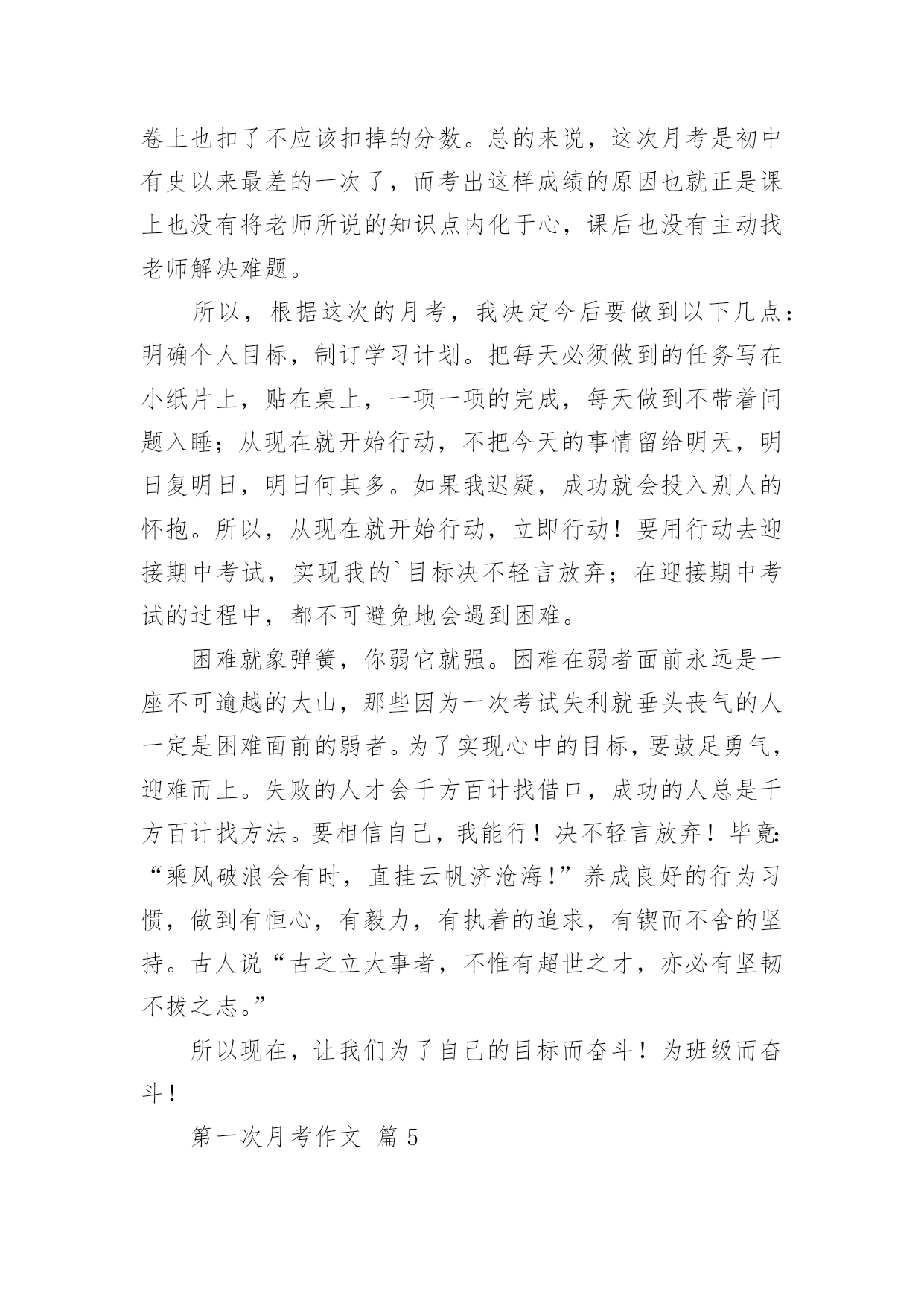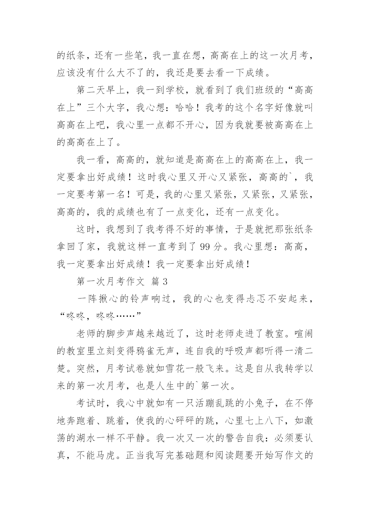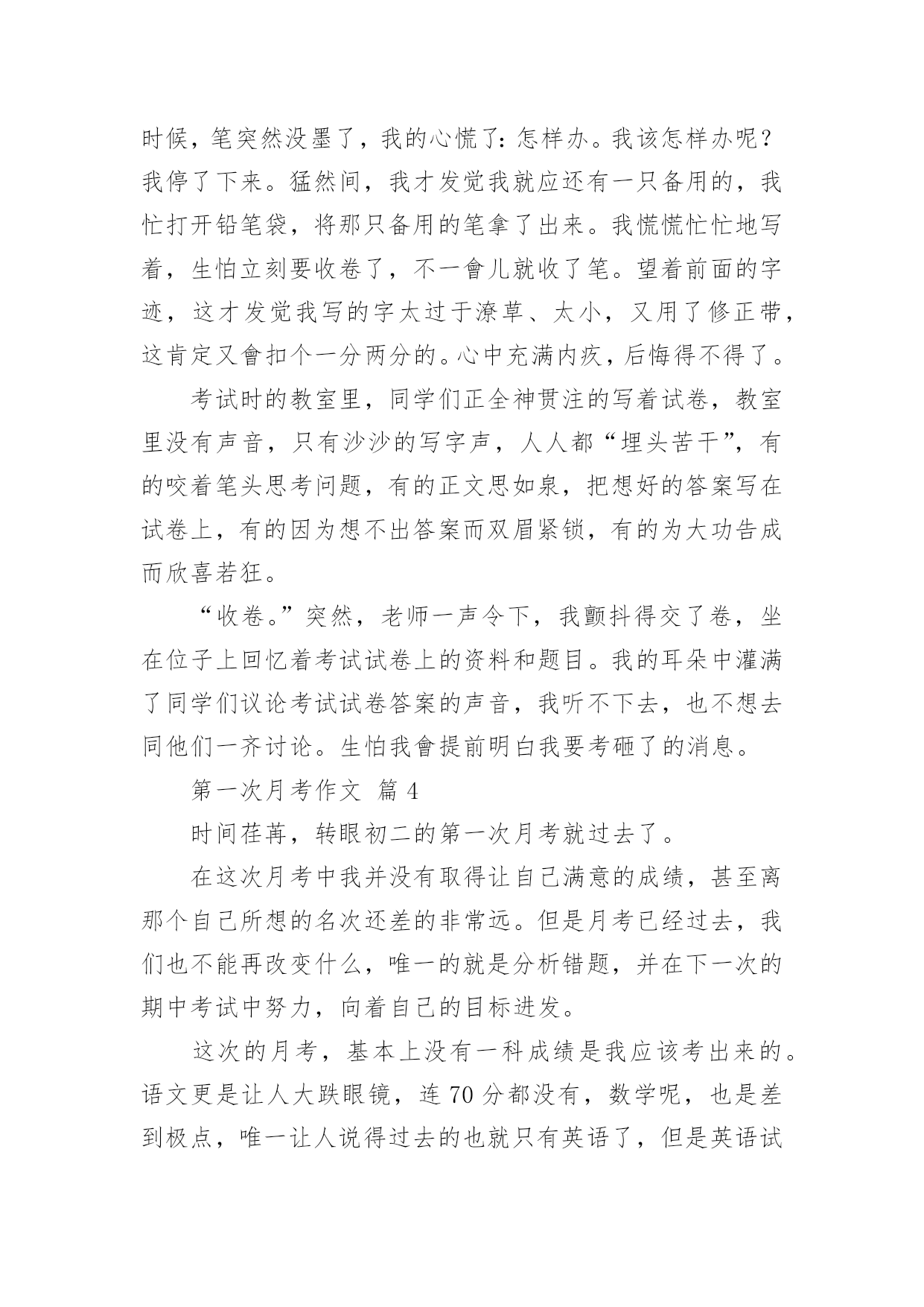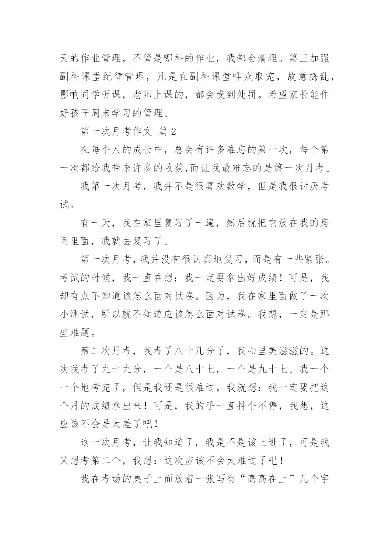 第一次月考作文 第一次月考作文篇1初二很快就过去一个学月了,数学这一科已经学习完了第一章,第二章,及第三章第一节。第一次考试范围就是这个,都是计算的考试。从试卷情况看,孩子们的学习效率还是很底下,试卷上很多题型都是在周练,练习册里面出现过的,经常练习的题,但是对于他们来讲,总还会出现不同的问题。很多题方法都是学会了的`,思路都是清晰的,但是看会看错,抬会抬错,算会算错,想会想错,反正一句话,一定会出现不同的错误,每次看到这样的试卷我都会觉得好可惜啊,继而是一种后怕:他们下一会会发生什么样的错误,到了中考怎么办?这也是我下一步想解决的问题。数学分析就是这样。再来说说班级情况。每一次开学第一学月都是孩子们学习最起劲的一个月。刚刚从假期中疯耍回来,假期作业没做得很好,老师又大方的放过,孩儿们抱着一种感激之心,抱着一定要回报老师大度的心,抱着入学考试没考好内疚之心,一股劲的学习,所以每一次月考的情况都还不错。但是接下来大家应该能猜到了,下一次考试就不怎么样了,也许是努力后的疲惫,也许是想放松一下,也许也许,反正就是会很糟糕。一反一复,来来回回,我都已经习惯了。这应是这学期,下一步,必须要解决的问题,也希望家长们能和我同心协力。第一我会加强每天的管理,特别是自习课。第二加强每天的作业管理,不管是哪科的作业,我都会清理。第三加强副科课堂纪律管理,凡是在副科课堂哗众取宠,故意捣乱,影响同学听课,老师上课的,都会受到处罚。希望家长能作好孩子周末学习的管理。第一次月考作文篇2在每个人的成长中,总会有许多难忘的第一次,每个第一次都给我带来许多的收获,而让我最难忘的是第一次月考。我第一次月考,我并不是很喜欢数学,但是我很讨厌考试。有一天,我在家里复习了一遍,然后就把它放在我的房间里面,我就去复习了。第一次月考,我并没有很认真地复习,而是有一些紧张。考试的时候,我一直在想:我一定要拿出好成绩!可是,我却有点不知道该怎么面对试卷。因为,我在家里面做了一次小测试,所以就不知道应该怎么面对试卷。我想,一定是那些难题。第二次月考,我考了八十几分了,我心里美滋滋的。这次我考了九十九分,一个是八十七,一个是九十七。我一个一个地考完了,但是我还是很难过,我就想:我一定要把这个月的成绩拿出来!可是,我的手一直抖个不停,我想,这应该不会是太差了吧!这一次月考,让我知道了,我是不是该上进了,可是我又想考第二个,我想:这次应该不会太难过了吧!我在考场的桌子上面放着一张写有“高高在上”几个字的纸条,还有一些笔,我一直在想,高高在上的这一次月考,应该没有什么大不了的,我还是要去看一下成绩。第二天早上,我一到学校,就看到了我们班级的“高高在上”三个大字,我心想:哈哈!我考的这个名字好像就叫高高在上吧,我心里一点都不开心,因为我就要被高高在上的高高在上了。我一看,高高的,就知道是高高在上的高高在上,我一定要拿出好成绩!这时我心里又开心又紧张,高高的`,我一定要考第一名!可是,我的心里又紧张,又紧张,又紧张,高高的,我的成绩也有了一点变化,还有一点变化。这时,我想到了我考得不好的事情,于是就把那张纸条拿回了家,我就这样一直考到了99分。我心里想:高高,我一定要拿出好成绩!我一定要拿出好成绩!第一次月考作文篇3一阵揪心的铃声响过,我的心也变得忐忑不安起来,“咚咚,咚咚……”老师的脚步声越来越近了,这时老师走进了教室。喧闹的教室里立刻变得鸦雀无声,连自我的呼吸声都听得一清二楚。突然,月考试卷就如雪花一般飞来。这是自从我转学以来的第一次月考,也是人生中的`第一次。考试时,我心中就如有一只活蹦乱跳的小兔子,在不停地奔跑着、跳着,使我的心砰砰的跳,心里七上八下,如激荡的湖水一样不平静。我一次又一次的警告自我:必须要认真,不能马虎。正当我写完基础题和阅读题要开始写作文的时候,笔突然没墨了,我的心慌了:怎样办。我该怎样办呢?我停了下来。猛然间,我才发觉我就应还有一只备用的,我忙打开铅笔袋,将那只备用的笔拿了出来。我慌慌忙忙地写着,生怕立刻要收卷了,不一會儿就收了笔。望着前面的字迹,这才发觉我写的字太过于潦草、太小,又用了修正带,这肯定又會扣个一分两分的。心中充满内疚,后悔得不得了。考试时的教室里,同学们正全神贯注的写着试卷,教室里没有声音,只有沙沙的写字声,人人都“埋头苦干”,有的咬着笔头思考问题,有的正文思如泉,把想好的答案写在试卷上,有的因为想不出答案而双眉紧锁,有的为大功告成而欣喜若狂。“收卷。”突然,老师一声令下,我颤抖得交了卷,坐在位子上回忆着考试试卷上的资料和题目。我的耳朵中灌满了同学们议论考试试卷答案的声音,我听不下去,也不想去同他们一齐讨论。生怕我會提前明白我要考砸了的消息。第一次月考作文篇4时间荏苒,转眼初二的第一次月考就过去了。在这次月考中我并没有取得让自己满意的成绩,甚至