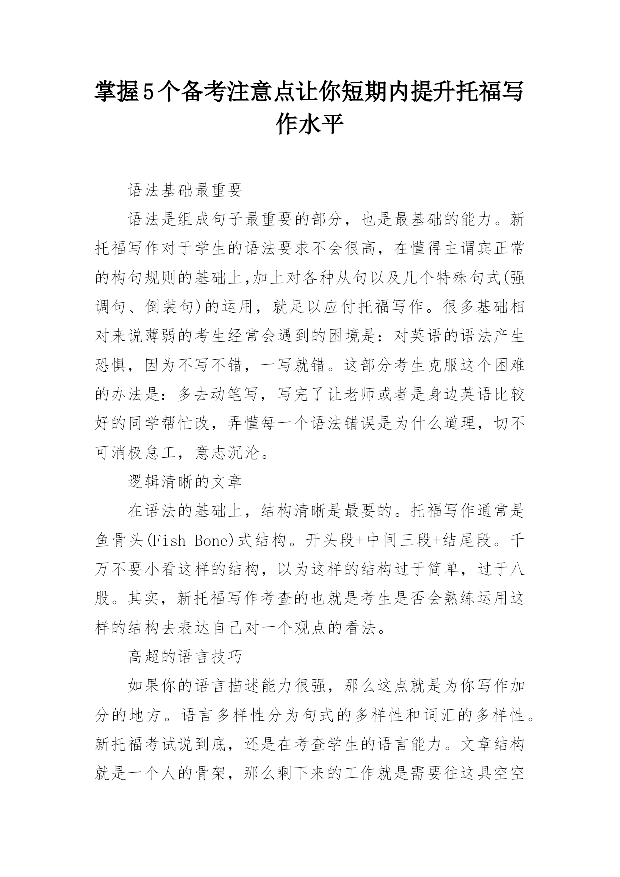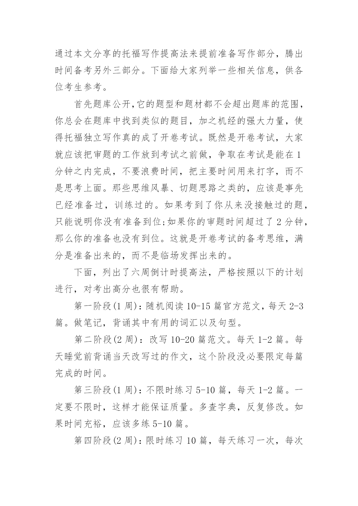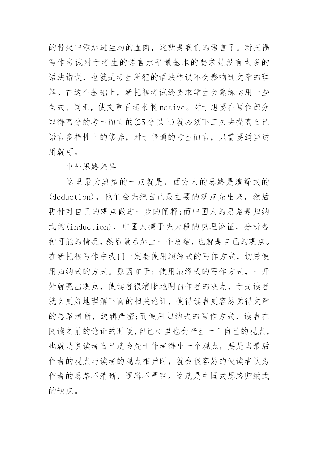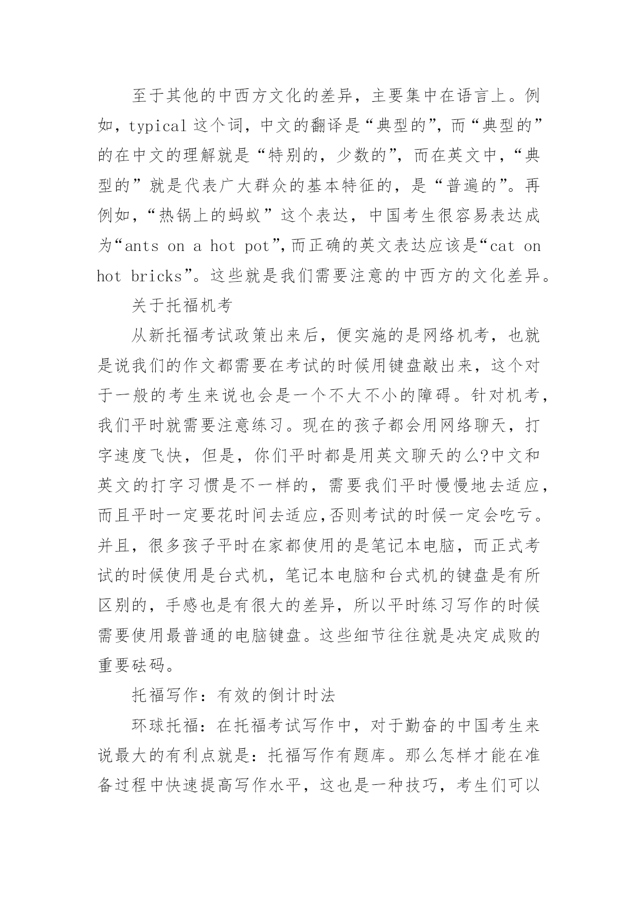 掌握5个备考注意点让你短期内提升托福写作水平 语法基础最重要语法是组成句子最重要的部分,也是最基础的能力。新托福写作对于学生的语法要求不会很高,在懂得主谓宾正常的构句规则的基础上,加上对各种从句以及几个特殊句式(强调句、倒装句)的运用,就足以应付托福写作。很多基础相对来说薄弱的考生经常会遇到的困境是:对英语的语法产生恐惧,因为不写不错,一写就错。这部分考生克服这个困难的办法是:多去动笔写,写完了让老师或者是身边英语比较好的同学帮忙改,弄懂每一个语法错误是为什么道理,切不可消极怠工,意志沉沦。逻辑清晰的文章在语法的基础上,结构清晰是最要的。托福写作通常是鱼骨头(FishBone)式结构。开头段+中间三段+结尾段。千万不要小看这样的结构,以为这样的结构过于简单,过于八股。其实,新托福写作考查的也就是考生是否会熟练运用这样的结构去表达自己对一个观点的看法。高超的语言技巧如果你的语言描述能力很强,那么这点就是为你写作加分的地方。语言多样性分为句式的多样性和词汇的多样性。新托福考试说到底,还是在考查学生的语言能力。文章结构就是一个人的骨架,那么剩下来的工作就是需要往这具空空的骨架中添加进生动的血肉,这就是我们的语言了。新托福写作考试对于考生的语言水平最基本的要求是没有太多的语法错误,也就是考生所犯的语法错误不会影响到文章的理解。在这个基础上,新托福考试还要求学生会熟练运用一些句式、词汇,使文章看起来很native。对于想要在写作部分取得高分的考生而言的(25分以上)就必须下工夫去提高自己语言多样性上的修养,对于普通的考生而言,只需要适当运用就可。中外思路差异这里最为典型的一点就是,西方人的思路是演绎式的(deduction),他们会先把自己最主要的观点亮出来,然后再针对自己的观点做进一步的阐释;而中国人的思路是归纳式的(induction),中国人擅于先大段的说理论证,分析各种可能的情况,然后最后加上一个总结,也就是自己的观点。在新托福写作中我们一定要使用演绎式的写作方式,切忌使用归纳式的方式。原因在于:使用演绎式的写作方式,一开始就亮出观点,使读者很清晰地明白作者的观点,于是读者就会更好地理解下面的相关论证,使得读者更容易觉得文章的思路清晰,逻辑严密;而使用归纳式的写作方式,读者在阅读之前的论证的时候,自己心里也会产生一个自己的观点,也就是说读者自己就会先于作者得出一个观点,要是当最后作者的观点与读者的观点相异时,就会很容易的使读者认为作者的思路不清晰,逻辑不严密。这就是中国式思路归纳式的缺点。至于其他的中西方文化的差异,主要集中在语言上。例如,typical这个词,中文的翻译是“典型的”,而“典型的”的在中文的理解就是“特别的,少数的”,而在英文中,“典型的”就是代表广大群众的基本特征的,是“普遍的”。再例如,“热锅上的蚂蚁”这个表达,中国考生很容易表达成为“antsonahotpot”,而正确的英文表达应该是“catonhotbricks”。这些就是我们需要注意的中西方的文化差异。关于托福机考从新托福考试政策出来后,便实施的是网络机考,也就是说我们的作文都需要在考试的时候用键盘敲出来,这个对于一般的考生来说也会是一个不大不小的障碍。针对机考,我们平时就需要注意练习。现在的孩子都会用网络聊天,打字速度飞快,但是,你们平时都是用英文聊天的么?中文和英文的打字习惯是不一样的,需要我们平时慢慢地去适应,而且平时一定要花时间去适应,否则考试的时候一定会吃亏。并且,很多孩子平时在家都使用的是笔记本电脑,而正式考试的时候使用是台式机,笔记本电脑和台式机的键盘是有所区别的,手感也是有很大的差异,所以平时练习写作的时候需要使用最普通的电脑键盘。这些细节往往就是决定成败的重要砝码。托福写作:有效的倒计时法环球托福:在托福考试写作中,对于勤奋的中国考生来说最大的有利点就是:托福写作有题库。那么怎样才能在准备过程中快速提高写作水平,这也是一种技巧,考生们可以通过本文分享的托福写作提高法来提前准备写作部分,腾出时间备考另外三部分。下面给大家列举一些相关信息,供各位考生参考。首先题库公开,它的题型和题材都不会超出题库的范围,你总会在题库中找到类似的题目,加之机经的强大力量,使得托福独立写作真的成了开卷考试。既然是开卷考试,大家就应该把审题的工作放到考试之前做,争取在考试是能在1分钟之内完成,不要浪费时间,把主要时间用来打字,而不是思考上面。那些思维风暴、切题思路之类的,应该是事先已经准备过,训练过的。如果考到了你从来没接触过的题,只能说明你没有准备到位;如果你的审题时间超过了2分钟,那么你的准备也没有到位。这就是开卷考试的备考思维,满分是准备出来的,而不是临场发挥出来的。下面,列出了六周倒计时提高法,严格按照以下的计划进行,对考出高分也很有帮助。第一阶段(