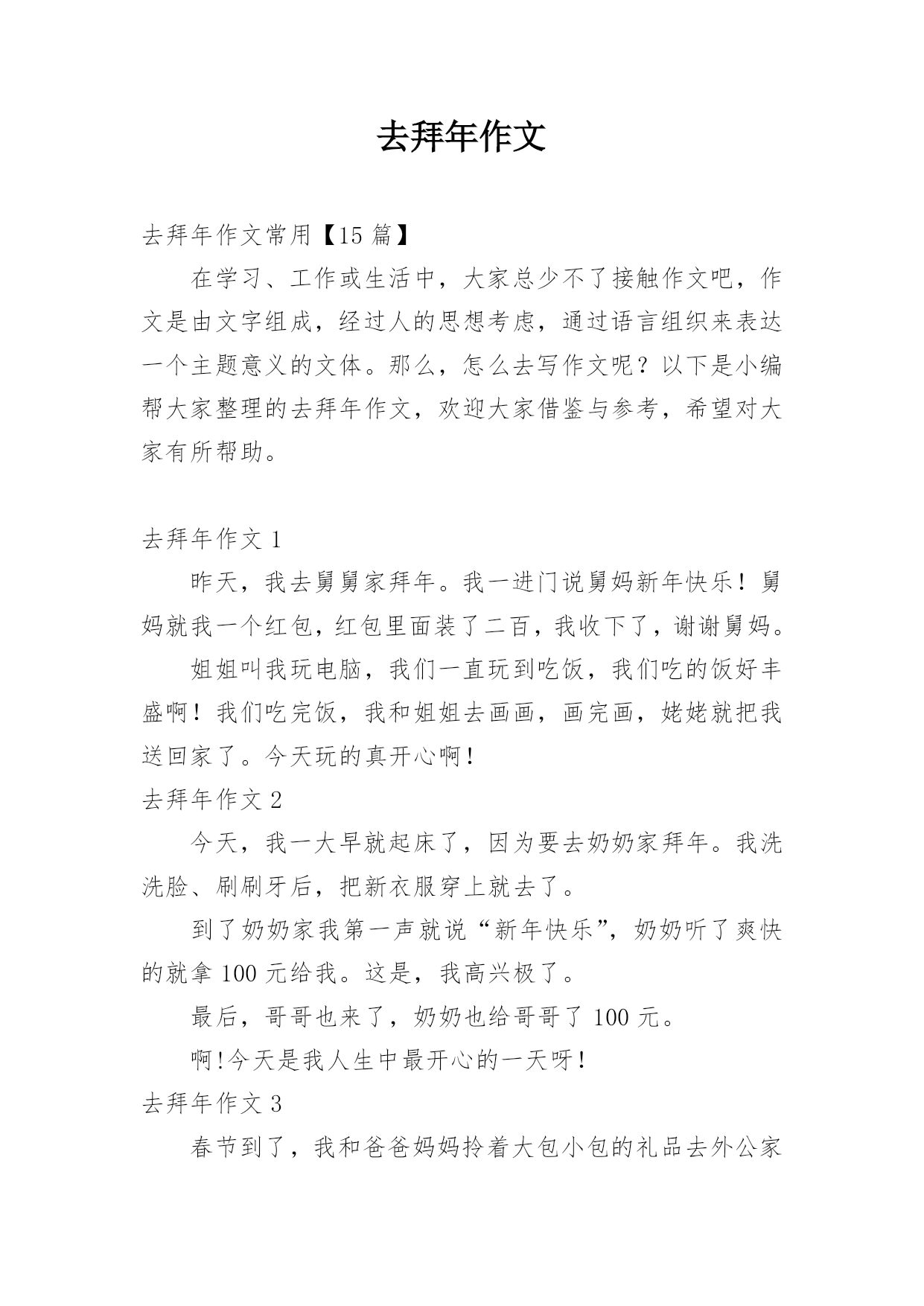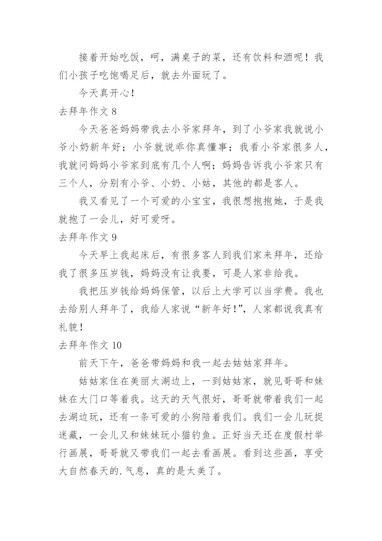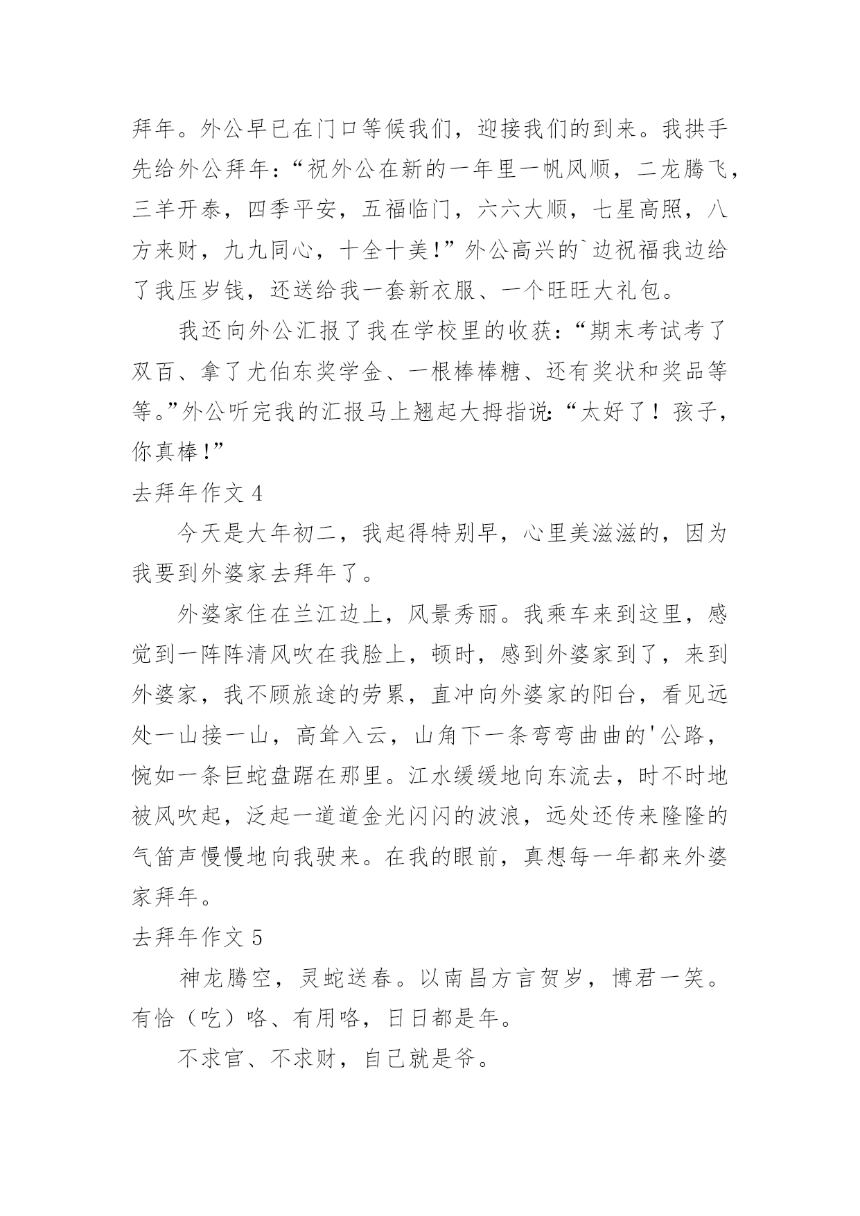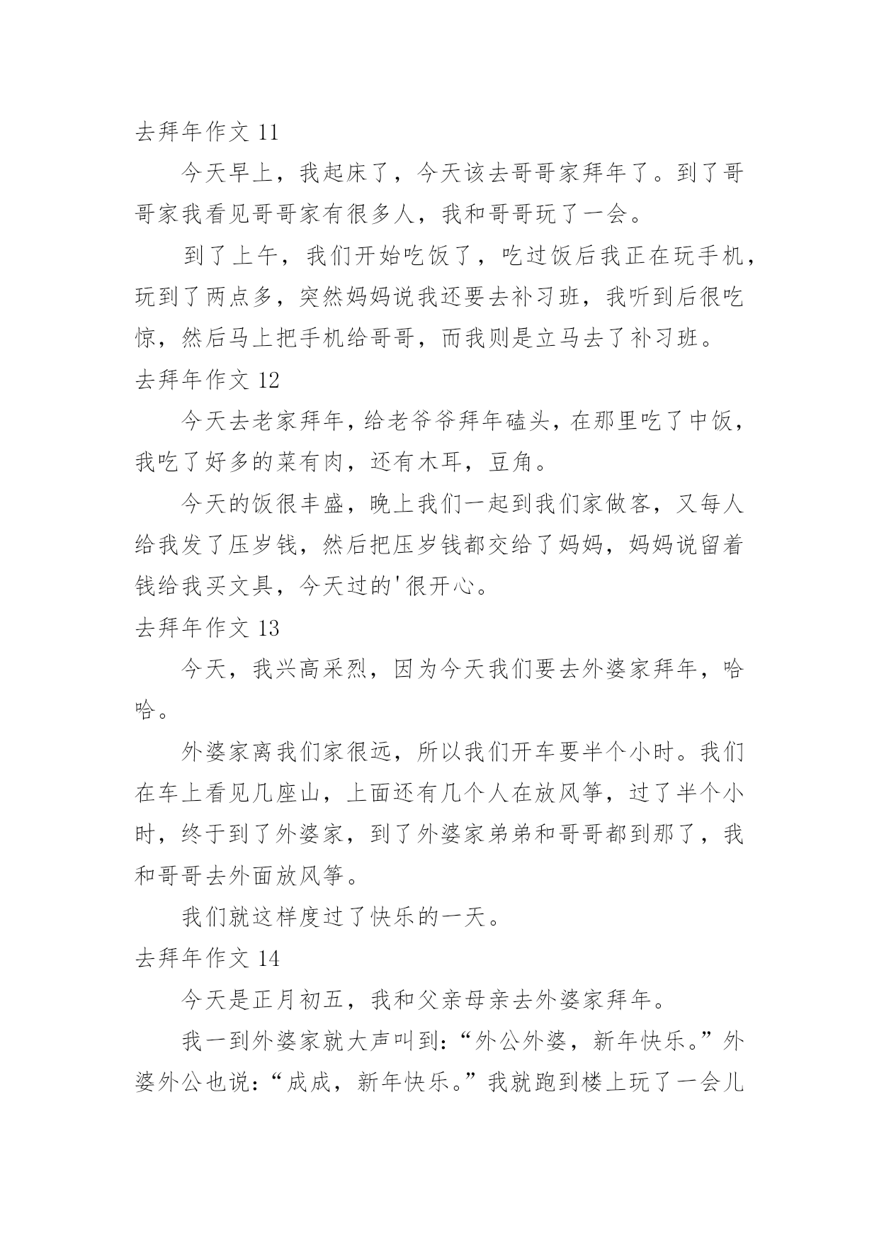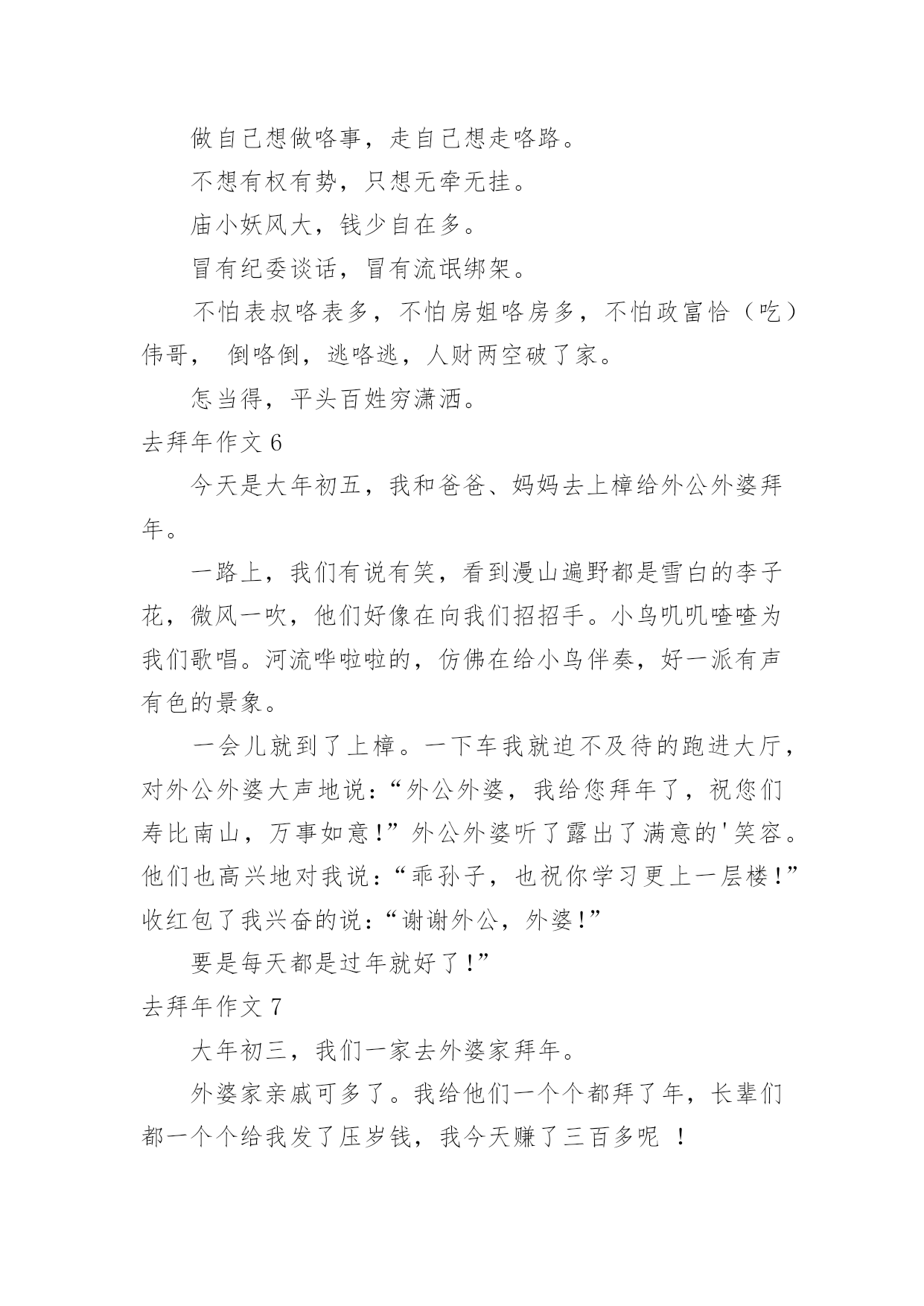 去拜年作文 去拜年作文常用【15篇】在学习、工作或生活中,大家总少不了接触作文吧,作文是由文字组成,经过人的思想考虑,通过语言组织来表达一个主题意义的文体。那么,怎么去写作文呢?以下是小编帮大家整理的去拜年作文,欢迎大家借鉴与参考,希望对大家有所帮助。去拜年作文1昨天,我去舅舅家拜年。我一进门说舅妈新年快乐!舅妈就我一个红包,红包里面装了二百,我收下了,谢谢舅妈。姐姐叫我玩电脑,我们一直玩到吃饭,我们吃的饭好丰盛啊!我们吃完饭,我和姐姐去画画,画完画,姥姥就把我送回家了。今天玩的真开心啊!去拜年作文2今天,我一大早就起床了,因为要去奶奶家拜年。我洗洗脸、刷刷牙后,把新衣服穿上就去了。到了奶奶家我第一声就说“新年快乐”,奶奶听了爽快的就拿100元给我。这是,我高兴极了。最后,哥哥也来了,奶奶也给哥哥了100元。啊!今天是我人生中最开心的一天呀!去拜年作文3春节到了,我和爸爸妈妈拎着大包小包的礼品去外公家拜年。外公早已在门口等候我们,迎接我们的到来。我拱手先给外公拜年:“祝外公在新的一年里一帆风顺,二龙腾飞,三羊开泰,四季平安,五福临门,六六大顺,七星高照,八方来财,九九同心,十全十美!”外公高兴的`边祝福我边给了我压岁钱,还送给我一套新衣服、一个旺旺大礼包。我还向外公汇报了我在学校里的收获:“期末考试考了双百、拿了尤伯东奖学金、一根棒棒糖、还有奖状和奖品等等。”外公听完我的汇报马上翘起大拇指说:“太好了!孩子,你真棒!”去拜年作文4今天是大年初二,我起得特别早,心里美滋滋的,因为我要到外婆家去拜年了。外婆家住在兰江边上,风景秀丽。我乘车来到这里,感觉到一阵阵清风吹在我脸上,顿时,感到外婆家到了,来到外婆家,我不顾旅途的劳累,直冲向外婆家的阳台,看见远处一山接一山,高耸入云,山角下一条弯弯曲曲的'公路,惋如一条巨蛇盘踞在那里。江水缓缓地向东流去,时不时地被风吹起,泛起一道道金光闪闪的波浪,远处还传来隆隆的气笛声慢慢地向我驶来。在我的眼前,真想每一年都来外婆家拜年。去拜年作文5神龙腾空,灵蛇送春。以南昌方言贺岁,博君一笑。有恰(吃)咯、有用咯,日日都是年。不求官、不求财,自己就是爷。做自己想做咯事,走自己想走咯路。不想有权有势,只想无牵无挂。庙小妖风大,钱少自在多。冒有纪委谈话,冒有流氓绑架。不怕表叔咯表多,不怕房姐咯房多,不怕政富恰(吃)伟哥,倒咯倒,逃咯逃,人财两空破了家。怎当得,平头百姓穷潇洒。去拜年作文6今天是大年初五,我和爸爸、妈妈去上樟给外公外婆拜年。一路上,我们有说有笑,看到漫山遍野都是雪白的李子花,微风一吹,他们好像在向我们招招手。小鸟叽叽喳喳为我们歌唱。河流哗啦啦的,仿佛在给小鸟伴奏,好一派有声有色的景象。一会儿就到了上樟。一下车我就迫不及待的跑进大厅,对外公外婆大声地说:“外公外婆,我给您拜年了,祝您们寿比南山,万事如意!”外公外婆听了露出了满意的'笑容。他们也高兴地对我说:“乖孙子,也祝你学习更上一层楼!”收红包了我兴奋的说:“谢谢外公,外婆!”要是每天都是过年就好了!”去拜年作文7大年初三,我们一家去外婆家拜年。外婆家亲戚可多了。我给他们一个个都拜了年,长辈们都一个个给我发了压岁钱,我今天赚了三百多呢!接着开始吃饭,呵,满桌子的菜,还有饮料和酒呢!我们小孩子吃饱喝足后,就去外面玩了。今天真开心!去拜年作文8今天爸爸妈妈带我去小爷家拜年,到了小爷家我就说小爷小奶新年好;小爷就说乖你真懂事;我看小爷家很多人,我就问妈妈小爷家到底有几个人啊;妈妈告诉我小爷家只有三个人,分别有小爷、小奶、小姑,其他的都是客人。我又看见了一个可爱的小宝宝,我很想抱抱她,于是我就抱了一会儿,好可爱呀。去拜年作文9今天早上我起床后,有很多客人到我们家来拜年,还给我了很多压岁钱,妈妈没有让我要,可是人家非给我。我把压岁钱给妈妈保管,以后上大学可以当学费。我也去给别人拜年了,我给人家说“新年好!”,人家都说我真有礼貌!去拜年作文10前天下午,爸爸带妈妈和我一起去姑姑家拜年。姑姑家住在美丽太湖边上,一到姑姑家,就见哥哥和妹妹在大门口等着我。这天的天气很好,哥哥就带着我们一起去湖边玩,还有一条可爱的小狗陪着我们。我们一会儿玩捉迷藏,一会儿又和妹妹玩小猫钓鱼。正好当天还在度假村举行画展,哥哥就又带我们一起去看画展。看到这些画,享受大自然春天的.气息,真的是太美了。去拜年作文11今天早上,我起床了,今天该去哥哥家拜年了。到了哥哥家我看见哥哥家有很多人,我和哥哥玩了一会。到了上午,我们开始吃饭了,吃过饭后我正在玩手机,玩到了两点多,突然妈妈说我还要去补习班,我听到后很吃惊,然后马上把手机给哥哥,而我则是立马去了补习班。去拜年作文12今天去老家拜年,给老爷爷拜年磕头,在那里吃了中饭,我吃了好多的菜有肉,还有木耳,豆角。今天的饭很丰盛,晚上我们一起到我们