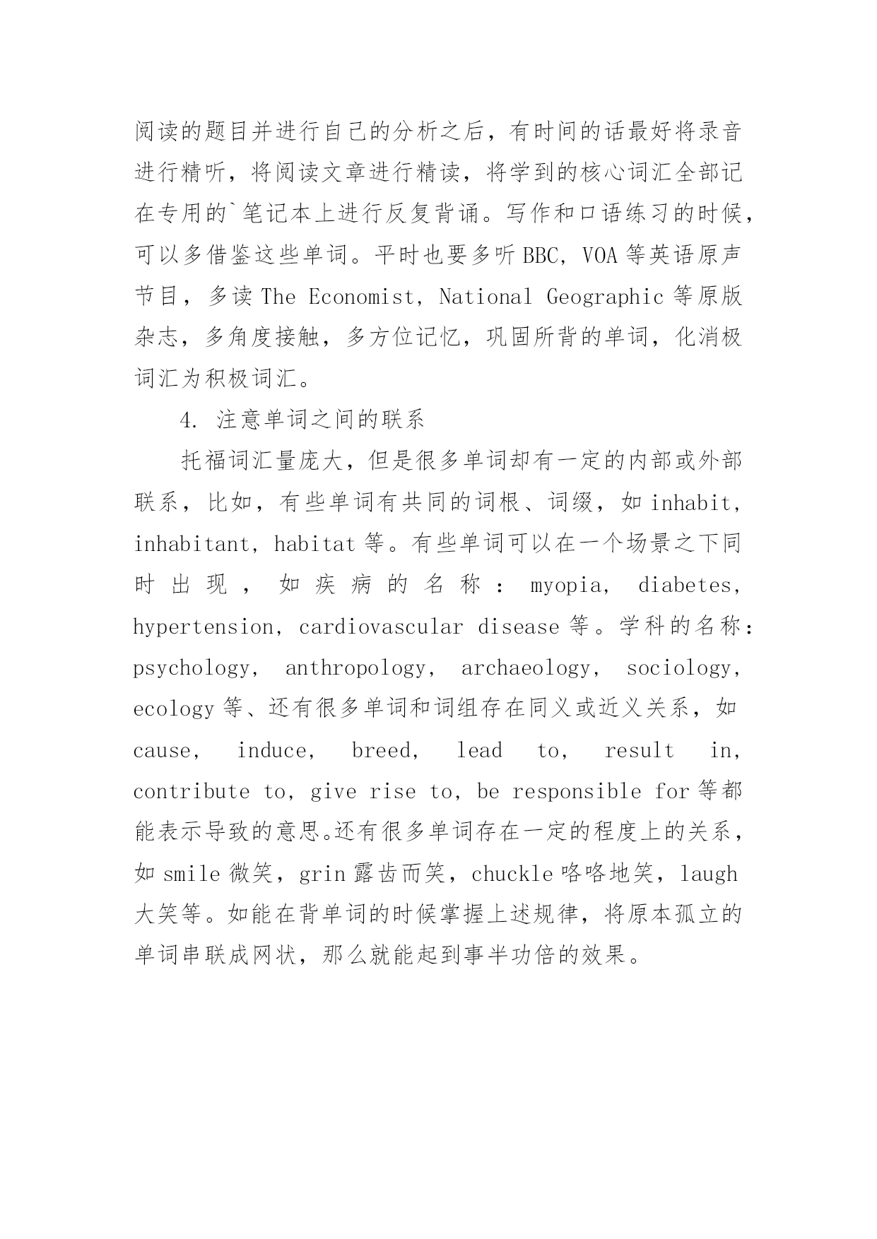 如何反复记忆托福词汇 1.制定合理的计划,按部就班,反复循环要想有全面的托福词汇量,就得背单词,而背单词是一个非常繁重的任务,它需要大量的精力。如果不制定一个周密的计划,很多考生将很难坚持。所以这一步是非常有必要的。一般来说,考前一定将单词手册背诵3遍,第一遍仔细学习,第二遍进行巩固,第三遍查漏补缺加深印象。这样所起到的效果要比只背一遍好得多。2.听说读写齐头并进托福词汇量的积累不是一朝一夕的。很多考生记单词的时候只是看,造成的结果往往是只记得外形,在阅读里面能够认识,但是在听力里面根本听不出来,写作里面也拼不出来,口语里面更不可能说出来。这样的词汇量对于英语学习来说,只是消极词汇。而最佳的背诵单词的方法应该是先把单词看一遍,同时听一下标准的录音,然后嘴里再不停地跟读,最后把这个单词凭着自己的发音记录下来。只有像这样多感觉齐头并进,才能将单词记忆得最深刻。3.背诵与实践同步英语单词归根到底还是要放在语言中进行使用的,如果只背单词却不把单词放到语境中去理解,那么记单词的效率就会大打折扣。因此考生在背诵单词的时候一定要同时辅以大量的听说读写练习,在反复的使用中巩固单词的读音、意义和用法。托福真题就是进行实践的好材料。在做完听力和阅读的题目并进行自己的分析之后,有时间的话最好将录音进行精听,将阅读文章进行精读,将学到的核心词汇全部记在专用的`笔记本上进行反复背诵。写作和口语练习的时候,可以多借鉴这些单词。平时也要多听BBC,VOA等英语原声节目,多读TheEconomist,NationalGeographic等原版杂志,多角度接触,多方位记忆,巩固所背的单词,化消极词汇为积极词汇。4.注意单词之间的联系托福词汇量庞大,但是很多单词却有一定的内部或外部联系,比如,有些单词有共同的词根、词缀,如inhabit,inhabitant,habitat等。有些单词可以在一个场景之下同时出现,如疾病的名称:myopia,diabetes,hypertension,cardiovasculardisease等。学科的名称:psychology,anthropology,archaeology,sociology,ecology等、还有很多单词和词组存在同义或近义关系,如cause,induce,breed,leadto,resultin,contributeto,giveriseto,beresponsiblefor等都能表示导致的意思。还有很多单词存在一定的程度上的关系,如smile微笑,grin露齿而笑,chuckle咯咯地笑,laugh大笑等。如能在背单词的时候掌握上述规律,将原本孤立的单词串联成网状,那么就能起到事半功倍的效果。