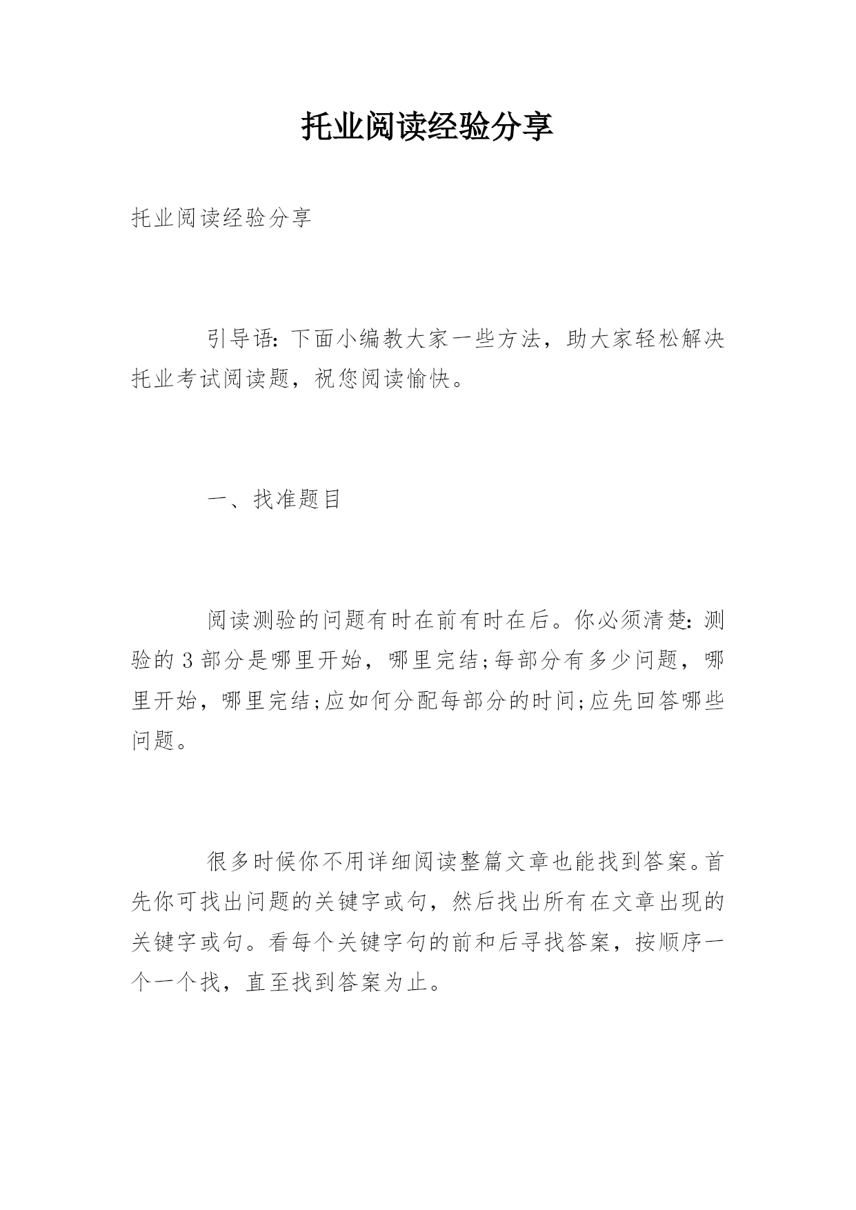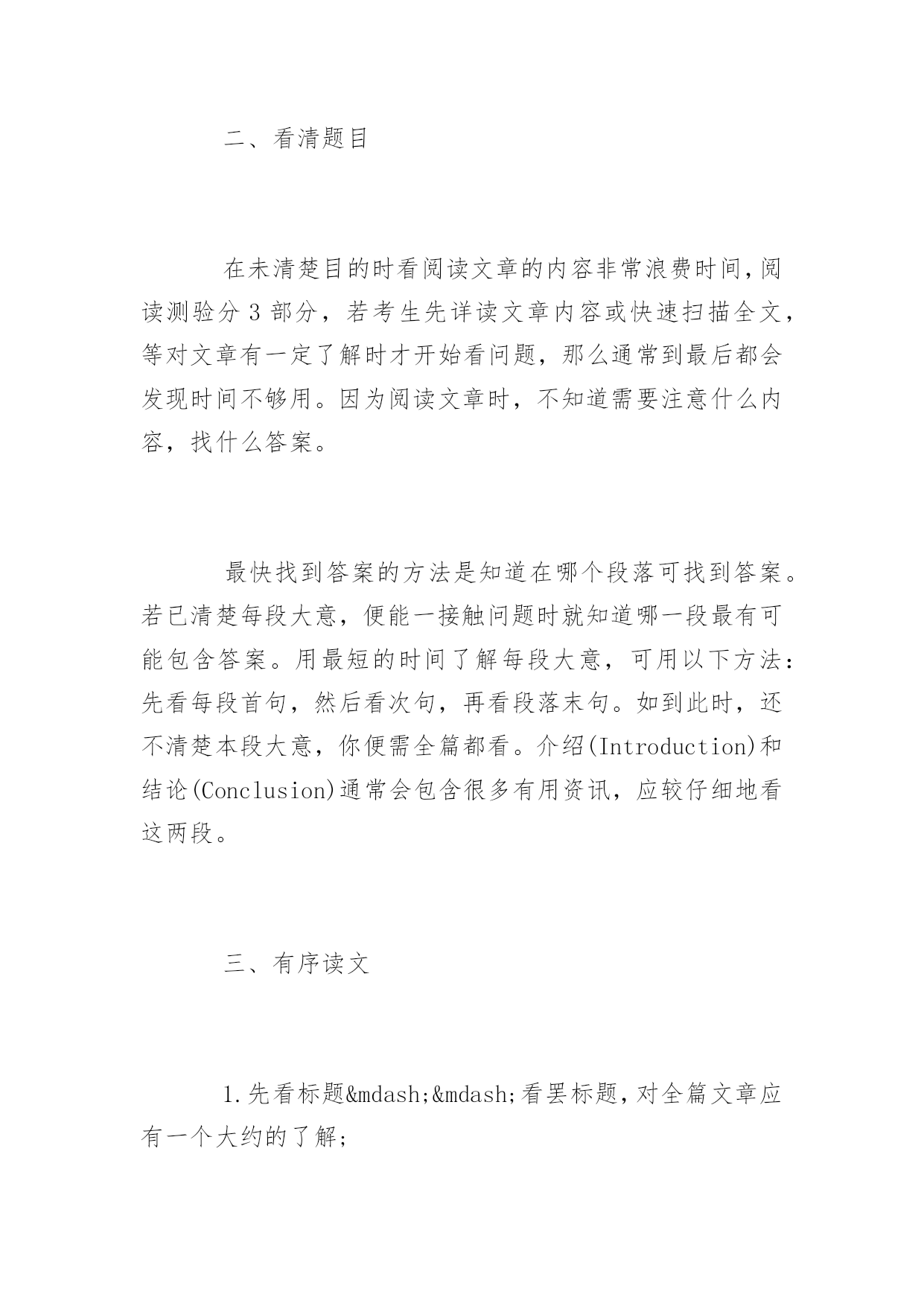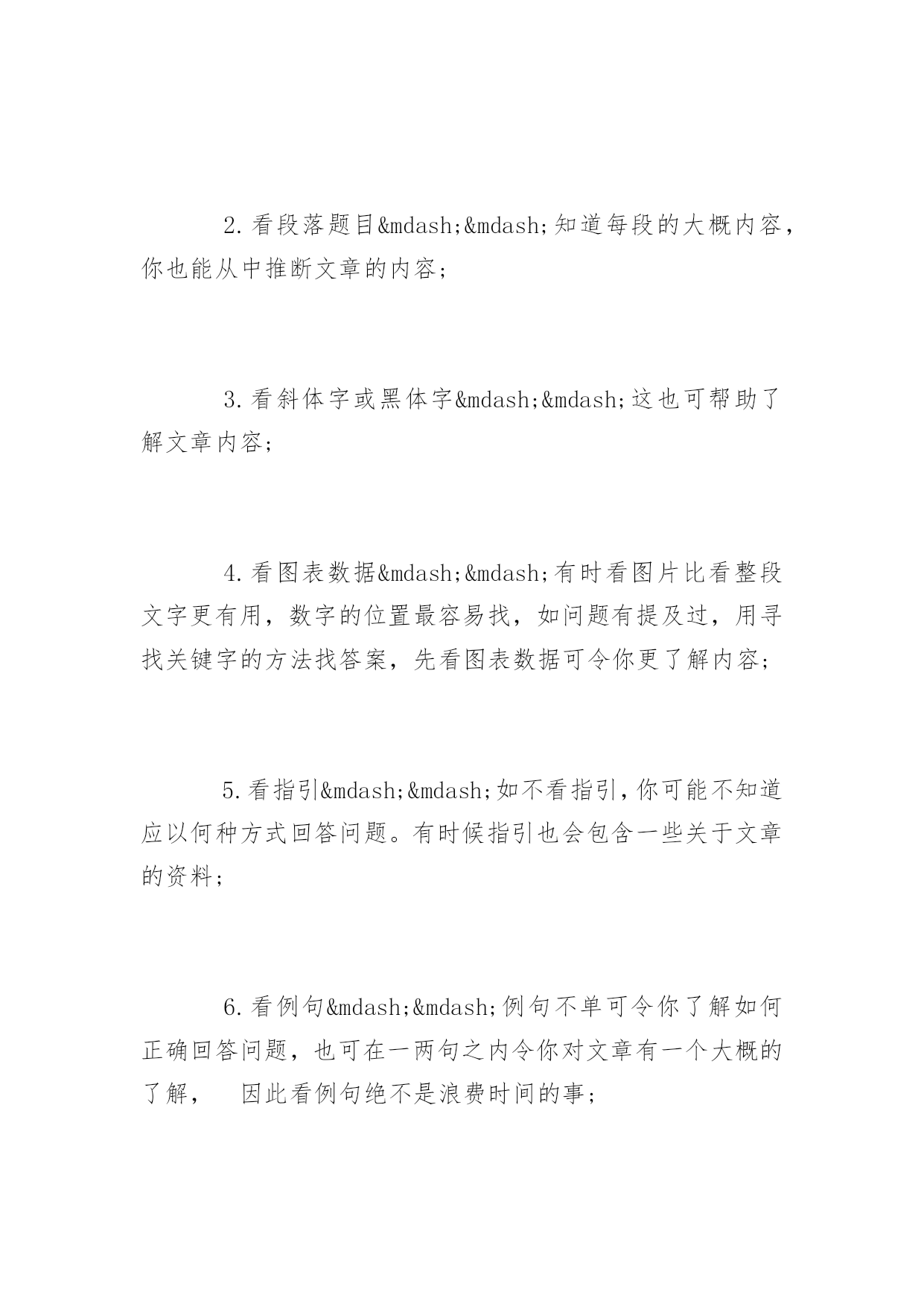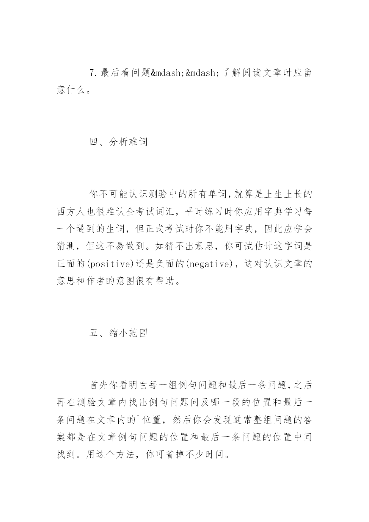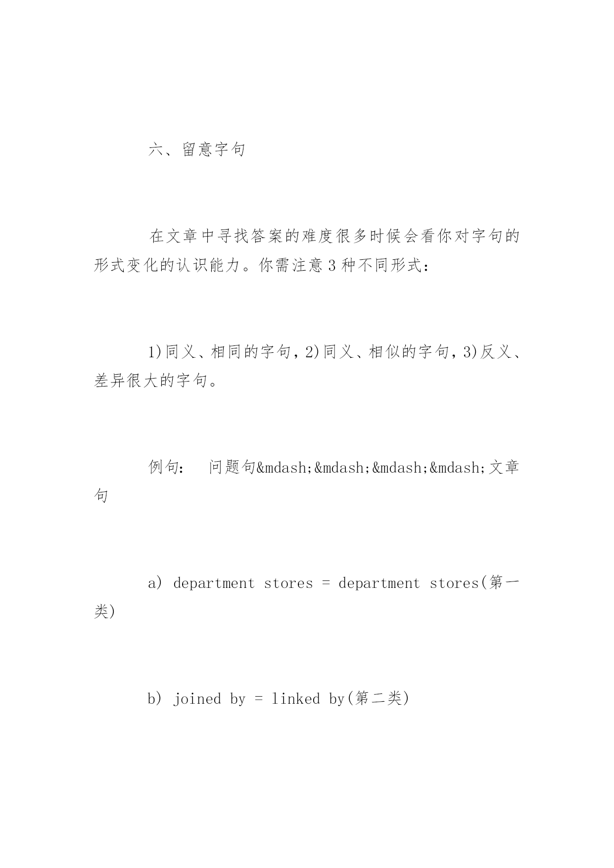 托业阅读经验分享 托业阅读经验分享 引导语:下面小编教大家一些方法,助大家轻松解决托业考试阅读题,祝您阅读愉快。 一、找准题目 阅读测验的问题有时在前有时在后。你必须清楚:测验的3部分是哪里开始,哪里完结;每部分有多少问题,哪里开始,哪里完结;应如何分配每部分的时间;应先回答哪些问题。 很多时候你不用详细阅读整篇文章也能找到答案。首先你可找出问题的关键字或句,然后找出所有在文章出现的关键字或句。看每个关键字句的前和后寻找答案,按顺序一个一个找,直至找到答案为止。 二、看清题目 在未清楚目的时看阅读文章的内容非常浪费时间,阅读测验分3部分,若考生先详读文章内容或快速扫描全文,等对文章有一定了解时才开始看问题,那么通常到最后都会发现时间不够用。因为阅读文章时,不知道需要注意什么内容,找什么答案。 最快找到答案的方法是知道在哪个段落可找到答案。若已清楚每段大意,便能一接触问题时就知道哪一段最有可能包含答案。用最短的时间了解每段大意,可用以下方法:先看每段首句,然后看次句,再看段落末句。如到此时,还不清楚本段大意,你便需全篇都看。介绍(Introduction)和结论(Conclusion)通常会包含很多有用资讯,应较仔细地看这两段。 三、有序读文 1.先看标题——看罢标题,对全篇文章应有一个大约的了解; 2.看段落题目——知道每段的大概内容,你也能从中推断文章的内容; 3.看斜体字或黑体字——这也可帮助了解文章内容; 4.看图表数据——有时看图片比看整段文字更有用,数字的位置最容易找,如问题有提及过,用寻找关键字的方法找答案,先看图表数据可令你更了解内容; 5.看指引——如不看指引,你可能不知道应以何种方式回答问题。有时候指引也会包含一些关于文章的资料; 6.看例句——例句不单可令你了解如何正确回答问题,也可在一两句之内令你对文章有一个大概的了解,因此看例句绝不是浪费时间的事; 7.最后看问题——了解阅读文章时应留意什么。 四、分析难词 你不可能认识测验中的所有单词,就算是土生土长的西方人也很难认全考试词汇,平时练习时你应用字典学习每一个遇到的生词,但正式考试时你不能用字典,因此应学会猜测,但这不易做到。如猜不出意思,你可试估计这字词是正面的(positive)还是负面的(negative),这对认识文章的意思和作者的意图很有帮助。 五、缩小范围 首先你看明白每一组例句问题和最后一条问题,之后再在测验文章内找出例句问题问及哪一段的位置和最后一条问题在文章内的`位置,然后你会发现通常整组问题的答案都是在文章例句问题的位置和最后一条问题的位置中间找到。用这个方法,你可省掉不少时间。 六、留意字句 在文章中寻找答案的难度很多时候会看你对字句的形式变化的认识能力。你需注意3种不同形式: 1)同义、相同的字句,2)同义、相似的字句,3)反义、差异很大的字句。 例句:问题句————文章句 a)departmentstores=departmentstores(第一类) b)joinedby=linkedby(第二类) c)walkwaysaboveandbelowtheground=over-the-streetcrossingsandundergroundwalkways(第三类) 七、巧用解析 有时候测验会对一些技术性或太深奥的字词会作出解释,千万不要漏看,另外,如果测验是AcademicModule的话你会遇到很多大学程度或在大学才会用到的字,这些字你必须都认识和知道它们的意思。请参考字汇表(Glossary)内的字并找一本好的字典学习。