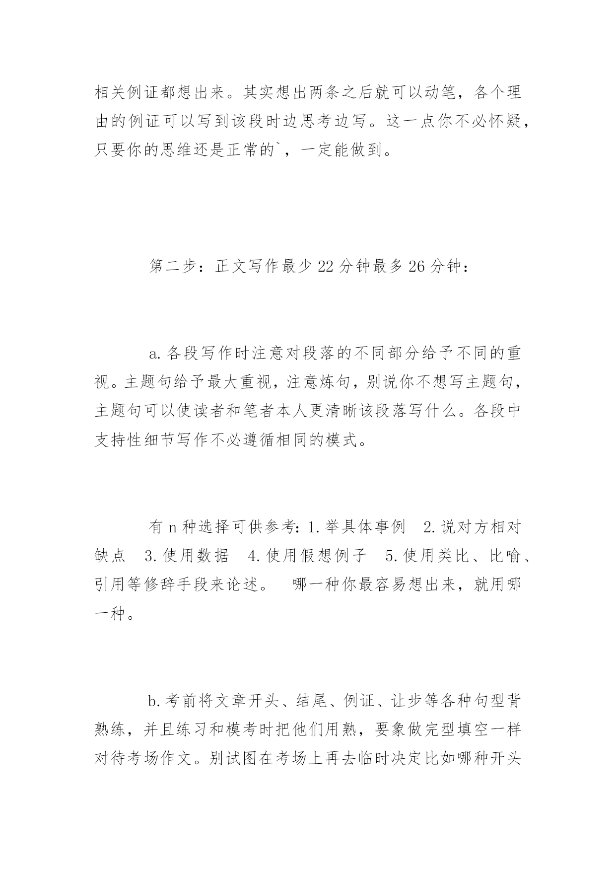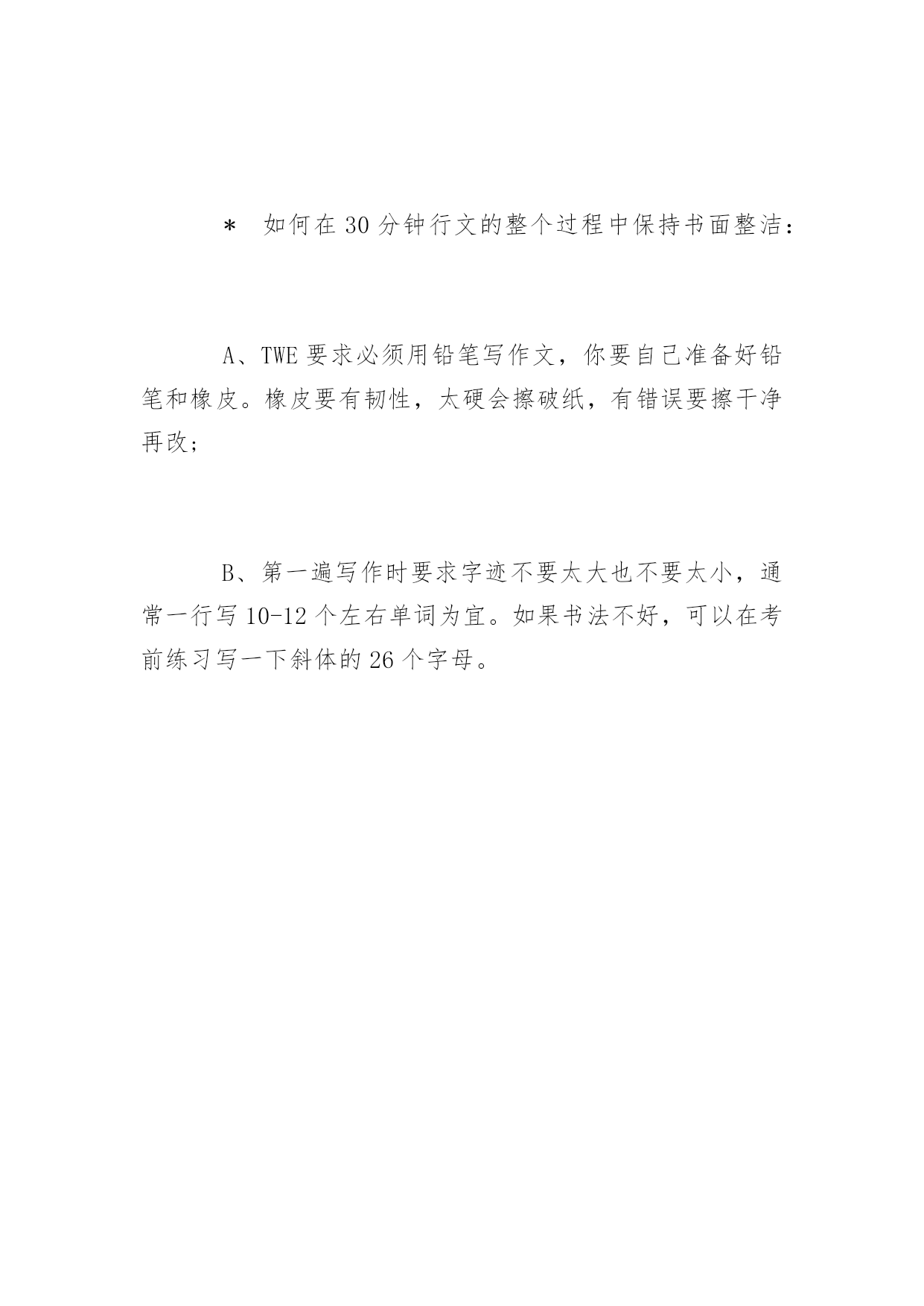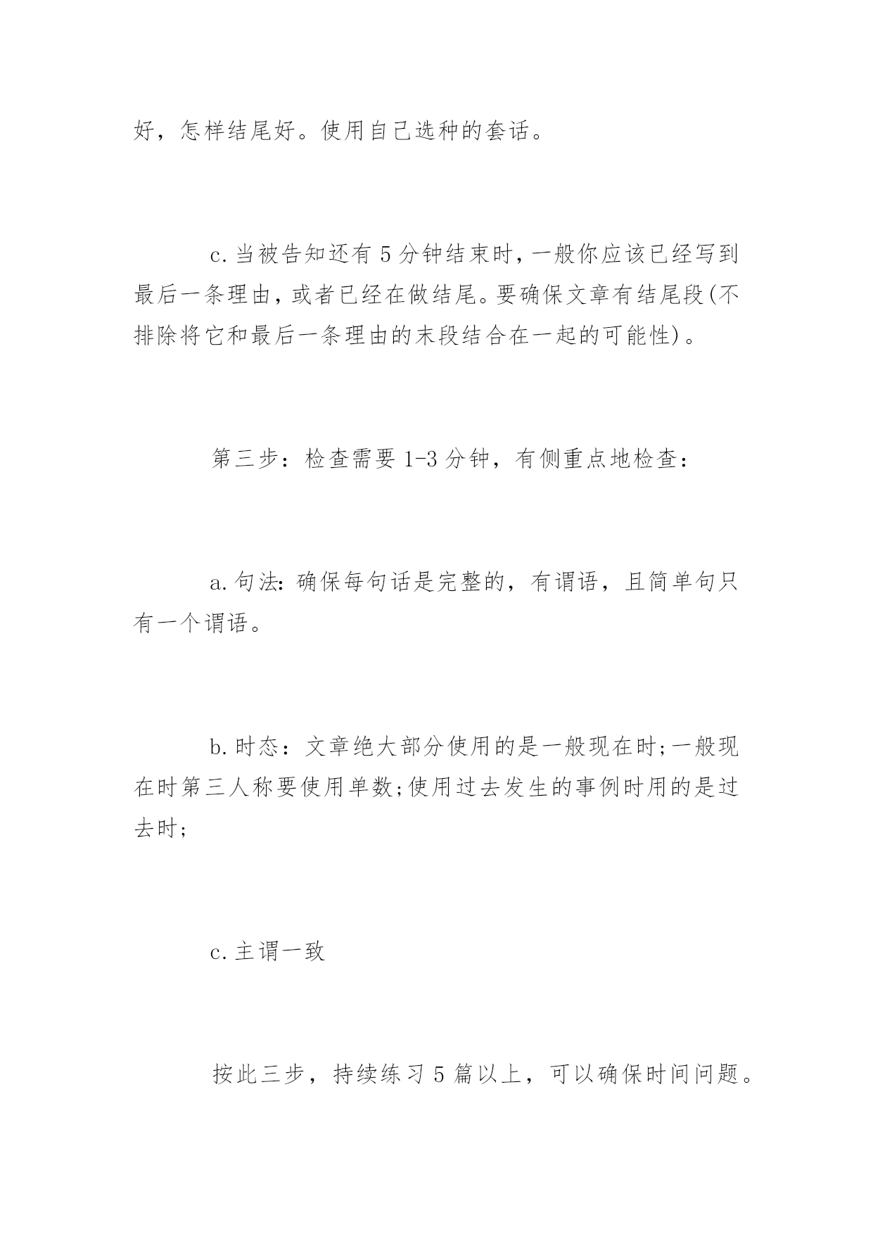 托福写作时间分配对策 2017托福写作时间分配对策 导语:对于托福考试来说,时间是决胜的关键,任何一个环节都不能掉链子,下面YJBYS小编分享托福写作时间分配的对策,欢迎参考! 如何在30分钟内快速写完文章:熟悉考场写作三个步骤的时间分配 第一步:审题、确定立场、列出理由(只需要在草稿纸上用英文单词或汉语列出各个理由,防止遗忘),最少3分钟最多5分钟。要避免两个极端: a.用时太少,理由没有想清楚就开始写,不仅造成文章逻辑结构不清,还会引起行文中频繁的修正,欲速则不达; b.用时太多,不要追求一次思考就能把每一条理由及相关例证都想出来。其实想出两条之后就可以动笔,各个理由的例证可以写到该段时边思考边写。这一点你不必怀疑,只要你的思维还是正常的`,一定能做到。 第二步:正文写作最少22分钟最多26分钟: a.各段写作时注意对段落的不同部分给予不同的重视。主题句给予最大重视,注意炼句,别说你不想写主题句,主题句可以使读者和笔者本人更清晰该段落写什么。各段中支持性细节写作不必遵循相同的模式。 有n种选择可供参考:1.举具体事例2.说对方相对缺点3.使用数据4.使用假想例子5.使用类比、比喻、引用等修辞手段来论述。哪一种你最容易想出来,就用哪一种。 b.考前将文章开头、结尾、例证、让步等各种句型背熟练,并且练习和模考时把他们用熟,要象做完型填空一样对待考场作文。别试图在考场上再去临时决定比如哪种开头好,怎样结尾好。使用自己选种的套话。 c.当被告知还有5分钟结束时,一般你应该已经写到最后一条理由,或者已经在做结尾。要确保文章有结尾段(不排除将它和最后一条理由的末段结合在一起的可能性)。 第三步:检查需要1-3分钟,有侧重点地检查: a.句法:确保每句话是完整的,有谓语,且简单句只有一个谓语。 b.时态:文章绝大部分使用的是一般现在时;一般现在时第三人称要使用单数;使用过去发生的事例时用的是过去时; c.主谓一致 按此三步,持续练习5篇以上,可以确保时间问题。 *如何在30分钟行文的整个过程中保持书面整洁: A、TWE要求必须用铅笔写作文,你要自己准备好铅笔和橡皮。橡皮要有韧性,太硬会擦破纸,有错误要擦干净再改; B、第一遍写作时要求字迹不要太大也不要太小,通常一行写10-12个左右单词为宜。如果书法不好,可以在考前练习写一下斜体的26个字母。