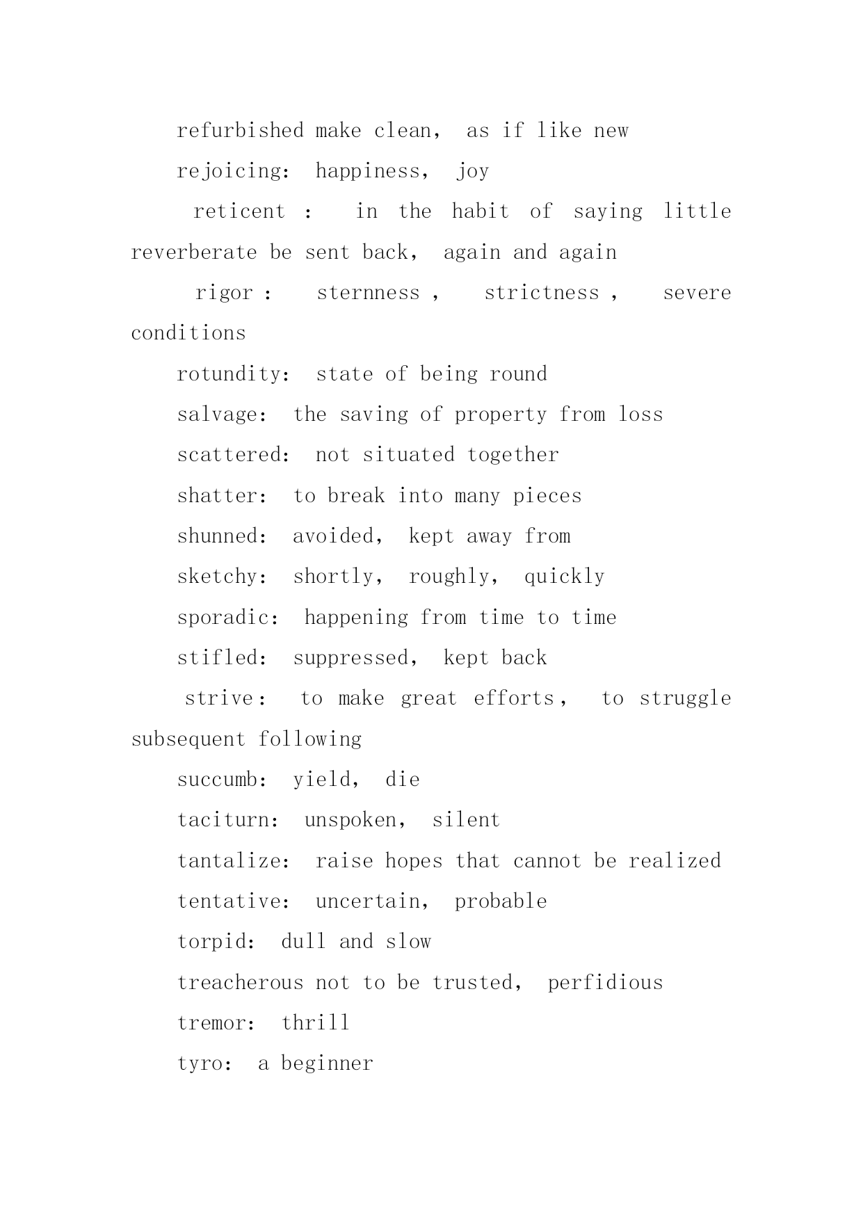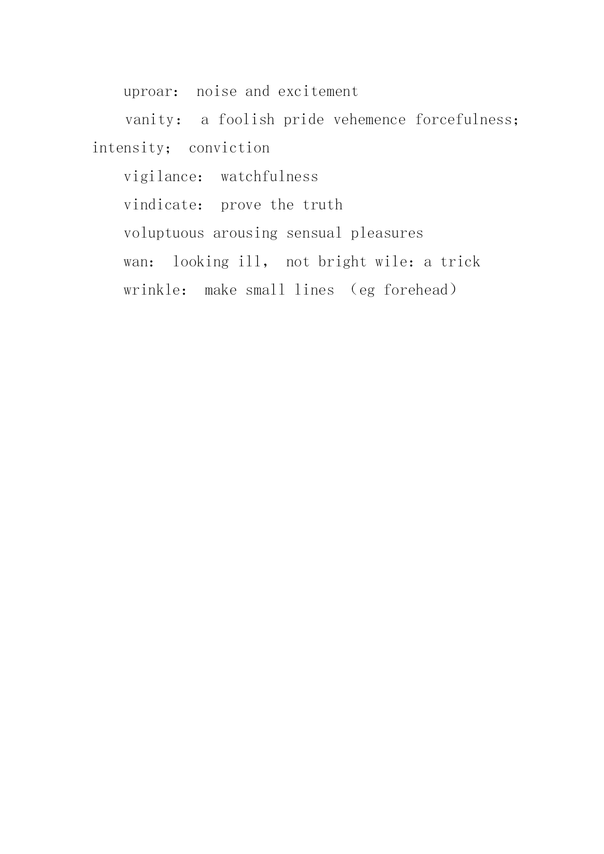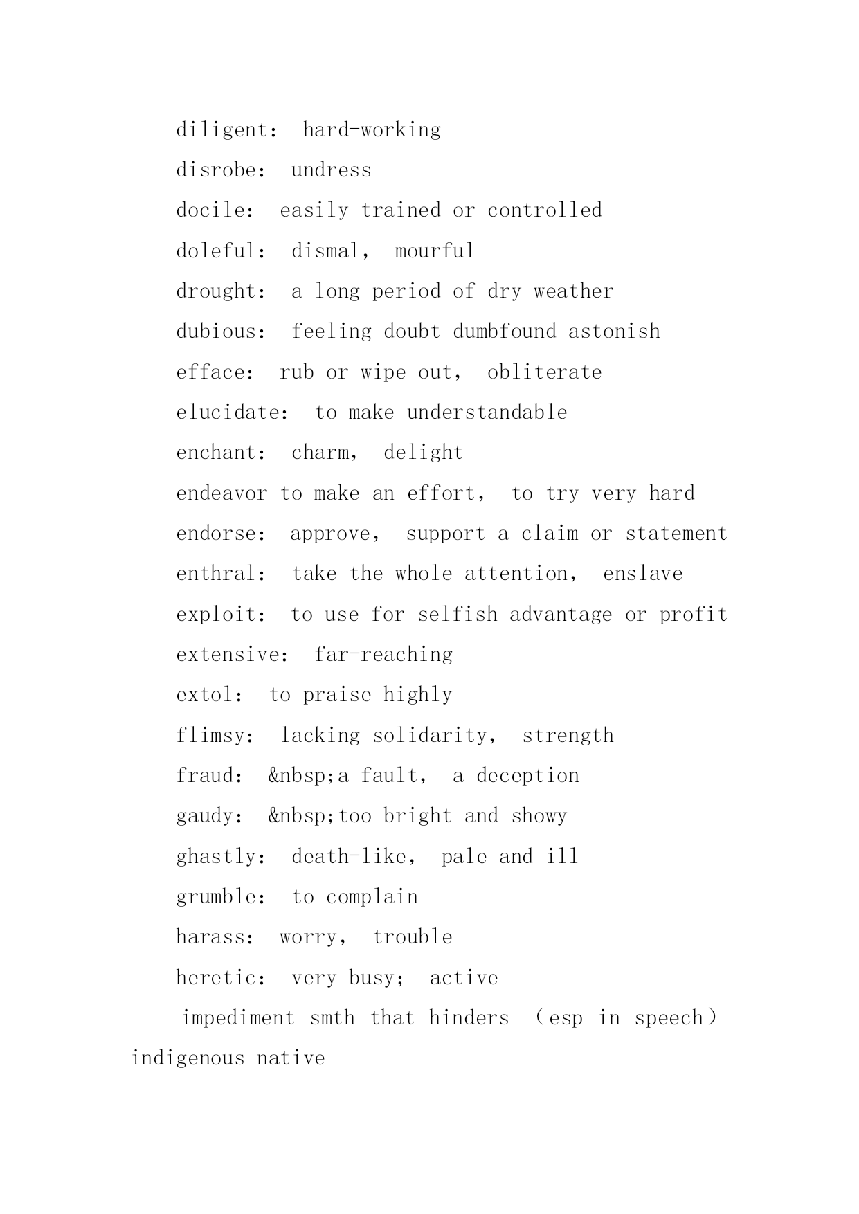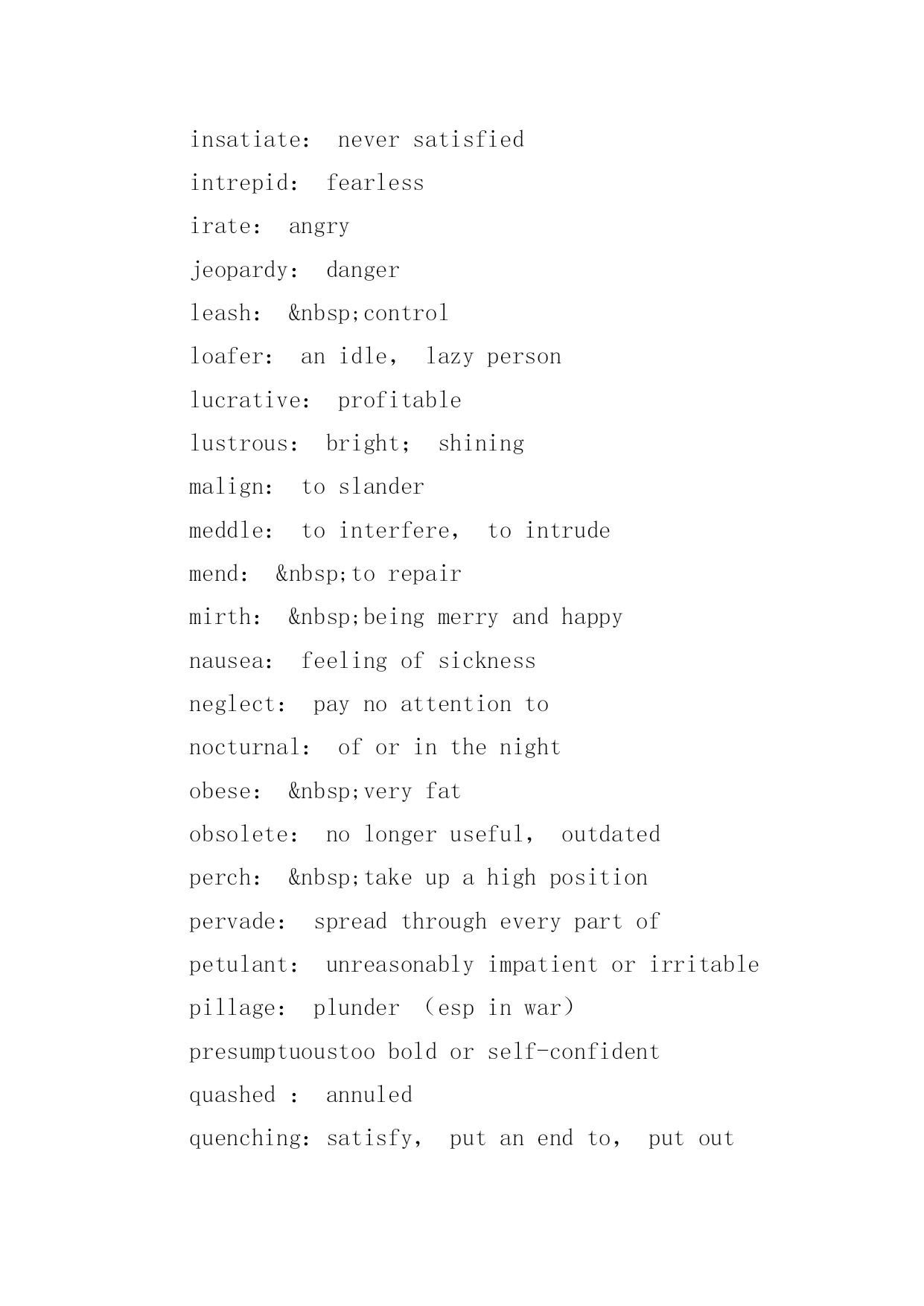 托福考试词汇的备考 托福考试词汇的备考abyss: holesodeepastoappearbottomlessacquiesceagree,acceptwithoutprotestaffable:politeandfriendly,easytotalktoaffliction:distress,sufferingaffluent:wealthy,abundantagitate:move,shake,stirupambiguoushavingmorethenonemeaningannex: takepossessionofaqueous:oforlikewaterarduous:demandinggreateffort,strenuousaroma: qualityorsurroundingatmosphereconsideredtypicalatone: makerepaymentavarice:greedbellicose:inclinedtofightingcalisthenicsexercisestodevelopstrongbodiescaptor:personwhotakessmbcaptiveconcoct:invent,preparebymixingtogetherdangle:handorswinglooselydeprive:takeawayfrom,preventfromusingdiligent:hard-workingdisrobe:undressdocile:easilytrainedorcontrolleddoleful:dismal,mourfuldrought:alongperiodofdryweatherdubious:feelingdoubtdumbfoundastonishefface:ruborwipeout,obliterateelucidate:tomakeunderstandableenchant:charm,delightendeavortomakeaneffort,totryveryhardendorse:approve,supportaclaimorstatemententhral:takethewholeattention,enslaveexploit:touseforselfishadvantageorprofitextensive:far-reachingextol:topraisehighlyflimsy:lackingsolidarity,strengthfraud: afault,adeceptiongaudy: toobrightandshowyghastly:death-like,paleandillgrumble:tocomplainharass:worry,troubleheretic:verybusy;activeimpedimentsmththathinders(espinspeech)indigenousnativeinsatiate:neversatisfiedintrepid:fearlessirate:angryjeopardy:dangerleash: controlloafer:anidle,lazypersonlucrative:profitablelustrous:bright;shiningmalign:toslandermeddle:tointerfere,tointrudemend: torepairmirth: beingmerryandhappynausea:feelingofsicknessneglect:paynoattentiontonocturnal:oforinthenightobese: veryfatobsolete:nolongeruseful,outdatedperch: takeupahighpositionpervade:spreadthrougheverypartofpetulant:unreasonablyimpatientorirritablepillage:plunder(espinwar)presumptuoustooboldorself-confidentquashed:annuledquenching:satisfy,putanendto,putoutrefurbishedmakeclean,asiflikenewrejoicing:happiness,joyreticent:inthehabitofsayinglittlereverberatebesentback,againa